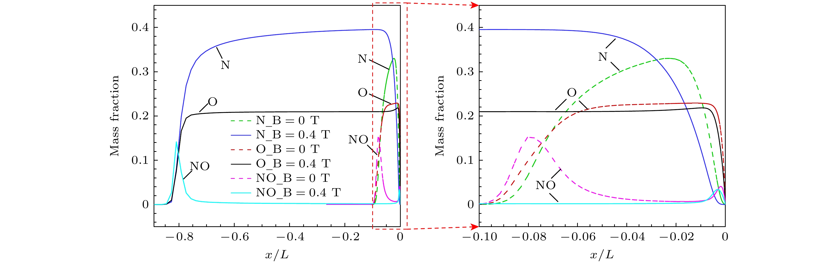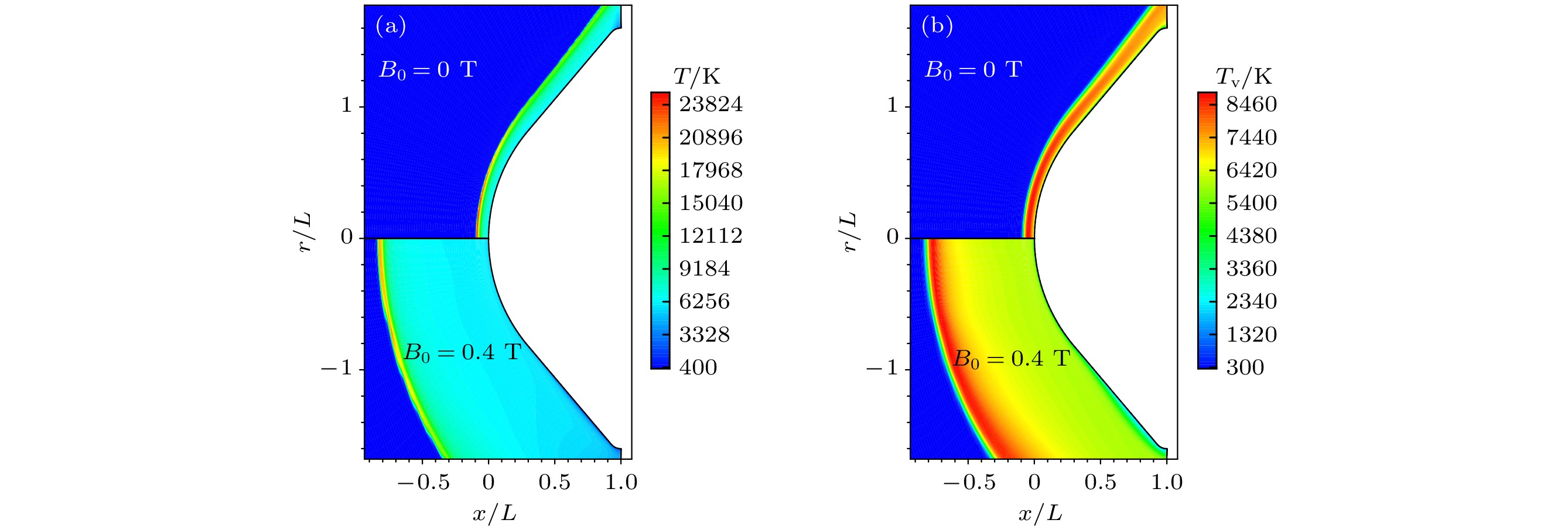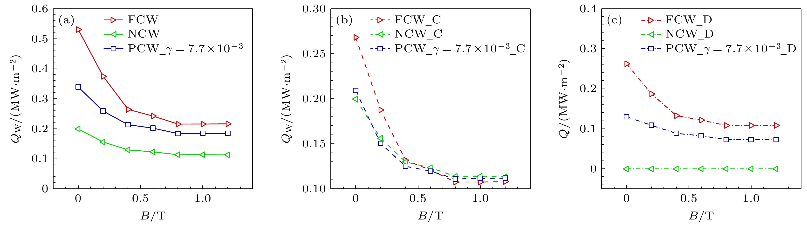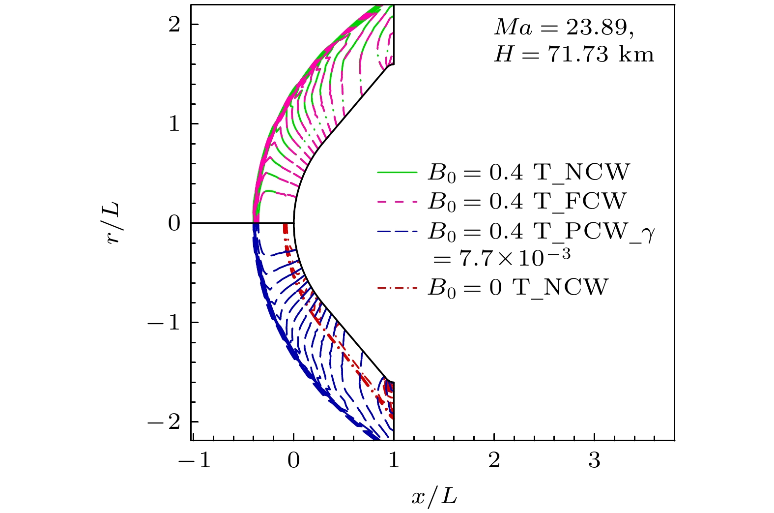 In the re-entry process of the vehicle into the atmosphere, the high-temperature environment, induced by the compression of the strong shock wave and viscous retardation, is created around the head of a vehicle. These generate a conductive plasma flow field, which provides a direct working environment for the application of magnetohydrodynaimic (MHD) control technology. Numerical simulations based on thermochemical non-equilibrium MHD model are adopted to analyze the surface heat flux of an orbital reentry experiment (OREX) vehicle. The influences of wall catalytic conditions on the aerothermal environment under different flight conditions are discussed. In addition, the control mechanism of an external magnetic field on high-temperature thermochemical non-equilibrium flow field is analyzed. The results show that the distribution of surface heat flux monotonically increases with the catalytic recombination coefficient increasing, and the surface heat flux rises and then drops with the flight altitude decreasing. Moreover, the wall catalytic properties significantly affect the efficiency of MHD control technology, and the total heat flux is closely related to the accumulation of atomic components, diffusion gradient and temperature gradient near the wall region. With an external magnetic field applied, the accumulation of oxygen atoms and nitrogen atoms near the wall can be reduced. Moreover, the Lorentz force can increase the shock standoff distance, and then reduce the component diffusion gradient and wall temperature gradient. Under three different wall catalytic conditions, the ability to control the surface heat flux MHD is ranked from strong to weak as fully catalyzed, partially catalyzed and non-catalyzed.