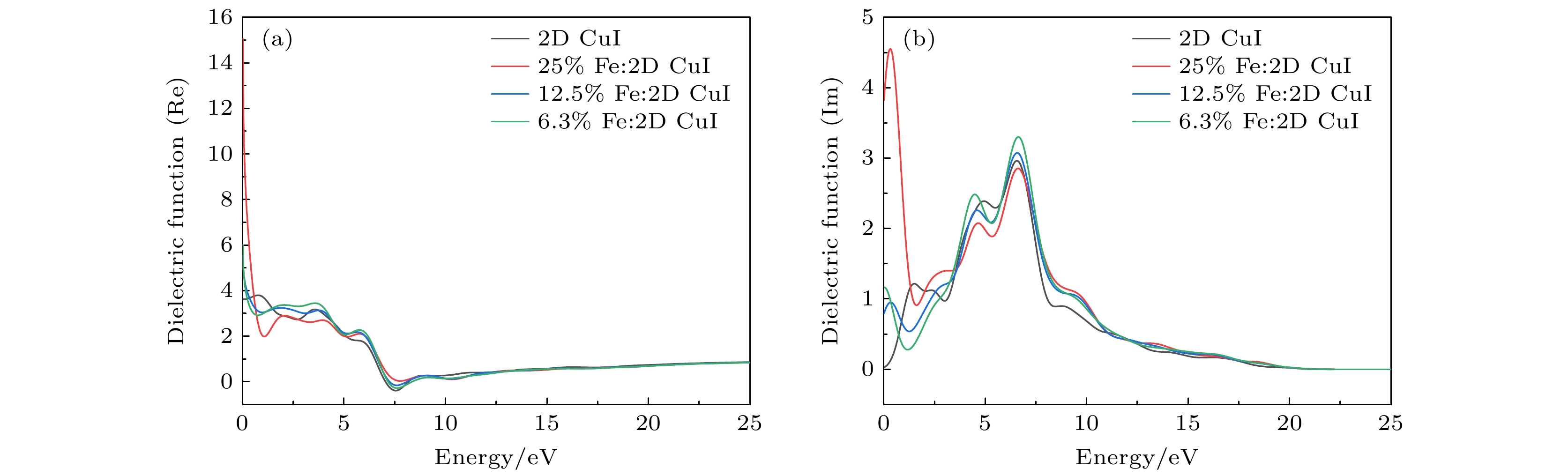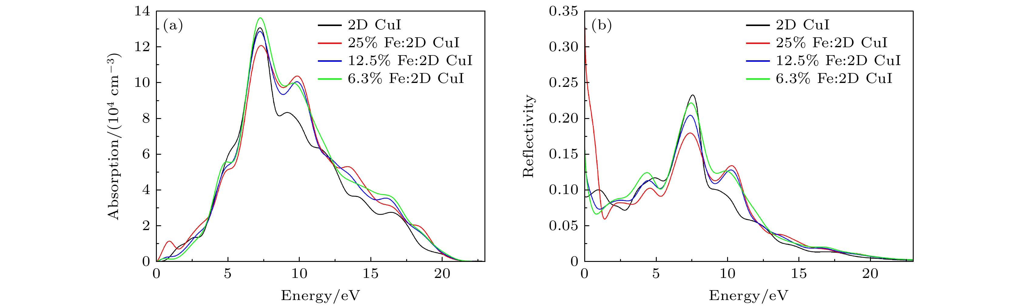 The effects of different concentrations of Fe doping on the photoelectric properties of two-dimensional (2D) CuI semiconductor are studied based on the first-principles calculation method. The results show that both intrinsic 2D CuI and Fe-doped 2D CuI are direct band gap semiconductors. The total state density and partial wave state density of 2D CuI doped with different concentrations of Fe show that the increase in the number of energy bands at Fermi level is due to the influence of Fe-d and Fe-p orbital contributions after Fe doping, which can improve the conductivity of 2D CuI. With the increase of Fe doping concentration, the peak value of ε1 decreases gradually, and the peak value moves toward the high-energy end near the relatively high energy 3 eV and 6 eV, and the greater the concentration, the more obvious the shift is. These results indicate that Fe doping can enhance the high temperature resistance of 2D CuI. When a small amount of Fe is doped, the ε2 peak value increases, indicating that the ability of material to absorb electromagnetic waves is enhanced, which can stimulate more conductive electrons, and with the increase of Fe doping concentration, the absorption capability decreases, so the conductivity of 2D CuI is inhibited. The absorption coefficient of intrinsic 2D CuI and Fe-doped 2D CuI indicate that the semiconductor has strong ability to absorb photons in the ultraviolet region. The 2D CuI reflection coefficient of doped Fe atoms increases gradually with the increase of metallic properties of doped elements. This study provides theoretical reference for applying the 2D semiconductor materials and 2D CuI to optoelectronic devices. All the data presented in this paper are openly available athttps://doi.org/10.57760/sciencedb.j00213.00060 .