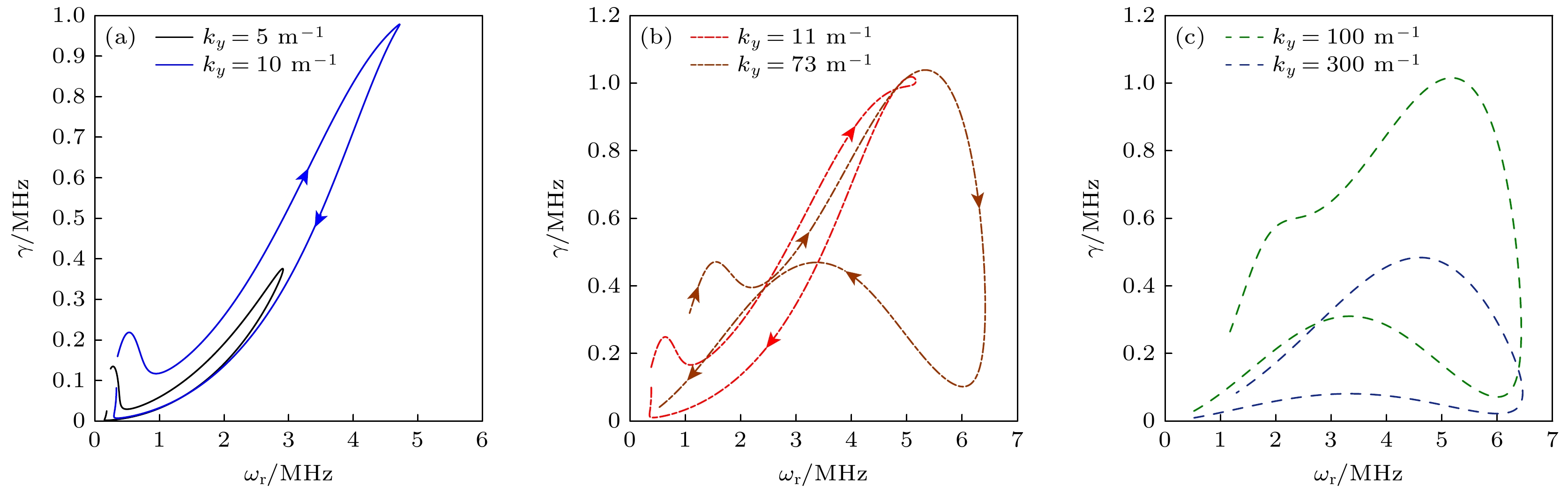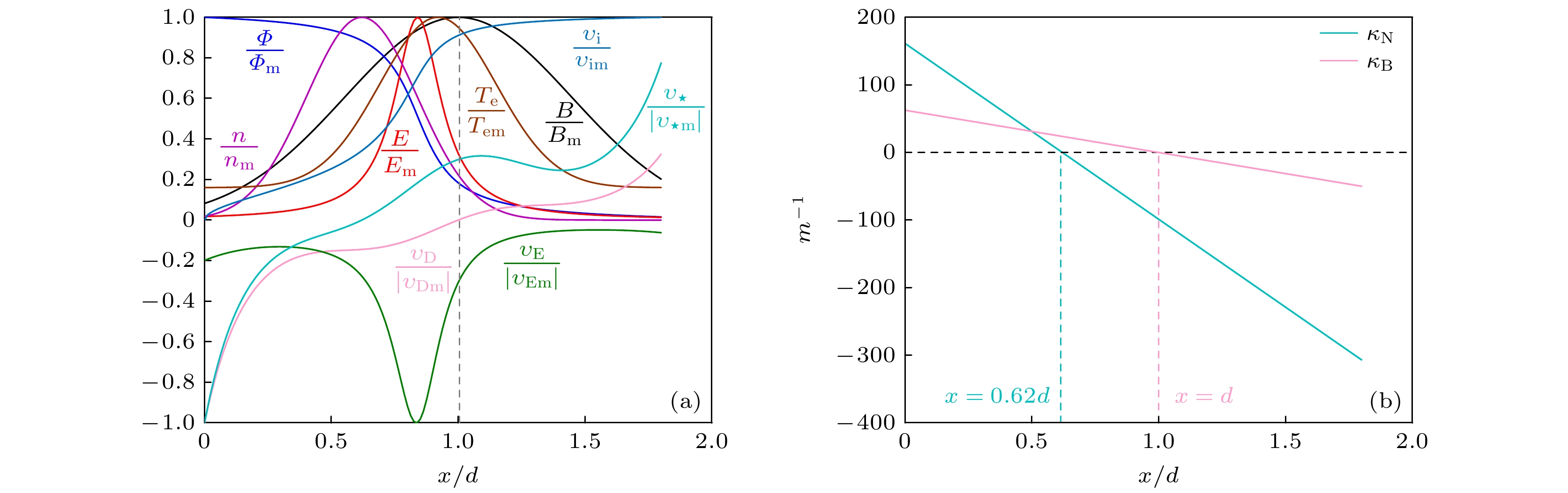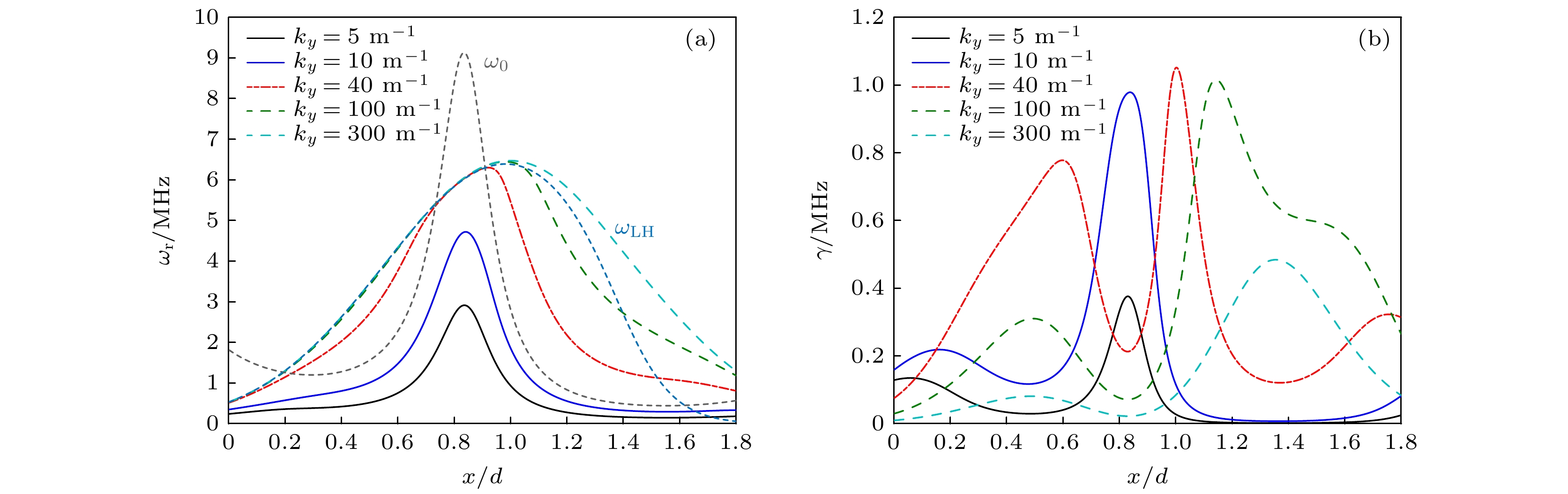 The free energy contained in electron drift, electron collision, and plasma density gradient, temperature, magnetic field gradient can trigger off the instabilities with different frequencies and wavelengths in hall thrusters. The instabilities will destroy the stable discharge of plasma, affecting the matching degree between the thruster and the power processing unit, and reducing the performance of the thruster. Based on this, the instabilities triggered off by electron collision, plasma density gradient, and magnetic field gradient in the hall thruster are studied by using dispersion relation derived from the fluid model. The results are shown below. 1) When in the model includes the effects of electron inertia, collision between electrons and neutral atoms, and electron drift, instability can be excited at any axial position from the near anode region to the plume region of the thruster. With the increase of azimuthal wavenumber\begin{document}${k_y} = 2\pi /\lambda $\end{document} , the lower-hybrid mode excited by electron collision transitions into the ion sound mode, where \begin{document}${k_y} = 2{\text{π }}/\lambda $\end{document} , \begin{document}$\lambda $\end{document} being the wave length. The real frequency \begin{document}${\omega _{\text{r}}}$\end{document} corresponding to the maximum growth rate \begin{document}${\gamma _{\max }}$\end{document} slightly decreases with collision frequency increasing for \begin{document}${k_y} = 10{\text{ }}{{\text{ m}}^{ - 1}}$\end{document} . However, the maximum real frequency and real frequency \begin{document}${\omega _{\text{r}}}$\end{document} corresponding to the maximum growth rate \begin{document}${k_y} = 300{{\text{ m}}^{ - 1}}$\end{document} will not change with collision frequency for \begin{document}${k_y} = 300{\text{ }}{{\text{ m}}^{ - 1}}$\end{document} . Independent of the value of \begin{document}${k_y}$\end{document} , the growth rate of mode triggered off by electron collision increases with collision frequency increasing. 2) The plasma density gradient effect plays a dominant role in triggering off instabilities when the electron inertia, electron-neutral collisions and plasma density gradient are simultaneously included in the model. The dynamic behavior of the model does not change with the increase of \begin{document}${k_y}$\end{document} , but the eigenvalue of the model increases with the \begin{document}${k_y}$\end{document} increasing. Since the sign of anti-drift frequency induced by the plasma density gradient is changed, the mode eigenvalues have the opposite change trend on both sides of point \begin{document}${\kappa _{\text{N}}}$\end{document} . When the sign of \begin{document}${\omega _r}$\end{document} and \begin{document}${\omega _r}$\end{document} are opposite, the density gradient effect has a stabilization effect on instability excitation (\begin{document}${\kappa _{\text{N}}} > 0$\end{document} ). When the sign of \begin{document}${\omega _{\text{s}}}$\end{document} and \begin{document}${\omega _{\text{r}}}$\end{document} are the same, the density gradient effect enhances the excitation of instability (\begin{document}${\kappa _{\text{N}}} < 0$\end{document} ). 3) If the plasma density gradient, magnetic field gradient, electron inertia and electron-neutral collisions are included in the dispersion, the mode eigenvalue relies on the electron drift frequency, and the diamagnetic drift frequency induced by the density gradient and magnetic field gradient. When the density gradient effect and the magnetic field gradient effect are considered, there is a stable window in the discharge channel. However, if the electron inertia and electron-neutral collisions are also included, the stable window will disappear.