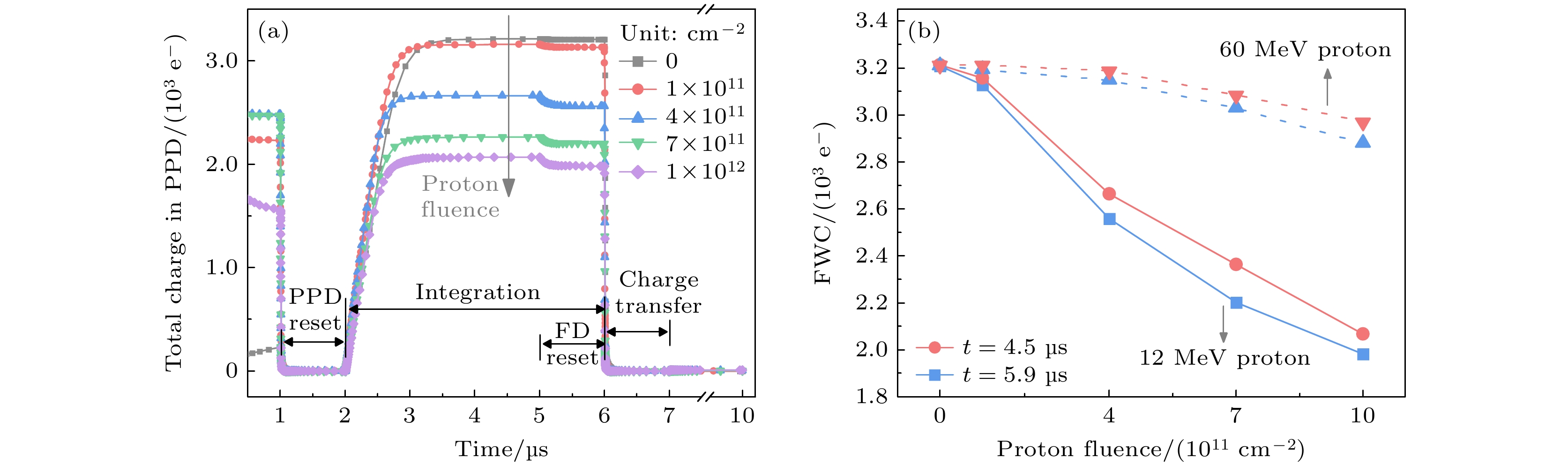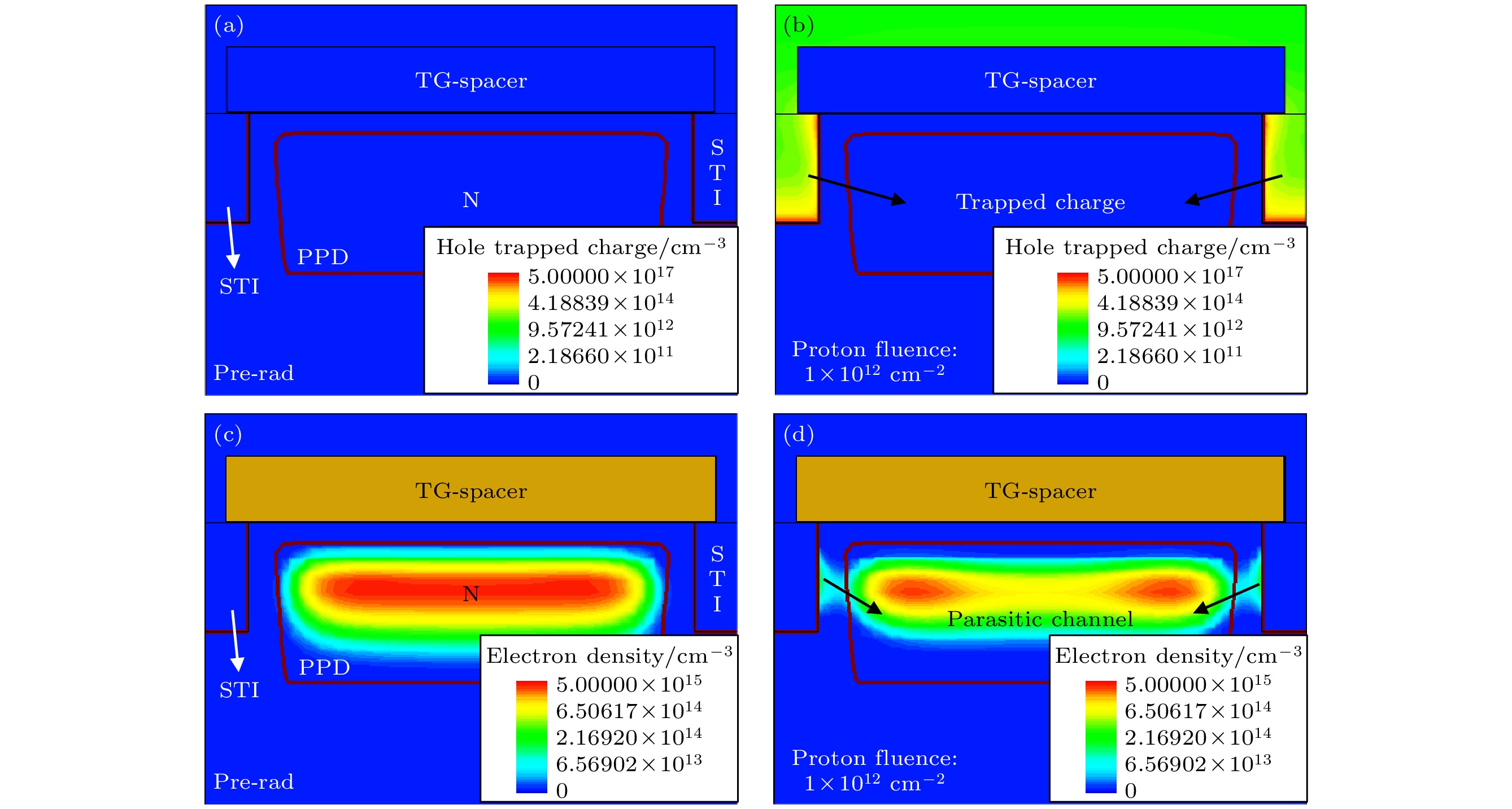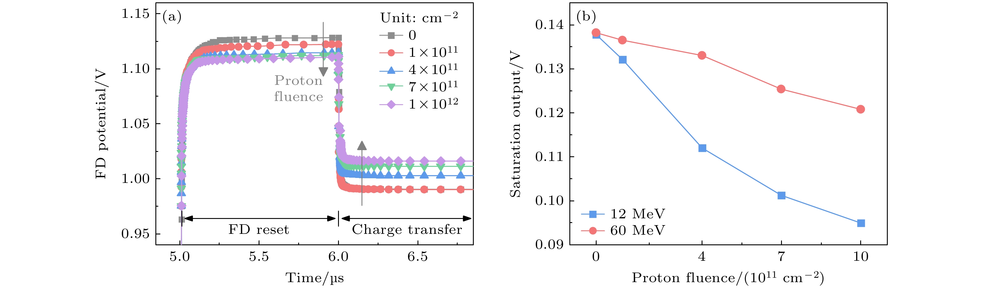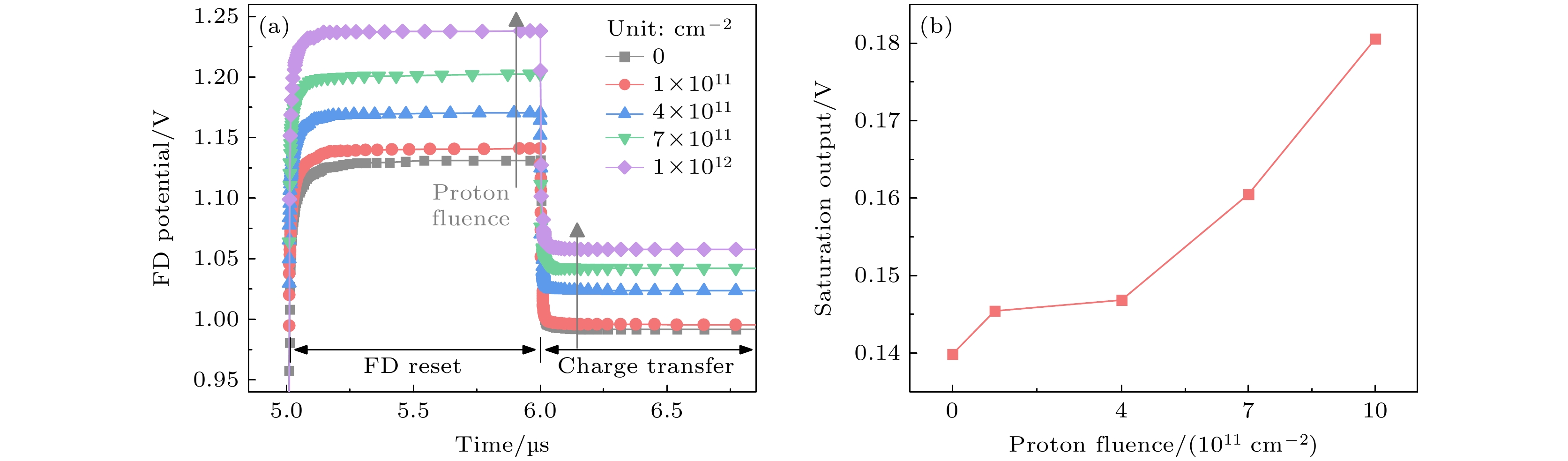 Complementary metal oxide semiconductor (CMOS) image sensors have been increasingly widely used in the field of radiation environments due to their numerous advantages, and their radiation effects have also attracted much attention. Some experimental studies have shown that the saturation output of CMOS image sensors decreases after irradiation, while others have reported that it increases. In this work, the further in-depth research on the inconsistent results is conducted based on the proton irradiation experiments and TCAD simulations, and the degradation mechanism in full well capacity, conversion factor, and saturation output of the 4T pinned photodiode (PPD) CMOS image sensors due to proton cumulative radiation effects are also analyzed. In experiments, the sensors are irradiated by 12 MeV and 60 MeV protons with a fluence up to 2× 1012 cm–2. The sensors are unbiased during irradiation. The experimental results show that proton irradiation at 12 MeV and 60 MeV result in an increase of 8.2% and 7.3% in conversion factor, respectively, and a decrease of 7.3% and 3.8% in full well capacity, respectively. The saturation output shows no significant change trend under 12 MeV proton irradiation, but increases by 3% under 60 MeV proton irradiation. In the TCAD simulation, a three-dimensional 4T PPD pixel model is constructed. A simulation method that combines the trap and gamma radiation model in TCAD with the mathematical model of minority carrier lifetime is used to simulate global and local cumulative proton irradiation in order to analyze the degradation mechanism. It is proposed that the degradation of saturation output at the pixel level is determined by the full well capacity of PPD, the physical characteristics of the reset transistor and the capacitance of floating diffusion, but they have opposite effects. Proton irradiation leads to the accumulation of oxide-trapped positive charges in the shallow trench isolation on both sides of PPD, resulting in the formation of leakage current path in silicon, thereby reducing the full well capacity. A decrease in full well capacity leads to a decrease in saturation output. While, the radiation effect of the reset transistor causes the potential of floating diffusion (FD) to increase during the FD reset phase, further leading to an increase in saturation output. The irradiation causes the capacitance of the floating diffusion to decrease, resulting in an increase in conversion factor and consequently increasing the saturation output. The difference in radiation sensitivity among the three influence factors at the pixel level may result in a decrease or increase in saturation output with proton fluence increasing. The above work comprehensively reveals and analyzes the mechanisms of degradation in full well capacity, conversion factor and saturation output after irradiation, and the research results have certain guiding significance for analyzing the radiation damage to CMOS image sensors.