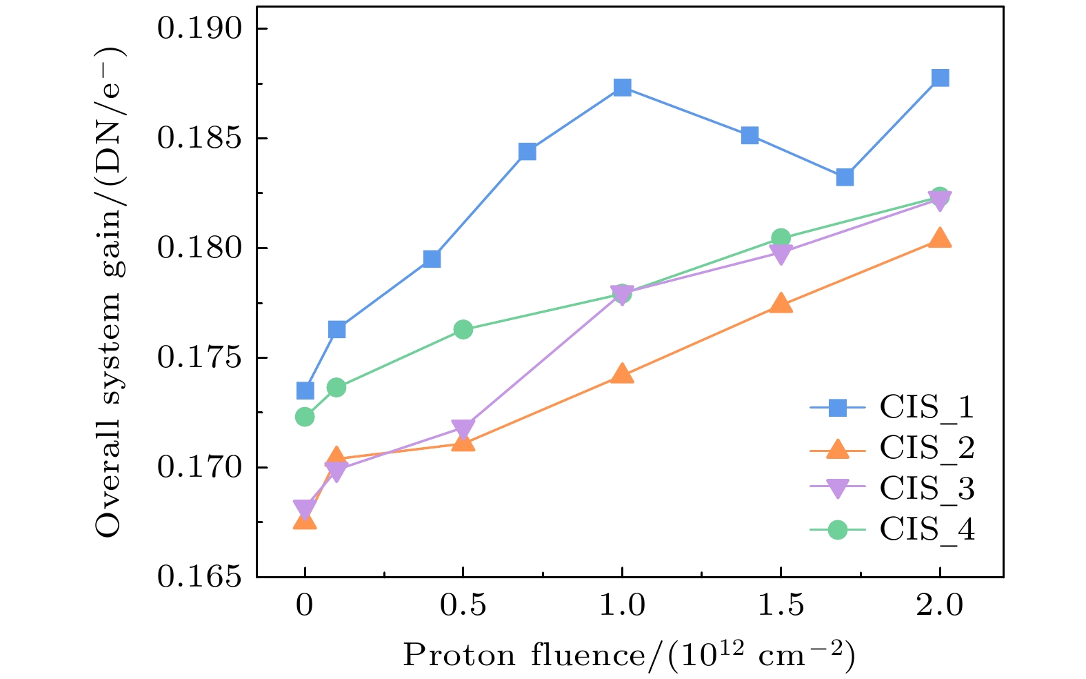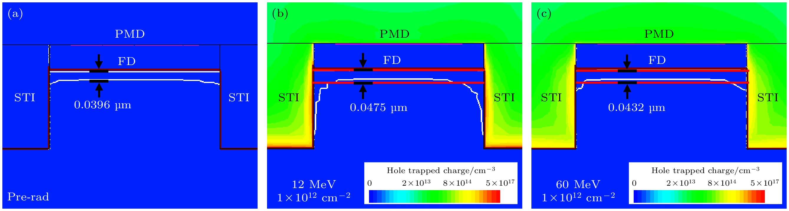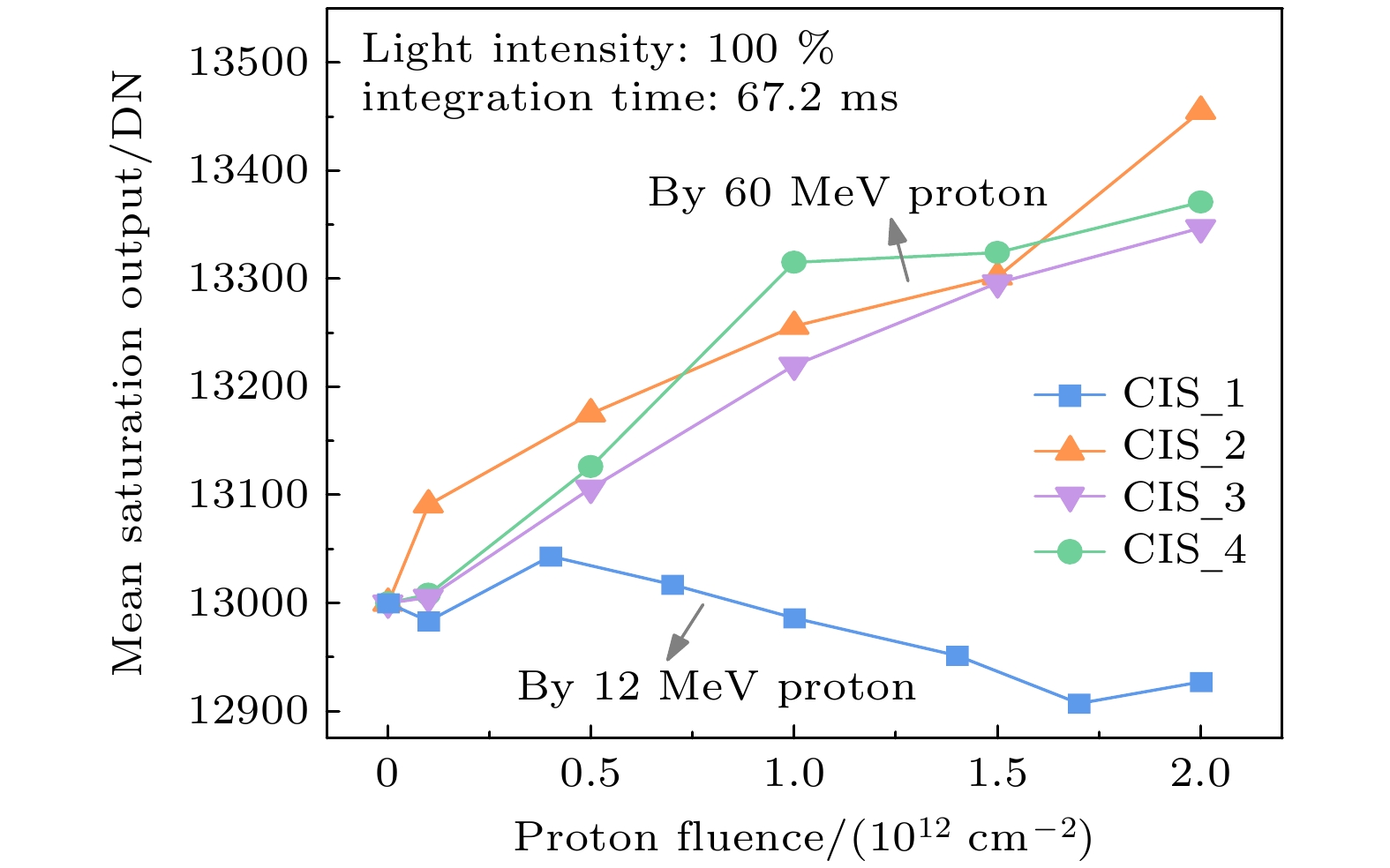 Complementary metal oxide semiconductor (CMOS) image sensors have been increasingly widely used in the field of radiation environments due to their numerous advantages, and their radiation effects have also attracted much attention. Some experimental studies have shown that the saturation output of CMOS image sensors decreases after irradiation, while others have reported that it increases. In this work, the further in-depth research on the inconsistent results is conducted based on the proton irradiation experiments and TCAD simulations, and the degradation mechanism in full well capacity, conversion factor, and saturation output of the 4T pinned photodiode (PPD) CMOS image sensors due to proton cumulative radiation effects are also analyzed. In experiments, the sensors are irradiated by 12 MeV and 60 MeV protons with a fluence up to 2× 1012 cm–2. The sensors are unbiased during irradiation. The experimental results show that proton irradiation at 12 MeV and 60 MeV result in an increase of 8.2% and 7.3% in conversion factor, respectively, and a decrease of 7.3% and 3.8% in full well capacity, respectively. The saturation output shows no significant change trend under 12 MeV proton irradiation, but increases by 3% under 60 MeV proton irradiation. In the TCAD simulation, a three-dimensional 4T PPD pixel model is constructed. A simulation method that combines the trap and gamma radiation model in TCAD with the mathematical model of minority carrier lifetime is used to simulate global and local cumulative proton irradiation in order to analyze the degradation mechanism. It is proposed that the degradation of saturation output at the pixel level is determined by the full well capacity of PPD, the physical characteristics of the reset transistor and the capacitance of floating diffusion, but they have opposite effects. Proton irradiation leads to the accumulation of oxide-trapped positive charges in the shallow trench isolation on both sides of PPD, resulting in the formation of leakage current path in silicon, thereby reducing the full well capacity. A decrease in full well capacity leads to a decrease in saturation output. While, the radiation effect of the reset transistor causes the potential of floating diffusion (FD) to increase during the FD reset phase, further leading to an increase in saturation output. The irradiation causes the capacitance of the floating diffusion to decrease, resulting in an increase in conversion factor and consequently increasing the saturation output. The difference in radiation sensitivity among the three influence factors at the pixel level may result in a decrease or increase in saturation output with proton fluence increasing. The above work comprehensively reveals and analyzes the mechanisms of degradation in full well capacity, conversion factor and saturation output after irradiation, and the research results have certain guiding significance for analyzing the radiation damage to CMOS image sensors.