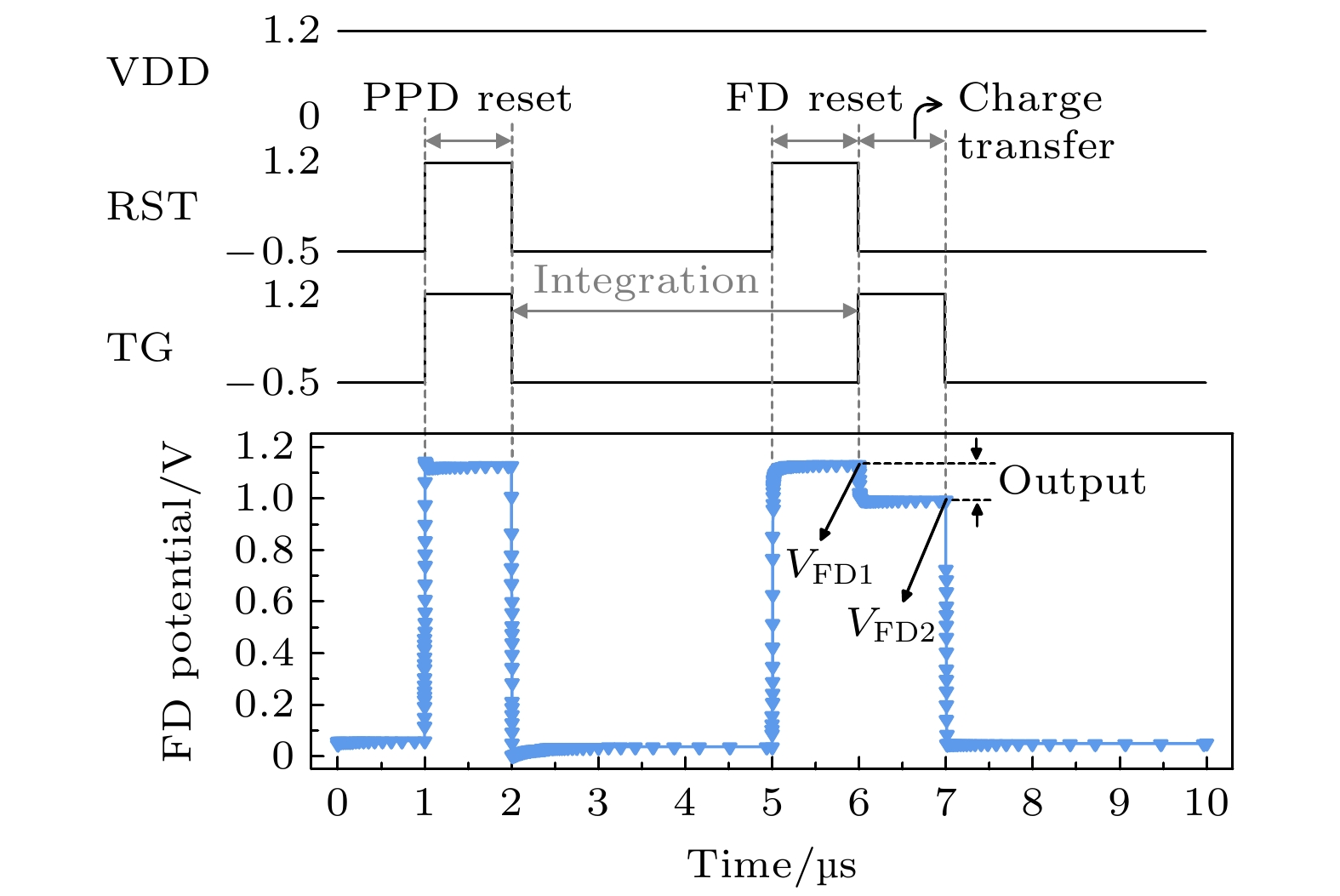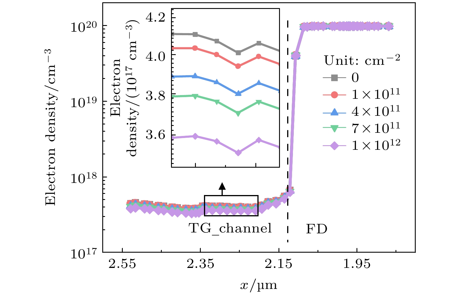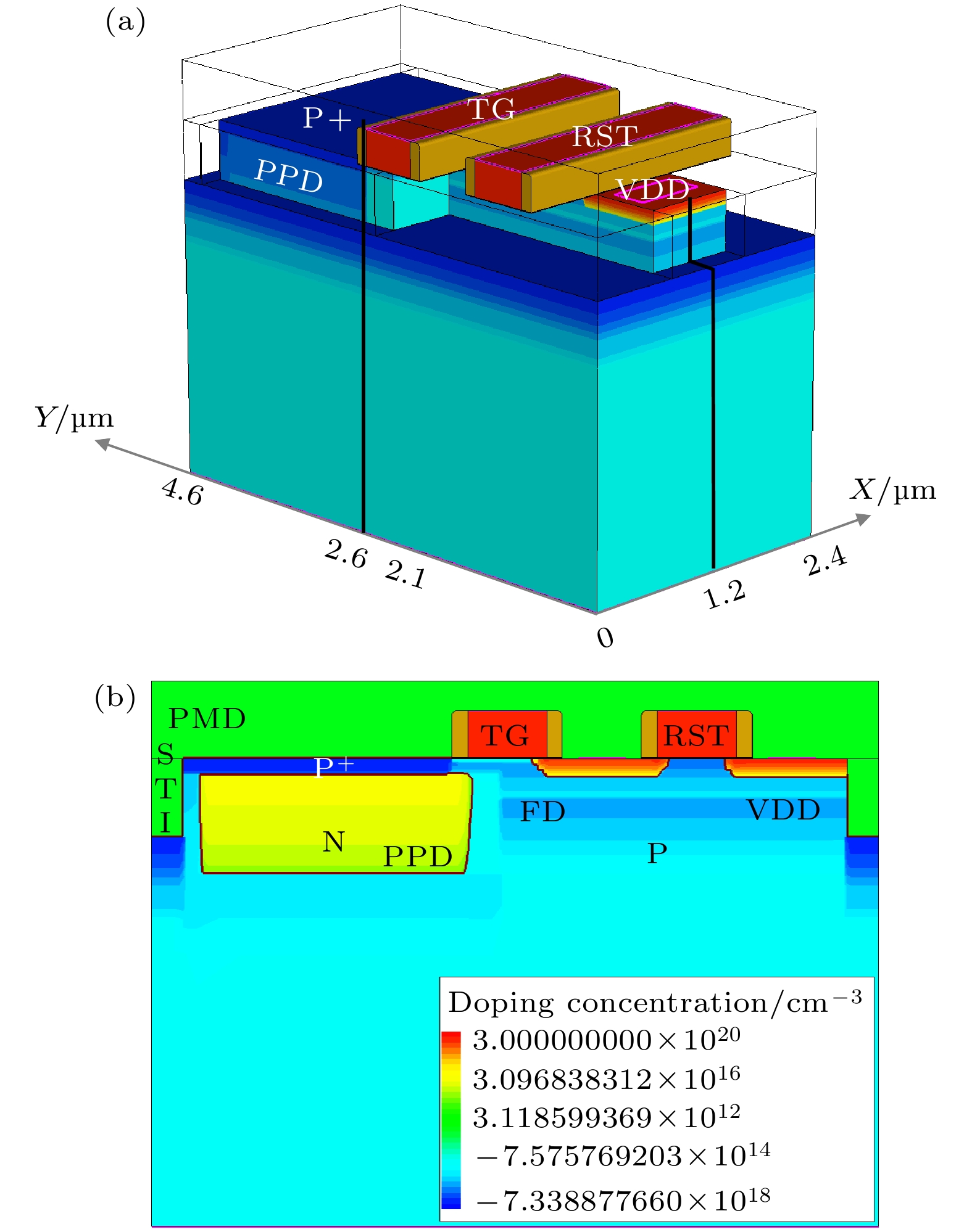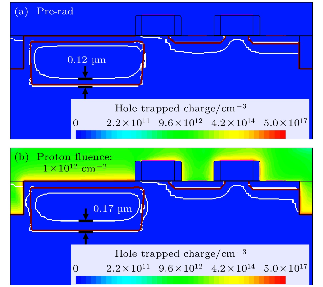 Complementary metal oxide semiconductor (CMOS) image sensors have been increasingly widely used in the field of radiation environments due to their numerous advantages, and their radiation effects have also attracted much attention. Some experimental studies have shown that the saturation output of CMOS image sensors decreases after irradiation, while others have reported that it increases. In this work, the further in-depth research on the inconsistent results is conducted based on the proton irradiation experiments and TCAD simulations, and the degradation mechanism in full well capacity, conversion factor, and saturation output of the 4T pinned photodiode (PPD) CMOS image sensors due to proton cumulative radiation effects are also analyzed. In experiments, the sensors are irradiated by 12 MeV and 60 MeV protons with a fluence up to 2× 1012 cm–2. The sensors are unbiased during irradiation. The experimental results show that proton irradiation at 12 MeV and 60 MeV result in an increase of 8.2% and 7.3% in conversion factor, respectively, and a decrease of 7.3% and 3.8% in full well capacity, respectively. The saturation output shows no significant change trend under 12 MeV proton irradiation, but increases by 3% under 60 MeV proton irradiation. In the TCAD simulation, a three-dimensional 4T PPD pixel model is constructed. A simulation method that combines the trap and gamma radiation model in TCAD with the mathematical model of minority carrier lifetime is used to simulate global and local cumulative proton irradiation in order to analyze the degradation mechanism. It is proposed that the degradation of saturation output at the pixel level is determined by the full well capacity of PPD, the physical characteristics of the reset transistor and the capacitance of floating diffusion, but they have opposite effects. Proton irradiation leads to the accumulation of oxide-trapped positive charges in the shallow trench isolation on both sides of PPD, resulting in the formation of leakage current path in silicon, thereby reducing the full well capacity. A decrease in full well capacity leads to a decrease in saturation output. While, the radiation effect of the reset transistor causes the potential of floating diffusion (FD) to increase during the FD reset phase, further leading to an increase in saturation output. The irradiation causes the capacitance of the floating diffusion to decrease, resulting in an increase in conversion factor and consequently increasing the saturation output. The difference in radiation sensitivity among the three influence factors at the pixel level may result in a decrease or increase in saturation output with proton fluence increasing. The above work comprehensively reveals and analyzes the mechanisms of degradation in full well capacity, conversion factor and saturation output after irradiation, and the research results have certain guiding significance for analyzing the radiation damage to CMOS image sensors.