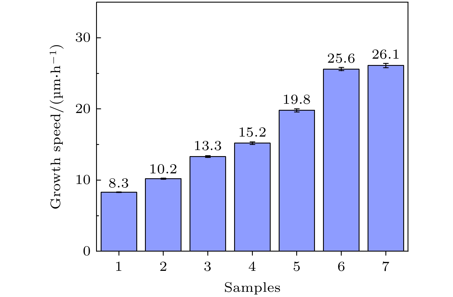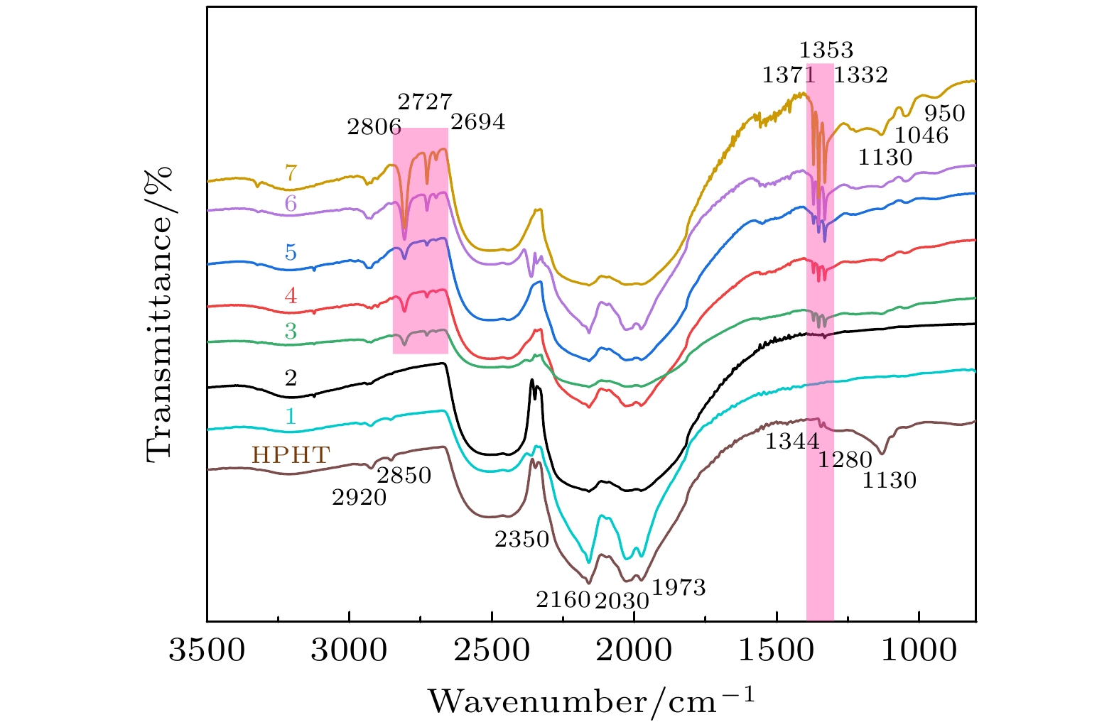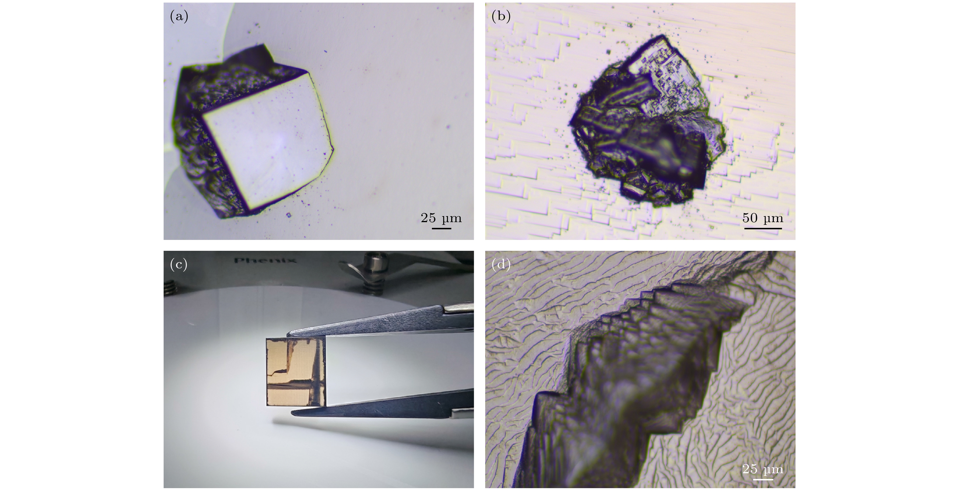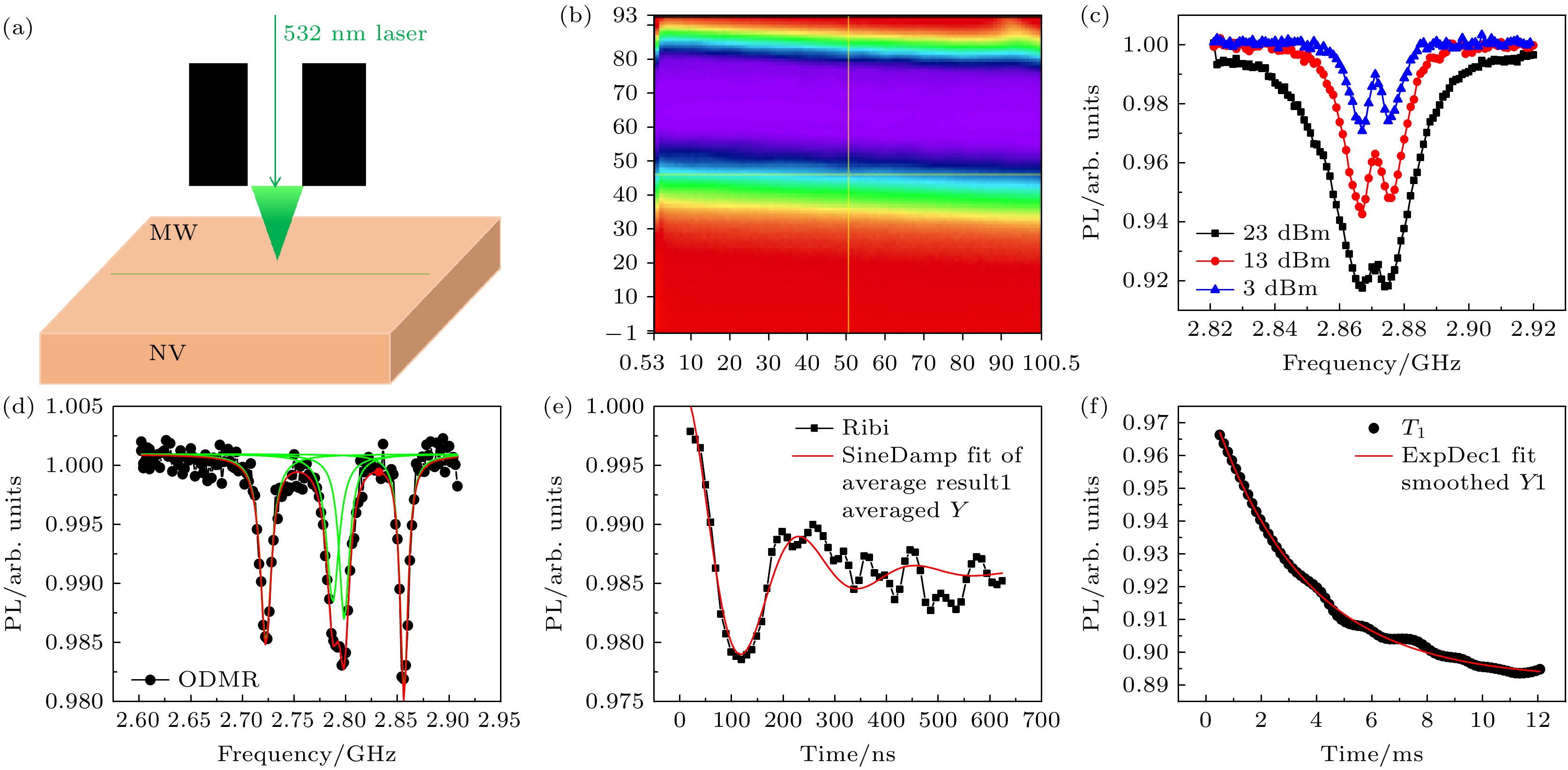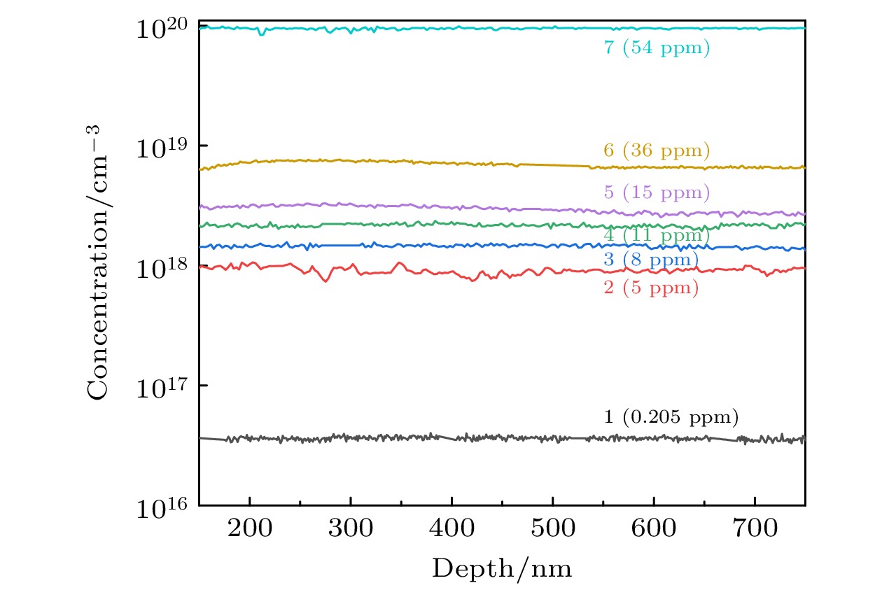 Diamond nitrogen vacancy (NV) color centers have good stability at room temperature and long electron spin coherence time, and can be manipulated by lasers and microwaves, thereby becoming the most promising structure in the field of quantum detection. Within a certain range, the higher the concentration of NV color centers, the higher the sensitivity of detecting physical quantities is. Therefore, it is necessary to dope sufficient nitrogen atoms into diamond single crystals to form high-concentration NV color centers. In this study, diamond single crystals with different nitrogen content are prepared by microwave plasma chemical vapor deposition (MPCVD) to construct high-concentration NV color centers. By doping different amounts of nitrogen atoms into the precursor gas, many problems encountered during long-time growth of diamond single crystals under high nitrogen conditions are solved. Diamond single crystals with nitrogen content of about 0.205, 5, 8, 11, 15, 36, and 54 ppm (1 ppm = 10–6) are prepared. As the nitrogen content increases, the width of the step flow on the surface of the diamond single crystal gradually widens, eventually the step flow gradually disappears and the surface becomes smooth. Under the experimental conditions in this study, it is preliminarily determined that the average ratio of the nitrogen content in the precursor gas to the nitrogen atom content introduced into the diamond single crystal lattice is about 11. Fourier transform infrared spectroscopy shows that as the nitrogen content inside the CVD diamond single crystal increases, the density of vacancy defects also increases. Therefore, the color of CVD high nitrogen diamond single crystals ranges from light brown to brownish black. Compared with HPHT diamond single crystal, the CVD high nitrogen diamond single crystal has a weak intensity of absorption peak at 1130 cm–1 and no absorption peak at 1280 cm–1. Three obvious nitrogen-related absorption peaks at 1371, 1353, and 1332 cm–1 of the CVD diamond single crystal are displayed. Nitrogen atoms mainly exist in the form of aggregated nitrogen and single substitutional N+ in diamond single crystals, rather than in the form of C-defect. The PL spectrum results show that defects such as vacancies inside the diamond single crystal with nitrogen content of 54 ppm are significantly increased after electron irradiation, leading to a remarkable increase in the concentration of NV color centers. The magnetic detection performance of the NV color center material after irradiation is verified, and the fluorescence intensity is uniformly distributed in the sample surface. The diamond single crystal with nitrogen content of 54 ppm has good microwave spin manipulation, and its longitudinal relaxation time is about 3.37 ms.