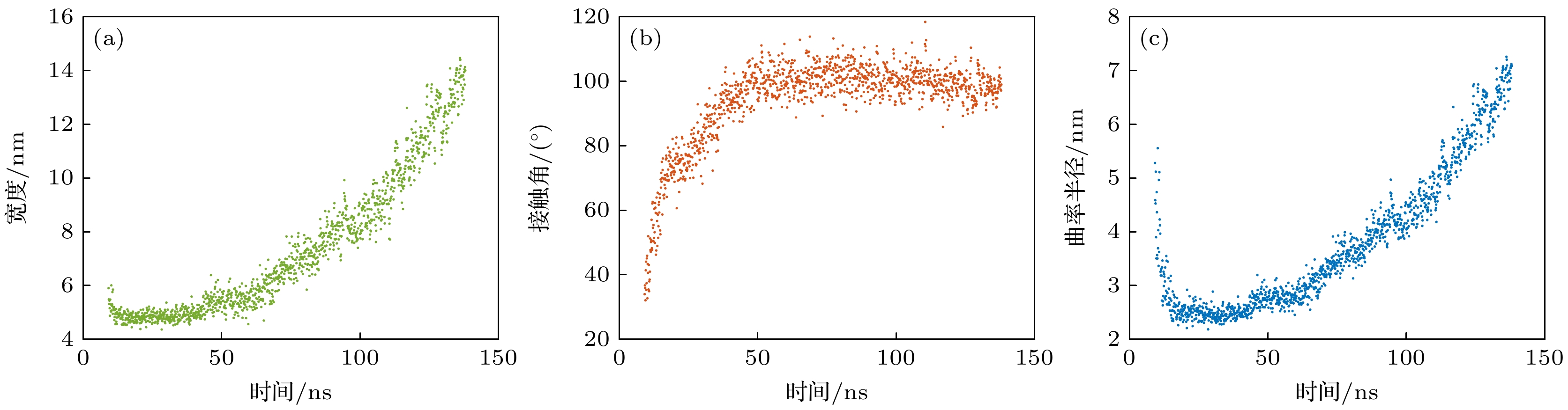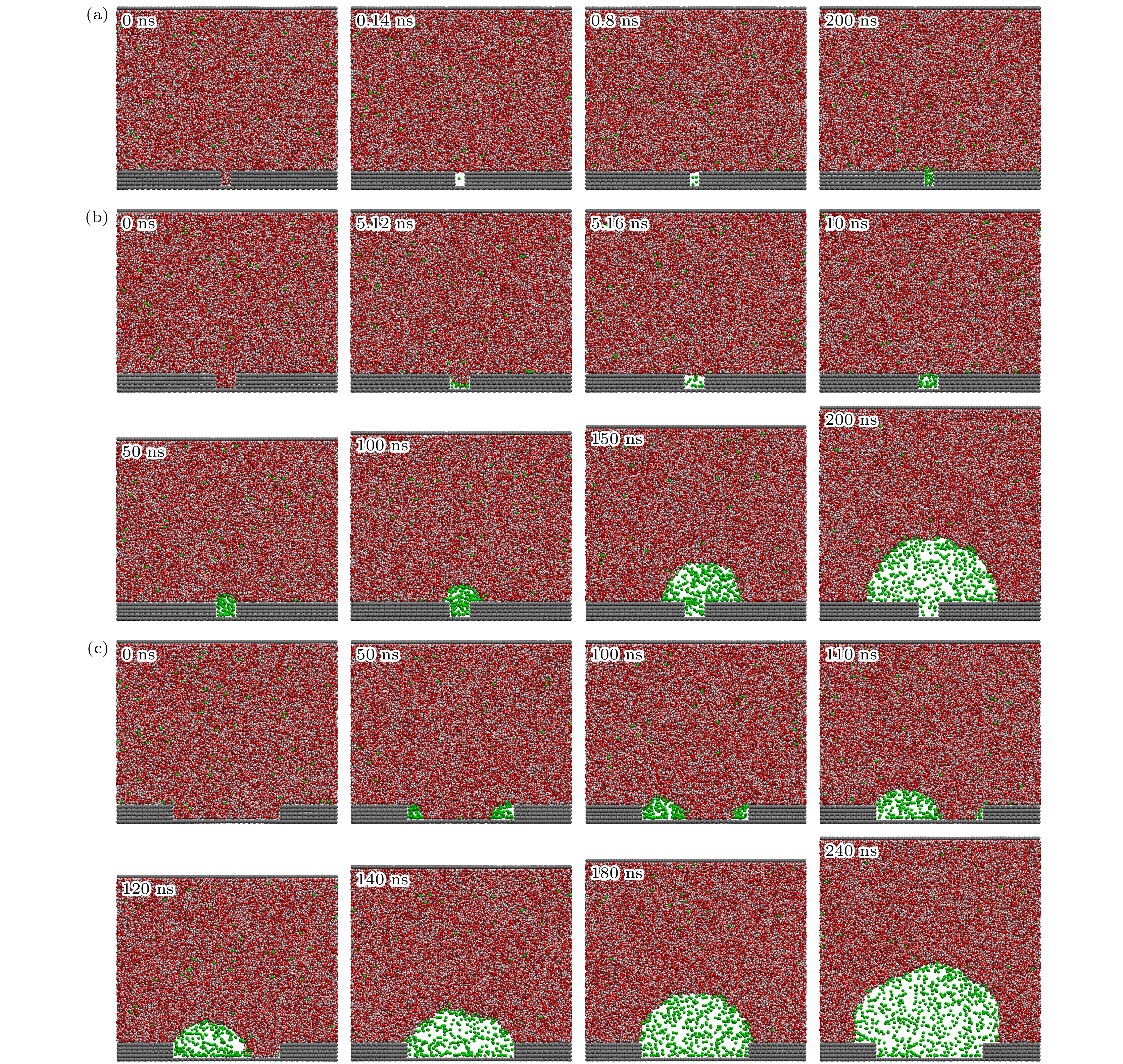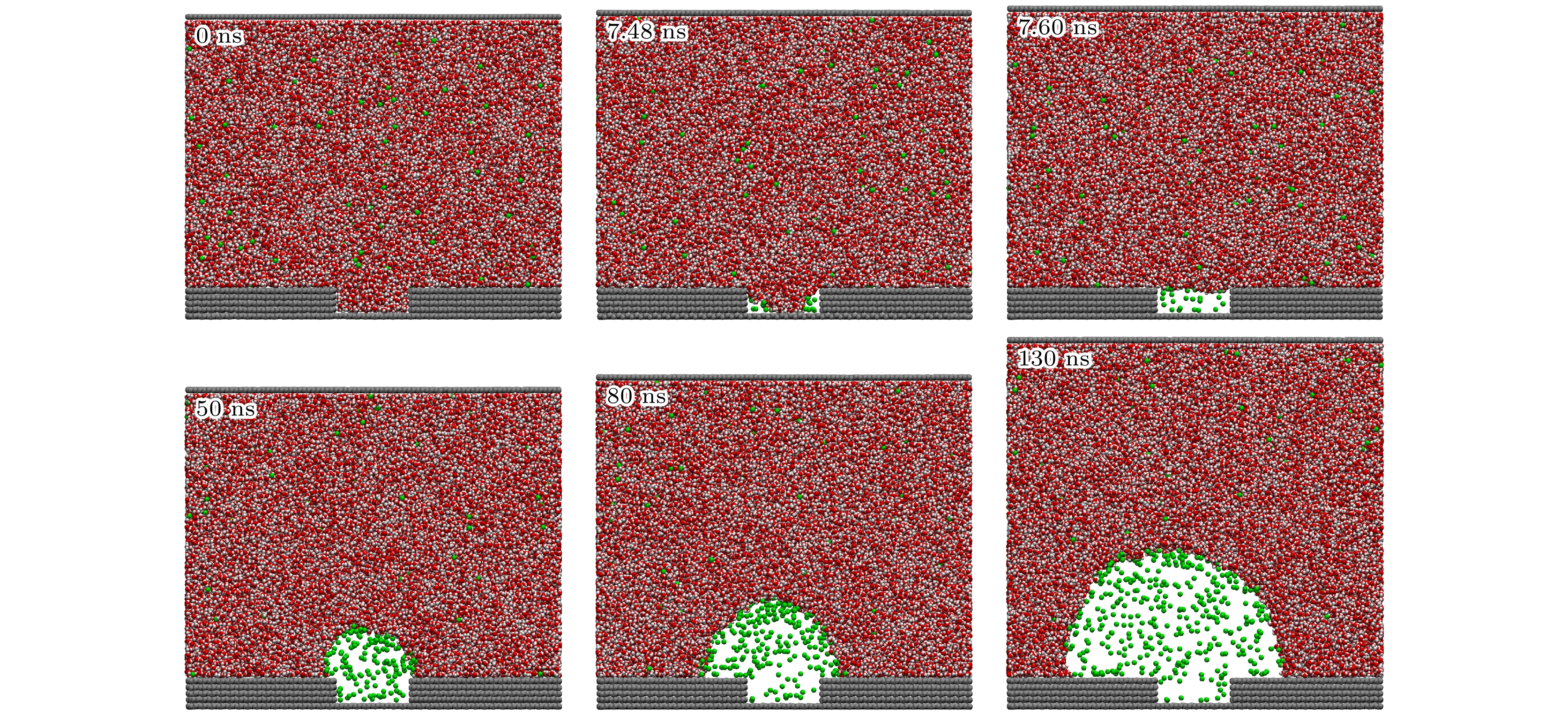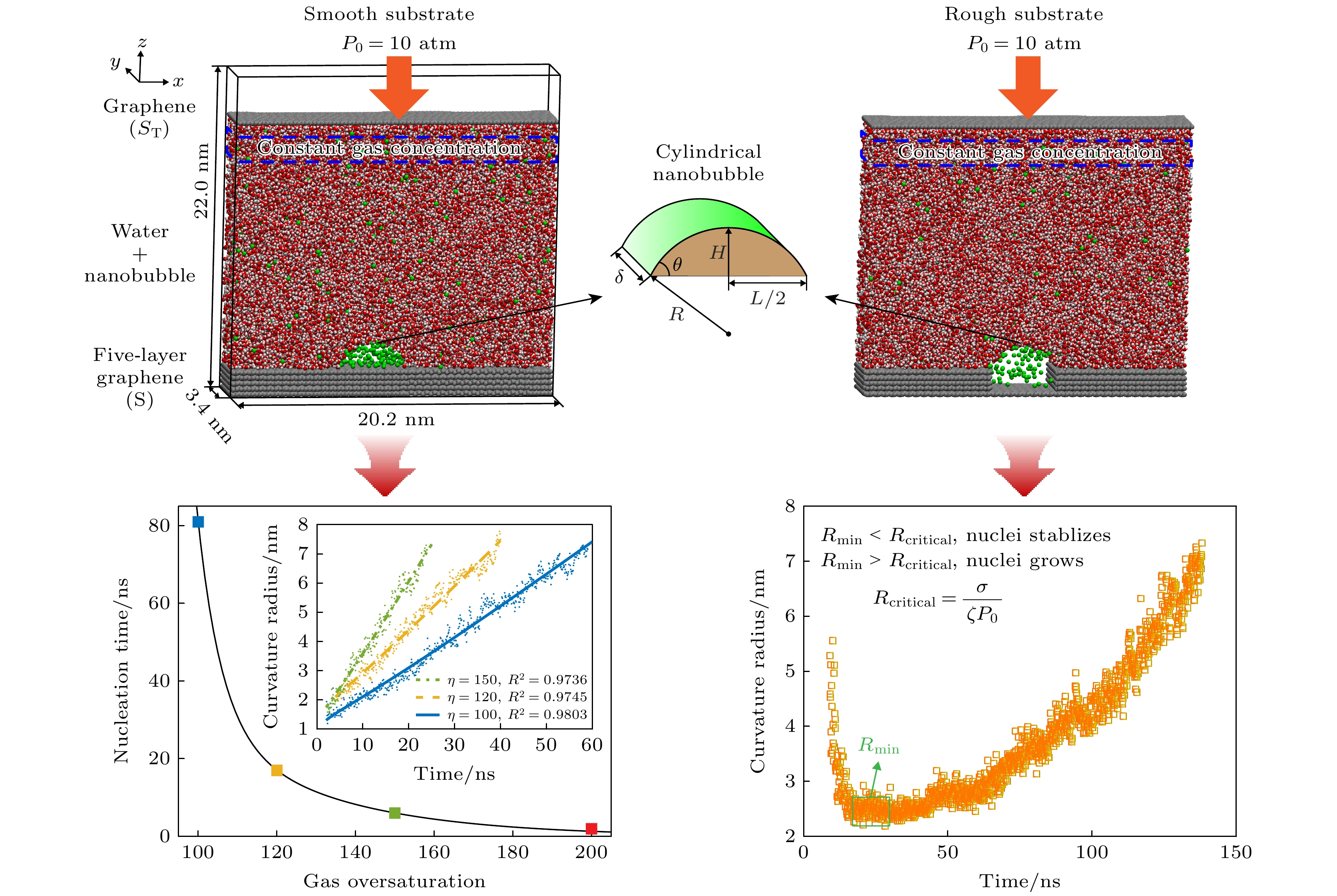 The interfacial nanobubbles (INBs) have been confirmed to exist, and have significant potential for applications in fields such as mineral flotation, aquaculture, and wastewater treatment. However, the microscopic nucleation process of INBs is still poorly understood. This study investigates the nucleation process and growth dynamics of INBs on smooth and rough surfaces under different levels of gas supersaturation. Molecular dynamics (MD) simulations using GROMACS software package are conducted to observe the microscopic nucleation process and the temporal evolution of the geometric characteristics of the INBs. Additionally, a growth dynamics model for INBs is derived based on the Epstein-Plesset gas diffusion theory, and the predictions from the model are compared with the MD simulation data. The results indicate that on smooth homogeneous surfaces, the curvature radius and width of INBs increase progressively with time after nucleation. This growth process is well captured by the theoretical model, indicating that the gas diffusion theory provides an accurate description of INB growth dynamics. In addition, the contact angle (measured on the gas side) during INB growth is not constant but increases initially before stabilizing. This phenomenon is caused by reducing solid-gas interfacial tension due to higher Laplace pressure, thus leading the contact angle to increase as the INB radius grows. Furthermore, on smooth homogeneous surfaces, INBs are observed to nucleate at 81, 17, 6, and 1.3 ns under gas supersaturation levels of 100, 120, 150, and 200, respectively. This demonstrates that higher gas supersaturation significantly shortens the nucleation time. Additionally, as gas supersaturation increases, the growth rate of INBs after nucleation will also accelerate. However, at a gas supersaturation level of 50, no nucleation occurrs during the simulation period of 200 ns. Theoretical analysis reveals that the INBs can only nucleate and grow when the radius of gas aggregates exceeds the critical nucleation radius (\begin{document}$ {R}_{{\mathrm{critical}}} = {\sigma }/({\zeta {P}_{0}}) $\end{document} , where \begin{document}$ \sigma $\end{document} is the liquid-gas interfacial tension, \begin{document}$ \zeta $\end{document} is the gas supersaturation level, and \begin{document}$ {P}_{0} $\end{document} is the ambient pressure). As gas supersaturation decreases, \begin{document}$ {R}_{{\mathrm{c}}{\mathrm{r}}{\mathrm{i}}{\mathrm{t}}{\mathrm{i}}{\mathrm{c}}{\mathrm{a}}{\mathrm{l}}} $\end{document} increases, thus significantly increasing the difficulty of nucleation. On rough surfaces, pits with widths of 1, 2, 4, and 10 nm are introduced. At a gas supersaturation of 50, where no INB nucleation occurrs on the smooth surfaces, gas nuclei rapidly form within the pits. However, only gas nuclei in pits with widths larger than 2 nm can grow into INBs. This is because in the growth process the pinning effect at the pit edges causes the curvature radius of the gas nucleus to initially decrease and then increase. Only when the minimum curvature radius exceeds the critical nucleation radius, can gas nuclei develop into INBs. The findings of this study provide more in-depth insights into the nucleation mechanism of INBs, and practical guidance for controlling their generation, and they also deliver theoretical support for relevant applications such as mineral flotation and other industrial processes.