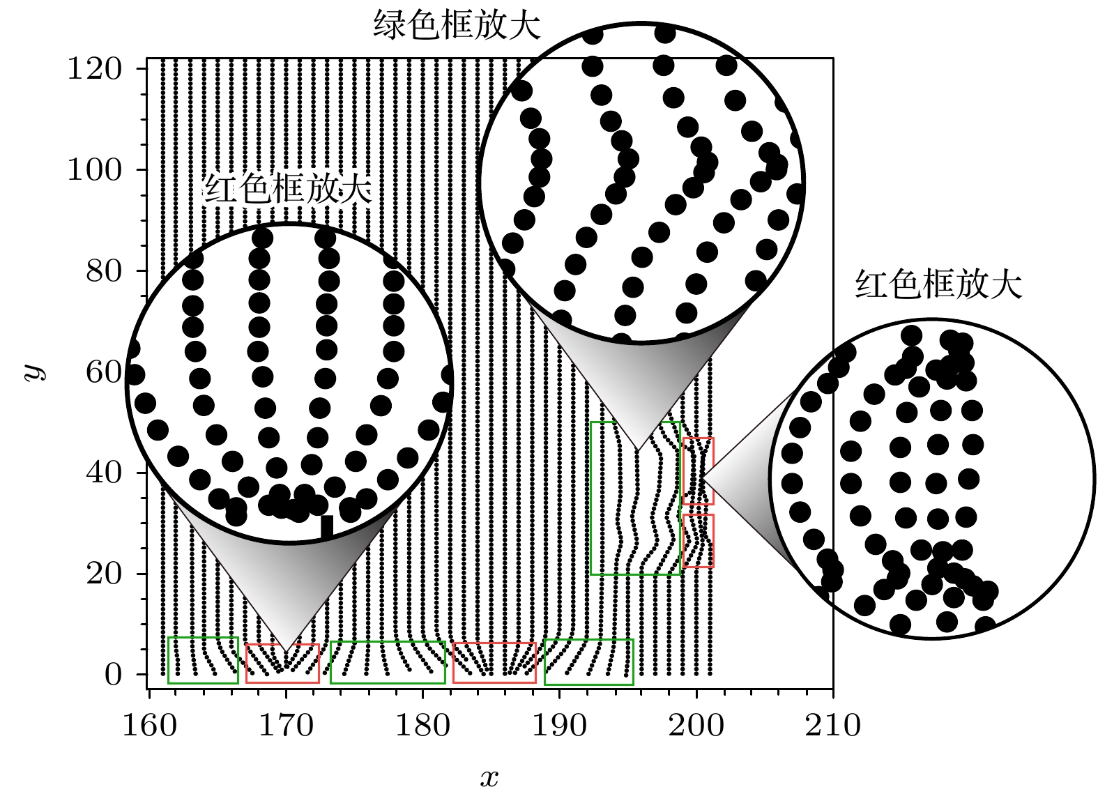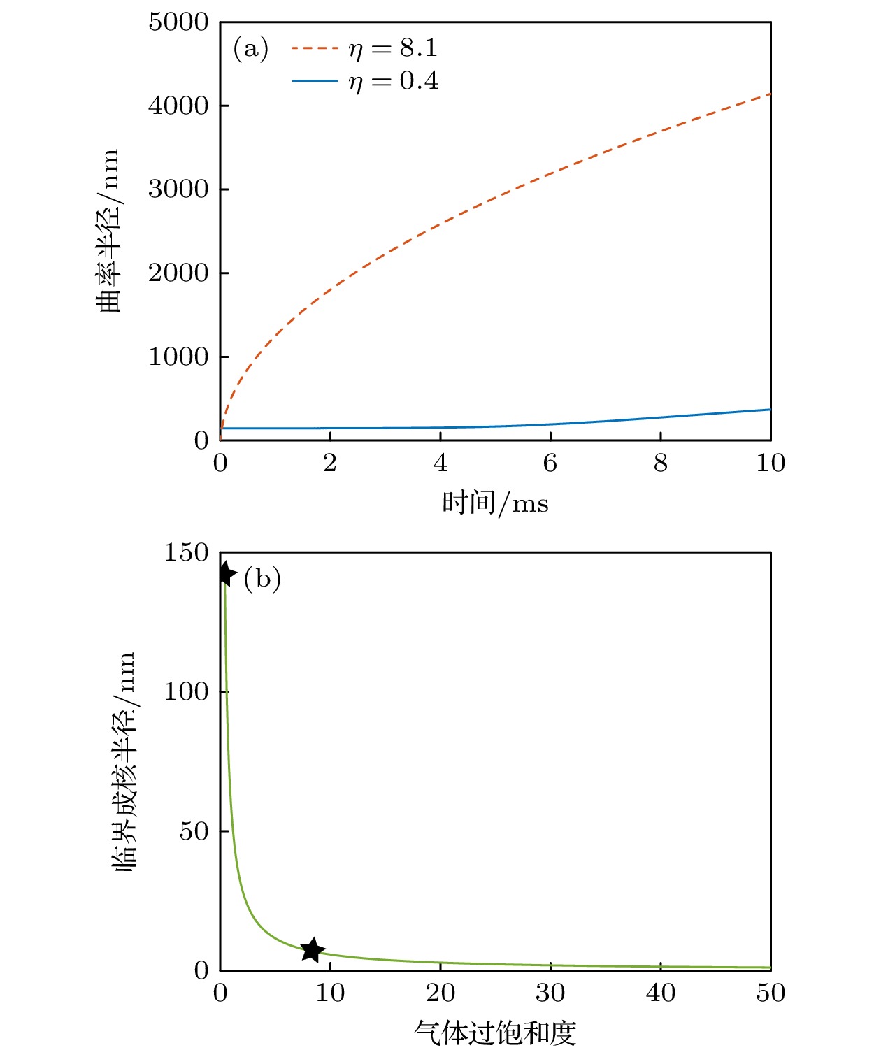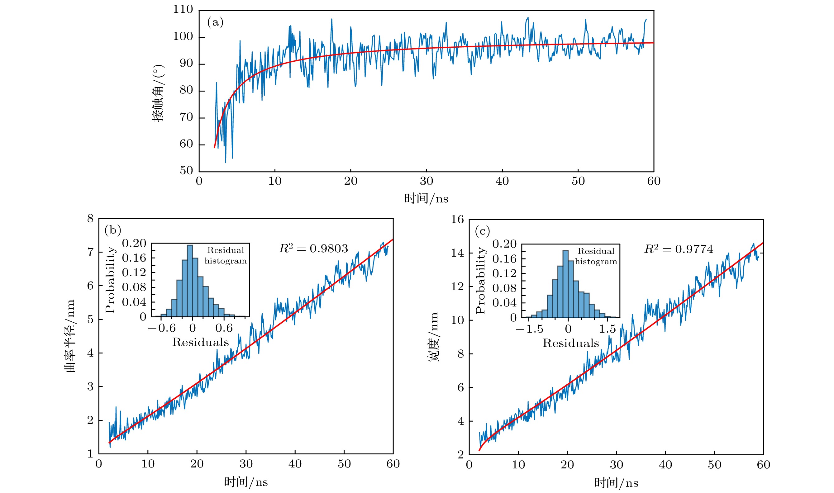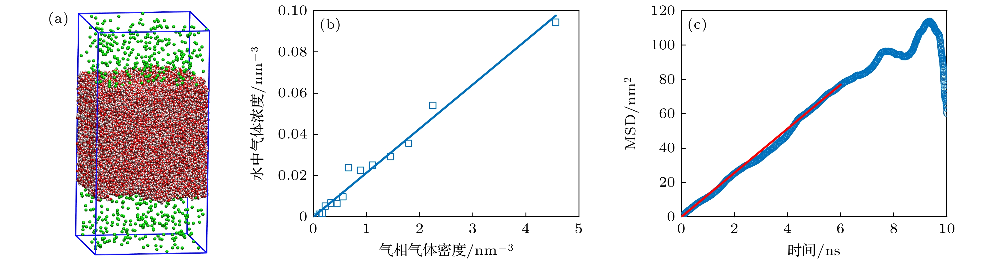 The interfacial nanobubbles (INBs) have been confirmed to exist, and have significant potential for applications in fields such as mineral flotation, aquaculture, and wastewater treatment. However, the microscopic nucleation process of INBs is still poorly understood. This study investigates the nucleation process and growth dynamics of INBs on smooth and rough surfaces under different levels of gas supersaturation. Molecular dynamics (MD) simulations using GROMACS software package are conducted to observe the microscopic nucleation process and the temporal evolution of the geometric characteristics of the INBs. Additionally, a growth dynamics model for INBs is derived based on the Epstein-Plesset gas diffusion theory, and the predictions from the model are compared with the MD simulation data. The results indicate that on smooth homogeneous surfaces, the curvature radius and width of INBs increase progressively with time after nucleation. This growth process is well captured by the theoretical model, indicating that the gas diffusion theory provides an accurate description of INB growth dynamics. In addition, the contact angle (measured on the gas side) during INB growth is not constant but increases initially before stabilizing. This phenomenon is caused by reducing solid-gas interfacial tension due to higher Laplace pressure, thus leading the contact angle to increase as the INB radius grows. Furthermore, on smooth homogeneous surfaces, INBs are observed to nucleate at 81, 17, 6, and 1.3 ns under gas supersaturation levels of 100, 120, 150, and 200, respectively. This demonstrates that higher gas supersaturation significantly shortens the nucleation time. Additionally, as gas supersaturation increases, the growth rate of INBs after nucleation will also accelerate. However, at a gas supersaturation level of 50, no nucleation occurrs during the simulation period of 200 ns. Theoretical analysis reveals that the INBs can only nucleate and grow when the radius of gas aggregates exceeds the critical nucleation radius (\begin{document}$ {R}_{{\mathrm{critical}}} = {\sigma }/({\zeta {P}_{0}}) $\end{document} , where \begin{document}$ \sigma $\end{document} is the liquid-gas interfacial tension, \begin{document}$ \zeta $\end{document} is the gas supersaturation level, and \begin{document}$ {P}_{0} $\end{document} is the ambient pressure). As gas supersaturation decreases, \begin{document}$ {R}_{{\mathrm{c}}{\mathrm{r}}{\mathrm{i}}{\mathrm{t}}{\mathrm{i}}{\mathrm{c}}{\mathrm{a}}{\mathrm{l}}} $\end{document} increases, thus significantly increasing the difficulty of nucleation. On rough surfaces, pits with widths of 1, 2, 4, and 10 nm are introduced. At a gas supersaturation of 50, where no INB nucleation occurrs on the smooth surfaces, gas nuclei rapidly form within the pits. However, only gas nuclei in pits with widths larger than 2 nm can grow into INBs. This is because in the growth process the pinning effect at the pit edges causes the curvature radius of the gas nucleus to initially decrease and then increase. Only when the minimum curvature radius exceeds the critical nucleation radius, can gas nuclei develop into INBs. The findings of this study provide more in-depth insights into the nucleation mechanism of INBs, and practical guidance for controlling their generation, and they also deliver theoretical support for relevant applications such as mineral flotation and other industrial processes.