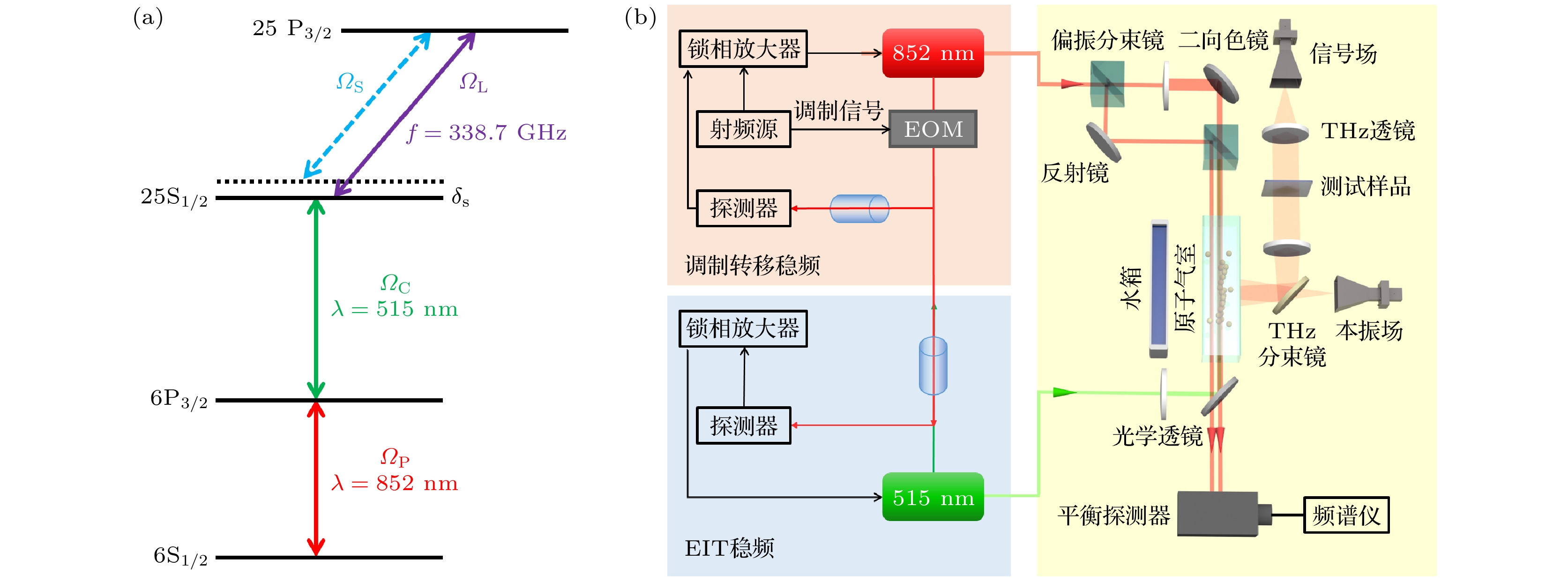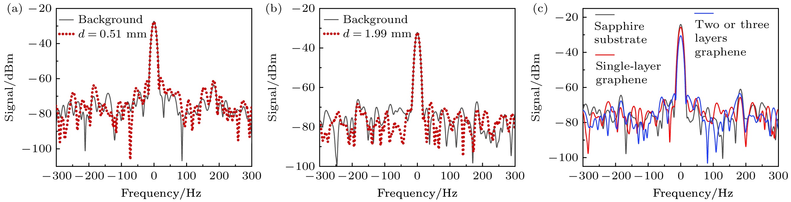 Terahertz thickness measurement is very important in materials research and industrial test. And it can beused to measure various materials such as wood, paper, ceramics, plastics, and composite materials. Atomic superheterodyne terahertz detector has extremely high sensitivity. The sensitivity of terahertz electric field strength measurement can reach 5.76 μV/(cm·Hz1/2). Simultaneously, the linear dynamic range is better than 60 dB. So, it can be used to precisely measure the thickness of materials through the terahertz transmission efficiency. The experiments in this work demonstrate the thickness measurement of sapphire crystal and organic materials PTFE. The terahertz signal is shown in Fig. (a) sapphire material and Fig. (b) PTFE material. The thickness can be calculated from the transmittance, and the result is consistent with the result measured directly with a vernier caliper. Furthermore, single-layer graphene and few-layer graphene can be clearly distinguished from terahertz transmission signals as shown in Fig. (c) graphene material. Even for niobium meta thin films with thickness of 1 μm, very weak terahertz signal can be well distinguished due to the high sensitivity of atomic superheterodyne terahertz detector. In summary, the technology developed for terahertz thickness measurement based on atomic superheterodyne detection is very important for detecting defects, checking coating, and measuring the parameters of materials.