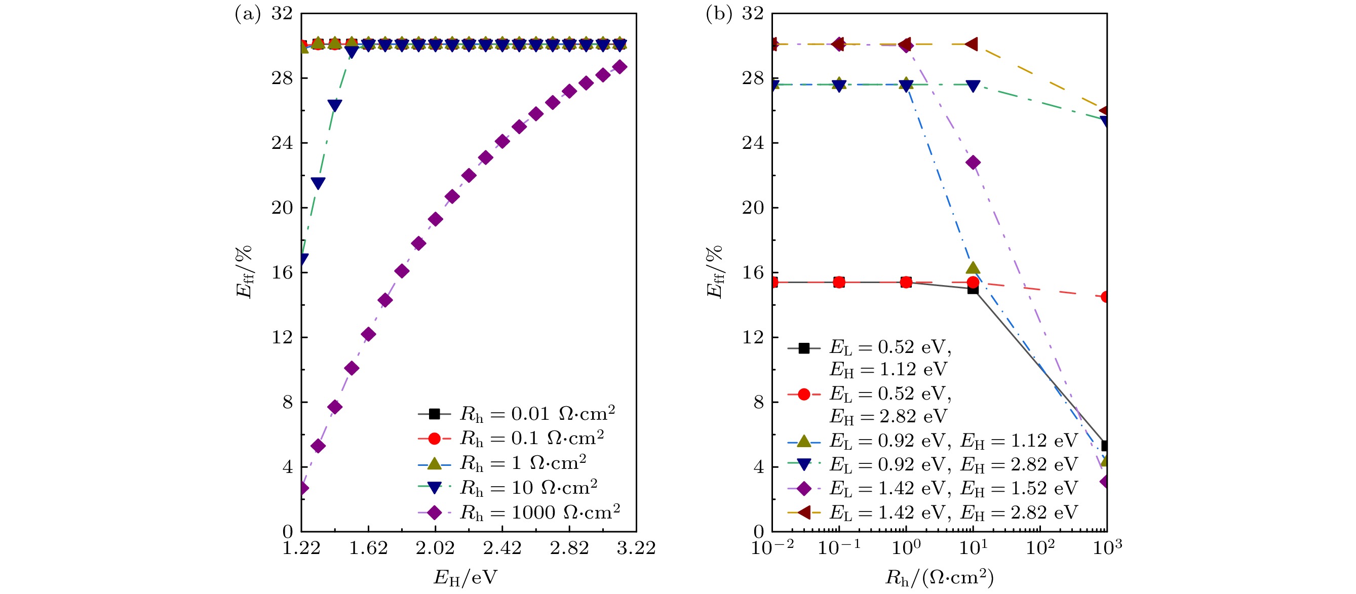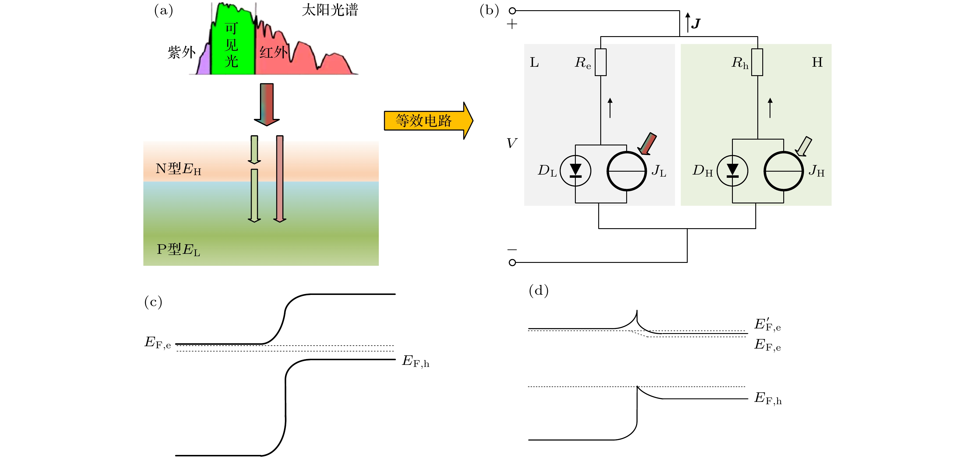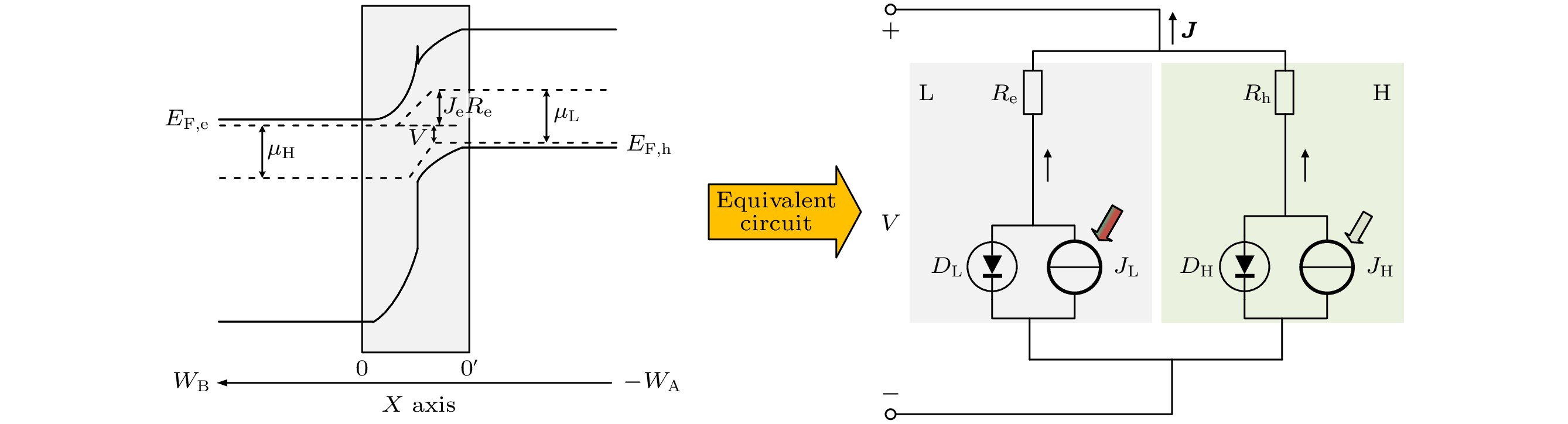 The ideal solar cell defined by the Shockley-Queisser (S-Q) theory is an important milestone in the analysis of photovoltaic devices based on some assumptions. One or more of the above assumptions are gradually avoided, and even exceed or approach the S-Q efficiency limit, so the development and improvement of S-Q theory is necessary. Heterojunction solar cells are one of the hot research fields in photovoltaics. In order to address the hindering effect of energy band discontinuity in the spatial barrier region of heterojunction solar cells on the transport of photogenerated carriers, the assumptions of S-Q theory based on the original S-Q theory of photovoltaic cells are revised in this work. The carrier mobility in the barrier region is assumed to be finite, and the infinite mobility in the S-Q model is abandoned. But the mobility in the N-type and the P-type neutral region are still infinite. The lumped relationship between carrier mobility and resistance in the barrier region is derived. Therefore, the physical process of charge transport is described in detail in this paper based on the continuity equation for semiconductors by considering the effect of absorption coefficients to prevent the quasi-Fermi level from crossing the conduction or valence band. Thus, the revised S-Q theoretical limit model of heterojunction solar cell is constructed. The diode equivalent circuit diagram is deduced and the photovoltaic conversion efficiency is evaluated eventually. The loss effects of charge transmission and band gap mismatch on the performance of heterojunction solar cells are analyzed in detail. The calculation results under the condition of 5780 K blackbody radiation and 300 K cell temperature with N-type wide bandgap (EH) and P-type narrow bandgap (EL) materials show that the highest conversion efficiency is about 31% with a hole resistance of 0.01 Ω·cm2 and electronic resistance of 0.01 Ω·cm2. The calculations show that the electronic resistance has a more negative and complicated effect on solar cell performance than hole resistance. When Re and Rh are small, the best conversion efficiency is in a range between 1.22 eV and 1.32 eV of the narrow bandgap. Increasing Re can increase the open circuit voltage of solar cells, but there are losses in efficiency and fill factor of solar cells. When Re is large enough, for example, Re = 1000 Ω·cm2, the open circuit voltage of solar cells is not limited by EL and can exceed the bandgap limit of the narrow bandgap material. Increasing Rh will also reduce efficiency, but the effect is not so great as Re. The change of absorption coefficient can cause the photogenerated current of L and H branches to change, and the radiation recombination losses of both branches can be regulated.