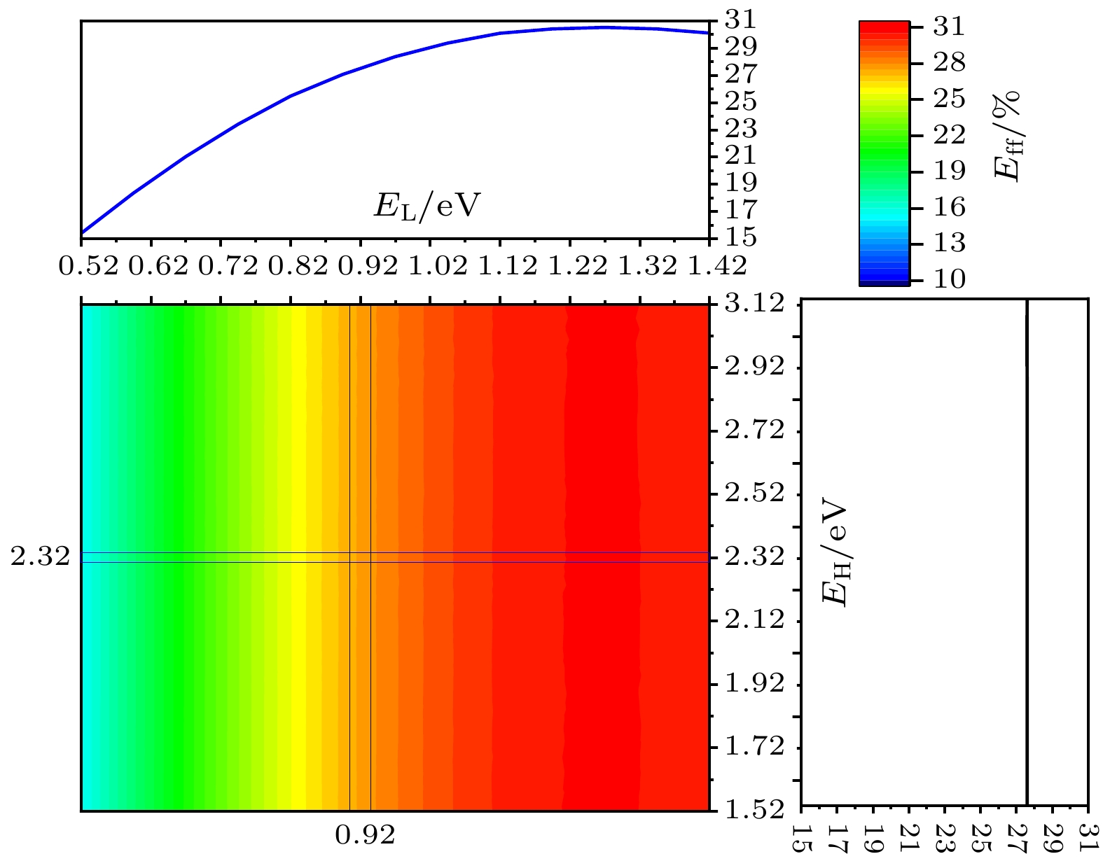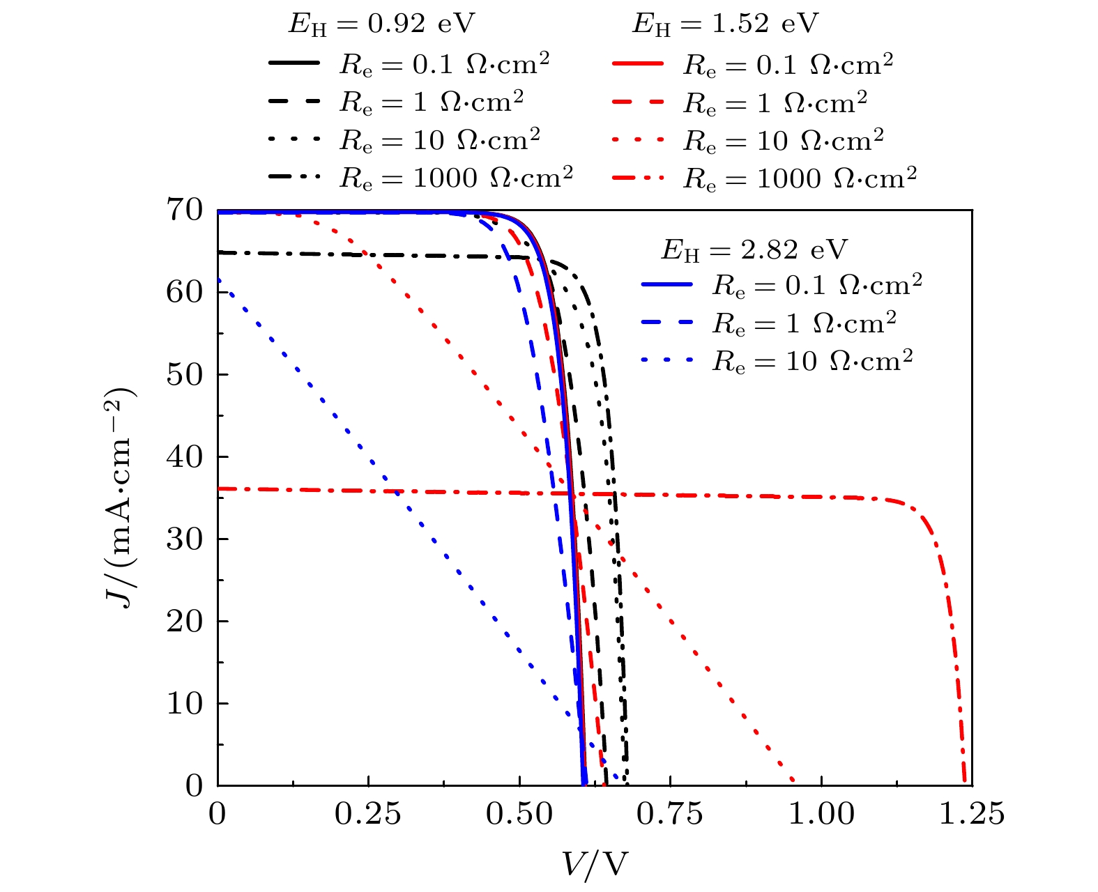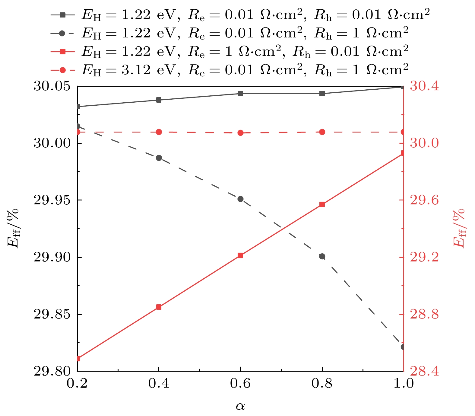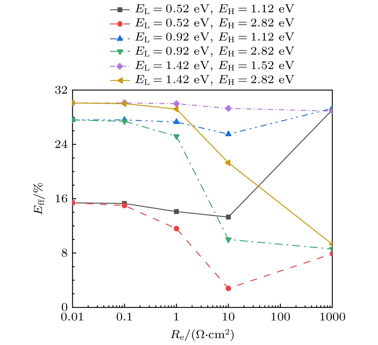 The ideal solar cell defined by the Shockley-Queisser (S-Q) theory is an important milestone in the analysis of photovoltaic devices based on some assumptions. One or more of the above assumptions are gradually avoided, and even exceed or approach the S-Q efficiency limit, so the development and improvement of S-Q theory is necessary. Heterojunction solar cells are one of the hot research fields in photovoltaics. In order to address the hindering effect of energy band discontinuity in the spatial barrier region of heterojunction solar cells on the transport of photogenerated carriers, the assumptions of S-Q theory based on the original S-Q theory of photovoltaic cells are revised in this work. The carrier mobility in the barrier region is assumed to be finite, and the infinite mobility in the S-Q model is abandoned. But the mobility in the N-type and the P-type neutral region are still infinite. The lumped relationship between carrier mobility and resistance in the barrier region is derived. Therefore, the physical process of charge transport is described in detail in this paper based on the continuity equation for semiconductors by considering the effect of absorption coefficients to prevent the quasi-Fermi level from crossing the conduction or valence band. Thus, the revised S-Q theoretical limit model of heterojunction solar cell is constructed. The diode equivalent circuit diagram is deduced and the photovoltaic conversion efficiency is evaluated eventually. The loss effects of charge transmission and band gap mismatch on the performance of heterojunction solar cells are analyzed in detail. The calculation results under the condition of 5780 K blackbody radiation and 300 K cell temperature with N-type wide bandgap (EH) and P-type narrow bandgap (EL) materials show that the highest conversion efficiency is about 31% with a hole resistance of 0.01 Ω·cm2 and electronic resistance of 0.01 Ω·cm2. The calculations show that the electronic resistance has a more negative and complicated effect on solar cell performance than hole resistance. When Re and Rh are small, the best conversion efficiency is in a range between 1.22 eV and 1.32 eV of the narrow bandgap. Increasing Re can increase the open circuit voltage of solar cells, but there are losses in efficiency and fill factor of solar cells. When Re is large enough, for example, Re = 1000 Ω·cm2, the open circuit voltage of solar cells is not limited by EL and can exceed the bandgap limit of the narrow bandgap material. Increasing Rh will also reduce efficiency, but the effect is not so great as Re. The change of absorption coefficient can cause the photogenerated current of L and H branches to change, and the radiation recombination losses of both branches can be regulated.