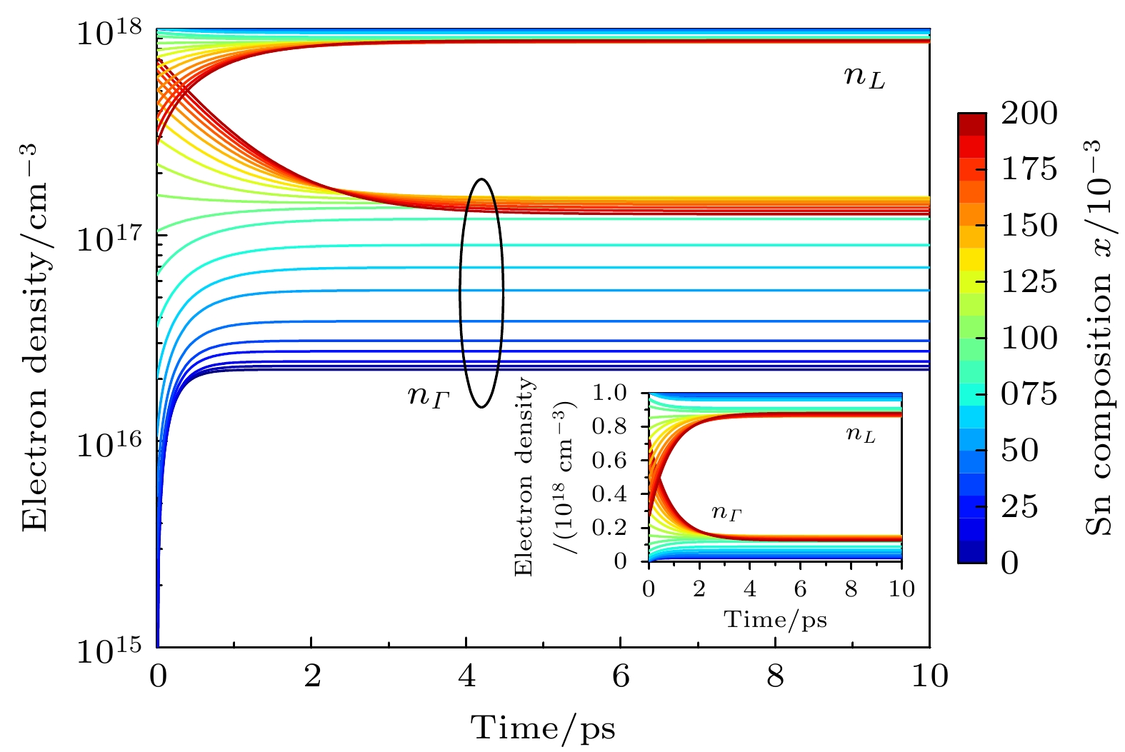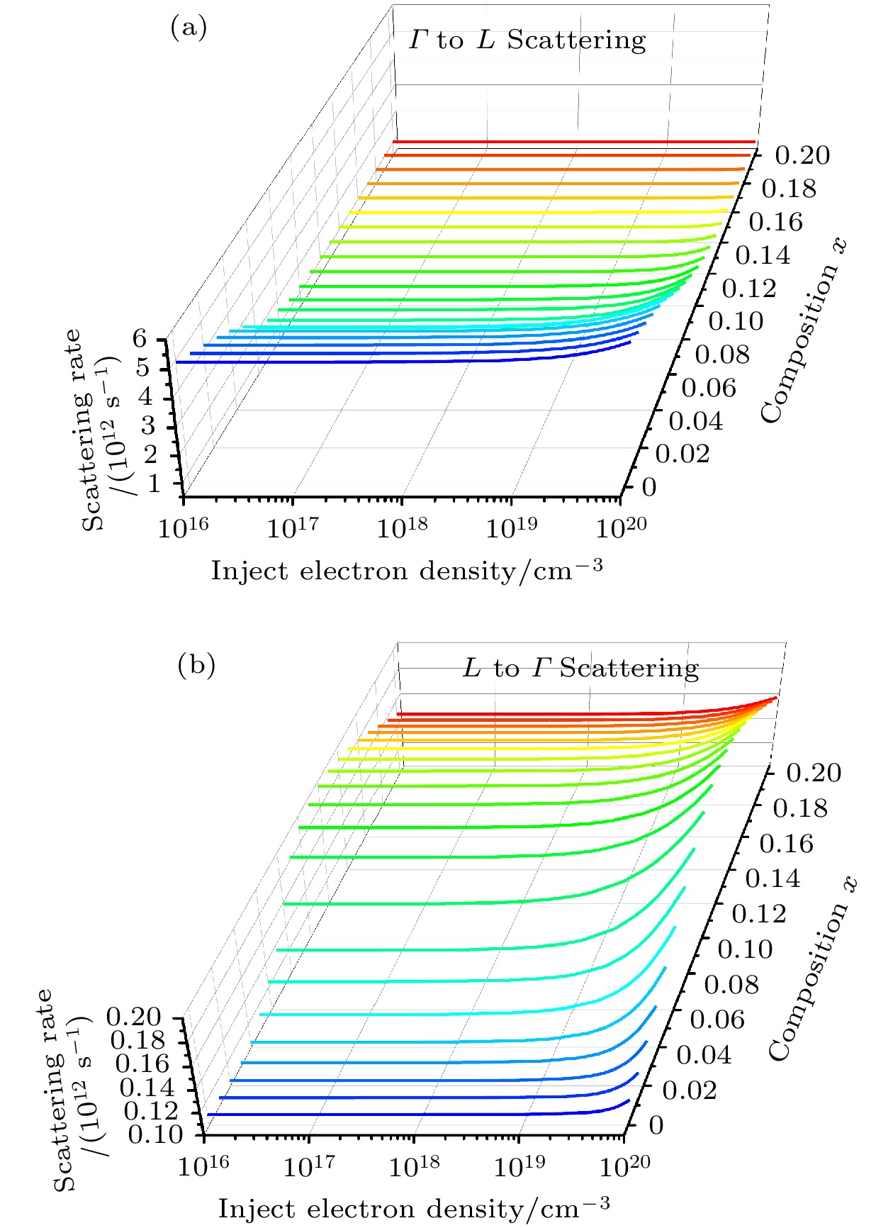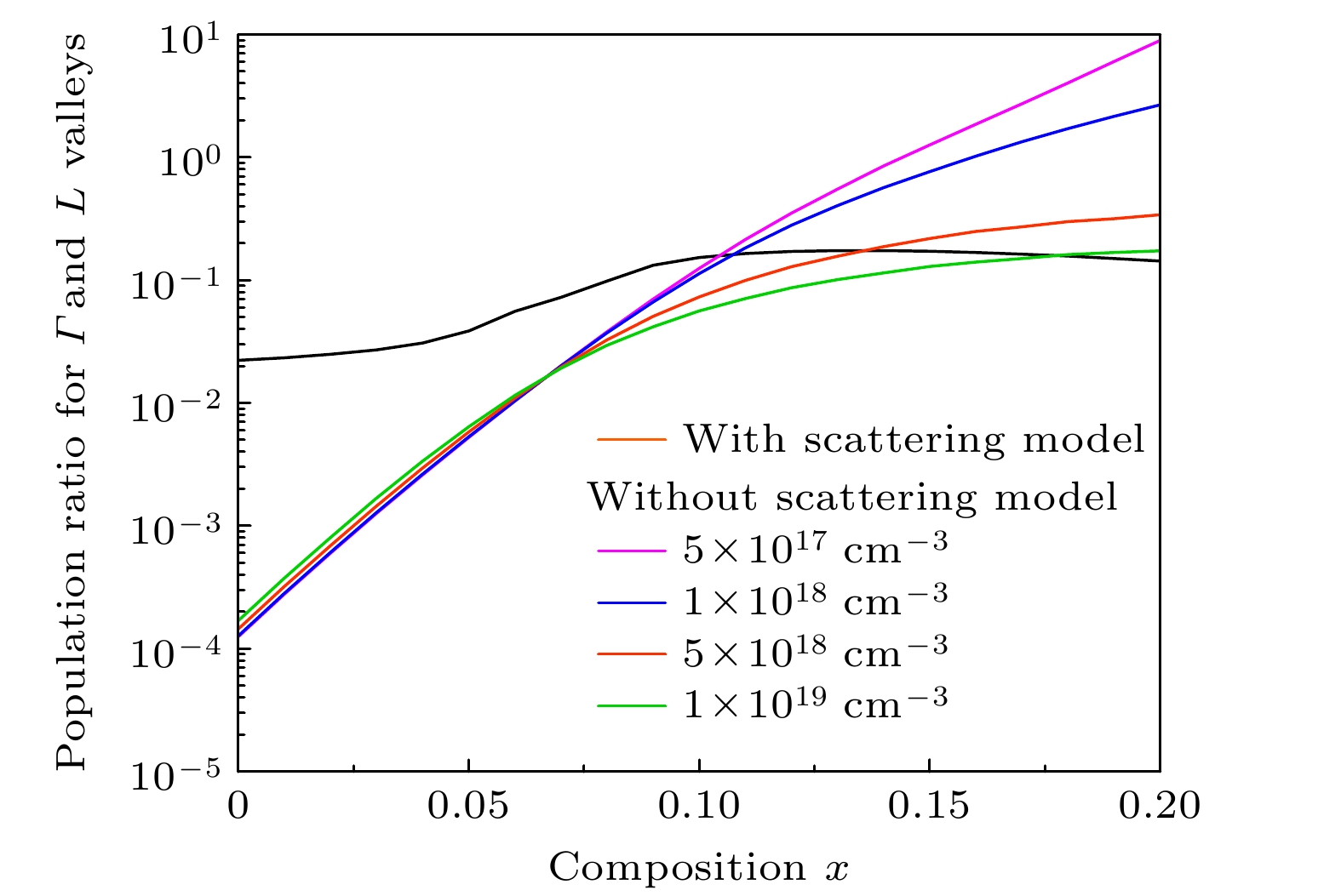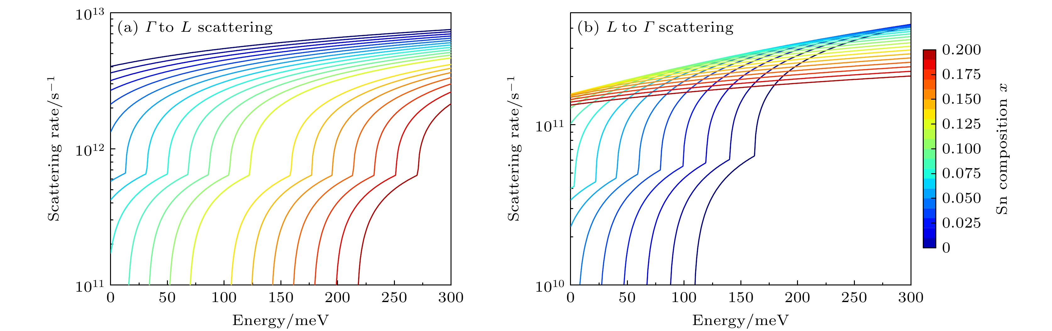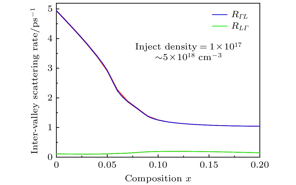 Ge1–x Snx alloys have aroused great interest in silicon photonics because of their compatiblity with complementary metal-oxide-semiconductor (CMOS) technology. As a result, they are considered potential candidate materials. Owing to the significant differences in effective mass within the valleys, the unique dual-valley structure of Γ valley and L valley in energy can improve the optoelectronic properties of Ge1–x Snx alloys. Therefore, inter-valley scattering mechanisms between the Γ and L valley in Ge1–x Snx alloys are crucial for understanding the electronic transports and optical properties of Ge1–x Snx materials. This work focuses on the theoretical analysis of inter-valley scattering mechanisms between Γ and L valley, and hence on the electron transmission dynamics in Ge1–x Snx alloys based on the phenomenological theory model. Firstly, the 30th-order k ·p perturbation theory is introduced to reproduce the band structure of Ge1–x Snx. The results show that the effective mass of L valley is always about an order of magnitude higher than that of Γ valley, which will significantly influence the electron distributions between Γ and L valley. Secondly, the scattering mechanism is modeled in Ge1–x Snx alloys. The results indicate that scattering rate RΓL is about an order of magnitude higher than RLΓ, while RΓL decreases with the increase of Sn composition and tends to saturate when Sn component is greater than 0.1. And RLΓ is almost independent of the Sn component. Thirdly, kinetic processes of carriers between Γ and L valley are proposed to analyze the electron transmission dynamics in Ge1–x Snx alloys. Numerical results indicate that the electron population ratio for Γ-valley increases and then tends to saturation with the increase of Sn composition, and is independent of the injected electron concentration. The model without the scattering mechanism indicates that the electron population ratio for Γ-valley in indirect-Ge1–x Snx alloys is independent of the injected electron concentration, while the electron population ratio for Γ-valley in direct-Ge1–x Snx alloys is dependent on the injected electron concentration, and the lower the electron concentration, the greater the electron population ratio for Γ-valley is. The results open a new way of understanding the mechanisms of electron mobility, electrical transport, and photoelectric conversion in Ge1–x Snx alloys, and can provide theoretical value for designing Ge1–x Snx alloys in the fields of microelectronics and optoelectronics.
