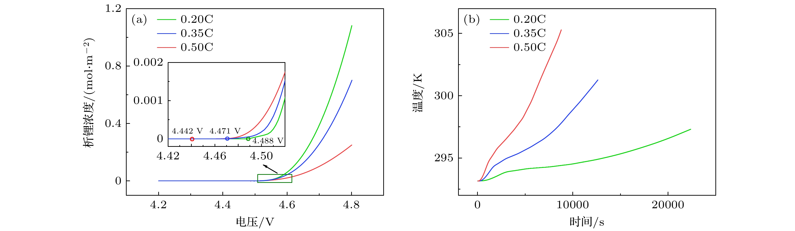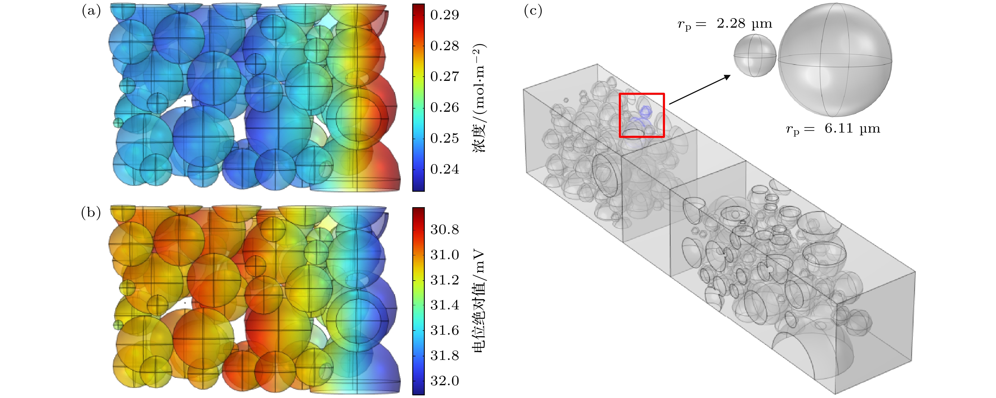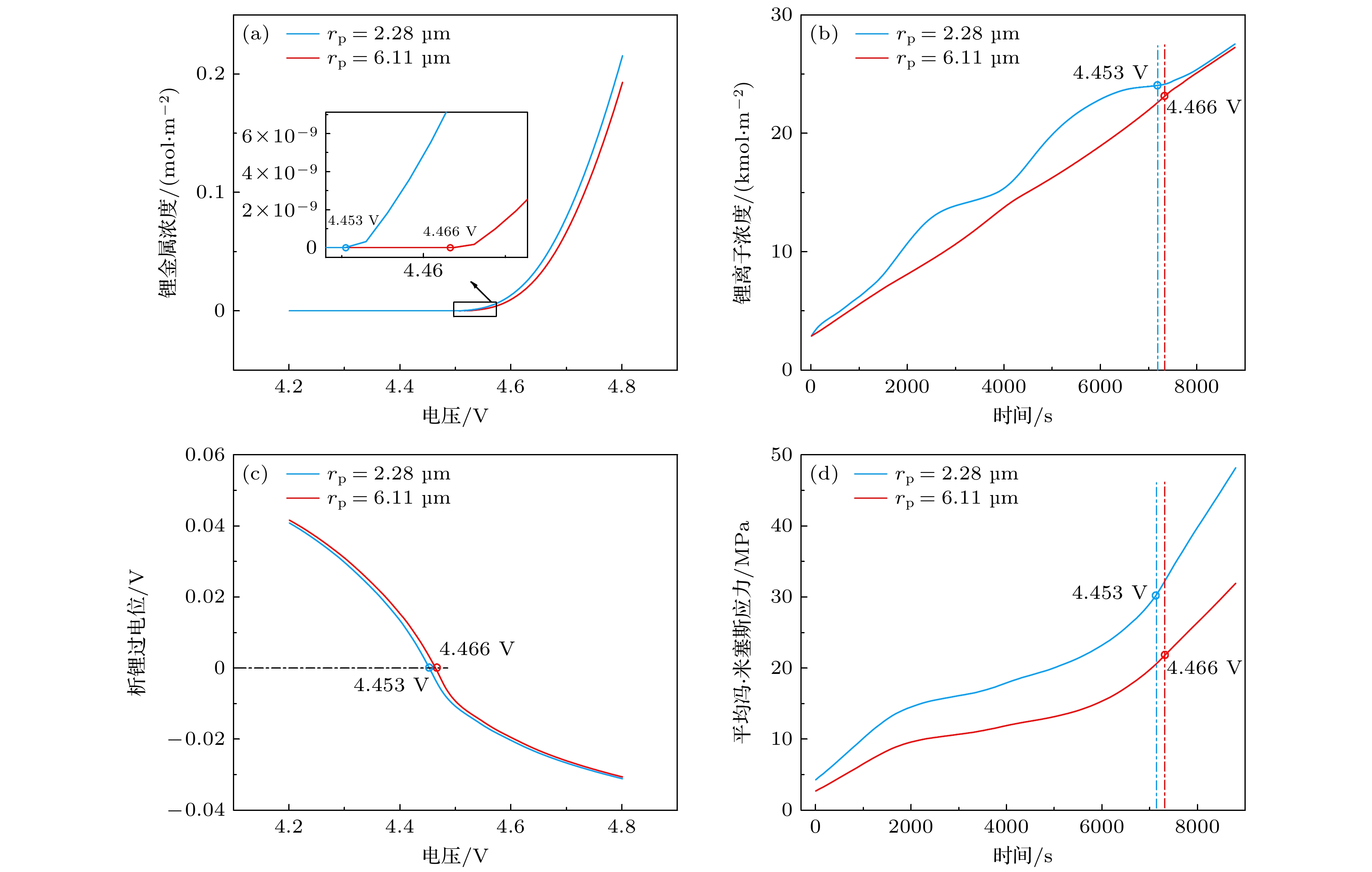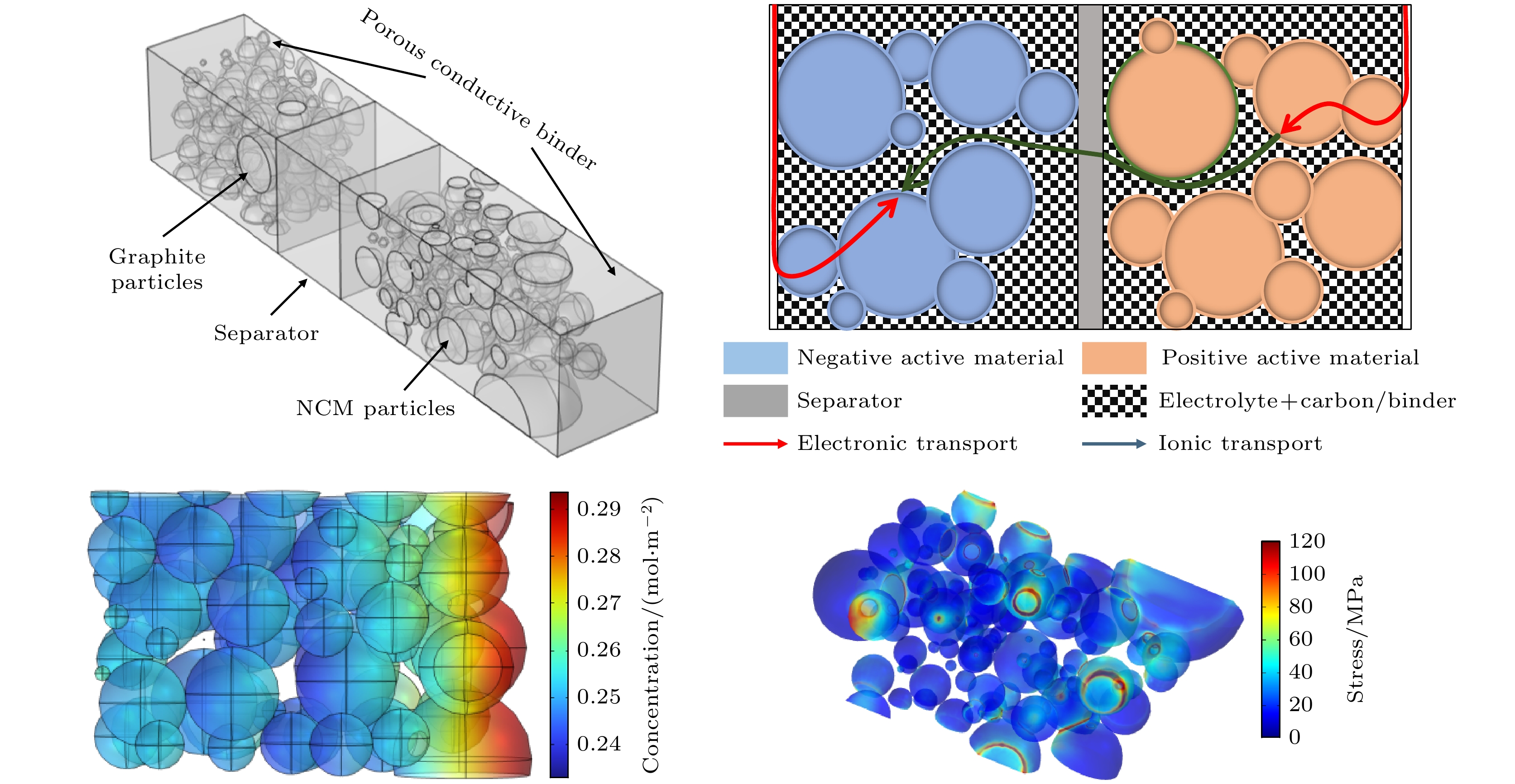 During overcharging of lithium-ion batteries, lithium plating can occur on the anode surface when the maximum lithium intercalation concentration is exceeded, while the cathode is in a lithium-poor state, which can result in shortened battery lifespan and safety. In this work, the geometric structure of the positive electrode particles is designed based on the tomography data, while the negative electrode particles are represented by spheres with different sizes. The homogenization method is used, with the carbon filler, binder and electrolyte regarded as a single porous conductive adhesive domain. Based on the main mechanism of lithium-ion battery overcharge, a coupled three-dimensional electrochemical-mechanical-thermal overcharge model on a particle scale is developed for NCM cathode and graphite anode. The coupled mathematical model consists of four parts, namely the electrochemical model, the lithium plating model, the thermal model and the stress-strain model. In terms of lithium precipitation, the particle radius parameter and charging rates are investigated. The results show that the lithium plating concentration of the particles near the separator is higher, following the “principle of proximity” , namely the sequence of lithium deintercalation is related to the migration path. The surface of anode particles with small particle size is more prone to lithium precipitation due to the high maximum lithium ion concentration on the surface of the particles, the low surface lithium precipitation overpotential, and the high average Von Mises stress. At high charging rate, fast charge transfer rate and ion diffusion rate result in a low voltage at the anode, triggering off lithium precipitation. At a low rate, polarization and low temperature can lead to the precipitation of more lithium on the surface of the anode particles. In terms of stress, the spatial distribution between particles and thermal effects are investigated. The ratio of the distance from the contact surface to the center of the particle to the particle radius is calculated and defined as the contact depth (\begin{document}$ J_{\rm r} $\end{document} ), in order to better describe the law of particle contact stress. It is shown that the contact depth between particles is inversely proportional to the stress on the contact area. When the heat generation effect is considered, the temperature of the battery rises faster with the increase of the charging rate. The electrochemical parameters related to temperature and the lithium concentration diffusion gradient increase significantly, and the influence of temperature on the particle stress is also more significant. The relevant results can provide theoretical basis and guidance for designing battery and optimizing charge strategies.
