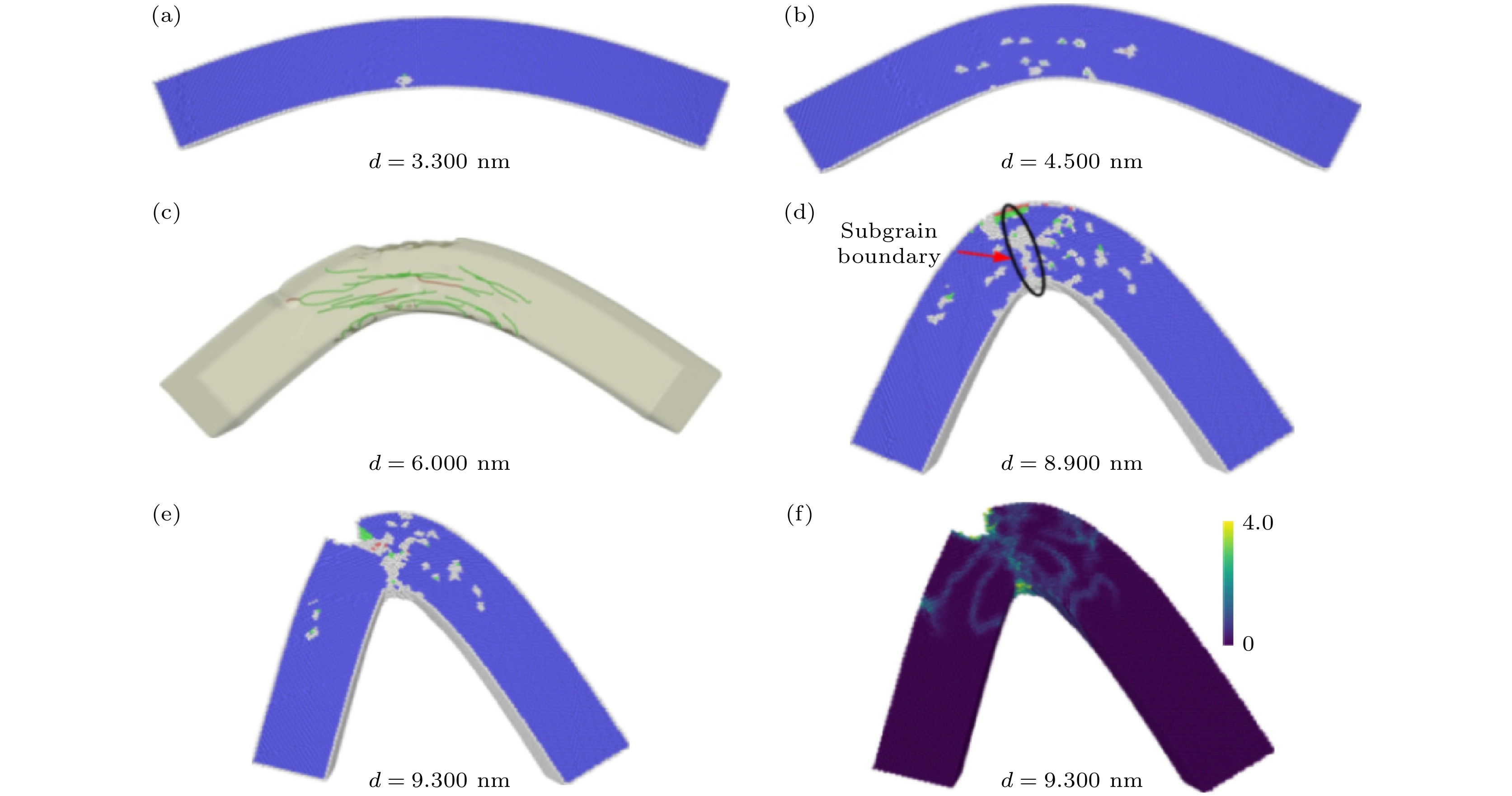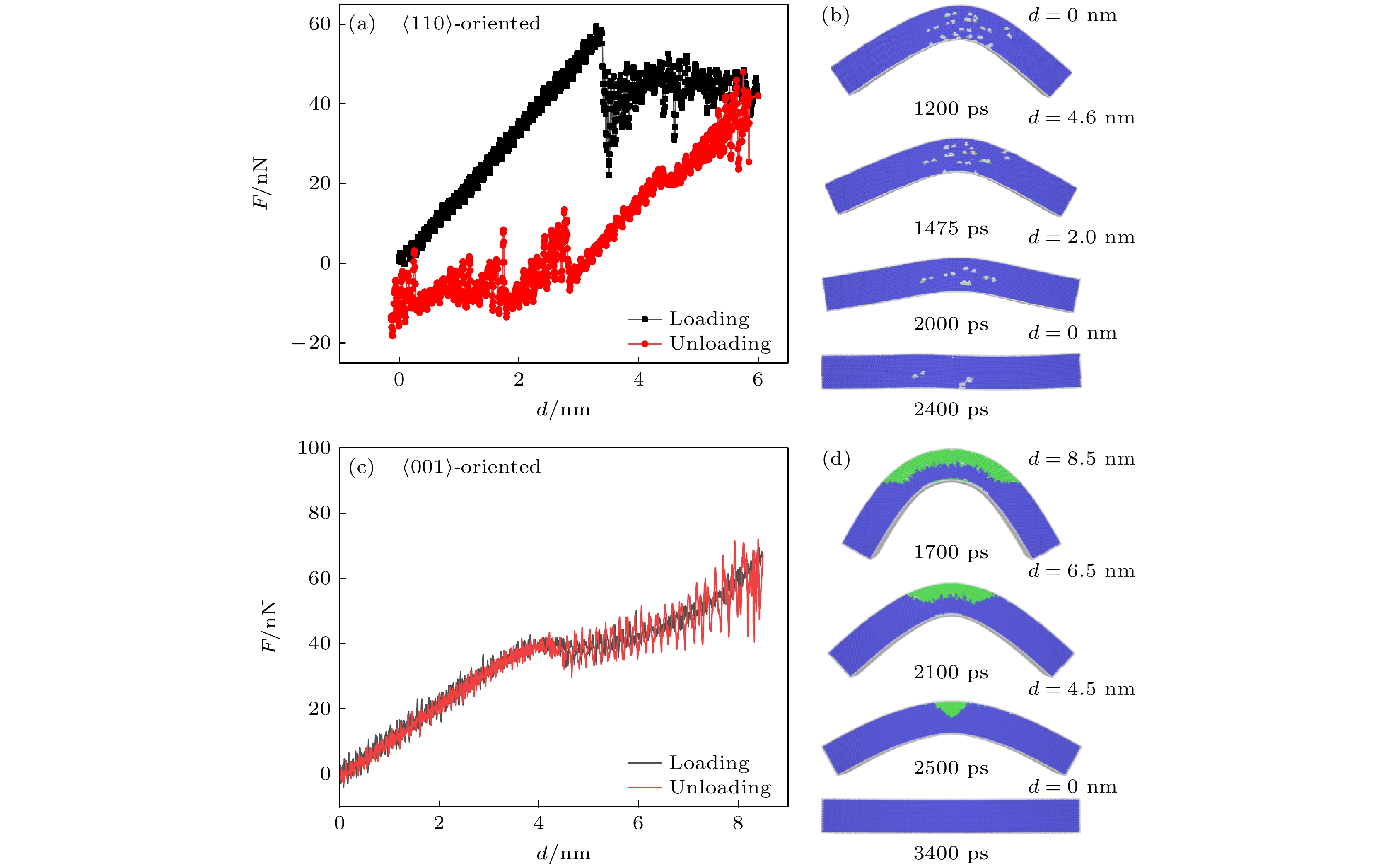 In nanosystems, the metallic nanowires are subjected to significant and cyclic bending deformation upon being integrated into stretchable and flexible nanoelectronic devices. The reliability and service life of these nanodevices depend fundamentally on the bending mechanical properties of the metallic nanowires that serve as the critical components. An in-depth understanding of the deformation behavior of the metallic nanowires under bending is not only essential but also imperative for designing and manufacturing high-performance nanodevices. To explore the mechanism of the bending plasticity of the metallic nanowire, the bending deformations of B2-FeAl alloy nanowires with various crystallographic orientations, sizes and cross-sectional shapes are investigated by using molecular dynamics simulation. The results show that the bending behavior of the B2-FeAl alloy nanowires is dependent on neither their size nor cross-sectional shape of the nanowire, but it is highly sensitive to its axial orientation. Specifically, both\begin{document}$\left\langle {111} \right\rangle $\end{document} - and \begin{document}$\left\langle {110} \right\rangle $\end{document} -oriented nanowires are generated through dislocation nucleation during bending, with the \begin{document}$\left\langle {111} \right\rangle $\end{document} -oriented nanowires failling shortly after yielding due to brittle fracture, while the \begin{document}$\left\langle {110} \right\rangle $\end{document} -oriented nanowires exhibit good ductility due to uniform plastic flow caused by continuous nucleation and stable motion of dislocations. Unlike the aforementioned two nanowires, the bending plasticity of the \begin{document}$\left\langle {001} \right\rangle $\end{document} -oriented nanowire is mediated by the stress-induced transition from B2 phase to L10 phase, which leads to excellent ductility and higher fracture strain. The orientation dependence of bending deformation can be understood by considering the Schmid factor. Moreover, the plastically bent nanowires with \begin{document}$\left\langle {110} \right\rangle $\end{document} and \begin{document}$\left\langle {001} \right\rangle $\end{document} orientation are able to recover to their original shape upon unloading, particularly, the plastic deformation in the \begin{document}$\left\langle {001} \right\rangle $\end{document} -oriented nanowire is recoverable completely via reverse transformation from L10 to B2 structures, exhibiting superelasticity. This work elucidates the deformation mechanism of the B2-FeAl alloy nanowires subjected to bending loads, which provides a crucial insight for designing and optimizing flexible and stretchable nanodevices based on metallic nanowires.