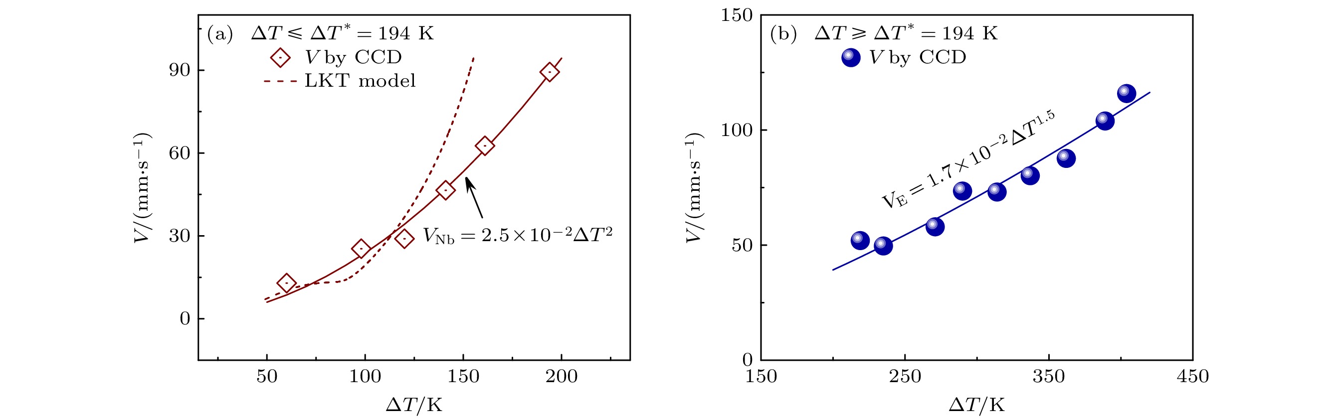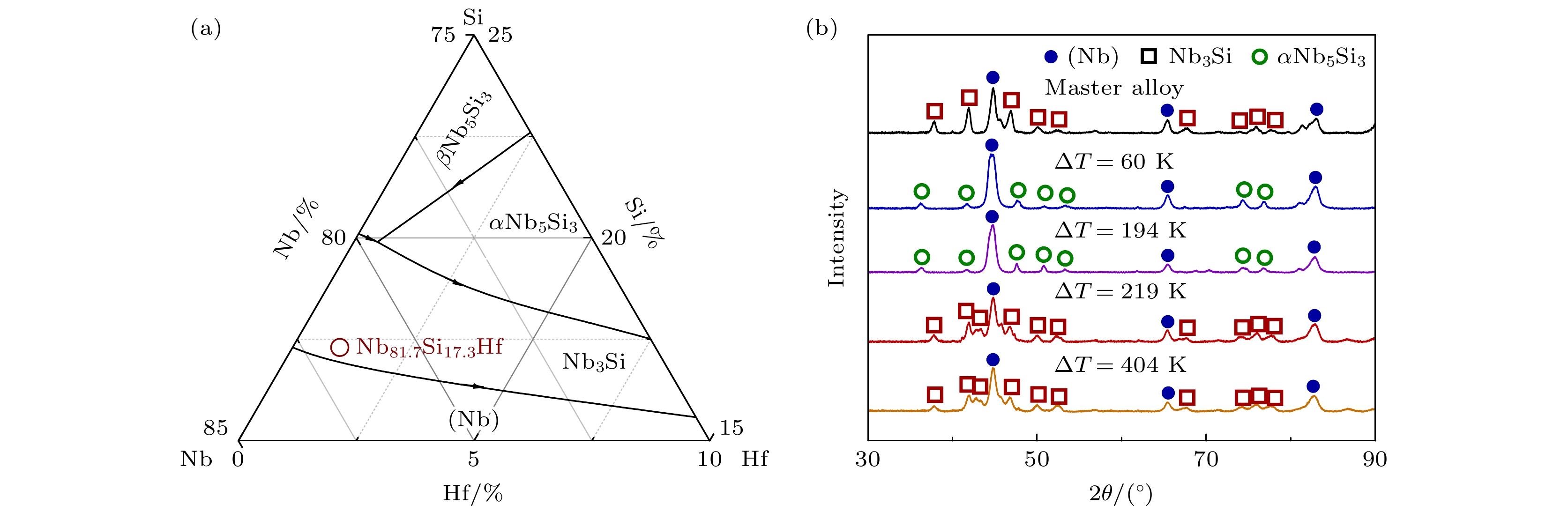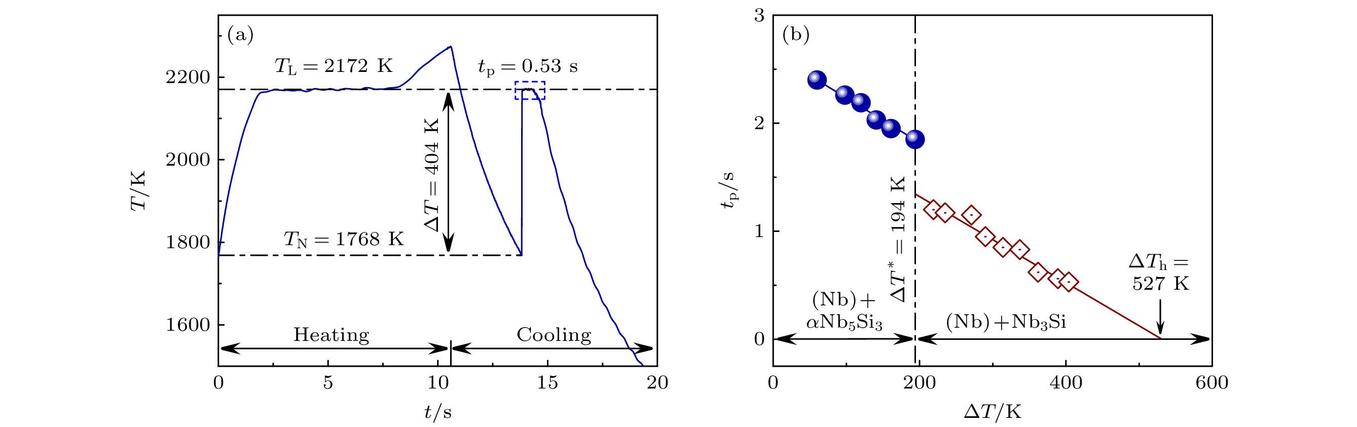 The phase selection mechanism and eutectic growth kinetics of Nb81.7Si17.3Hf alloy are investigated by electrostatic levitation technique. The maximum undercooling of this alloy reaches 404 K (0.19TL). By analyzing the cooling curves, its hypercooling limit is obtained to be 527 K (0.24TL). A critical undercooling of 194 K is determined for the transition of solidification path. Below this undercooling threshold, (Nb) phase firstly nucleates and grows into primary dendrites, resulting in the enrichment of Si and Hf in the residual melt, which is conducive to the formation of the (Nb)+αNb5Si3 eutectics. Therefore, (Nb)+αNb5Si3 lamellar eutectics form in interdendritic space. With the increase of undercooling, the growth velocity of primary (Nb) dendritic follows a power function, while the eutectic growth velocity increases slowly. The maximum values of (Nb) dendritic reaches 89.4 mm/s. A modified LKT/BCT model is used to calculate the growth velocity of (Nb) dendrites. The results are in good agreement with the experimental values, indicating that after the LKT model is modified slightly, it can be used to describe the rapid dendrite growth behavior of the (Nb) phase in the Nb81.7Si17.3Hf alloy melt. Meanwhile, the lamellar spacing of (Nb)+αNb5Si3 eutectics notably decreases to 360 nm at 194 K undercooling. Above the critical threshold, the primary (Nb) dendrites disappear, whereas (Nb) phase and Nb3Si phase nucleate independently in the undercooled liquid and grow into anomalous eutectics. The growth velocity of anomalous eutectic exhibits a power function relationship with the increase of undercooling, with a maximum value of 115.9 mm/s. The interphase spacing of (Nb)+Nb3Si anomalous eutectics is larger than that of (Nb)+αNb5Si3 lamellar eutectics. Owing to the formation of nanosized eutectics and the increase of volume fraction of (Nb) phase, the alloy fracture toughness at 194 K reaches 21.9 MPa·m1/2, which is 3.4 times as large as that under small undercooling condition.