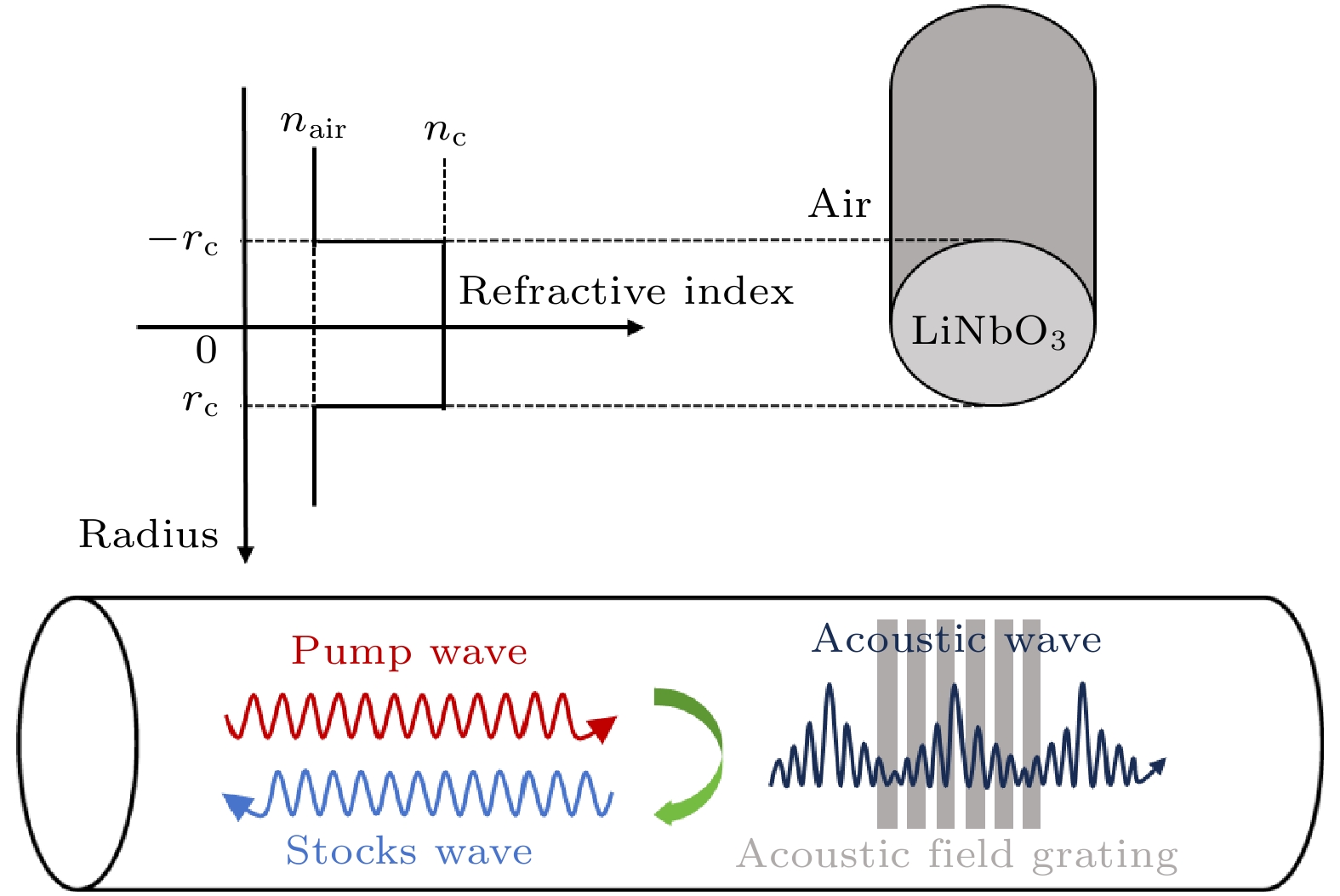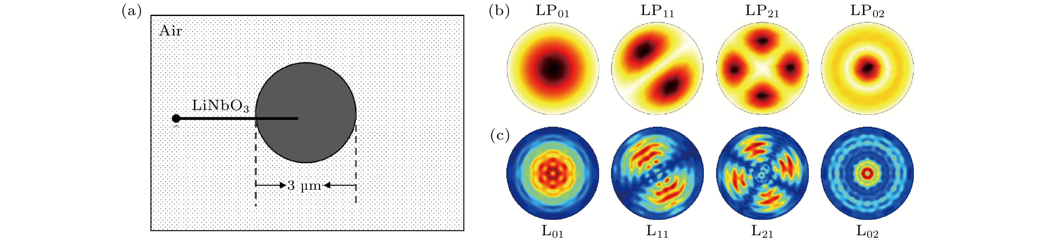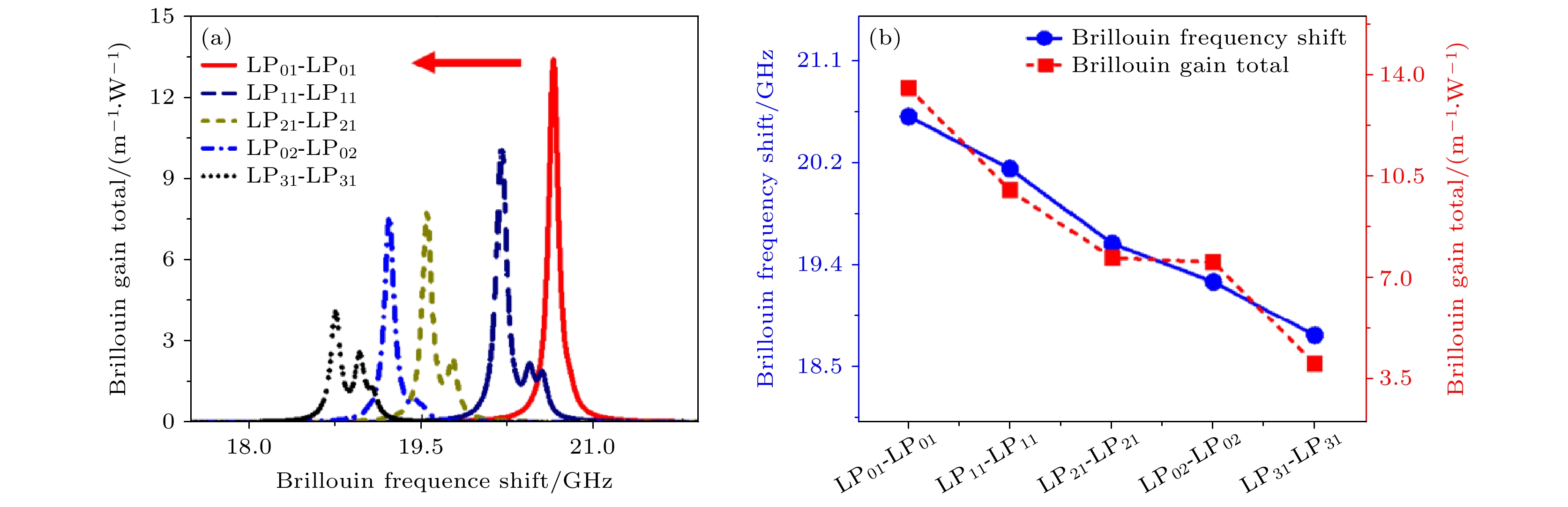 The Brillouin sensing technology in multimode optical fibers has received much attention due to its ability to simultaneously transmit multiple parameters, such as temperature and strain, and its higher information capacity and transmission efficiency. Additionally, lithium niobate possesses excellent electro-optical properties, so it shows potential application value in the sensing field and is expected to provide higher sensitivity and precision. Owing to the maturity of manufacturing processes, current research on fiber optic sensing focuses on silicon-based materials, however, there are fewer studies of fibers in which lithium niobate is used as the core material, thereby underestimating its application potential. In this work, the Brillouin scattering effects in lithium niobate optical fibers are investigated numerically. We simulate the intra-mode backward Brillouin scattering characteristics of the first five orders of LP modes in micrometer-sized lithium niobate fibers by means of finite-element simulation to explore its intrinsic law. First of all, the relationship between the Brillouin frequency shift and gain for the first five optical mode interactions is analyzed in detail. The results show that in the case of intra-mode backward stimulated Brillouin scattering, the peak of Brillouin frequency shift exhibits a significant redshift ranging from 20.63 GHz to 18.747 GHz. The Brillouin gain coefficient decreases from 13.503 m–1·W–1 to 4.0115 m–1·W–1 with the increase of mode order, in which mode LP01 having the strongest gain intra modal interaction means the best sensing sensitivity. In addition, compared with ordinary silica fiber, the lithium niobate fiber has Brillouin gain increased by about 5 orders of magnitude, which means that fibers with lithium niobate as the core can have higher sensing sensitivity. In addition, it is found that although there are significant differences in the Brillouin frequency shift values of each optical mode under intra modal interactions, the sound velocity of their corresponding acoustic modes is always consistent under the same acoustic mode. In data processing, it is noticed that this is because as the mode order changes, the corresponding effective refractive index decreases to ensure that each acoustic mode of the material always has the same sound velocity. These findings provide a foundation for further studying the lithium niobate fiber sensors with electro-optic properties.