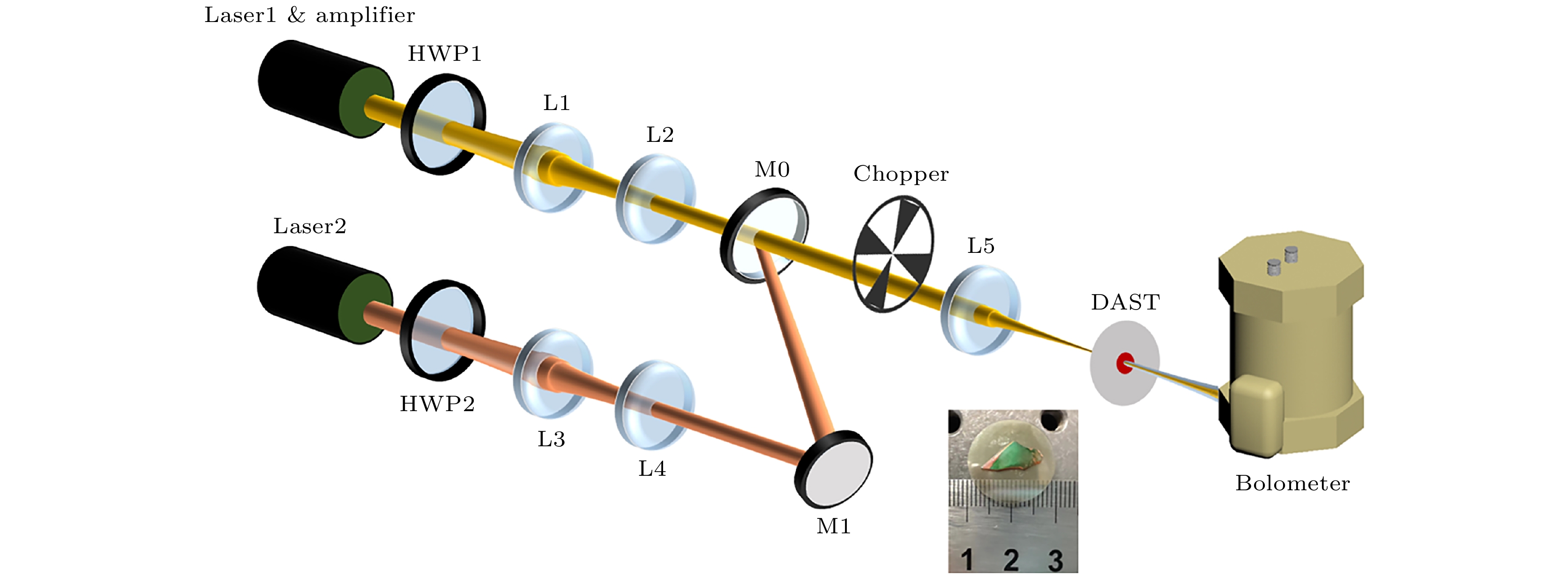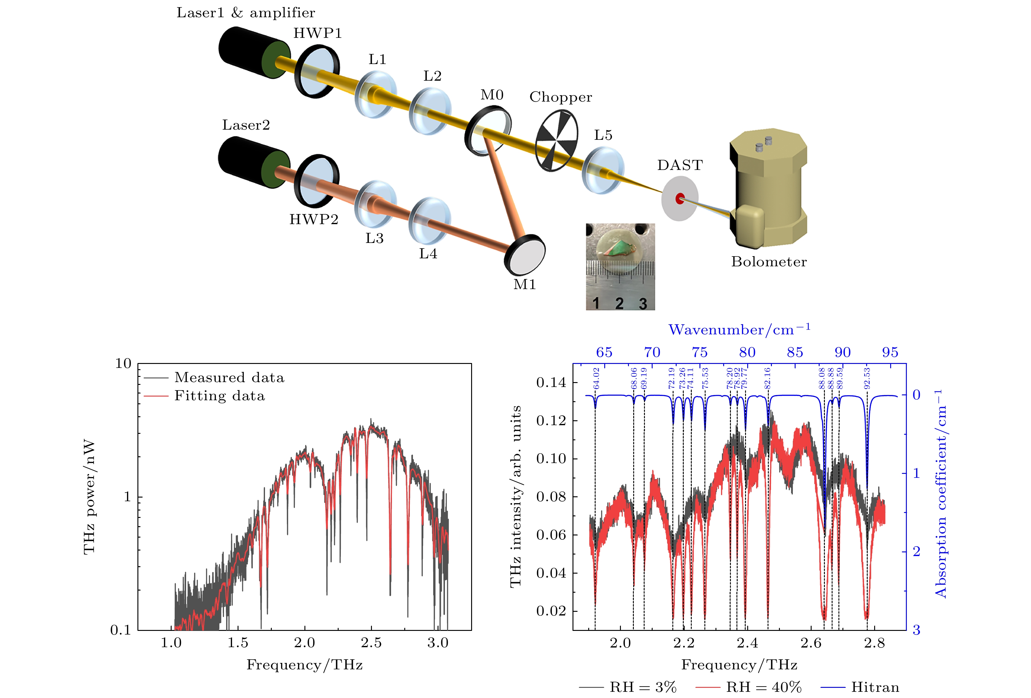 Terahertz (THz) waves have been widely investigated recently due to their ability to reflect the fingerprint characteristics of samples. As a promising method, THz technology has aroused great interest in various applications, especially biological imaging, environmental monitoring, non-destructive evaluation, spectroscopy and molecular analysis. In order to reveal the intramolecular vibration/rotation information of various compounds, the linewidths of their absorption lines are usually in a range of GHz or even MHz, and THz waves with wide tunability, narrow linewidth, high frequency accuracy, and high power stability are required. Currently, the linewidth with GHz level and low SNR at higher frequency still limit its further applications in reveal intramolecular information. In this work, the thermal distribution characteristics of DAST crystals based on diamond substrates under continuous laser pumping conditions are theoretically studied by COMSOL Multiphysics, and the effectiveness of diamond substrates in dissipating heat from DAST crystals is experimentally verified. Then, a narrow-linewidth and tunable organic-crystal continuous-wave terahertz source is demonstrated. Two narrow-linewidth continuous-wave (CW) fiber lasers are used as the pump sources for generating difference frequency. The terahertz wave is continuously tunable in a range of 1.1–3 THz. The maximum output power of 3.39 nW is obtained at 2.493 THz. The power fluctuation in 30 min is measured to be 2.19%. In addition, the generated THz wave has a high polarization extinction ratio of 9.44 dB. Using this CW-THz source for high-precision spectral detection of air with different humidity, the results correspond well with the gas absorption spectral lines in the Hitran database, proving that the CW-THz source has narrow linewidth, high frequency accuracy and stability. Therefore, it can promote the practical application of tunable CW-THz source, thus having good potential in THz high-precision spectroscopic detection and multispectral imaging.