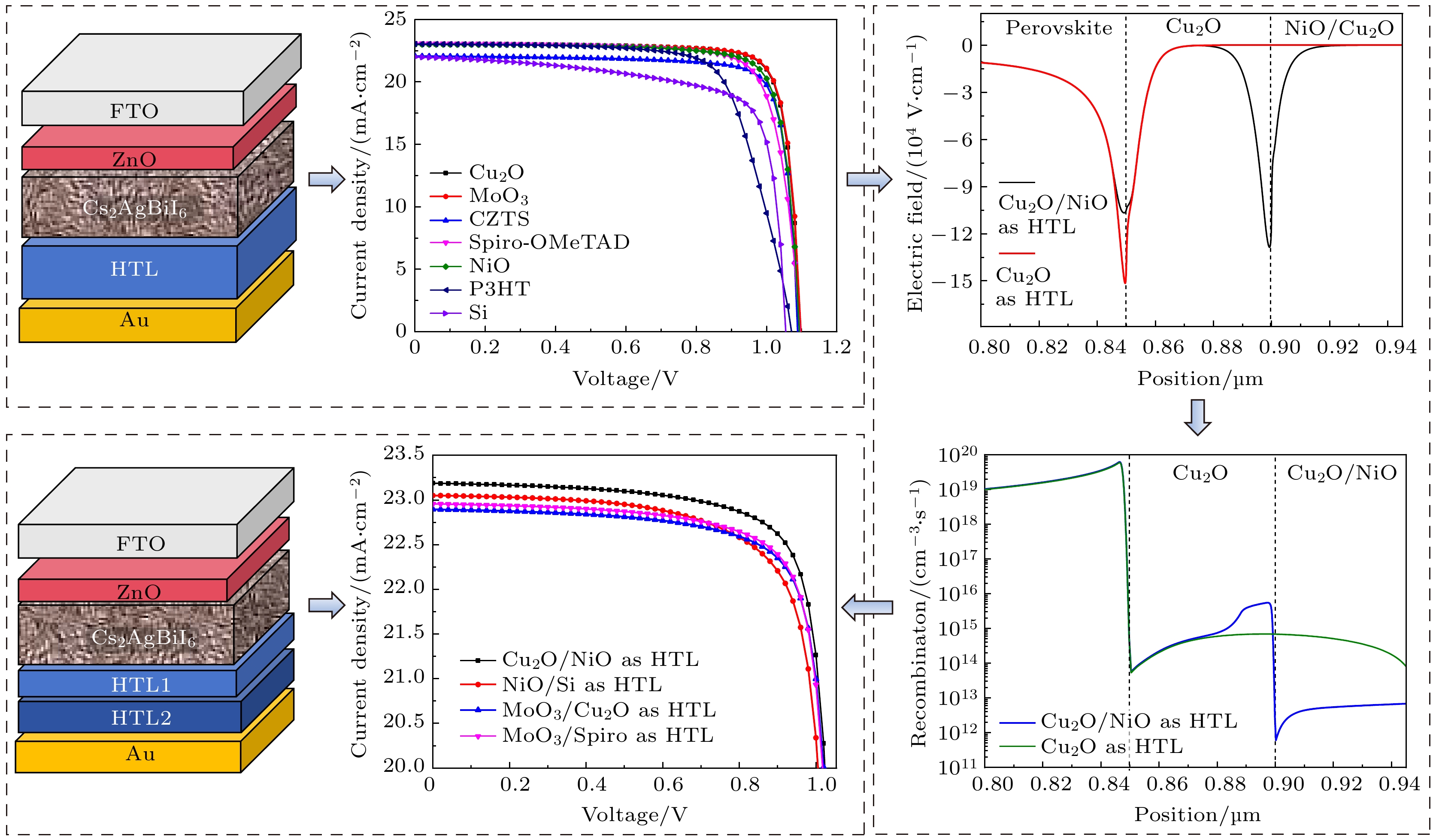 Double perovskite materials have received significant attention in the photovoltaic field due to their low cost, environmental friendliness, and lead-free composition, which make them ideal candidates for next-generation solar cell applications. In this work, the photovoltaic performance of solar cells using Cs2AgBiI6 as the light-absorbing layer is systematically investigated through simulations using Silvaco ATLAS software. Based on the previously reported single hole transport layer device architecture, namely ITO/ZnO/Cs2AgBiI6/HTL/Au, a new dual hole transport layer structure ITO/ZnO/Cs2AgBiI6/HTL1/HTL2/Au is proposed. Different dual hole transport layer combinations are explored, and their influence on the internal physical mechanism and the device performance are analyzed and optimized in detail. The simulation results show that the devices using Cu2O/NiO and NiO/Si respectively as dual hole transport layer significantly improve charge extraction and generate a negative electric field at the interface, thereby reducing recombination losse and accelerating the transport of hole carriers. These two configurations exhibit substantially higher efficiencies than those configurations with a single hole transport layer, confirming the advantages of the dual hole transport layer structure. Additionally, devices using Cu2O/CZTS and MoO3/CZTS as dual hole transport layer show better performance than the reference structure using Spiro-OMeTAD/CZTS, indicating the potential for further improvement by optimizing material selection and layer properties. Of the various dual hole transport layer combinations tested, the structure utilizing Cu2O/CZTS achieves the highest simulated power conversion efficiency (PCE) of 22.85%. By optimizing the thickness of each functional layer, the efficiency can be further increased to 25.62%, and the optimal layer thickness is determined to be 40 nm for ZnO, 850 nm for Cs2AgBiI6, 140 nm for Cu2O, and 150 nm for CZTS. Furthermore, the effects of environmental and material parameters, such as temperature and hole transport layer doping concentration, on device performance are investigated. This study lays a theoretical foundation for the design and enhancement of double perovskite solar cells. By demonstrating the potential that the dual hole transport layer structures can significantly improve device efficiency, their value in advancing environmentally friendly and lead-free photovoltaic technologies becomes very prominent. The insights gained from this research pave the way for developing high-performance double perovskite solar cells with optimized architectures and material properties.