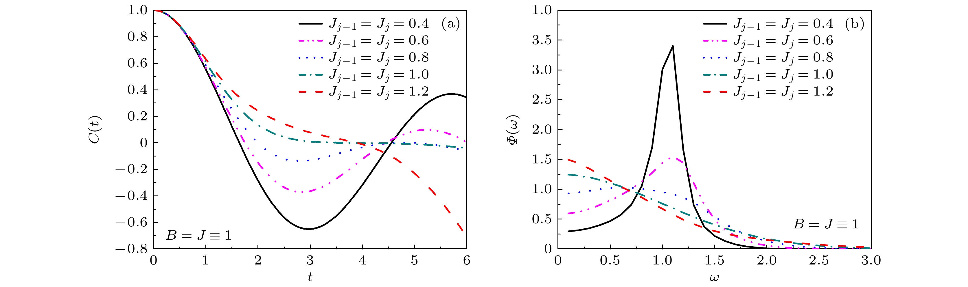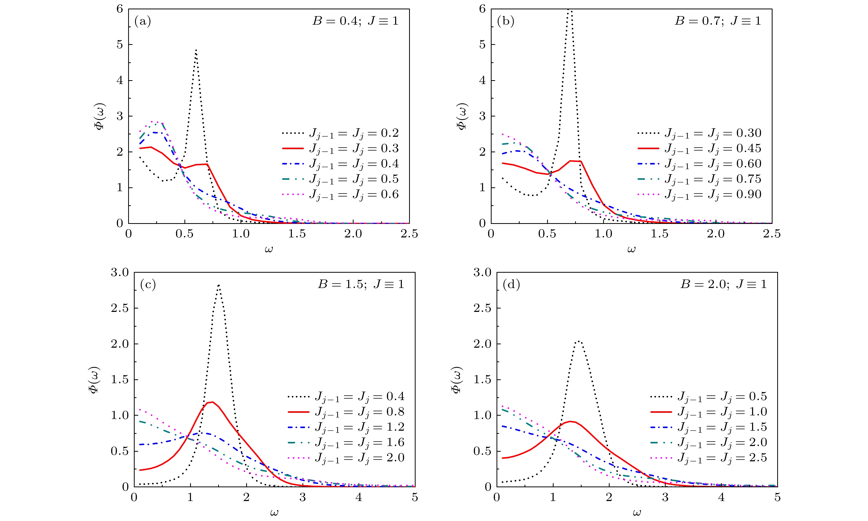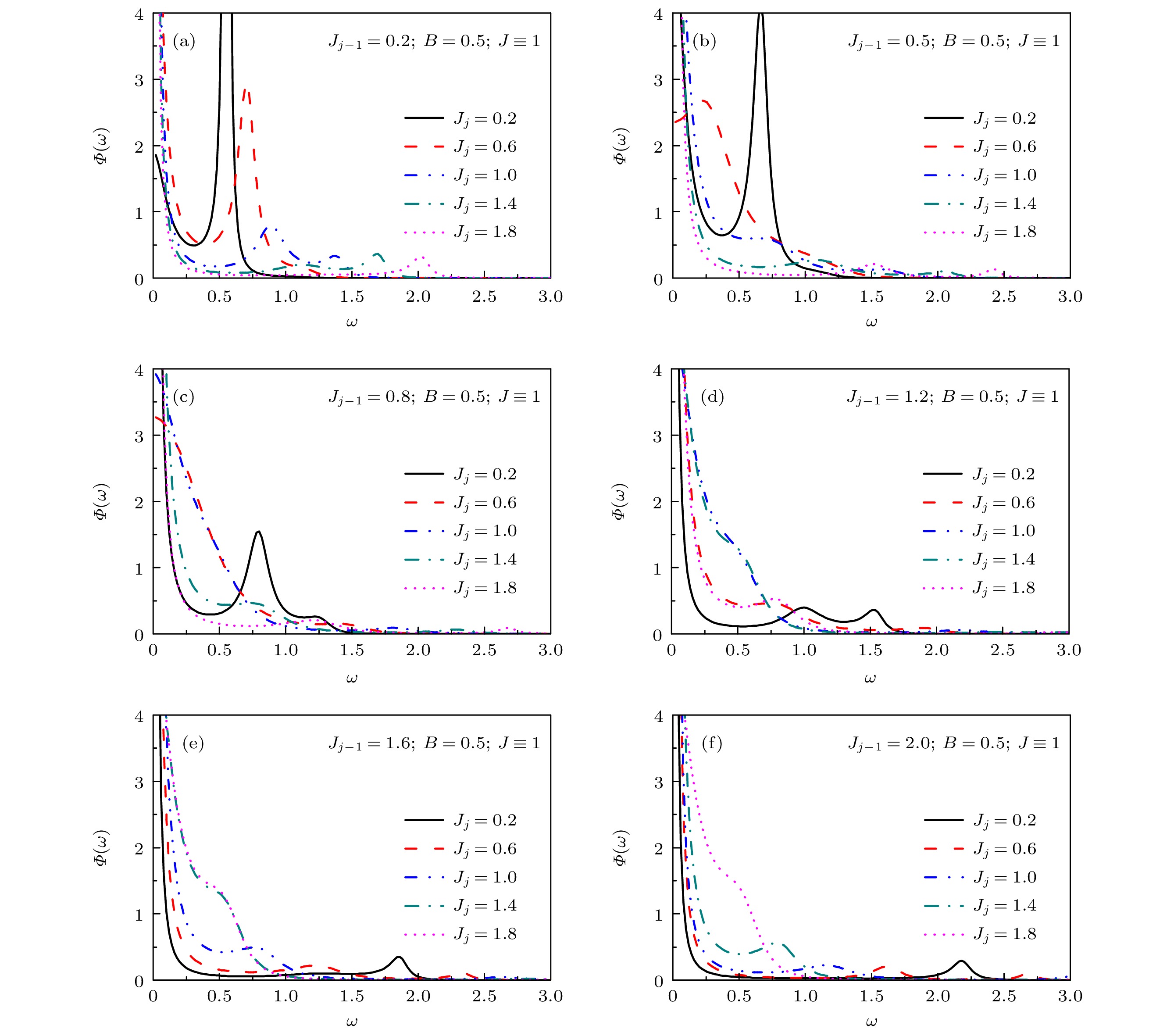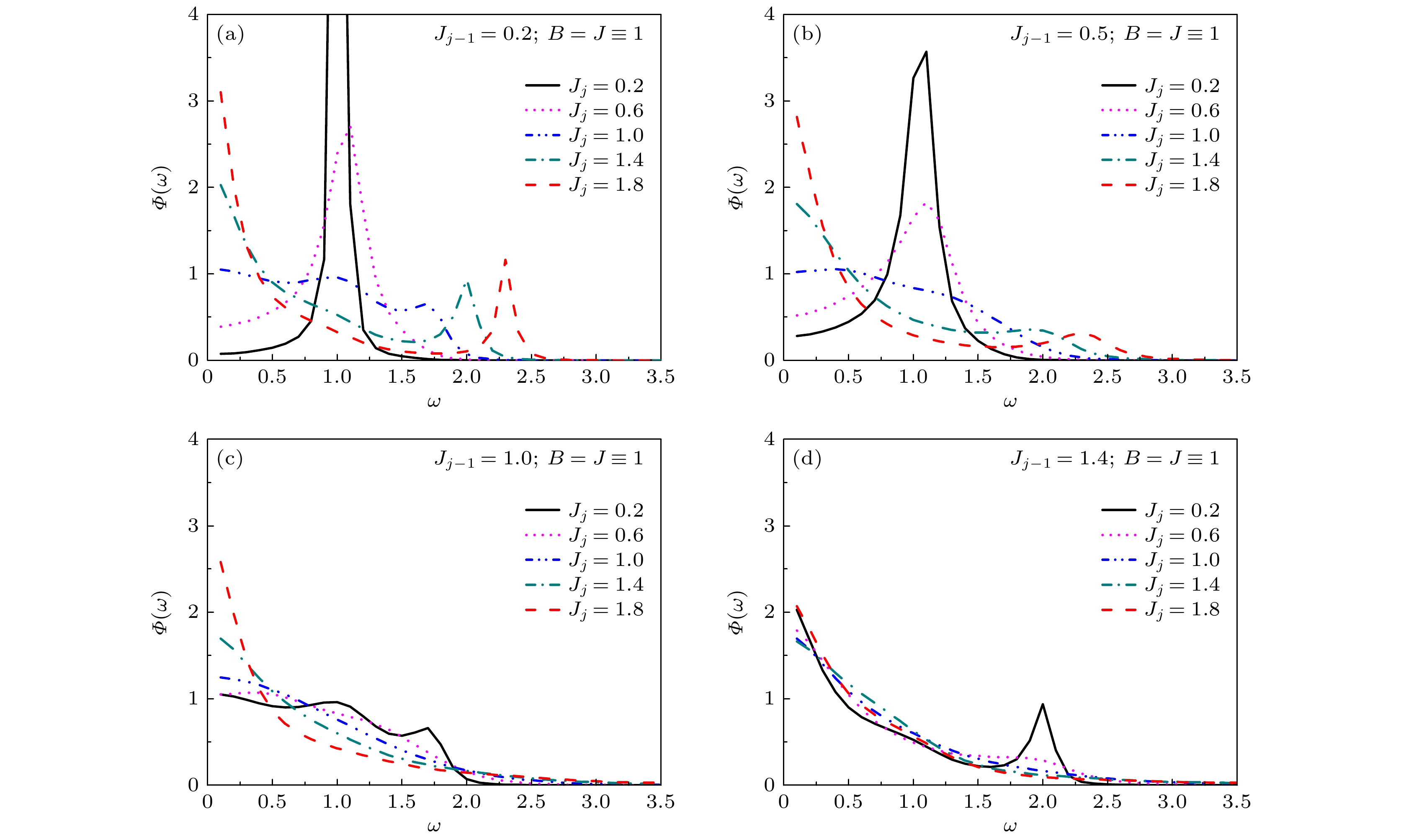 It is of considerable theoretical significance to study the effects of impurity on spin dynamics of quantum spin systems. In this paper, the dynamical properties of the one-dimensional quantum Ising model with symmetric and asymmetric link-impurity are investigated by the recursion method, respectively. The autocorrelation function \begin{document}$C\left( t \right) = \overline {\left\langle {\sigma _j^x\left( t \right)\sigma _j^x\left( 0 \right)} \right\rangle } $\end{document} and the associated spectral density \begin{document}$\varPhi \left( \omega \right) = \displaystyle\int_{ - \infty }^{ + \infty } {{\rm d}t{{\rm e}^{{\rm i}\omega t}}C\left( t \right)} $\end{document} are calculated. The Hamiltonian of the Ising model with link-impurity can be written as \begin{document}$\qquad\qquad\qquad\qquad\qquad H = - \displaystyle\frac{1}{2}({J_{j - 1}}\sigma _{j - 1}^x\sigma _j^x + {J_j}\sigma _j^x\sigma _{j + 1}^x) - \displaystyle\frac{1}{2}J\sum\limits_{i \ne j,j - 1}^N {\sigma _i^x\sigma _{i + 1}^x} - \frac{1}{2}B\sum\limits_i^N {\sigma _i^z} . $\end{document} where \begin{document}$J$\end{document} is the nearest-neighbor exchange coupling of the main spin chain, \begin{document}$ B $\end{document} denotes the external transverse magnetic field, \begin{document}$\sigma _i^\alpha \left( {\alpha = x,y,z} \right)$\end{document} are Pauli matrices at site \begin{document}$ i $\end{document} . The constant 1/2 is introduced for the convenience of theoretical deduction, and N is the number of spins. The so-called link-impurity \begin{document}$ {J_j} $\end{document} (\begin{document}$ {J_{j - 1}} $\end{document} ) is randomly introduced, which denotes the exchange coupling between the j th spin and the (j + 1)th spin (the (j – 1)th spin). The symmetric link-impurity and asymmetric link-impurity correspond to the case of \begin{document}$ {J_{j - 1}} = {J_j} $\end{document} and \begin{document}$ {J_{j - 1}} \ne {J_j} $\end{document} , respectively. The periodic boundary conditions are assumed in the theoretical calculation.After introducing the link-impurity, the original competition between \begin{document}$ B $\end{document} and \begin{document}$J$\end{document} in the pure Ising model is broken. The dynamic behavior of the system depends on synergistic effect of multiple factors, such as the mean spin coupling \begin{document}$ \bar J $\end{document} between \begin{document}$J$\end{document} and the link-impurity, the asymmetry degree between \begin{document}$ {J_{j - 1}} $\end{document} and \begin{document}$ {J_j} $\end{document} , and the strength of the external magnetic field. In calculation, the exchange couplings of the main spin chain are set to \begin{document}$J \equiv 1$\end{document} to fix the energy scale. We first consider the effects of symmetric link-impurity. The reference values can be set to \begin{document}$ {J_{j - 1}} = {J_j} \lt J $\end{document} (e.g. 0.4, 0.6 or 0.8) or \begin{document}$ {J_{j - 1}} = {J_j} \gt J $\end{document} (e.g. 1.2, 1.6, 2.0), which are called weak or strong impurity coupling. When the magnetic field \begin{document}$ B \geqslant J $\end{document} (e.g., \begin{document}$ B = 1 $\end{document} , 1.5 or 2.0), it is found that the dynamic behavior of the system exhibits a crossover from a collective-mode behavior to a central-peak behavior as the impurity strength \begin{document}$ {J_{j - 1}} = {J_j} $\end{document} increases. Interestingly, for \begin{document}$ B \lt J $\end{document} (e.g. \begin{document}$ B = 0.4 $\end{document} or 0.7), there are two crossovers that are a collective-mode-like behavior to a double-peak behavior, then to a central-peak behavior as \begin{document}$ {J_{j - 1}} = {J_j} $\end{document} increases. For the case of asymmetric link-impurity, the impurity configuration is more complex. Using the cooperation between \begin{document}$ {J_{j - 1}} $\end{document} and \begin{document}$ {J_j} $\end{document} , more freedoms of regulation can be provided and the dynamical properties are more abundant. For the case of \begin{document}$ B \leqslant J $\end{document} (e.g. \begin{document}$ B = 0.5 $\end{document} , 1.0), the system tends to exhibit a collective-mode behavior when the mean spin coupling \begin{document}$ \bar J $\end{document} is weak, and a central-peak behavior when \begin{document}$ \bar J $\end{document} are strong. However, when the asymmetry between \begin{document}$ {J_{j - 1}} $\end{document} and \begin{document}$ {J_j} $\end{document} is obvious, the system tends to exhibit a double- or multi-peak behavior. For the case of \begin{document}$ B \gt J $\end{document} (e.g. \begin{document}$ B = 1.5 $\end{document} , 2.0), when \begin{document}$ \bar J $\end{document} is weak or the asymmetry between \begin{document}$ {J_{j - 1}} $\end{document} and \begin{document}$ {J_j} $\end{document} is not obvious, the system tends to exhibit a collective-mode behavior. When \begin{document}$ \bar J $\end{document} is strong, it tends to show a central-peak behavior. However, when the asymmetry between \begin{document}$ {J_{j - 1}} $\end{document} and \begin{document}$ {J_j} $\end{document} is evident, the bispectral feature (two spectral peaks appear at \begin{document}$ {\omega _1} \ne 0 $\end{document} and \begin{document}$ {\omega _2} \ne 0 $\end{document} ) dominates the dynamics. Under the regulating effect of link-impurities, the crossover between different dynamic behaviors can be easily realized, and it is easier to stimulate new dynamic modes, such as the double-peak behavior, the collective-mode-like behavior or bispectral feature one. The results in this work indicate that using link-impurity to manipulate the dynamics of quantum spin systems may be a new try.