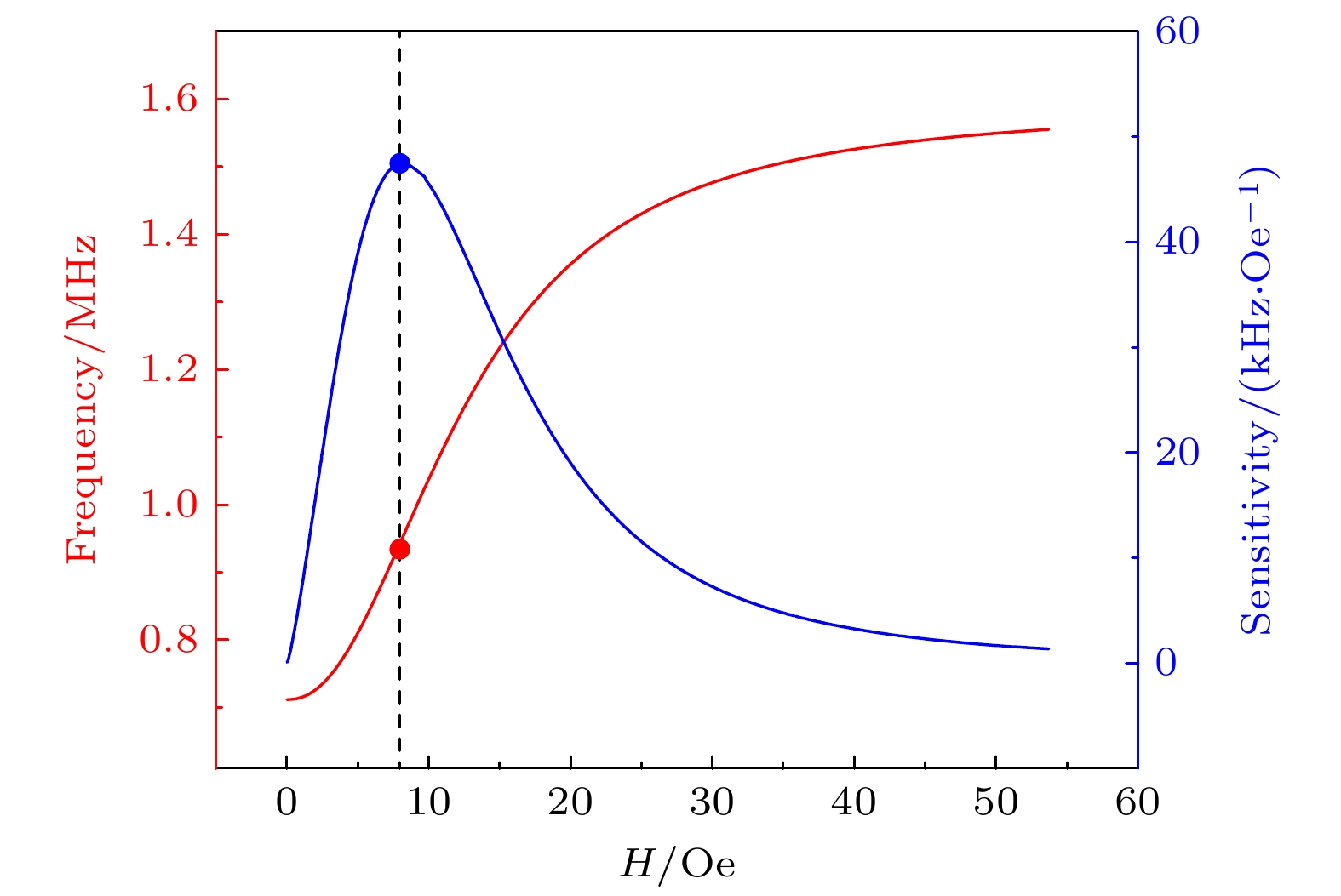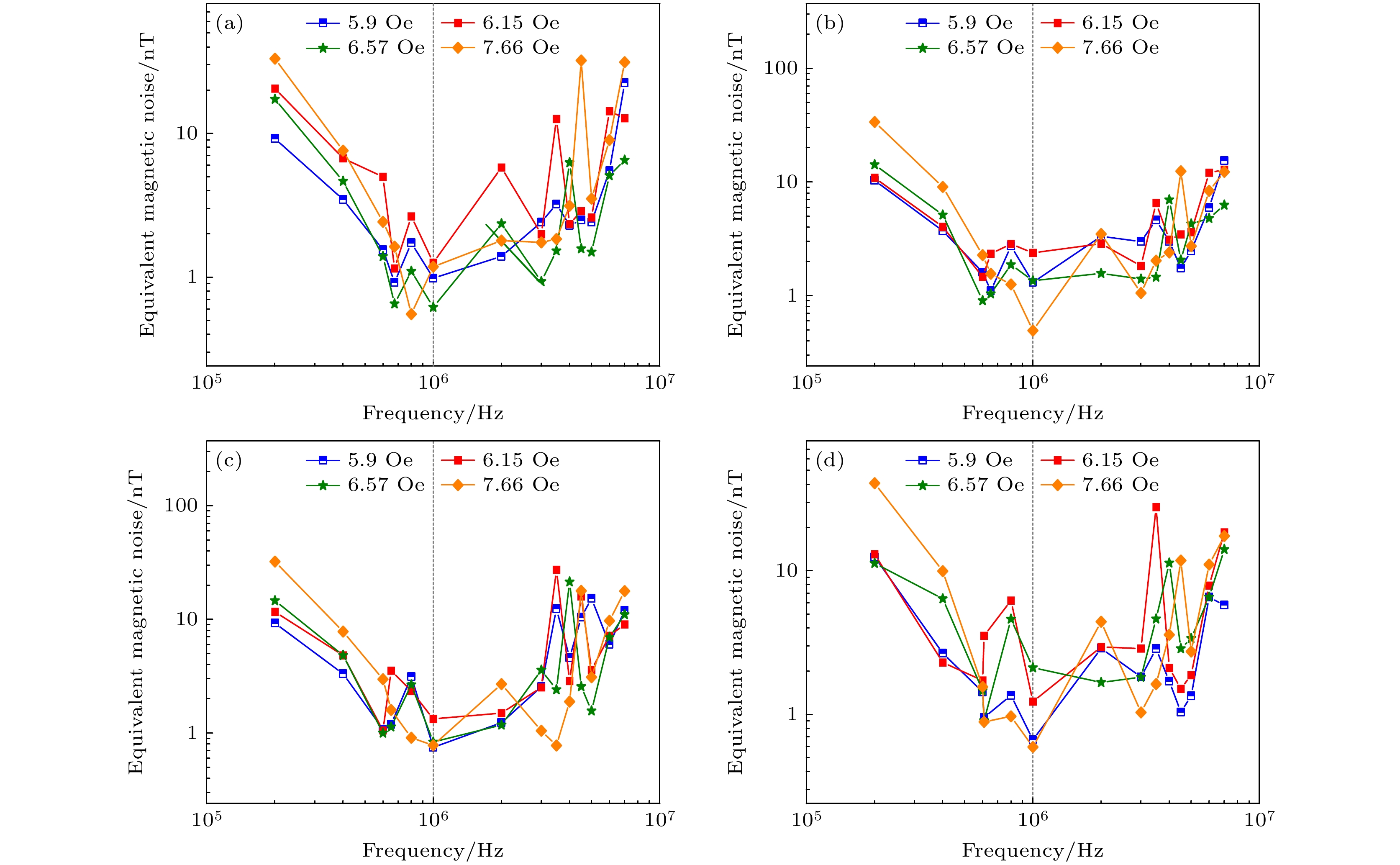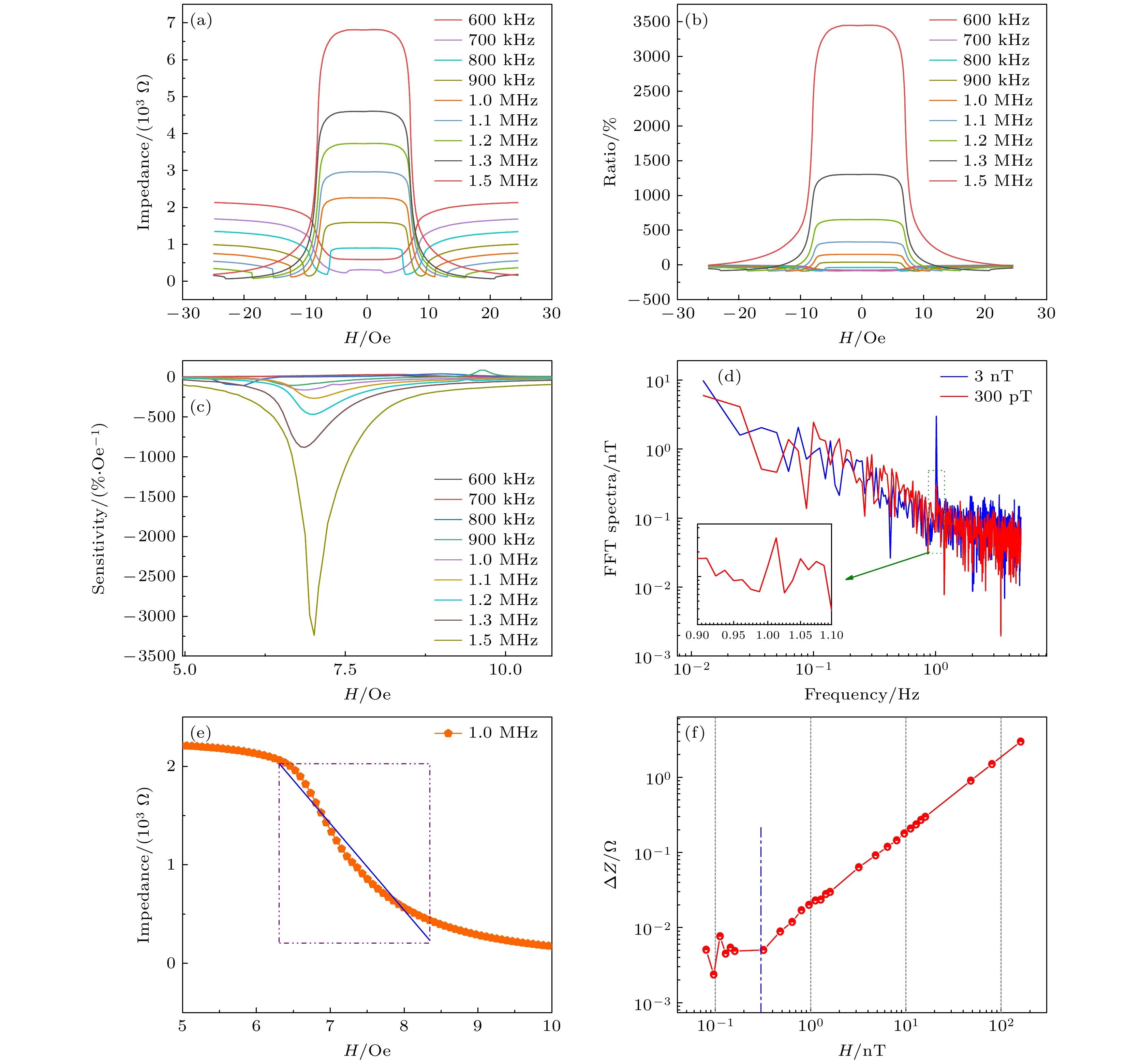 Magnetic sensors are widely used in the fields of navigation, transportation, robotics, automation, and medical equipment, and the performance requirements of sensors are getting higher and higher. In this work, a bimodal magnetic sensor with two operating modes, which has the advantages of large range and low noise, is proposed. The sensor consists of a 640 μH core-wound inductor in series with a 100 pF capacitor. When the external magnetic field changes, the magnetization state of the iron core in the inductor will change, the inductance value will change accordingly. The resonant frequency and impedance value of the sensor will also change with the magnetic field. In this work, the giant magnetic impedance characteristics of an RLC series circuit are analyzed, and the relationship between magnetic permeability, inductance value, and external magnetic field is established, and the series resonant frequency of the circuit is simulated to calculate the characteristics of the circuit with respect to the inductance variation. Then, two testing systems are set up to test the relationship between resonance frequency and magnetic field, as well as the noise characteristics of the sensor. In the impedance mode, the effects of capacitance, drive signal frequency, and static bias magnetic field on the sensor noise floor are first analyzed to determine the optimal parameters of the sensor. When the series capacitance of the sensor is 100 pF, the drive signal frequency will be 1 MHz and the static bias magnetic field will be 7.66 Oe. The sensor has the optimal performance with an equivalent noise floor of about\begin{document}$ {200}\;{\text{pT/}}\sqrt {{\text{Hz}}} @1 \;{\text{Hz}} $\end{document} , an impedance rate of change sensitivity of 160.6%/Oe, and a linear range of about 2 Oe. In the frequency mode, the sensor operates linearly up to 25 Oe. A logistic regression model is used to fit the resonant frequency to the magnetic field variation, and the fitted value reaches 0.9974. When the static bias magnetic field is about 7.66 Oe, the sensor sensitivity will be about 47 kHz/Oe. Moreover, compared with other common types of magnetic sensors on the market, this sensor has the commercial component cost of only ¥10, and excellent performance, and huge market potential.