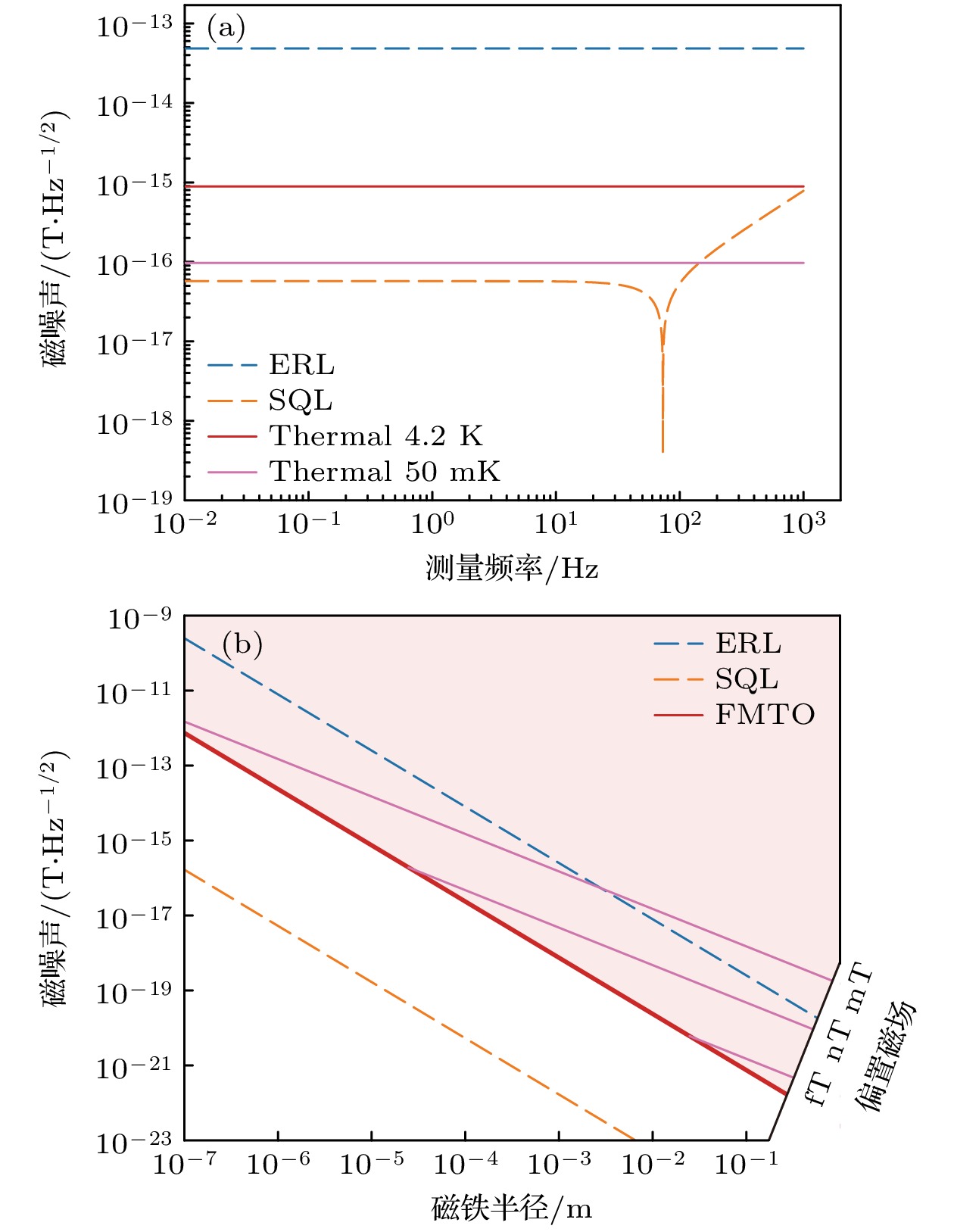 The ferromagnetic-mechanical system can be used as a magnetometer by monitoring its mechanical response to magnetic signals. This system can exceed the energy resolution limit (ERL) in terms of sensitivity, due to the ultra-high spin density and strong spin-lattice interactions inherent in ferromagnetic materials. A levitated ferromagnetic-mechanical system can further enhance its quality factor by eliminating clamp dissipation, thus achieving higher magnetic sensitivity. In this work, a magnetometer is proposed based on a magnetically levitated ferromagnetic torsional oscillator (FMTO), which transforms magnetic signals into torque to drive the oscillator. An optical method is then used to measure the torsional motion and extract the magnetic signal. The resonance frequency of this FMTO system can be controlled by modifying the bias field, thus providing enhanced flexibility and control. By analyzing the influence of fundamental noise, including thermal noise and quantum measurement noise (SQL), the relationship between the magnetic noise floor of the FMTO made of NdFeB and its radius is obtained. The SQL is much lower than both thermal noise and ERL, indicating that thermal noise is a dominant factor affecting the magnetic sensitivity of the FMTO. The magnetic sensitivity of the FMTO system at \begin{document}$4.2\ \rm{K}$\end{document} exceeds the ERL by three orders of magnitude, confirming the significant potential application of the FMTO system in high-precision magnetic measurements. Searching for exotic interactions is one of the most promising applications of ultra-high sensitivity magnetic sensors. It is typically achieved by measuring pseudo-magnetic fields. The accuracy of detecting exotic interactions depends on two main factors: the magnetometer’s sensitivity and the distance between the sensor and the source. The ERL presents challenges in meeting both of these factors simultaneously. Improving magnetic sensitivity typically increases the radius of the sensor, which in turn increases the distance between the sensor and the source, limiting the accuracy of detecting exotic interactions. Thus, ERL limits the accuracy of exotic interaction detection, while the FMTO, with its excellent sensitivity, is expected to significantly improve the detection of exotic interactions. If there is an exotic interaction, the BGO nuclei oscillating perpendicular to the paper will generate a pseudo-magnetic field along the vertical direction. This pseudo-magnetic field will induce torsional motion in the FMTO. The lower limit of the coupling constant for the new interaction is determined by measuring the torsional motion. Existing experiments have approached the ERL at Compton wavelengths on millimeter and micrometer scales. However, the FMTO system, with a bias field of 1 μT, exceeds the ERL by up to five orders of magnitude in sub-centimeter Compton wavelength and the existing experimental results by two to nine orders of magnitude. These results highlight the potential advantages of FMTO-based magnetometers in probing exotic interactions. All in all, in this work, a magnetometer configuration is proposed based on a levitated FMTO and its mechanical response, fundamental noise, magnetic performance, and applications in fundamental research are analyzed comprehensively.