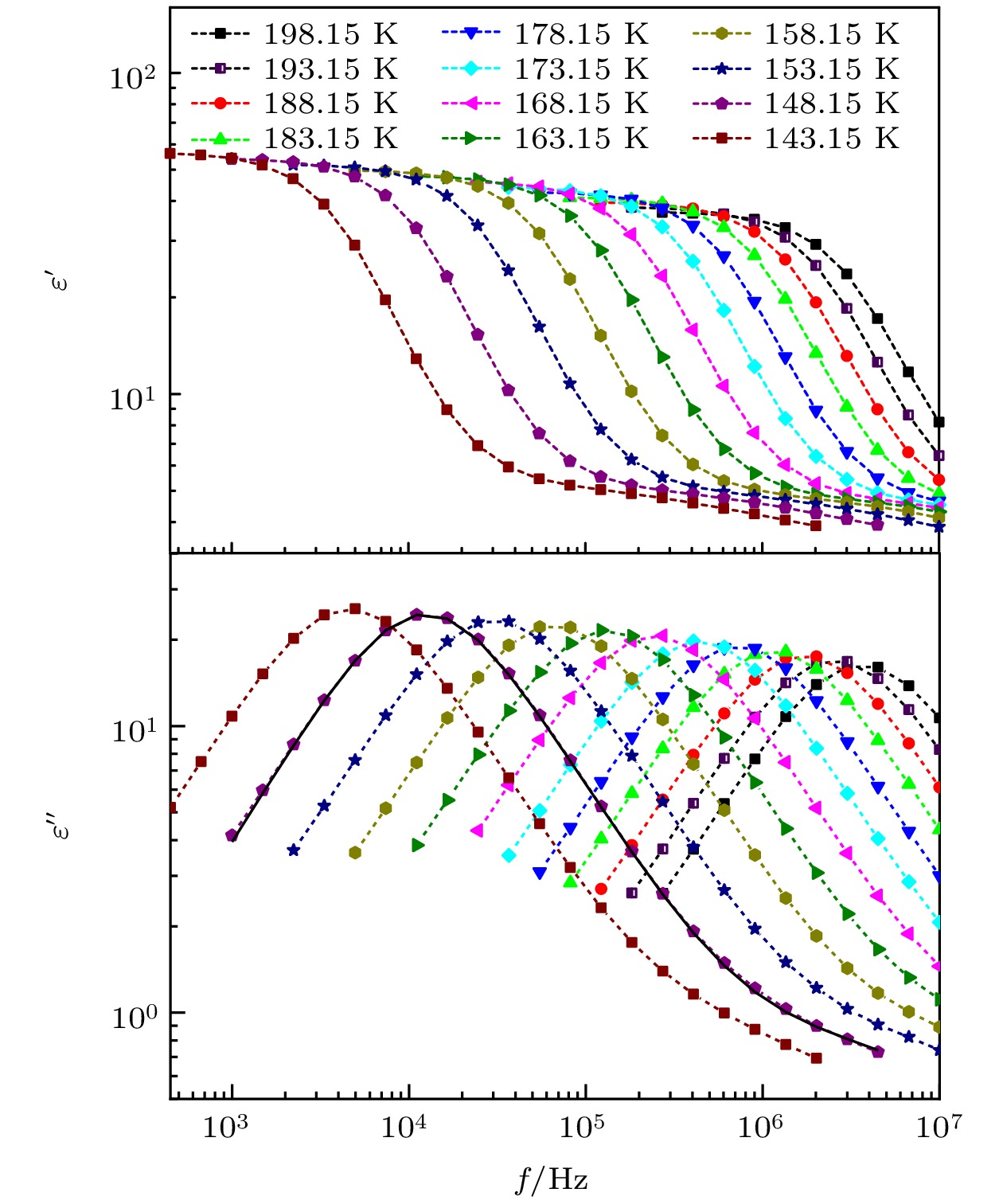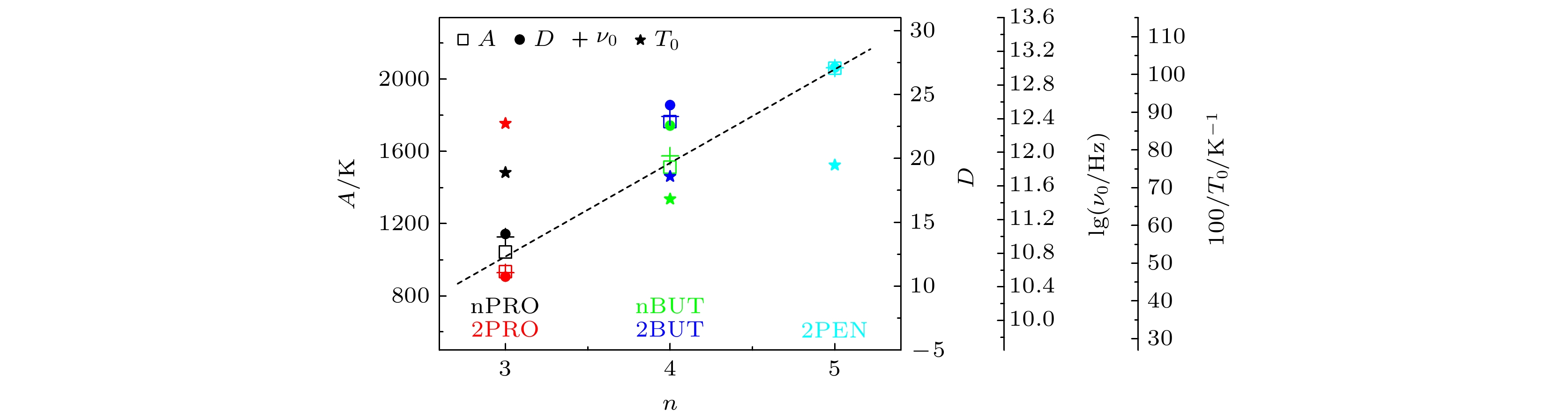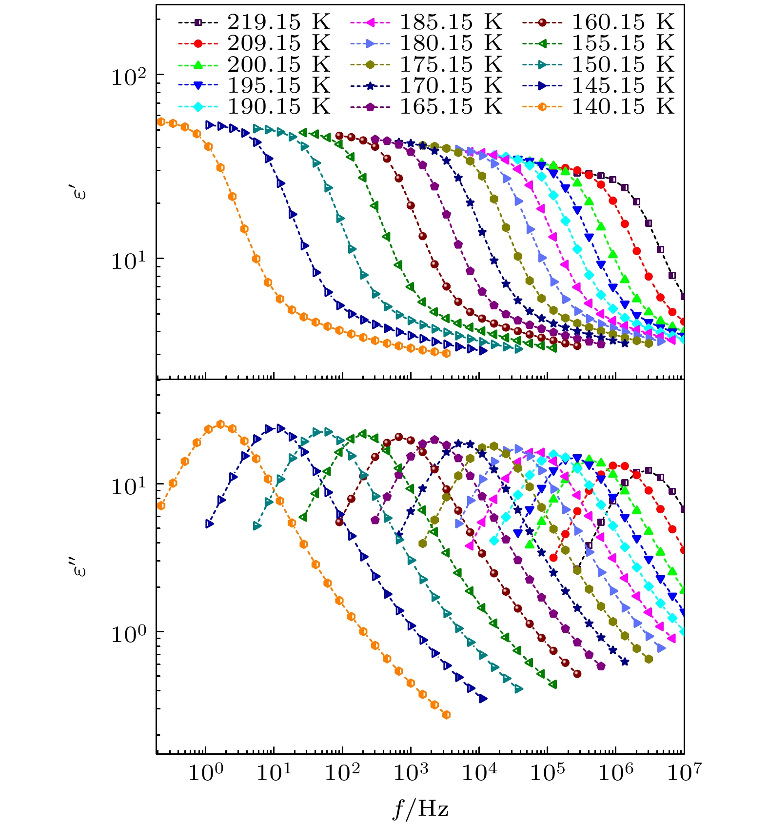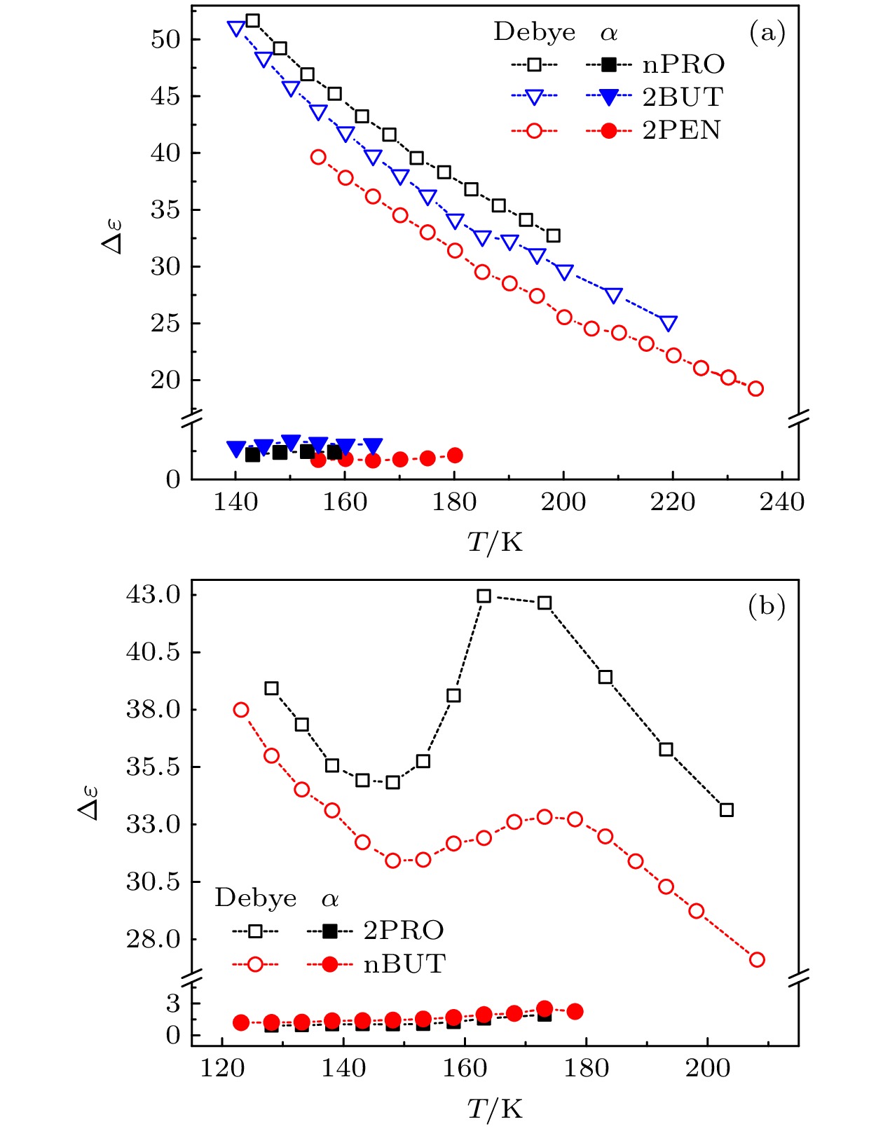 The five linear primary and secondary alcohols, i.e. n-propanol, isopropanol, n-butanol, 2-butanol and 2-pentanol, have similar chain lengths and slightly different structures. In this work, dielectric spectroscopy is used to investigate the properties of monohydroxy alcohols. The dielectric spectra of isopropanol and n-butanol show an abnormal change. i.e. the relaxation peaks with the highest strength gradually increases with temperature rising in a range of about 145–175 K. The analyses indicate that the abnormal variation originates from that of the Debye dielectric relaxation strength (DDRS) in the monohydroxy alcohols at above temperatures. According to the theoretical model of the DDRS for the monohydroxy alcohol, the abnormal variation is believed to be the result of the combined effects of decrease and increase of the DDRS caused by temperature, and the transformation of the structure of the hydrogen bonding molecular chain caused by the variation of the mobility of molecules. By comparing the relaxation times of the five monohydroxy alcohols, it is found that the conditions should be more stringent to cause the above-mentioned abnormal variation. In addition, the results also show that strength parameter of Debye processes, intrinsic vibration frequency of the relaxation units and their activation energy in the high-temperature limit in secondary alcohols also rise with the increase of the number of carbon atoms, similar to the scenario in the case of primary alcohols. These results can not only provide a new breakthrough point for the investigation of exotic properties in monohydroxy alcohols but also give a reference to explore the effect of molecular chain length on their dynamics.