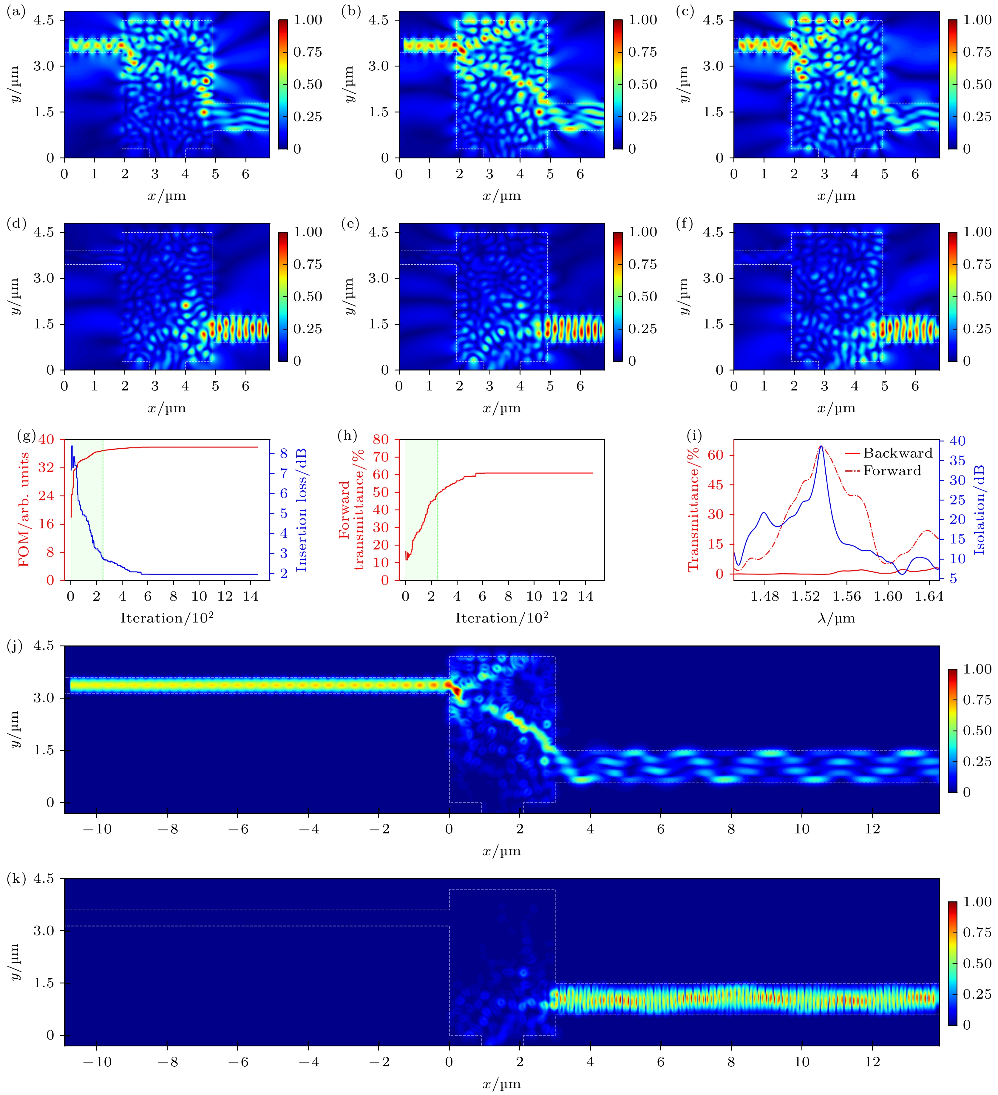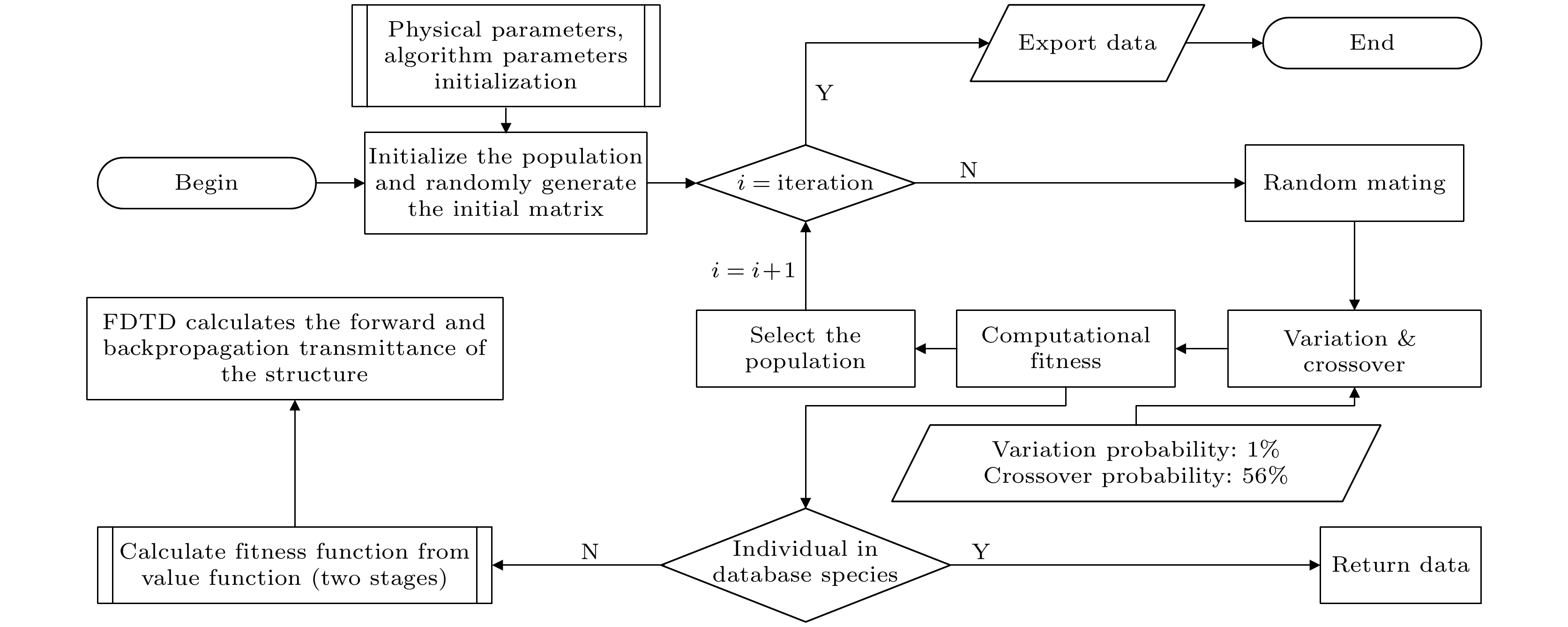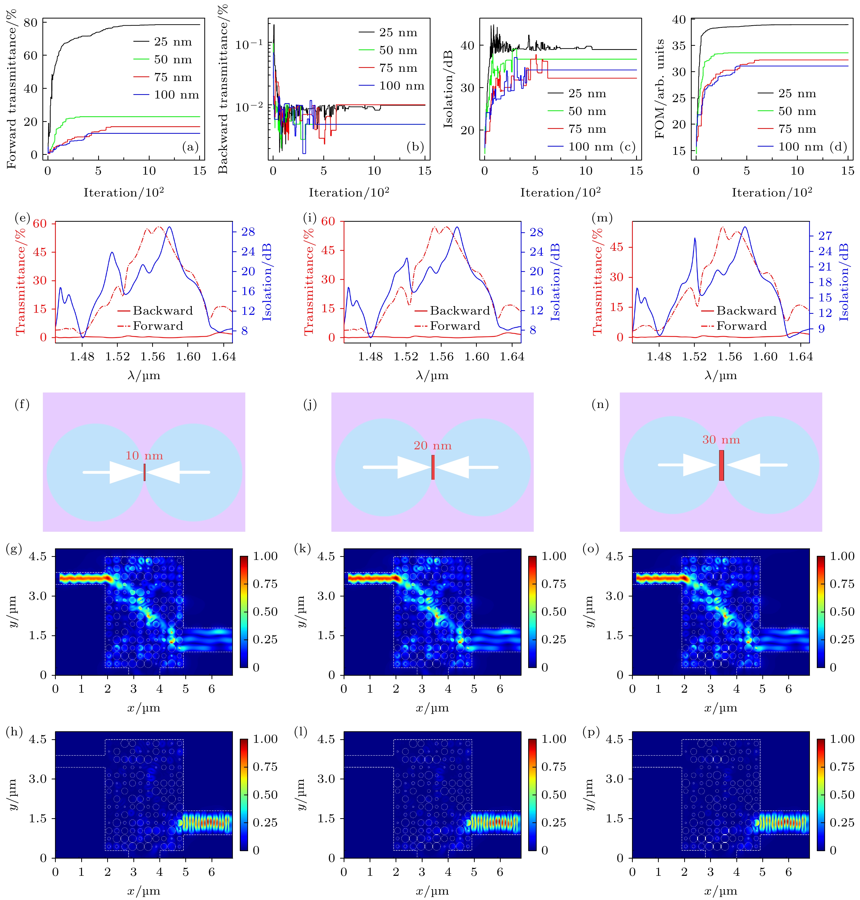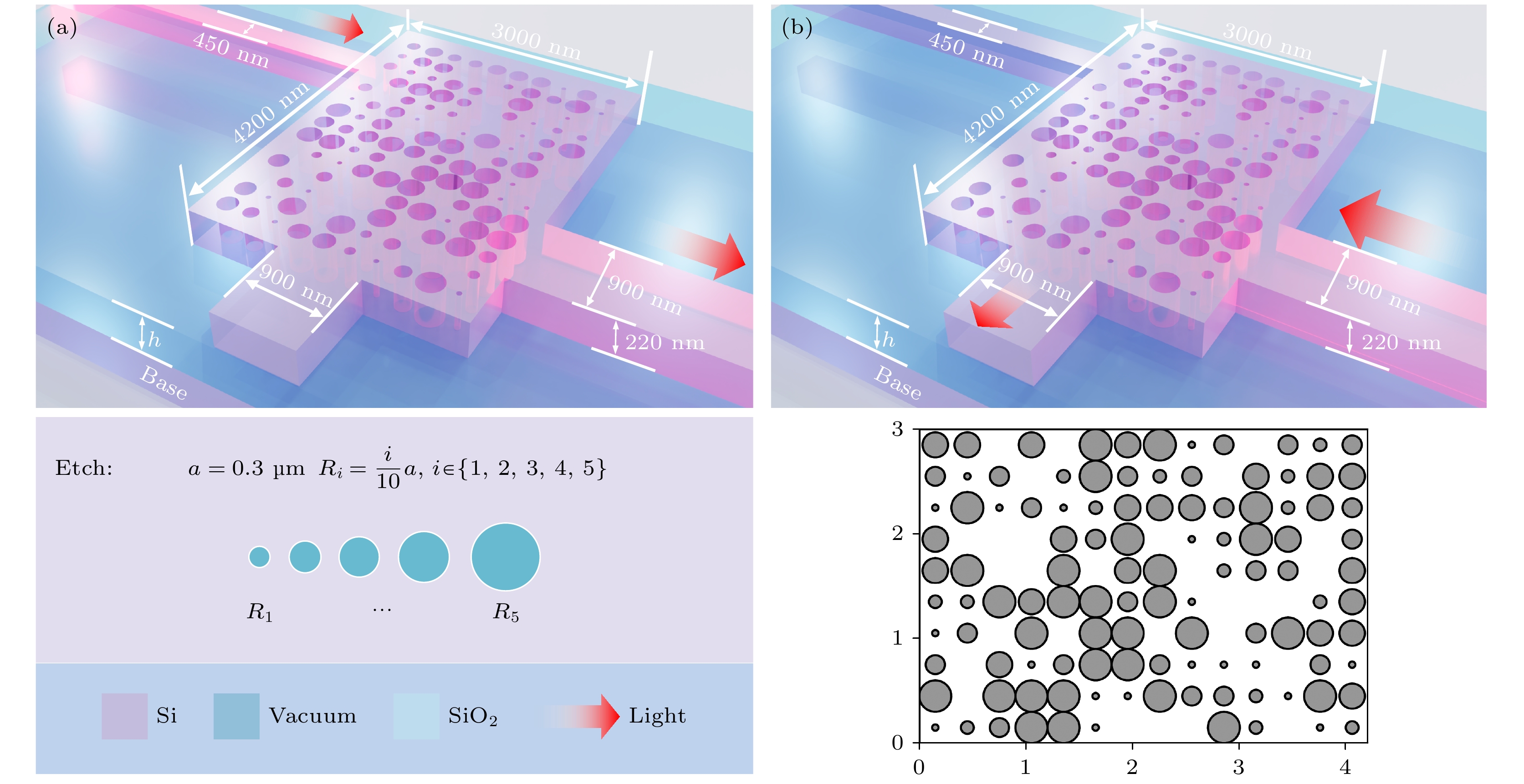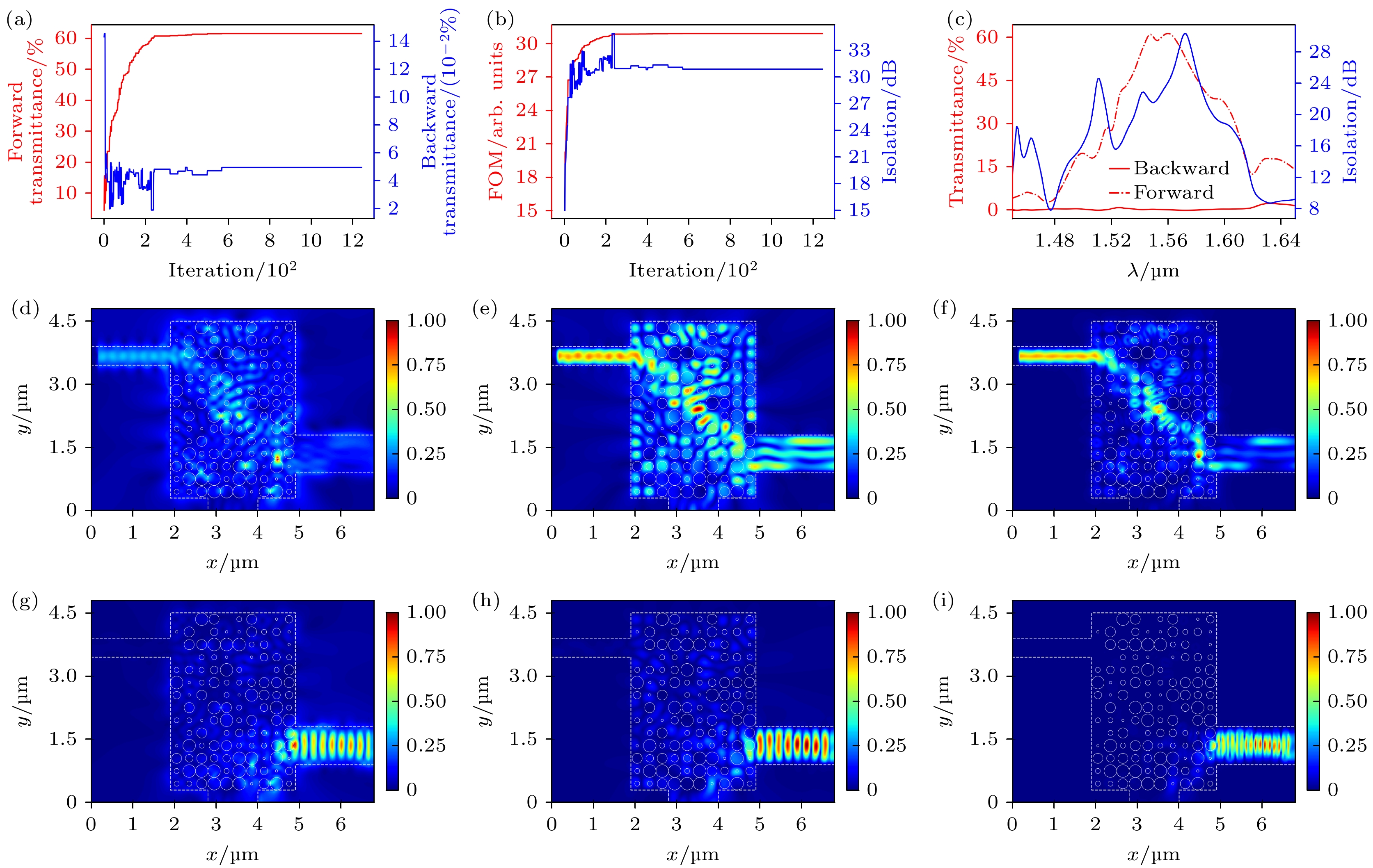 The directional optical transmission characteristics of on-chip integrated optical isolators have wide applications in fields such as optical communication and optical signal processing. At early stage, various schemes of on-chip optical isolators have been developed, such as single-crystal magneto-optical pomegranate scheme, and silicon nitride (Si3N4) micro-ring resonators. However, there is still lack of compact on-chip optical isolator solutions. Here, a compact and integrated silicon optical isolator on a standard silicon on insulator (SOI) substrate is proposed and designed by intelligent algorithms and a variety of micro-nano circular vias. A modified genetic algorithm is developed, a segmented design fitness function is induced, and a gene library is established to obtain an ultra-compact optical isolator scheme with a size of only 4.2 μm×3 μm. On a standard silicon on insulator substrate, a linear passive isolation scheme is achieved by etching circular holes with five different diameters: 60 nm, 120 nm, 180 nm, 240 nm, and 300 nm. In the TE polarization mode, the design achieves an isolation degree of approximately 31 dB and an insertion loss of about 2 dB. Furthermore, in TM polarization mode, the design achieves an isolation degree of approximately 38 dB and an insertion loss of 2 dB; Finally, the influence of different size groups on the performance of isolators is analyzed. The results show that the smaller the circular hole structure, the better the isolation performance is. However, at the same time, we also need to consider the real silicon etching process requirements. In practice, holes that are too small are difficult to etch the effects of etching penetration at 10 nm, 20 nm and 30 nm between circular vias on the performance of the isolator are also evaluated, and the preliminary results show that the etching penetration caused by the more mature 30 nm etching process is acceptable. Therefore, considering all factors, it is recommended that the minimum circular hole size be 30 nm and the minimum distance adjacent circular holes be 30 nm. These results can promote the development of highly integrated and ultra-small on-chip optical signal directional transmission schemes.