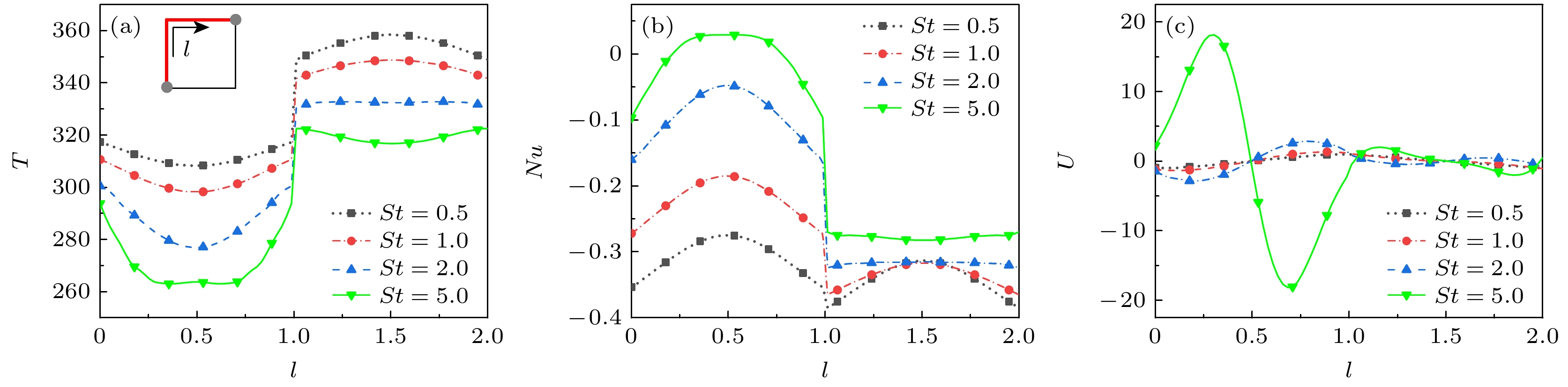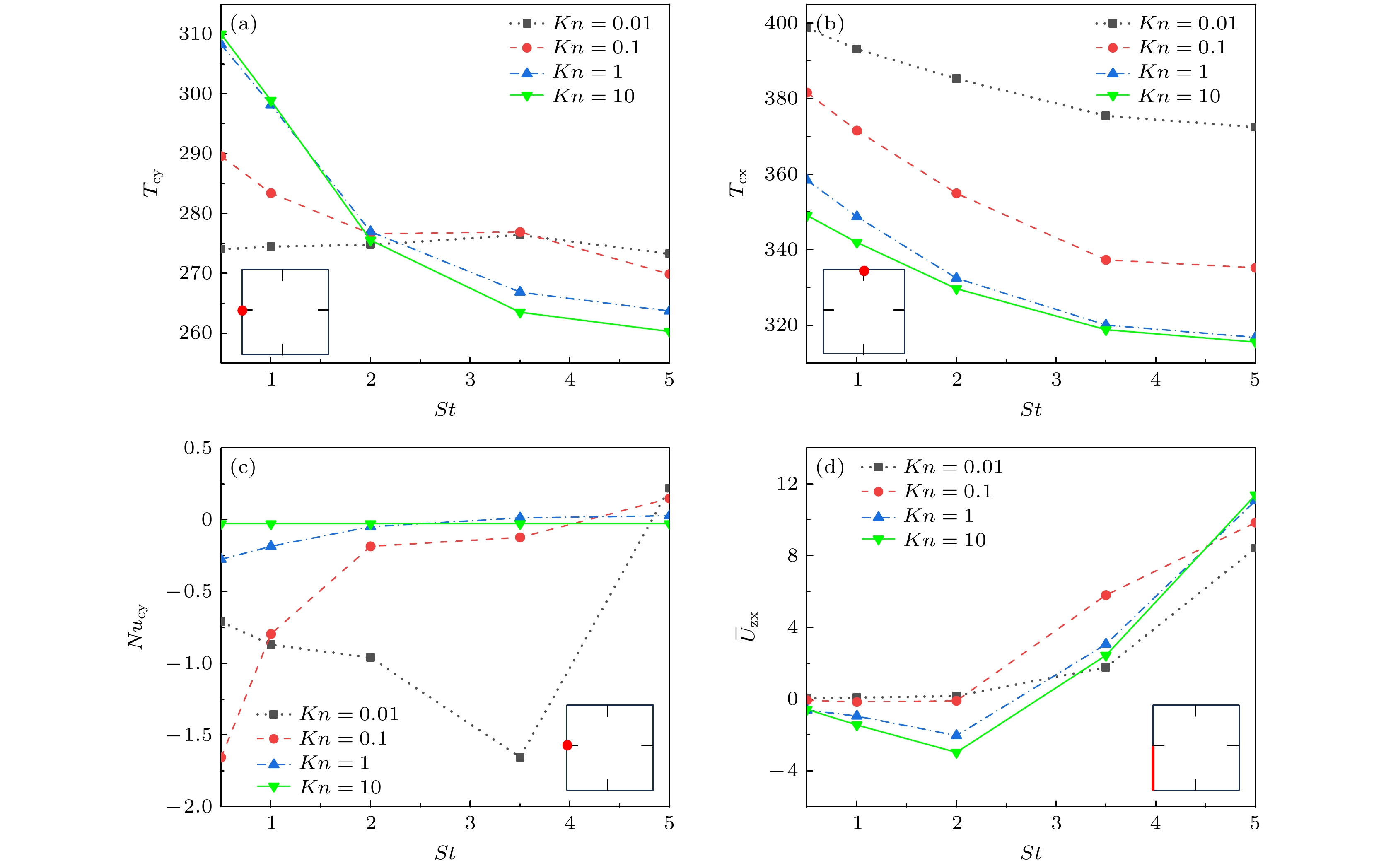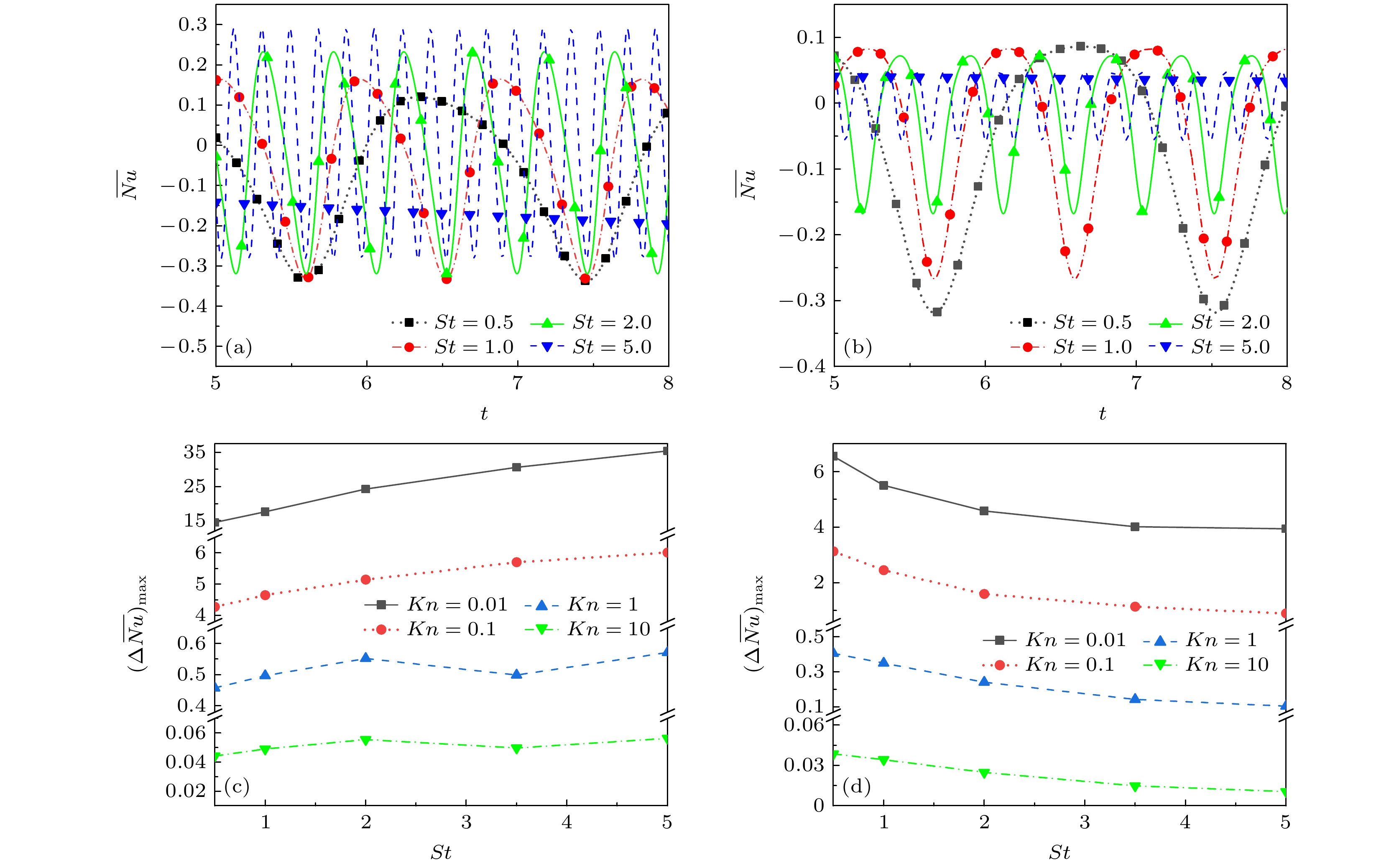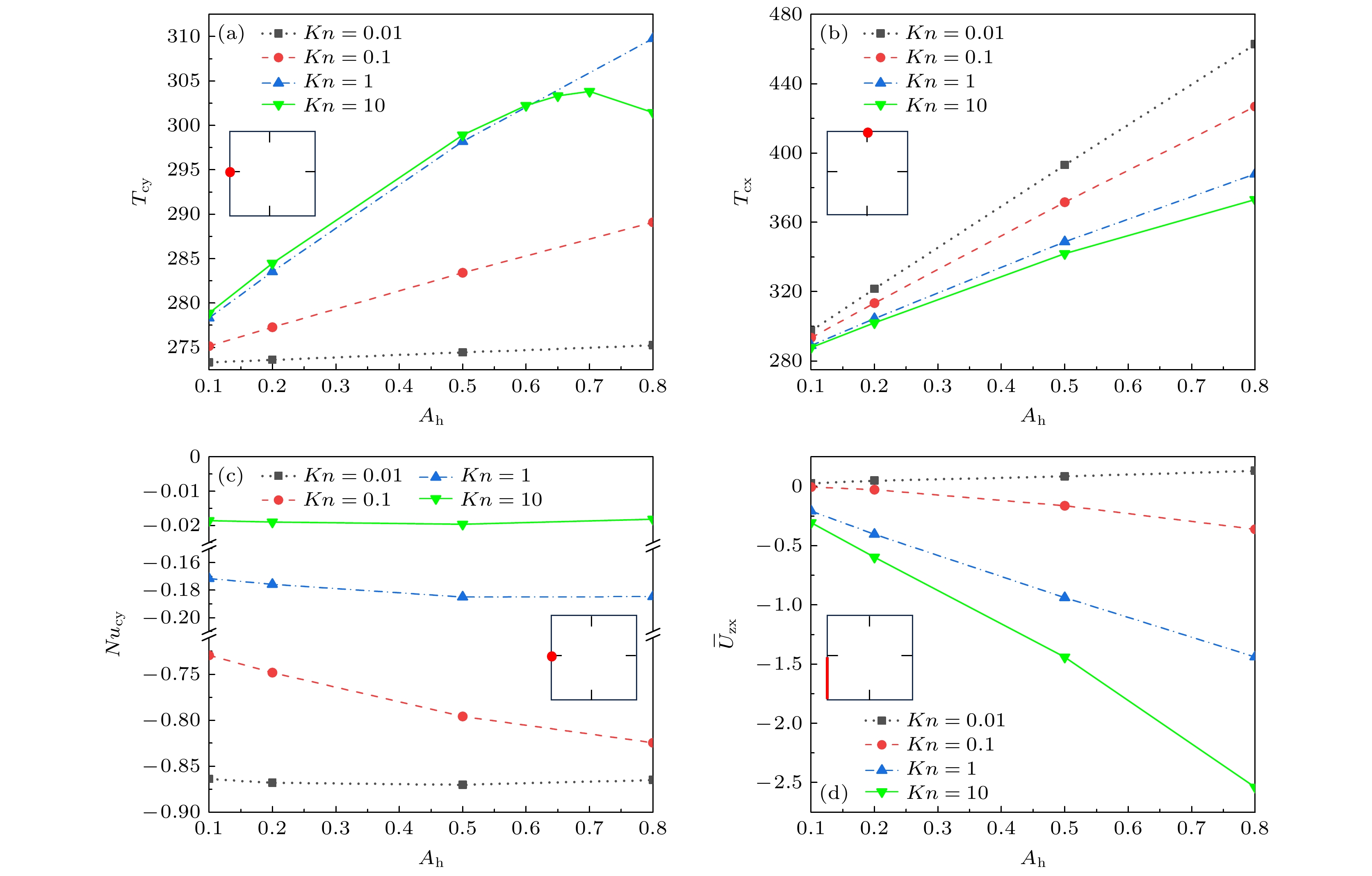 In order to examine the influence of wall temperature change on the flow and heat transfer properties of rarefied gas in restricted space, the discrete unified gas kinetic scheme (DUGKS) is used to simulate the thermal creep flows in a square cavity. All the boundaries of the cavity are stationary diffuse reflection walls. The temperature of left wall and right wall are lower, and the temperature of the upper wall and the lower wall are both subjected to periodic variation. The simulation parameters considered in the present work are set as follows: the Knudsen number Kn is in a range 0.01–10, temperature change frequency St in a range of 0.5–5, and temperature change amplitude Ah in a range of 0.1–0.8. The results indicate that the velocity field and temperature field in the cavity exhibit periodic variations. No inverse Fourier heat transfer phenomenon is observed within the parameter ranges studied. The intensity of the thermal creep flow can be increased by increasing the frequency, temperature, and the Knudsen number. This can also raise the temperature jump and velocity slip close to the temperature change walls. Heat transfer lag and a reduction in the heat transfer capability of the wall are caused by increasing St and Kn. When St is small, say, St = 0.5, a complex vortex structure is seen in the cavity. As the value of St rises to 5, the vortex disappears, the gas travels from the variable temperature wall to the horizontal centerline of cavity, and the region close to the middle of the left wall and right wall changes from an endothermic zone to an exothermic zone. Furthermore, the temperature field and velocity field inside the cavity hardly change, but the degree of heat transfer on the wall decreases with the increase of Ah. The main results are shown in the figure attached below. This work provides helpful recommendations for designing the MEMS devices by using pulsed heating.