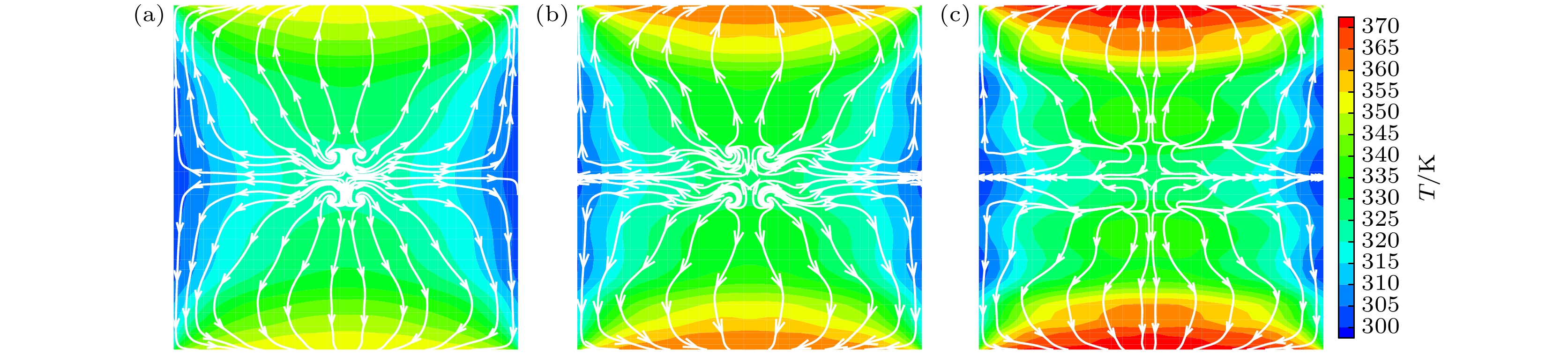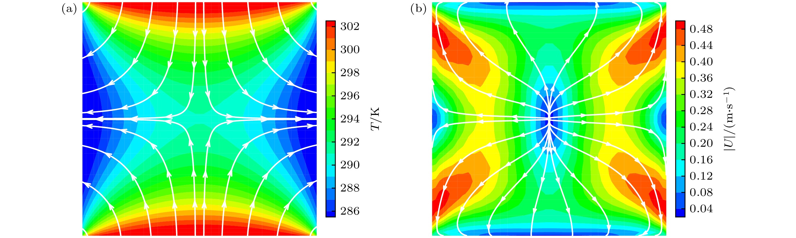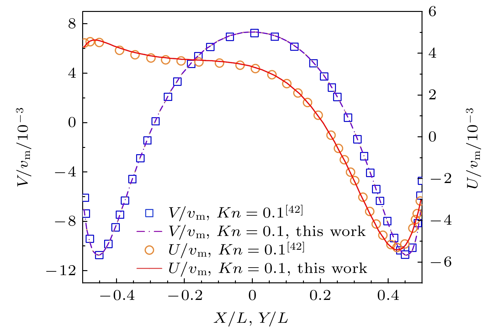 In order to examine the influence of wall temperature change on the flow and heat transfer properties of rarefied gas in restricted space, the discrete unified gas kinetic scheme (DUGKS) is used to simulate the thermal creep flows in a square cavity. All the boundaries of the cavity are stationary diffuse reflection walls. The temperature of left wall and right wall are lower, and the temperature of the upper wall and the lower wall are both subjected to periodic variation. The simulation parameters considered in the present work are set as follows: the Knudsen number Kn is in a range 0.01–10, temperature change frequency St in a range of 0.5–5, and temperature change amplitude Ah in a range of 0.1–0.8. The results indicate that the velocity field and temperature field in the cavity exhibit periodic variations. No inverse Fourier heat transfer phenomenon is observed within the parameter ranges studied. The intensity of the thermal creep flow can be increased by increasing the frequency, temperature, and the Knudsen number. This can also raise the temperature jump and velocity slip close to the temperature change walls. Heat transfer lag and a reduction in the heat transfer capability of the wall are caused by increasing St and Kn. When St is small, say, St = 0.5, a complex vortex structure is seen in the cavity. As the value of St rises to 5, the vortex disappears, the gas travels from the variable temperature wall to the horizontal centerline of cavity, and the region close to the middle of the left wall and right wall changes from an endothermic zone to an exothermic zone. Furthermore, the temperature field and velocity field inside the cavity hardly change, but the degree of heat transfer on the wall decreases with the increase of Ah. The main results are shown in the figure attached below. This work provides helpful recommendations for designing the MEMS devices by using pulsed heating.