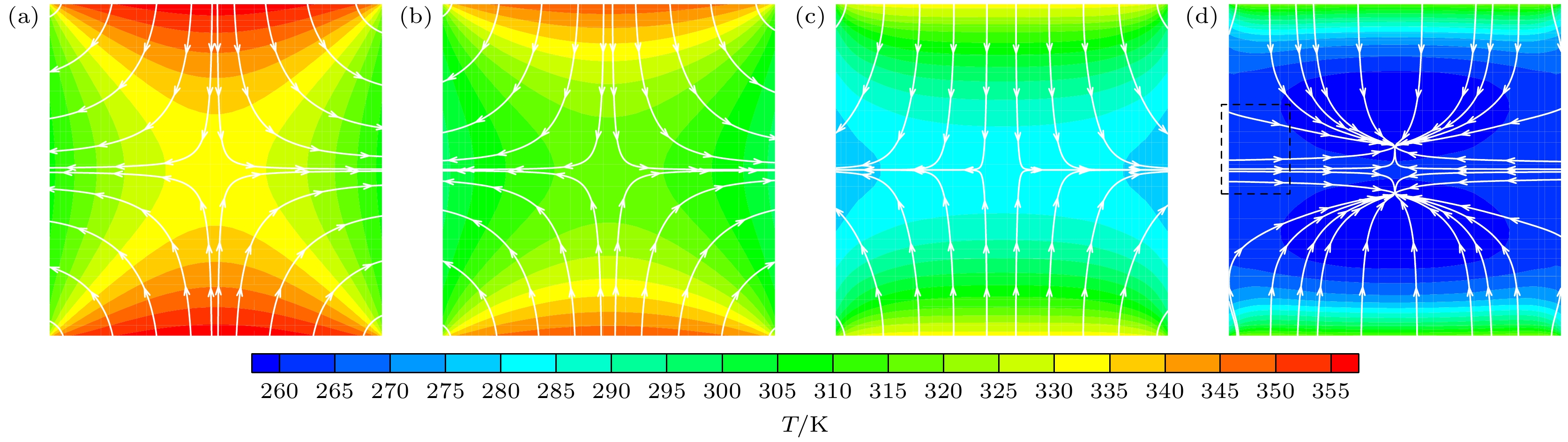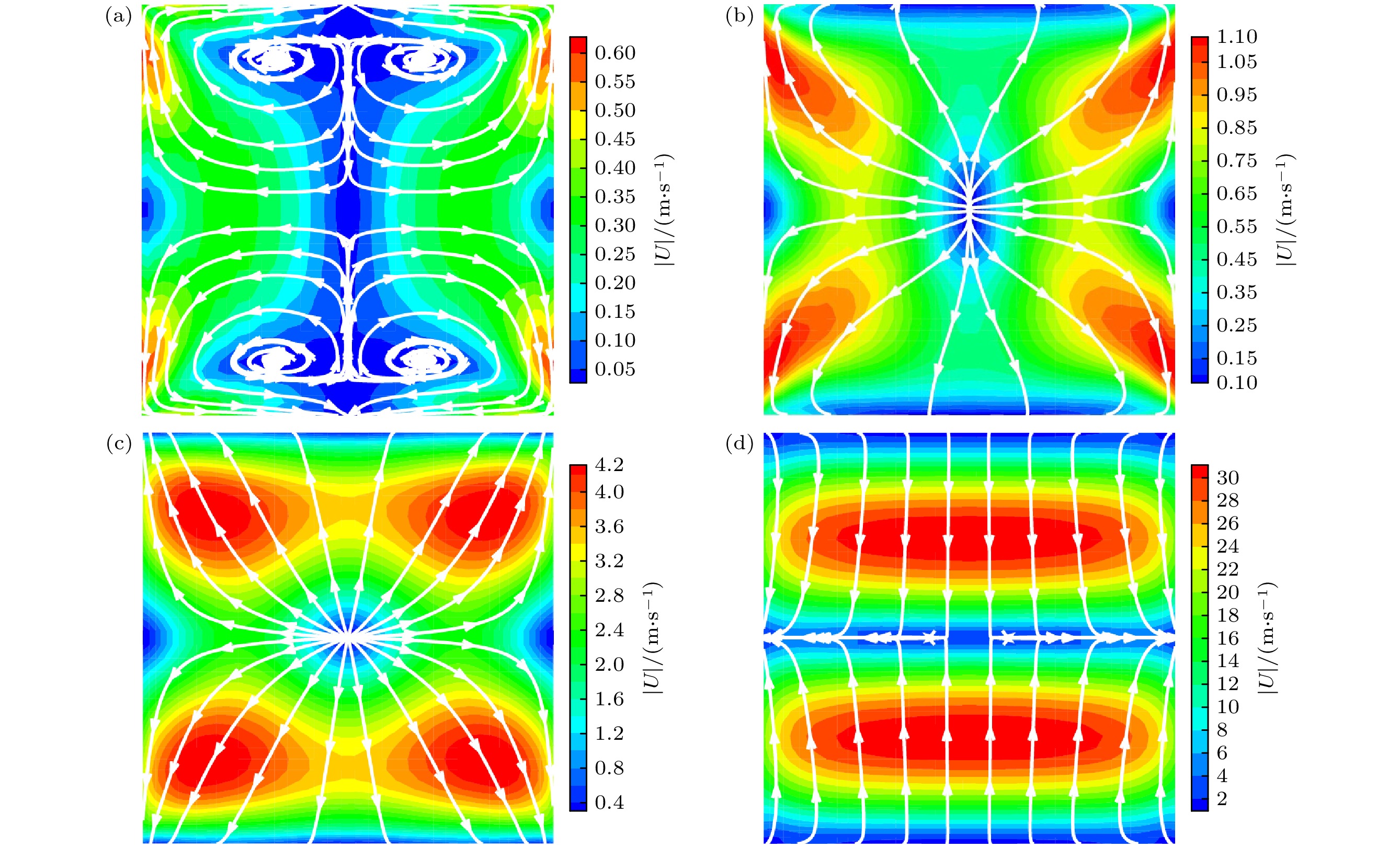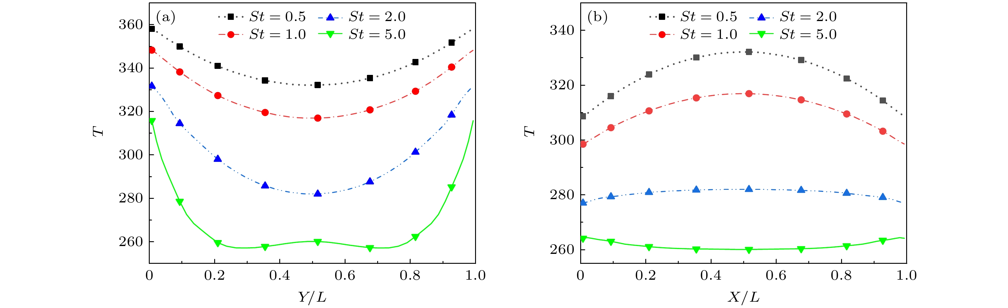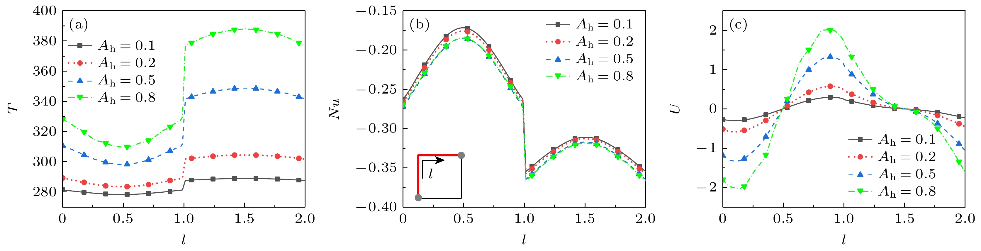 In order to examine the influence of wall temperature change on the flow and heat transfer properties of rarefied gas in restricted space, the discrete unified gas kinetic scheme (DUGKS) is used to simulate the thermal creep flows in a square cavity. All the boundaries of the cavity are stationary diffuse reflection walls. The temperature of left wall and right wall are lower, and the temperature of the upper wall and the lower wall are both subjected to periodic variation. The simulation parameters considered in the present work are set as follows: the Knudsen number Kn is in a range 0.01–10, temperature change frequency St in a range of 0.5–5, and temperature change amplitude Ah in a range of 0.1–0.8. The results indicate that the velocity field and temperature field in the cavity exhibit periodic variations. No inverse Fourier heat transfer phenomenon is observed within the parameter ranges studied. The intensity of the thermal creep flow can be increased by increasing the frequency, temperature, and the Knudsen number. This can also raise the temperature jump and velocity slip close to the temperature change walls. Heat transfer lag and a reduction in the heat transfer capability of the wall are caused by increasing St and Kn. When St is small, say, St = 0.5, a complex vortex structure is seen in the cavity. As the value of St rises to 5, the vortex disappears, the gas travels from the variable temperature wall to the horizontal centerline of cavity, and the region close to the middle of the left wall and right wall changes from an endothermic zone to an exothermic zone. Furthermore, the temperature field and velocity field inside the cavity hardly change, but the degree of heat transfer on the wall decreases with the increase of Ah. The main results are shown in the figure attached below. This work provides helpful recommendations for designing the MEMS devices by using pulsed heating.