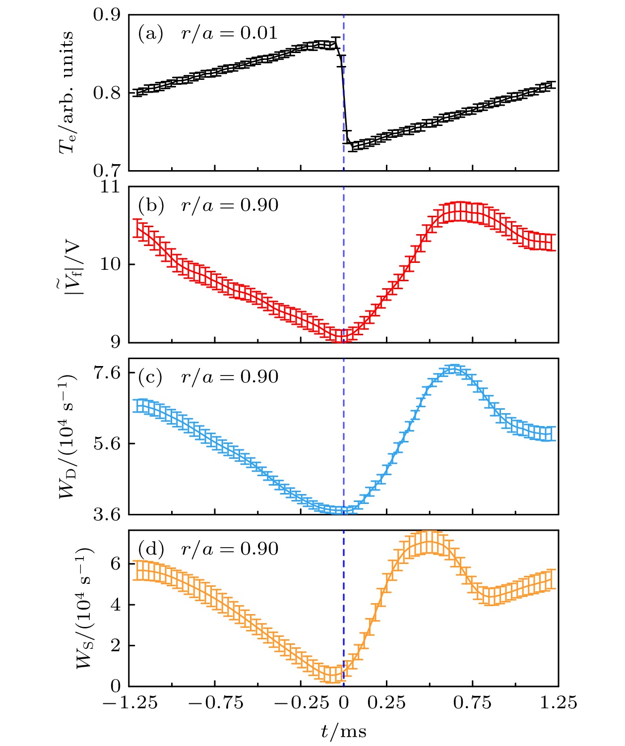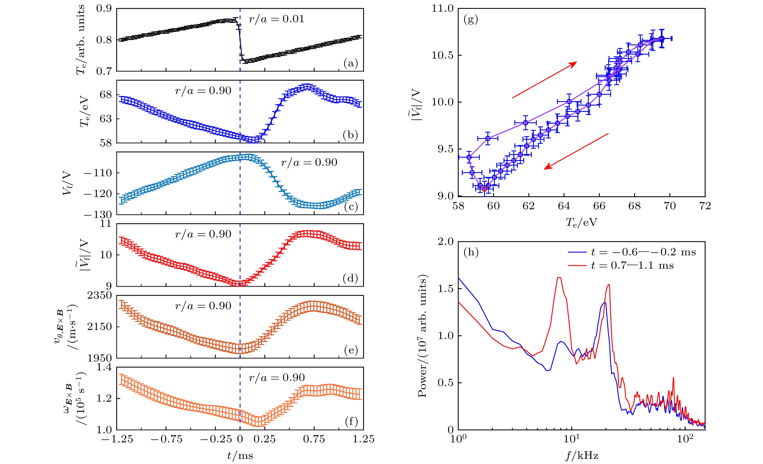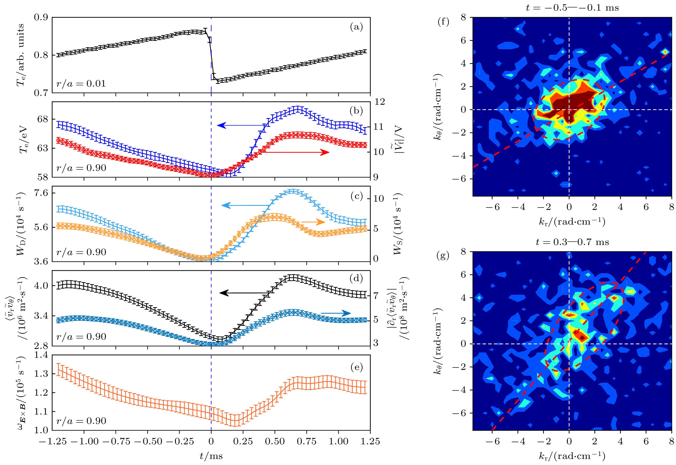 The effect of sawteeth on plasma performance and transport in the plasma of tokamak is an important problem in the fusion field. Sawtooth oscillations can trigger off heat and turbulence pulses that propagate into the edge plasma, and thus enhancing the edge shear flow and inducing a transition from low confinement mode to high confinement mode. The influences of turbulence spreading and symmetry breaking on edge shear flow with sawtooth crashes are observed in the J-TEXT tokamak. The edge plasma turbulence and shear flow are measured using a fast reciprocating electrostatic probe array. The experimental data are analyzed using some methods such as conditional average and probability distribution function. After sawtooth crashes, the heat and turbulence pulses in the core propagate to the edge, with the turbulence pulse being faster than the heat pulse. The attached figures (a)–(e) show the core electron temperature, and the edge electron temperature, turbulence intensity, turbulence drive and spreading rates, Reynolds stress and its gradient, and shearing rates, respectively. After sawtooth crashes, the edge electron temperature increases and the edge turbulence is enhanced, with turbulence preceding temperature. The enhanced edge turbulence is mainly composed of two parts: the turbulence driven by local gradient and the turbulence spreading from core to edge. The development of the estimated turbulence spreading rate is prior to that of the turbulence driving rate. The increase in the turbulence intensity can cause the turbulent Reynold stress and its gradient to increase, thereby enhancing shear flows and radial electric fields. Turbulence spreading leads the edge Reynolds stresses to develop and the shear flow to be faster than edge electron temperature. The Reynolds stress arises from the symmetry breaking of the turbulence wave number spectrum. After sawtooth collapses, the joint probability density function of radial wave number and poloidal wave number of turbulence intensity becomes highly skewed and anisotropic, exhibiting strong asymmetry, which can be seen in attached figures (f) and (g). The development of turbulence spreading flux at the edge is also prior to the particle flux driven by turbulence, indicating that turbulent energy transport is not simply accompanied by turbulent particle transport. These results show that the turbulence spreading and symmetry breaking can enhance turbulent Reynolds stress, thereby driving shear flows, after sawtooth has crashed.