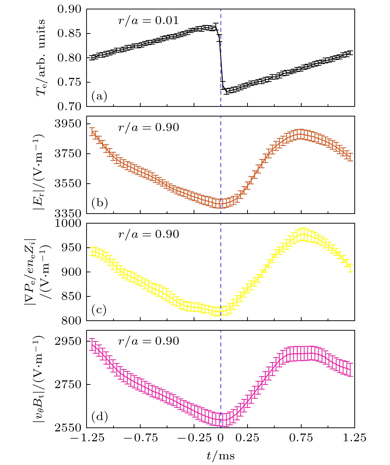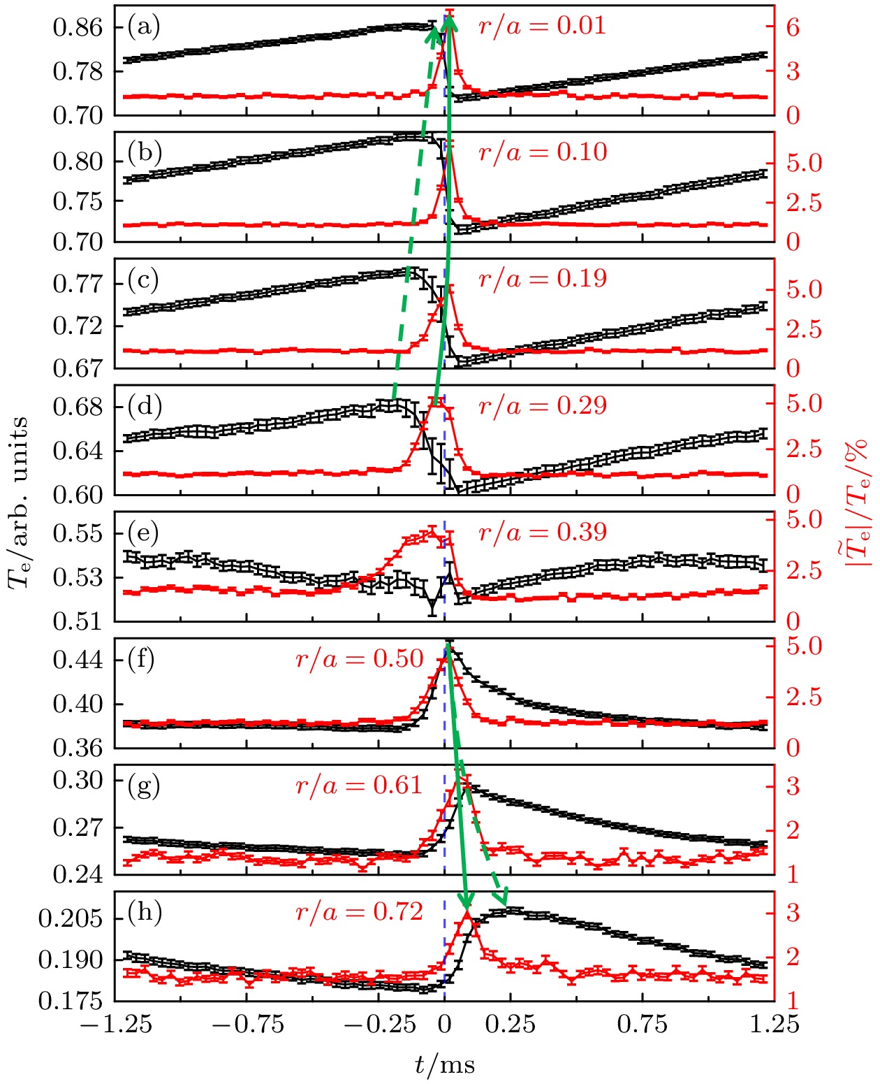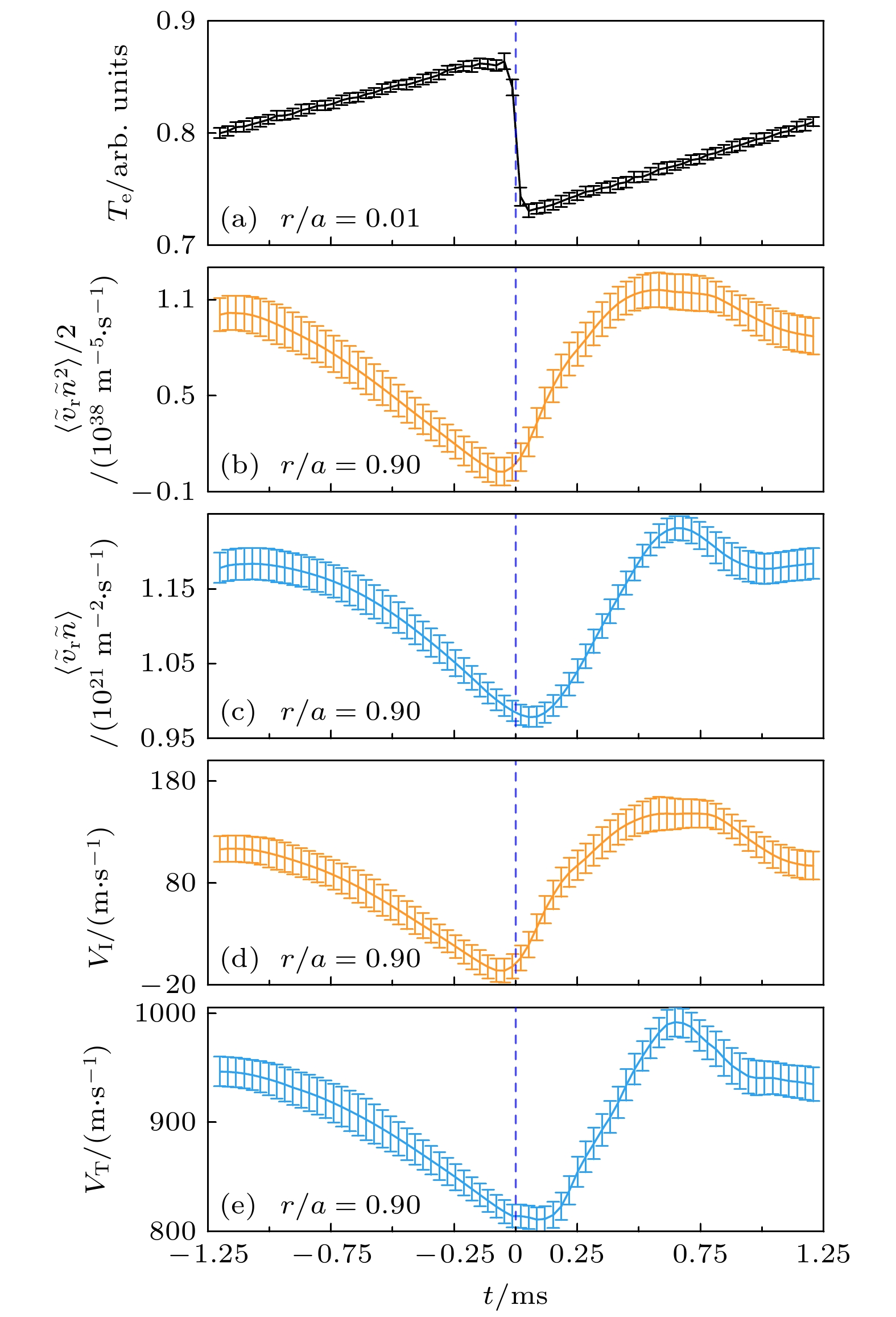 The effect of sawteeth on plasma performance and transport in the plasma of tokamak is an important problem in the fusion field. Sawtooth oscillations can trigger off heat and turbulence pulses that propagate into the edge plasma, and thus enhancing the edge shear flow and inducing a transition from low confinement mode to high confinement mode. The influences of turbulence spreading and symmetry breaking on edge shear flow with sawtooth crashes are observed in the J-TEXT tokamak. The edge plasma turbulence and shear flow are measured using a fast reciprocating electrostatic probe array. The experimental data are analyzed using some methods such as conditional average and probability distribution function. After sawtooth crashes, the heat and turbulence pulses in the core propagate to the edge, with the turbulence pulse being faster than the heat pulse. The attached figures (a)–(e) show the core electron temperature, and the edge electron temperature, turbulence intensity, turbulence drive and spreading rates, Reynolds stress and its gradient, and shearing rates, respectively. After sawtooth crashes, the edge electron temperature increases and the edge turbulence is enhanced, with turbulence preceding temperature. The enhanced edge turbulence is mainly composed of two parts: the turbulence driven by local gradient and the turbulence spreading from core to edge. The development of the estimated turbulence spreading rate is prior to that of the turbulence driving rate. The increase in the turbulence intensity can cause the turbulent Reynold stress and its gradient to increase, thereby enhancing shear flows and radial electric fields. Turbulence spreading leads the edge Reynolds stresses to develop and the shear flow to be faster than edge electron temperature. The Reynolds stress arises from the symmetry breaking of the turbulence wave number spectrum. After sawtooth collapses, the joint probability density function of radial wave number and poloidal wave number of turbulence intensity becomes highly skewed and anisotropic, exhibiting strong asymmetry, which can be seen in attached figures (f) and (g). The development of turbulence spreading flux at the edge is also prior to the particle flux driven by turbulence, indicating that turbulent energy transport is not simply accompanied by turbulent particle transport. These results show that the turbulence spreading and symmetry breaking can enhance turbulent Reynolds stress, thereby driving shear flows, after sawtooth has crashed.