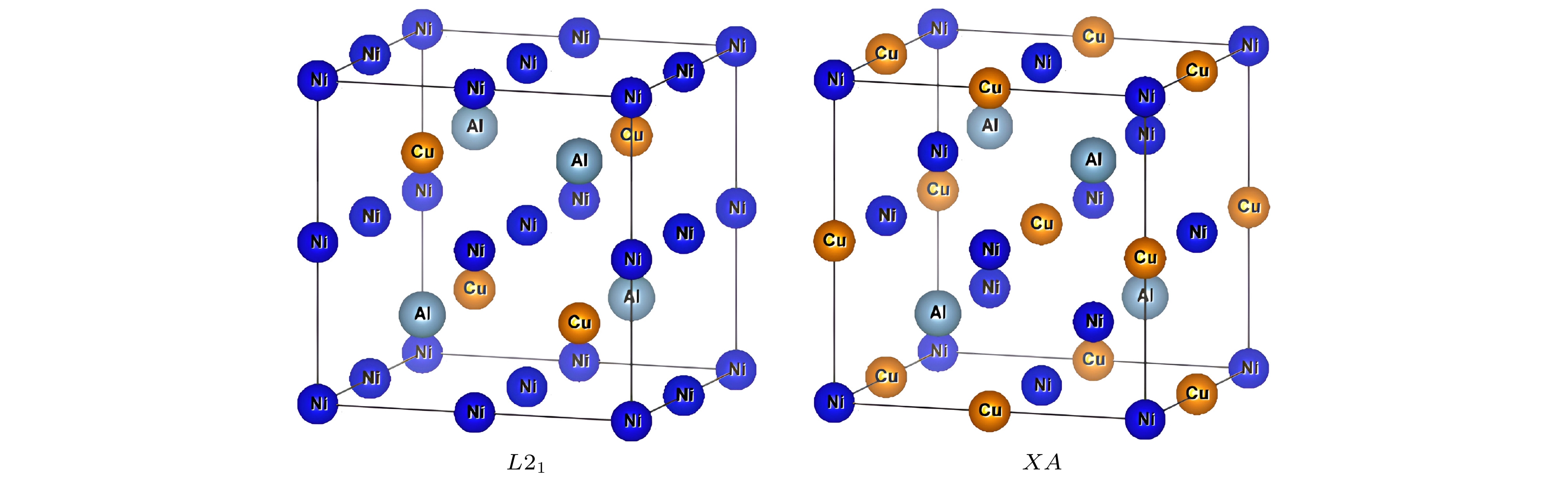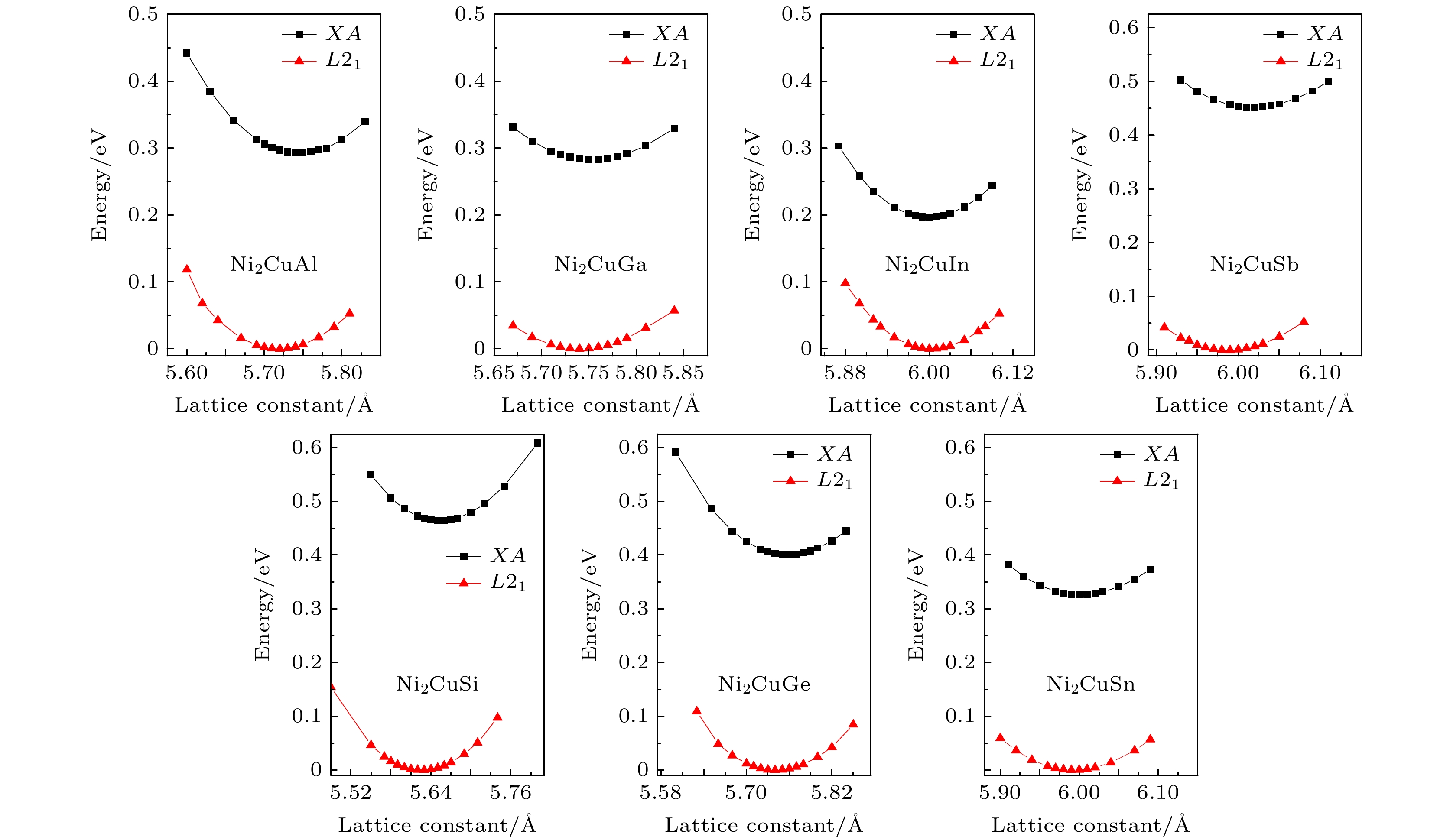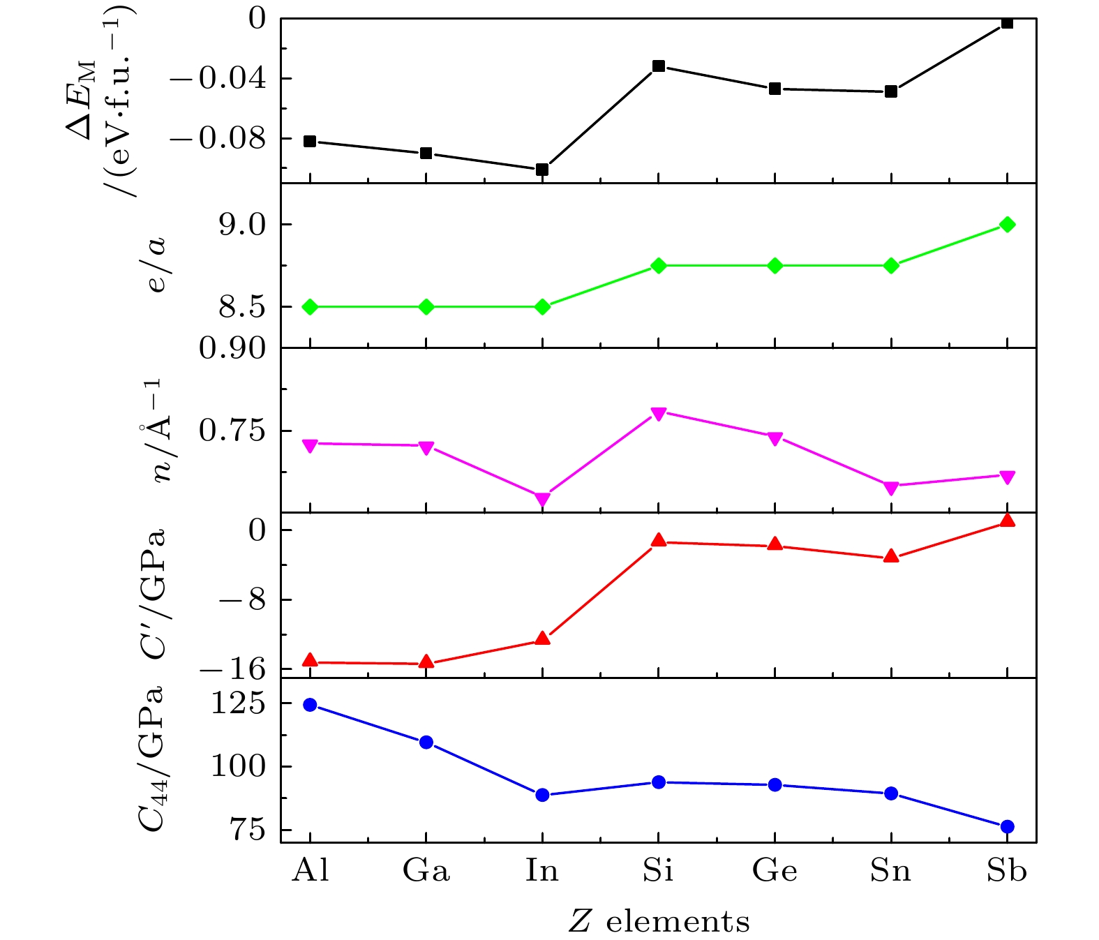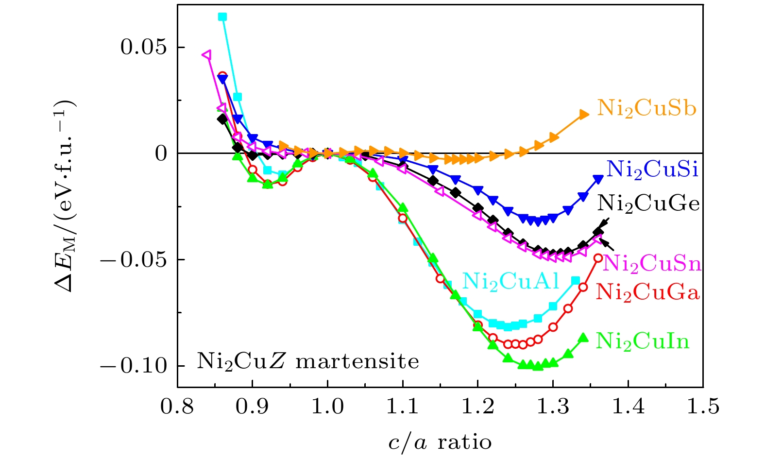 Ni2-based Heusler alloys have received increasing attention due to their shape memory effects and the relevant application properties. It is interesting to explore new Ni2-based shape memory alloys with novel properties. In this work, the site preference, electronic structure, elastic parameters and martensitic transformation of new Ni2Cu-based Heusler alloys Ni2CuZ (Z = Al, Ga, In, Si, Ge, Sn and Sb) are investigated theoretically. Between the two highly-ordered structures of Heusler alloys, Ni2CuZ alloy tends to crystallize in the L21 structure with Cu atom entering the B site in the cubic lattice. In contrast, the XA structure is higher in energy and lower in stability. This is different from the usual rule that transition metal atoms with more valence electrons tend to occupy the A, C sites at first and can be related to the strong covalent hybridization between Ni and main group elements Z in L21 type Ni2CuZ. Ni2CuZ martensites are all lower in energy than the corresponding austenites, which makes them candidates for shape memory alloys. This can be explained by the Jahn-Teller effect characterized by the reduced states near EF in the DOS structure and the mechanical instability of the cubic austenite lattice. The martensite-austenite energy difference ΔEM is strongly influenced by main group elements Z. When Z are in the same group, the ΔEM increases with their atomic number increasing, but when Z are in the same period, an opposite trend is observed. The ΔEM can be regarded as a driving force for the martensitic transformation: a larger ΔEM corresponds to a higher martensitic transformation TM. In Heusler alloys, electron concentration e/a and electron density n are usually used to discuss the variation of TM. An increase of e/a or n tends to increase TM. However, this is in discrepancy with the results in Ni2CuZ, which can be explained by using, the new factors, the negative shear modulus \begin{document}$ C' $\end{document} and softening of the elastic constant C44 and their variations with Z elements. These results reveal the close relation between the martensitic transformation and mechanical parameters and indicate that they are important factors to predict new shape memory alloys and analyse their properties in Heusler alloys. It is also found that the Young’s modulus and shear modulus increase and Poisson’s ratio decreases after the martensitic transformation. Thus, the Ni2CuZ martensite has higher stiffness and rigidity but lower ductility than the austenite.