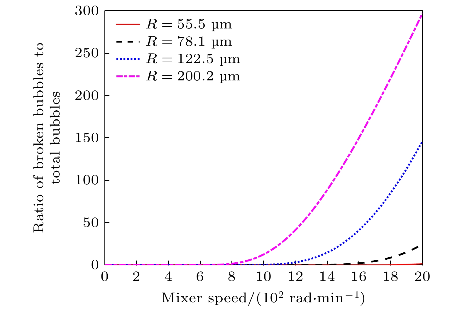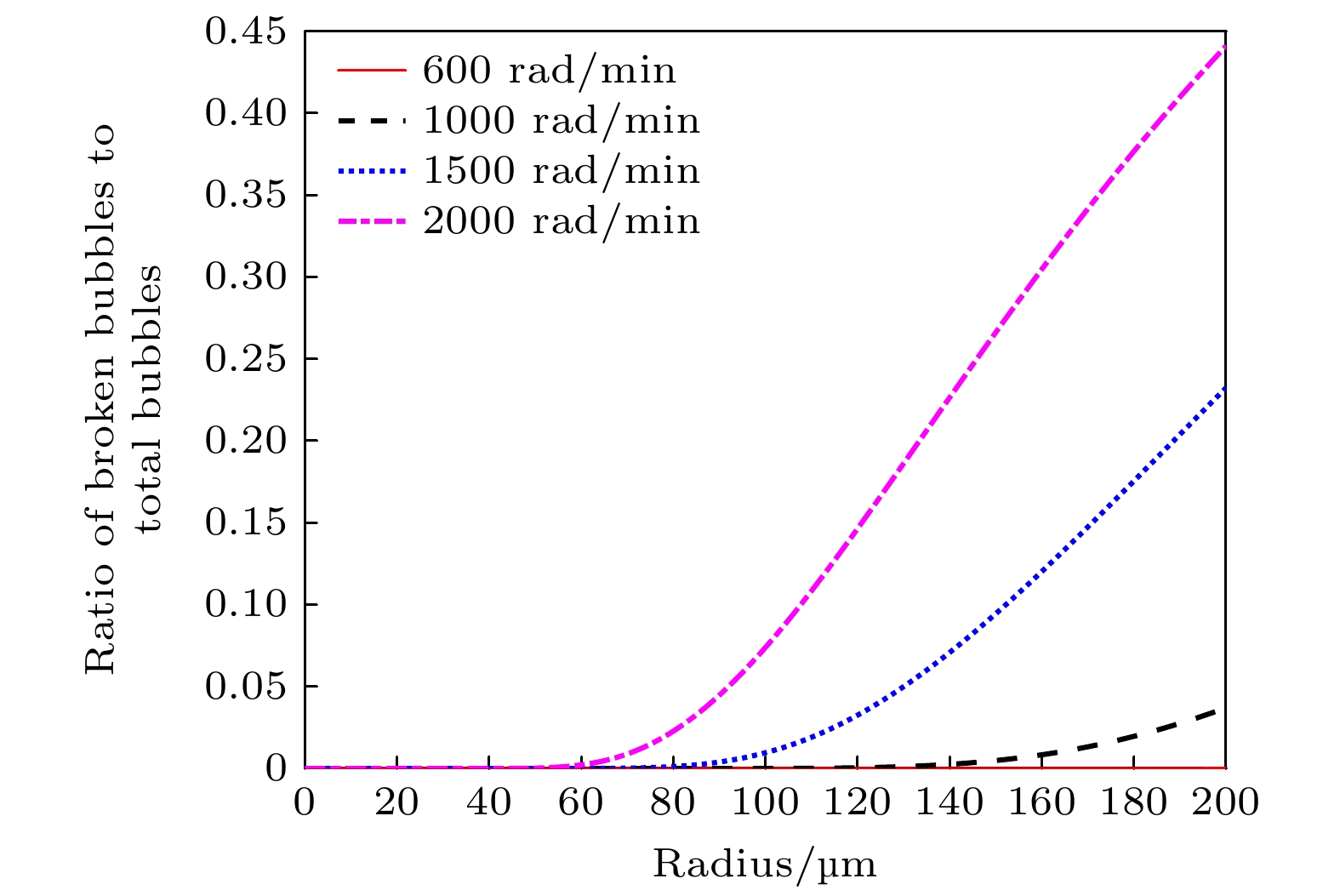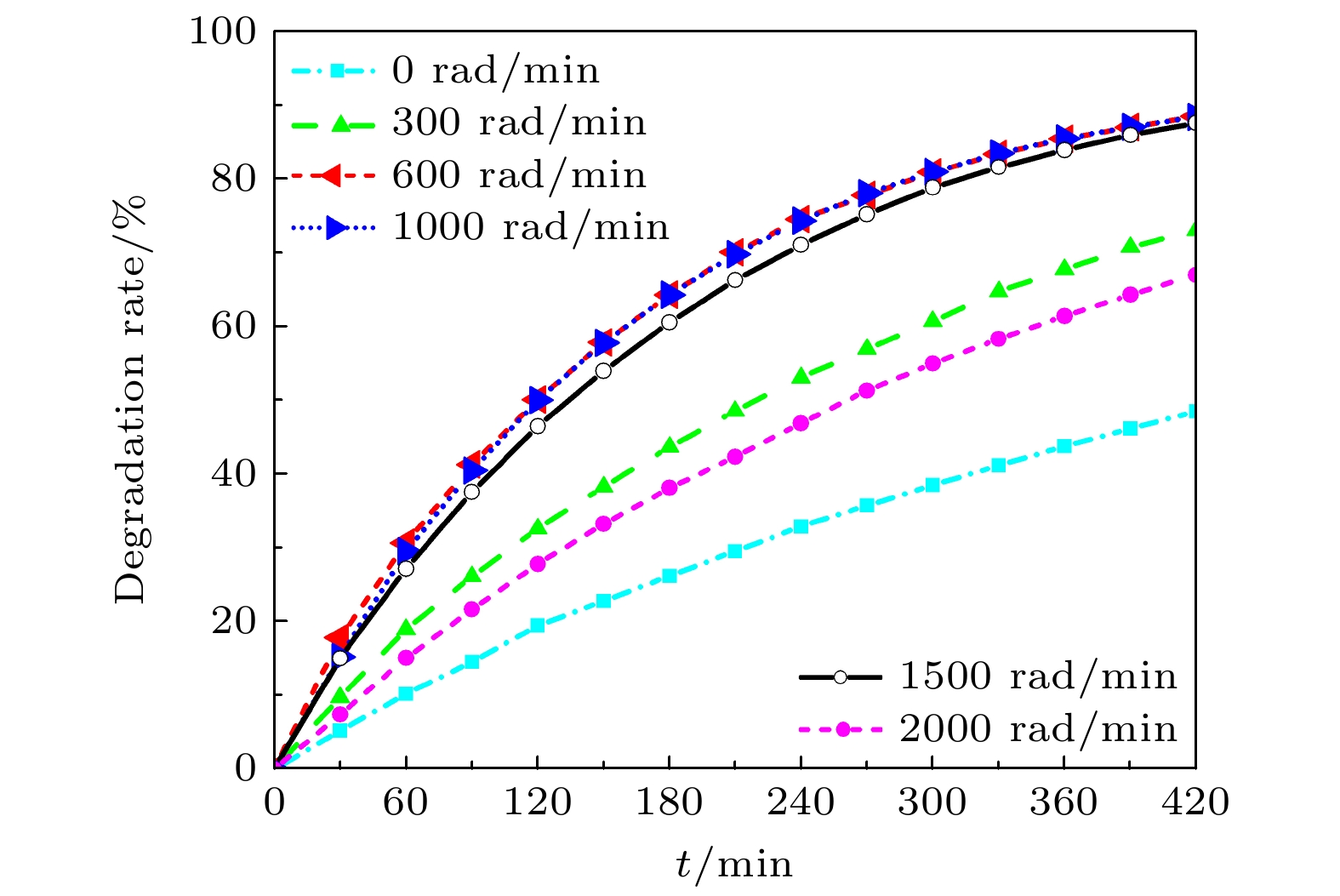 The liquid vortex flow field plays a crucial role not only in the transfer of matter and heat but also in significantly affecting the distribution of sound fields, which in turn influences the behavior of bubbles in the flow. This ultimately affects the phenomenon of acoustic cavitation. Based on the combination of the theory of bubble fragmentation and the theory of funnel-shaped vortex, in a three-dimensional vortex field. The effect of the vortex flow field (flow field generated by stirring) on the bubble breakup probability, as well as its modulation of acoustic cavitation, is investigated in this paper. In addition, the phenomena observed in experiments are explained. When the stirring speed reaches 1000 rad/min, the degradation effect no longer shows a monotonic increase, but instead begins to decline. It is demonstrated that with the increase of stirring speed, the probability of bubble breakup increases significantly. For instance, when the stirring speed is 1000 rad/min, the probability of bubble breakup is about 0.17%. At a stirring speed of 1500 rad/min, the breakup probability rises to 23%, and at 2000 rad/min, it reaches 44%. Moreover, the critical radius for bubble breakup decreases. The critical radius, as defined in this study, refers to the bubble radius at which the probability of breakup becomes nonzero. Experimental data show that at 600 rad/min, the critical radius for bubble breakup is about 200 μm, while at 2000 rad/min, it shortens to 55.5 μm. This indicates that in a high-speed rotating vortex field, bubbles may rupture before reaching their maximum cavitation radius, thus losing their effective cavitation effect. Further analysis shows that in the vortex flow field, for bubbles with an initial radius smaller than 22.5 μm, the temperature inside the bubbles upon collapse can reach as high as 2217.3 K (corresponding to an initial radius of 22.5 μm). For bubbles with an initial radius of 20 μm, the collapse temperature can even reach 2264.3 K. For bubbles with an initial radius of 40 μm, when the stirring speed does not exceed 1500 rad/min, the bubbles can still collapse under the action of the sound field, and the temperature inside the bubble upon collapse can reach 1659.6 K, which is sufficient to trigger off the cavitation effect. However, when the stirring speed exceeds 1500 rad/min, bubbles may break up too quickly and lose their cavitation capacity, thus failing to produce the expected cavitation effect. Experimental results further verify that at moderate stirring speeds (600—1000 rad/min), the acoustic cavitation effect is most pronounced, while excessively high stirring speeds suppress the enhancement of the degradation effect. This phenomenon suggests that the introduction of the vortex flow field makes the factors affecting acoustic cavitation more complex. The optimization of the acoustic cavitation effect requires not only the consideration of the sound field distribution and mass transfer but also the comprehensive factors such as gas entrainment, bubble aggregation, and breakup. Therefore, a thorough analysis and regulation of these factors are crucial for the widespread application of acoustic cavitation technology in engineering, with important theoretical value and practical significance, providing scientific basis and direction for further optimizing the acoustic cavitation process.
