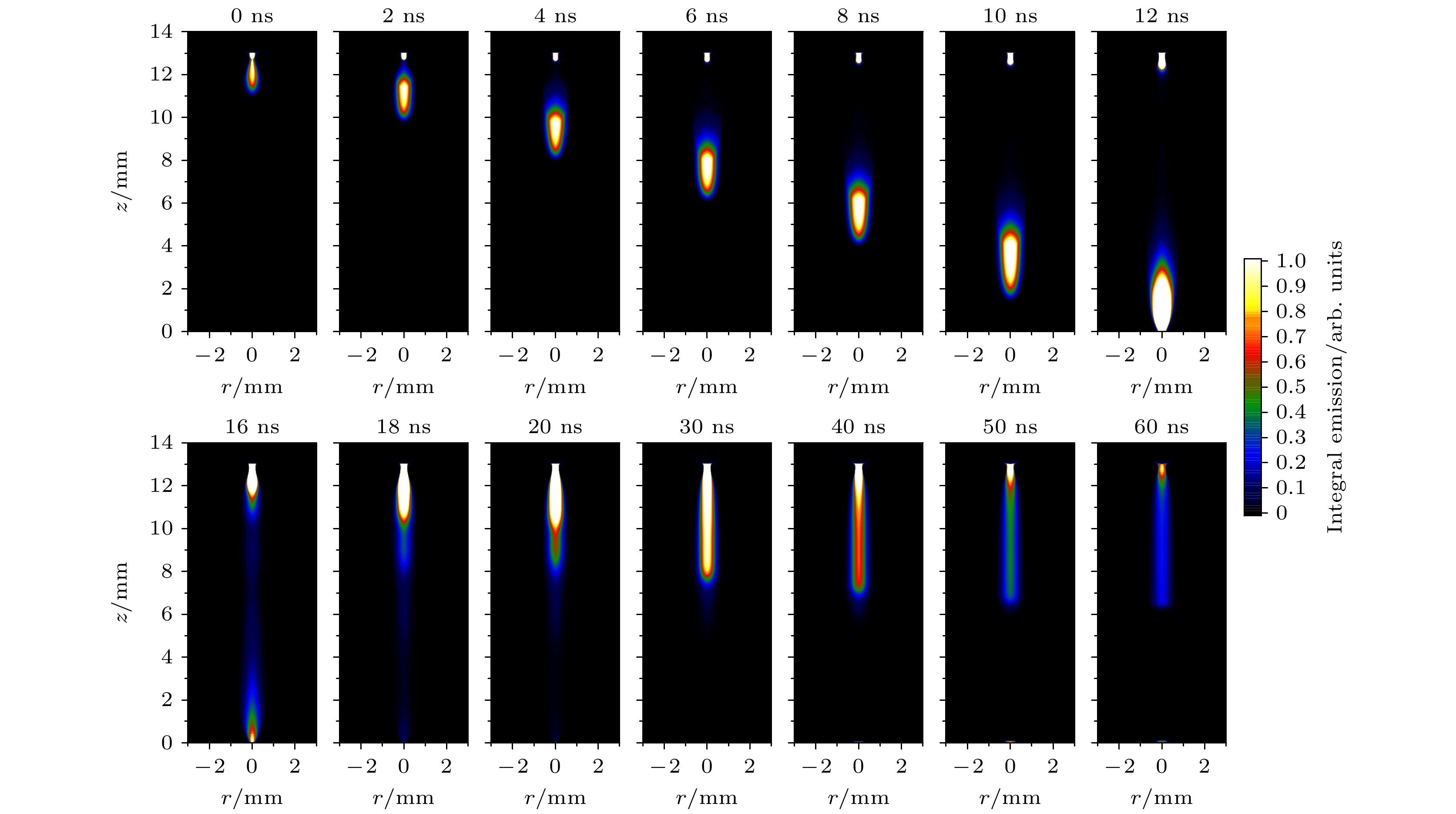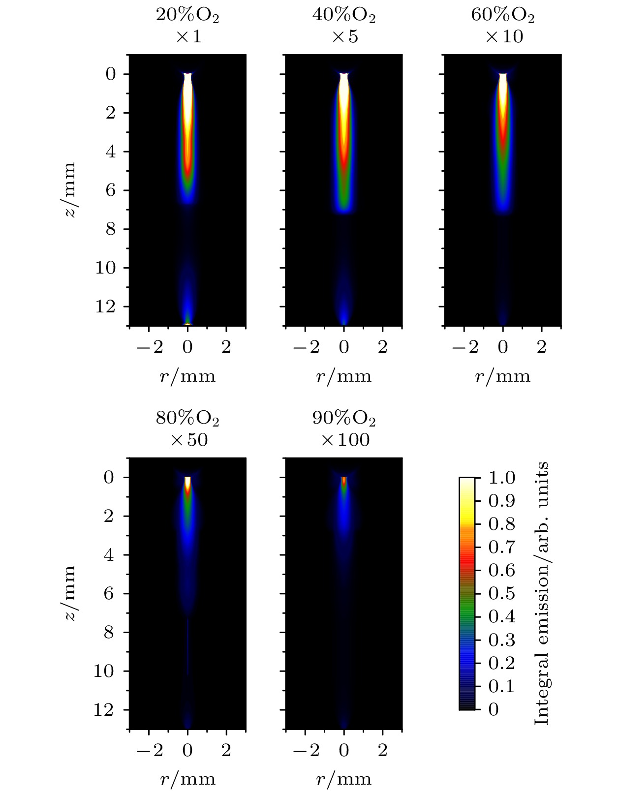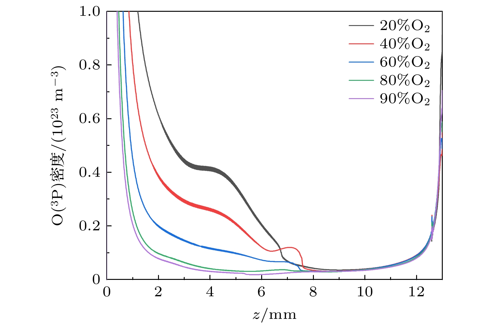 Streamer discharge has been widely used in fields of sterilization, disinfection, ozone generation, etc. The secondary discharge process significantly affects the effective ozone production duration and efficiency. However, the mechanism of oxygen concentration affecting secondary discharge characteristics and the yield of target products is still unclear. To address this issue, a fluid-based analysis model of the secondary positive streamer discharge process between needle-plate electrodes under varying oxygen concentrations is developed in this work. This model considers the radial electric field and resolves potential non-physical branching issues that may arise in discharge simulations at high oxygen concentrations. In this work, the effect of oxygen concentration on the optical emission characteristics of secondary positive streamers is examined. The optical emission intensity, cathode charge transfer, and the yields of excited-state oxygen atoms (O(3P)) under different oxygen concentrations are investigated and compared with experimental data. The results show that when the oxygen concentration increases from 20% to 90%, the light emission intensity of the secondary discharge decreases by about 0.2%. At the same time, the average electron density in the discharge channel decreases by 90%, the change of electric field intensity is less than 10%, and the duration of single discharge duration is shortened by 77%. Under these conditions, the proportion of O(3P) yield originating from the primary discharge increases from 20% to 38%, and the unit energy yield of excited-state oxygen atoms O(3P) rises by 64%. Although the reduction in discharge duration results in a 50% decrease in absolute O(3P) yield, the increase in unit energy yield far compensates for the decrease in single-discharge yield. The single-discharge yield decreases with oxygen concentration increasing due to the enhanced two- and three-body adsorption effects of oxygen molecules, which reduce the electron density. Additionally, the increased collision probability between electrons and oxygen molecules further affects these characteristic changes.