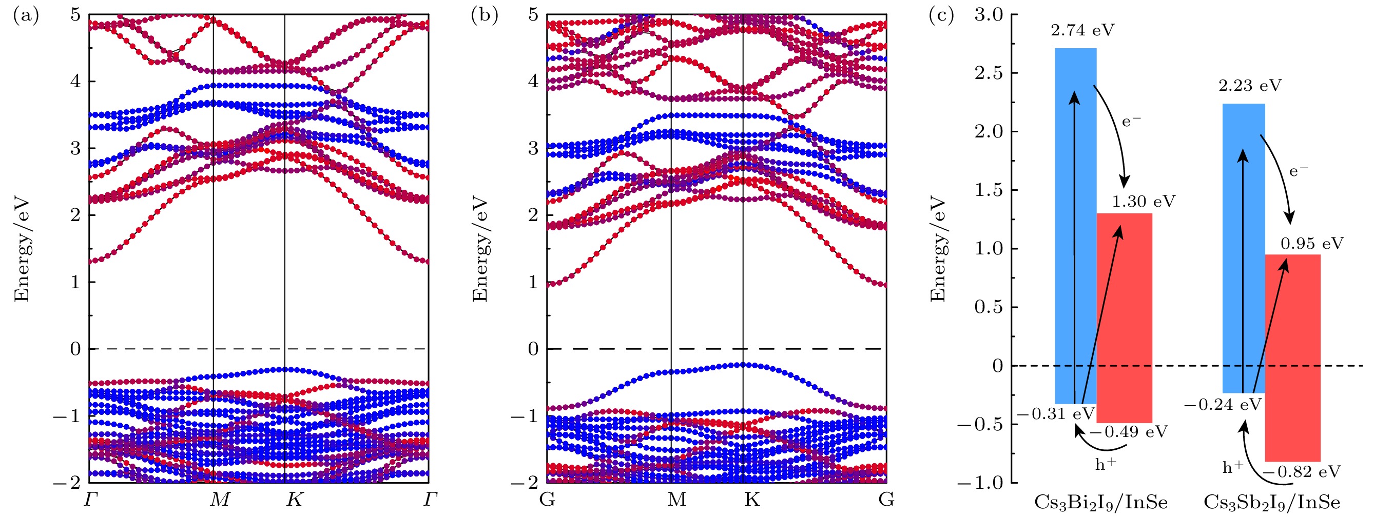 9/InSe heterostructures suitable for photoluminescent devices. However, the energy band structure based on the Shockley-Queisser limit and type-II arrangement shows that the intrinsic photoelectric conversion efficiency (PCE) of the 2D Cs