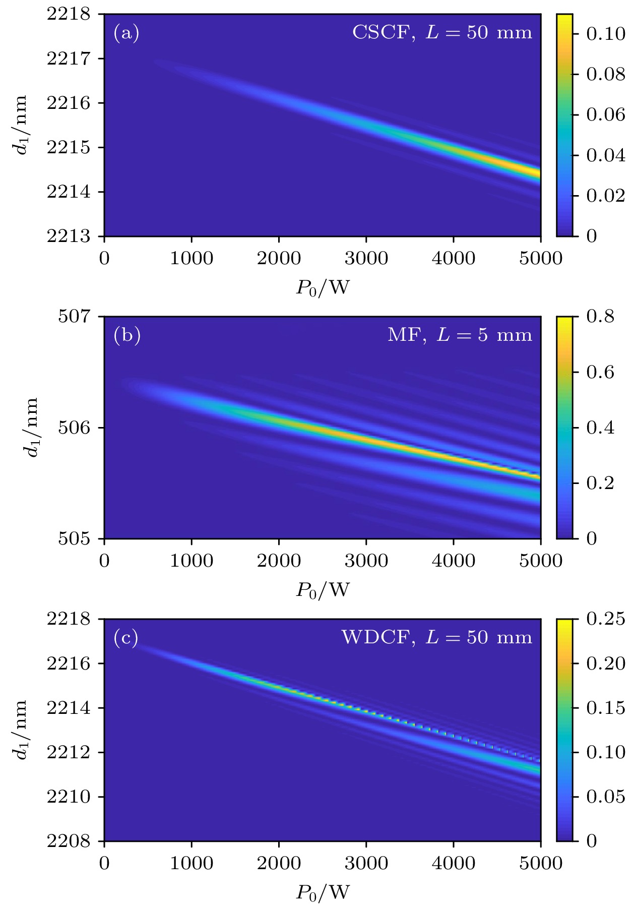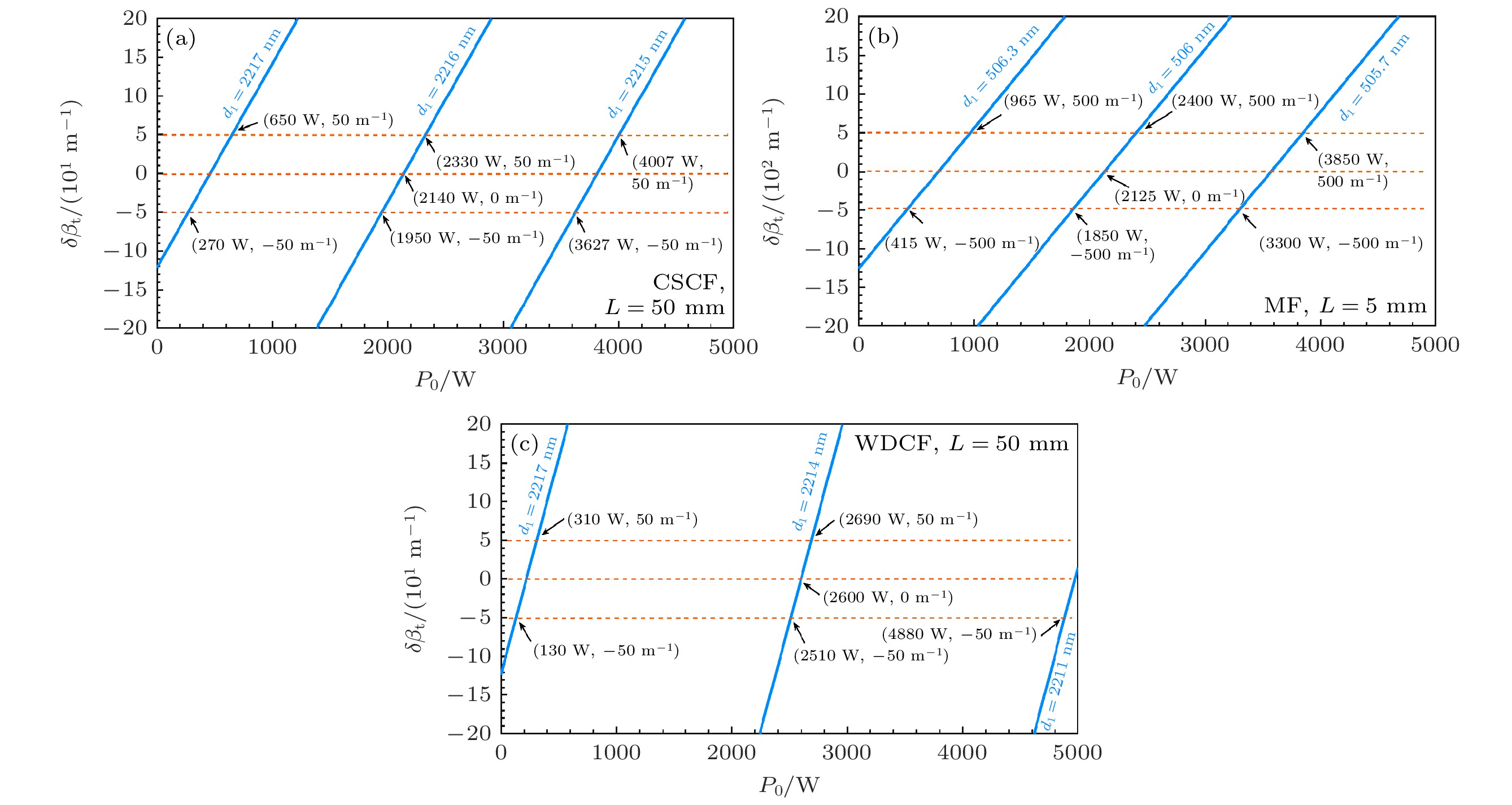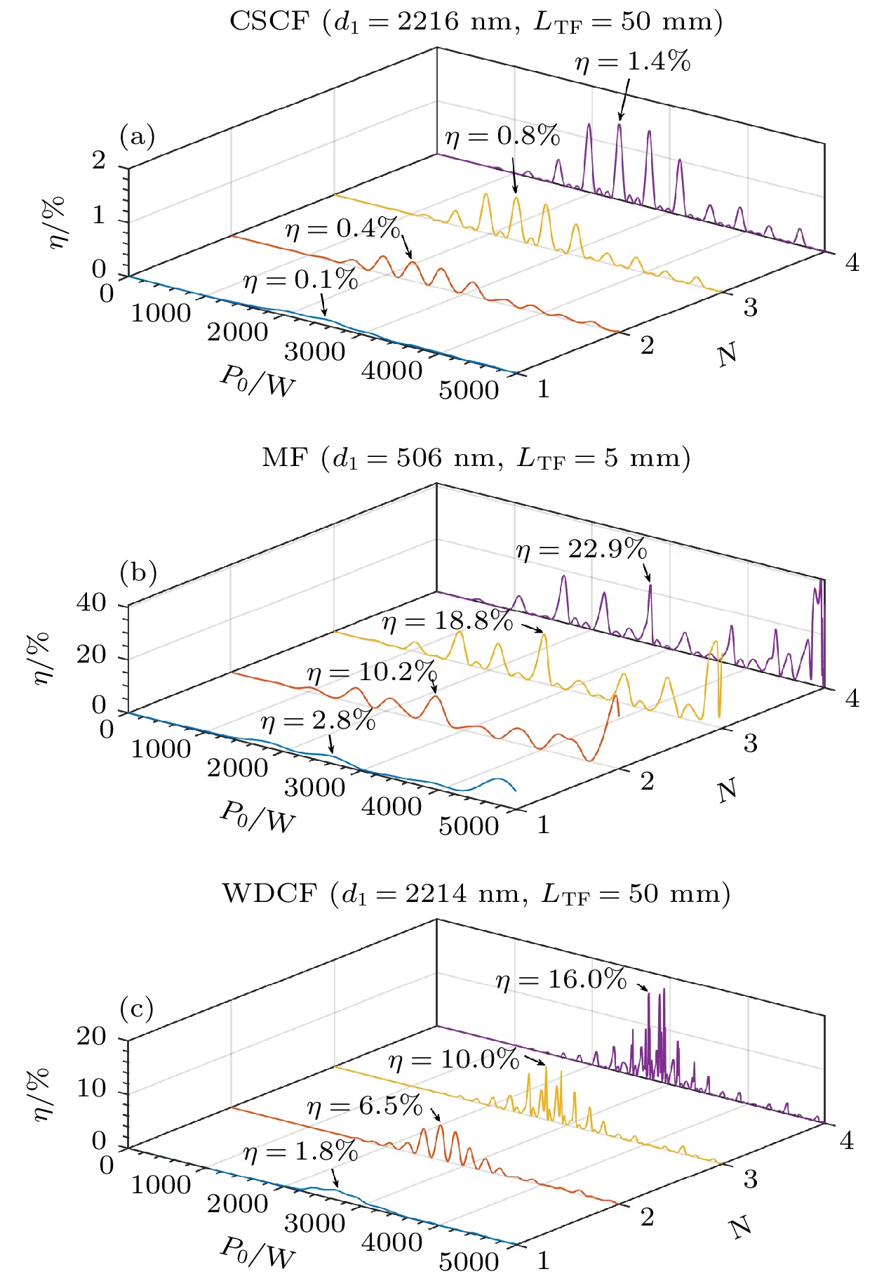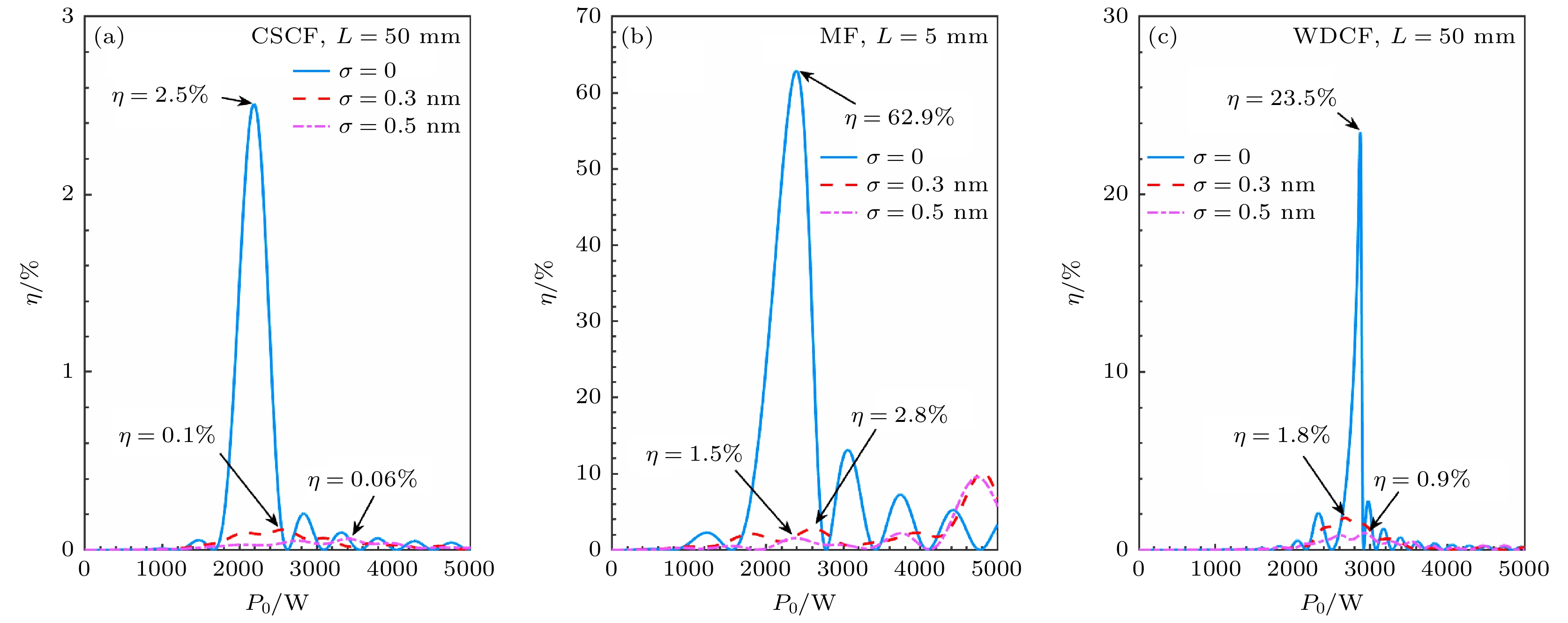 Ultraviolet fiber lasers are highly desired in different fields such as lithography, laser processing, optical communications, optical storage, and biomedicine. On the other hand, all-fiber frequency conversion technology is of great significance in scientific research and practical applications, as it provides an alternative to the current solutions based on nonlinear crystals. Developing special optical fibers with both suitable mechanical performance and conversion efficiency and reducing the difficulty in their preparing are the key challenges in bringing this novel technology into practical application. In this work, three step-index optical fibers with simple structure are designed, they being a conventional single-cladding fiber (CSCF) with high numerical aperture, a microfiber (MF), and a W-type double-cladding fiber (WDCF), and the third-harmonic generation in ultraviolet band is studied by using them, respectively. The fundamental (pump) wavelength used in this work is 1064 nm and the third-harmonic wavelength is 355 nm.In order to achieve good transmission in the ultraviolet band, the cores of all three optical fibers are designed to be made of pure silica glass, and the core diameters are determined according to the phase matching condition for the fundamental wave and the third harmonic, by solving the eigenvalue equations. The cladding of CSCF is fluorine-doped silica glass, and the cladding of MF is air; for WDCF, the inner cladding and outer cladding are fluorine-doped silica glass and fluoroplastics, respectively. Both the CSCF and the WDCF have solid cladding, and their core diameters can be greater than 2 μm, so they have adequate mechanical properties. In comparison, due to the air cladding and thin core (the core diameter has to be less than 1 μm for phase matching), the MF is fragile in structure and thus its mechanical performance is rather poor.The conversion efficiencies of these three fibers are investigated in detail, by solving numerically the coupled mode equations for the pump and the third harmonic with the Runge-Kutta method. The effect of random fiber roughness (i.e. core diameter fluctuation) and enhancement in conversion efficiency by cascading the fibers are also analyzed. The results show that the conversion efficiency in MF is the highest, with an efficiency of 2% for a 5-mm-long single MF segment and over 20% for cascaded MFs; however, MF requires strict fabrication accuracy, and the tolerance of core diameter is only ± 0.3 nm. The CSCF has the lowest conversion efficiency, which is 0.1% for a 50-mm-long single segment and at the level of about 1% after cascading, and the tolerance of core diameter is ± 1 nm. The conversion efficiency of WDCF is between those of CSCF and MF, nearly 2% with a 50-mm-long segment and about 16% when four such segments are cascaded; WDCF bears core diameter tolerance of ± 3 nm, which is three times that of CSCF and 10 times that of MF. Therefore, the W-type double-cladding fiber WDCF actually integrates the advantages of conventional single-cladding fiber CSCF and microfiber MF, showing both satisfactory mechanical performance and conversion efficiency, as well as reduced fabrication difficulty, which provides a promising solution for all-fiber third-harmonic generation in the ultraviolet band.