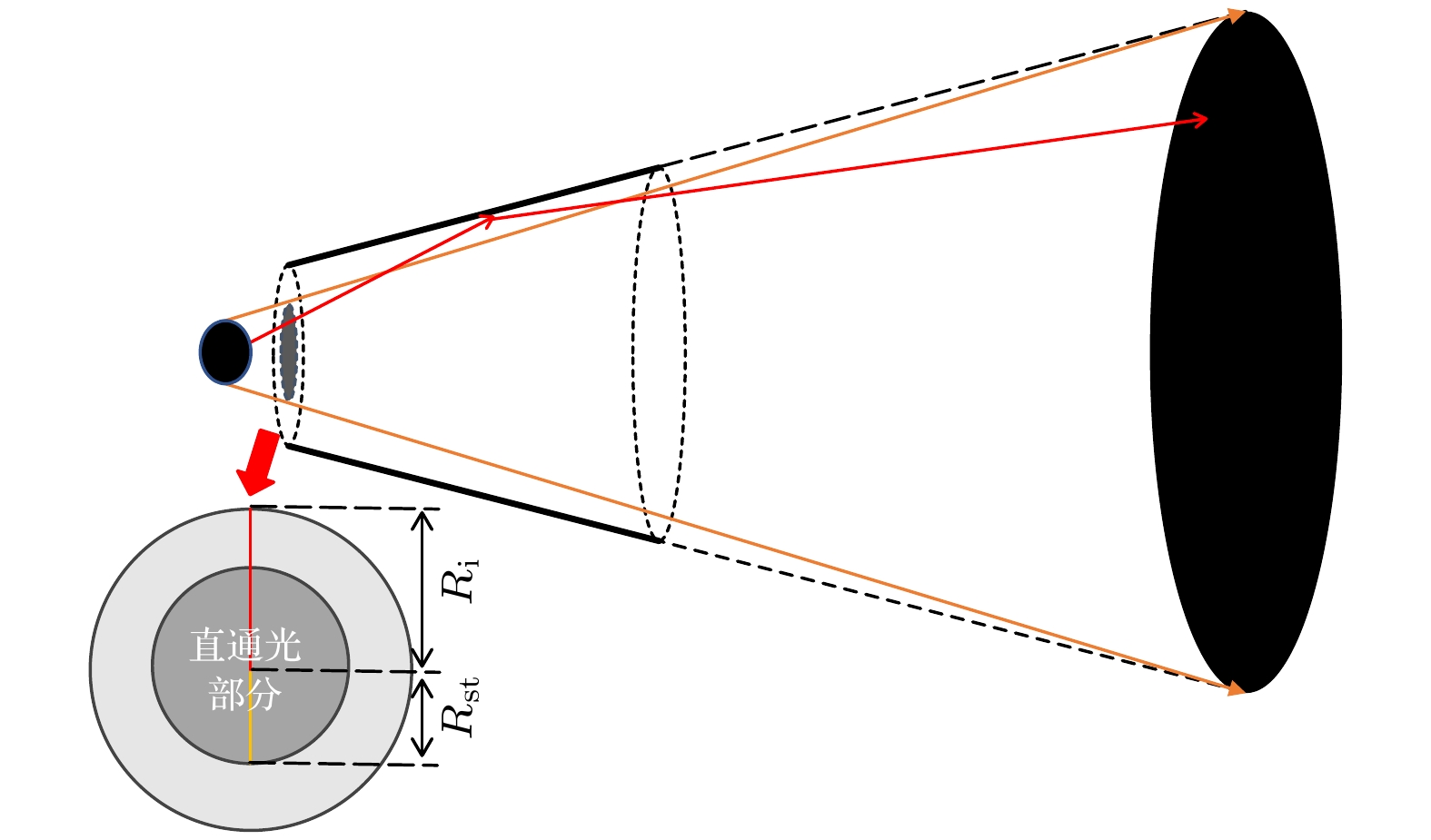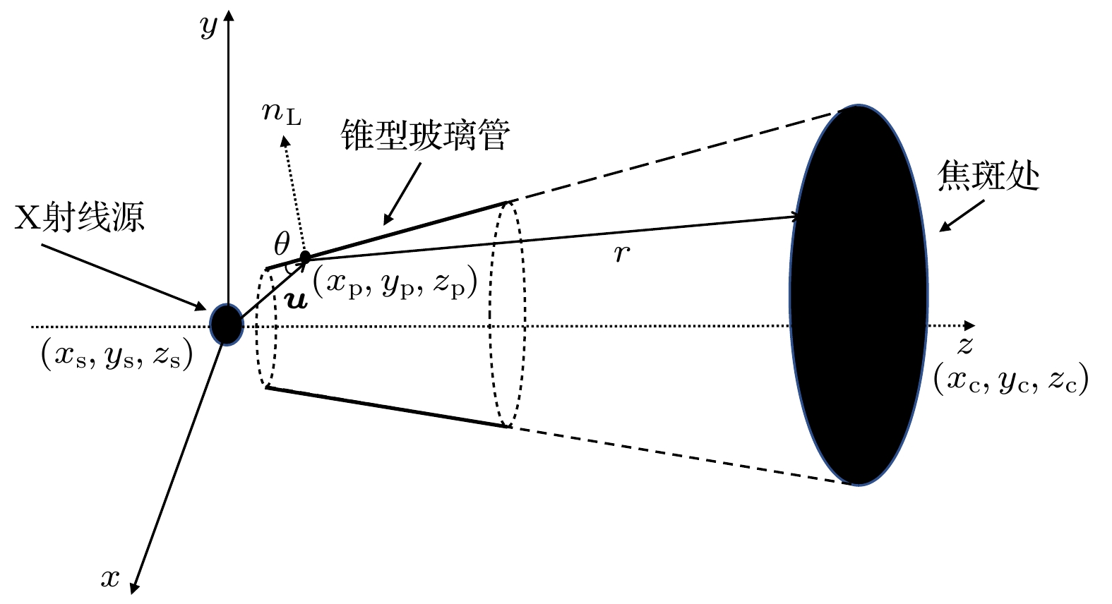 In high-energy density physics (HEDP) experiments, accurate diagnostics of physical parameters such as electron temperature, plasma density, and ionization state are essential for understanding matter behavior under extreme conditions. In these cases, X-ray spectroscopic technique, especially those using crystal spectrometers, is widely used to achieve high spectral resolution. However, a common challenge in such experiments lies in the inherent low brightness and poor spatial coherence of laboratory-based X-ray sources, which limit photon throughput, thus the diagnostic accuracy. Therefore, improving the X-ray optical transmission efficiency between the source and the detector is a key step to improve the performance of the whole system. Capillary X-ray optics, which function based on the principle of total internal reflection within hollow glass structures, provides a promising avenue for beam shaping, collimation, and focusing in the soft-to-hard X-ray range. These optical devices are usually divided into polycapillary type and monocapillary type. While polycapillary optics are composed of numerous micro-channels and used primarily for collimating or focusing divergent X-rays, monocapillary lenses—consisting of single curved channels—provide more precise beam control and are particularly suitable for customized X-ray pathways. Depending on the curvature of the inner reflective surface, monocapillaries are classified into conical, parabolic, and ellipsoidal geometries. In this study, we propose and analyze a novel design of a large-caliber conical glass tube, specifically tailored to address the issue of low light utilization in multi-channel focusing spectrographs with spatial resolution (FSSR). The proposed conical glass tube is made of a single large-diameter capillary structure, simplifying alignment requirements and reducing the surface manufacturing precision typically required by complex aspheric lenses. Its geometric configuration enables X-rays from extended or weak sources to be redirected and controlled to convergef, thereby improving photon collection without significantly altering beam divergence. To quantify the performance of this optical system, we develop a detailed mathematical ray-tracing model and implement it in MATLAB. The model combines physical parameters such as capillary inner diameter, taper angle, reflection loss, and source-detector geometry. Numerical simulations show that compared with traditional flat or slit based systems, the new conical design improves source utilization efficiency by 3.1 times. Furthermore, the lens exhibits a ring-shaped enhancement region in the output intensity profile, which can be regulated by adjusting the capillary geometry and source positioning. This feature enables the spatial customization of the beam profile, thereby facilitating optimized coupling with downstream spectroscopic components or imaging systems. In conclusion, the proposed large-aperture conical monocapillary X-ray lens provides a practical and efficient solution for enhancing X-ray optical transport in low-brightness source environments. Its simple construction, tunable focusing characteristics, and compatibility with diverse X-ray source types make it a compelling candidate for integration into a high-resolution X-ray diagnostic system, particularly in HEDP and laboratory-scale X-ray spectroscopy. This work not only introduces a novel optical approach but also provides a robust theoretical and simulation framework for guiding future experimental design and application of capillary-based X-ray optics.
