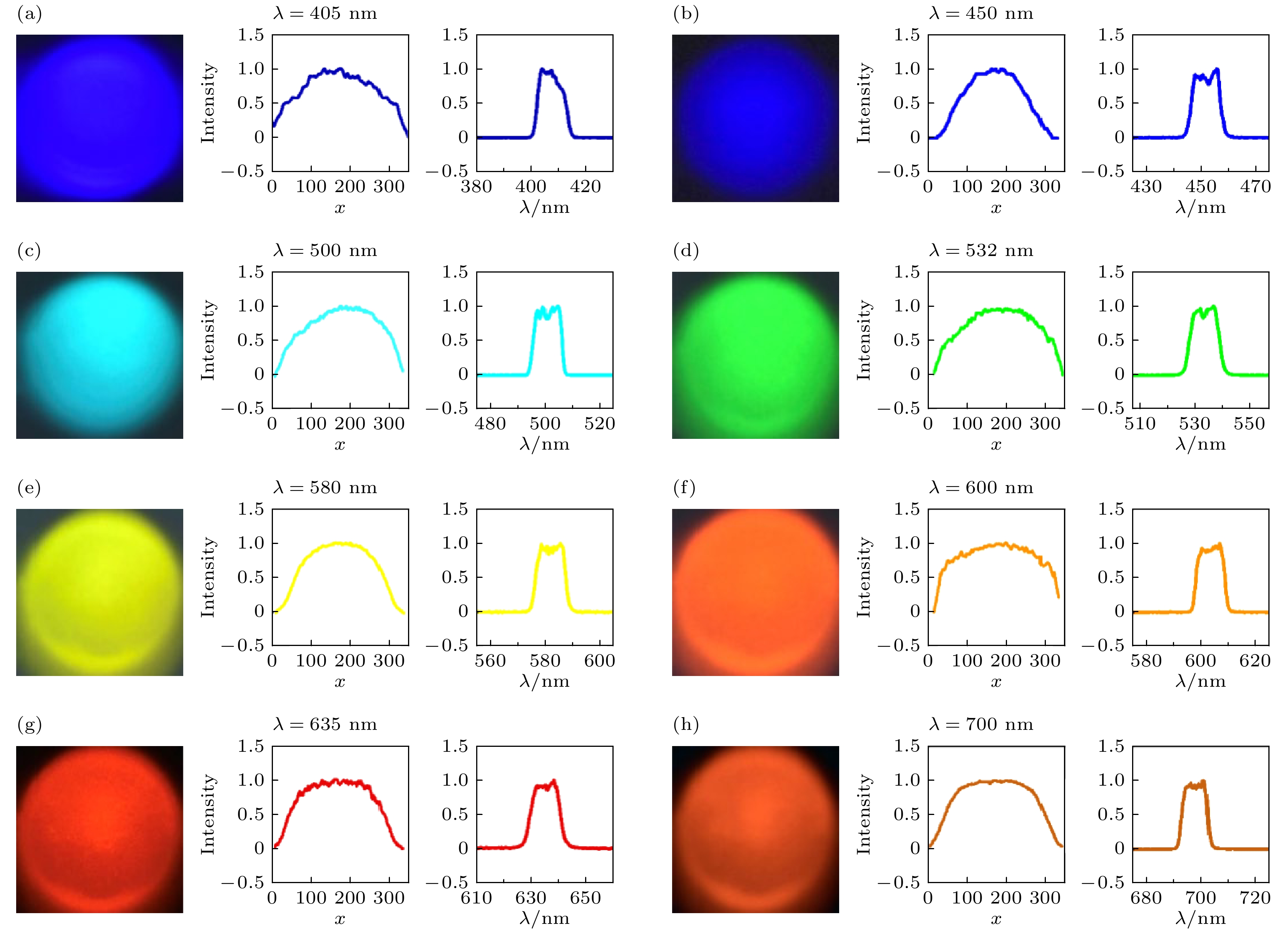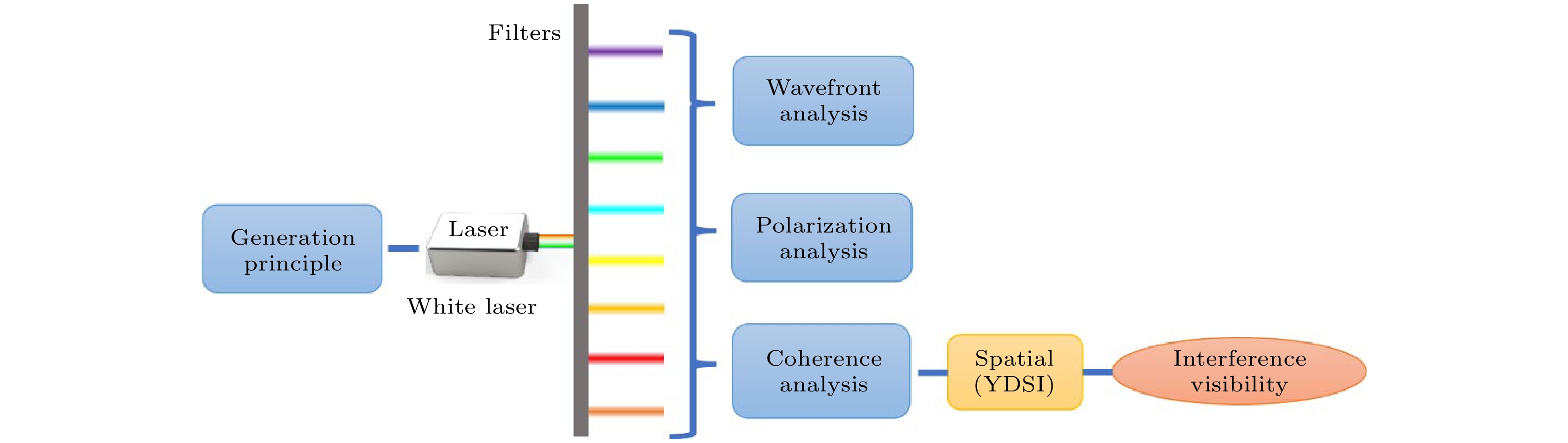 White light is typically considered incoherent; however, the recently popular supercontinuum laser, also known as white laser, spans the visible spectrum and features high laser intensity and good coherence, challenging this traditional limitation. The white laser has a wide range of applications, including multi-channel confocal microscopy, color holography, and white light interferometric surface topography. Although white lasers have been proposed and developed extensively in terms of technology, specific analyses of their optical wave properties—especially spatial coherence—are still lacking. Since many applications impose certain requirements on the spatial coherence of white light, the lack of research into the spatial coherence of white lasers has, to some extent, limited their practical use.This paper presents a detailed experimental study and analysis of the wavefront intensity, polarization characteristics, and spatial coherence of the high-intensity ultra-flat spectrum white laser that was independently developed by our research group in 2023. The laser is generated by broadening the spectrum of a high-intensity Ti:sapphire femtosecond laser through second- and third-order nonlinear effects.A bandpass filter is used to extract eight components from the white laser, with a central wavelength range from 405 nm to 700 nm and a bandwidth of 10 nm for each component. By measuring the performance of these eight quasi-monochromatic lasers, the characteristics of the white laser of the entire visible spectrum can be evaluated.The CCD imaging of the collimated quasi-monochromatic laser spots reveals that their wavefront intensities exhibit a quasi-Gaussian distribution with uniform beam profiles. Polarization measurements by using polarizers at various angles show that the white laser is linearly polarized. A Young’s double-slit interferometer is used to measure the interference fringe contrast of the eight quasi-monochromatic beams to assess their spatial coherence. The experimental results show that the average interference fringe contrast of the entire visible spectrum is 0.77, and the difference between different wavelengths is very small.This indicates that the white laser has excellent spatial coherence in the visible range.The eight quasi-monochromatic lasers in the visible spectrum all exhibit quasi-Gaussian wavefront intensity distributions, linear polarization, and high spatial coherence. This indicates that the white laser inherits the excellent properties of the Ti:sapphire laser. All of these data provide valuable guidance for the application of white lasers in color holography, white light interferometric surface tomography, microscopic imaging, and other fields that require white light with a certain degree of coherence.