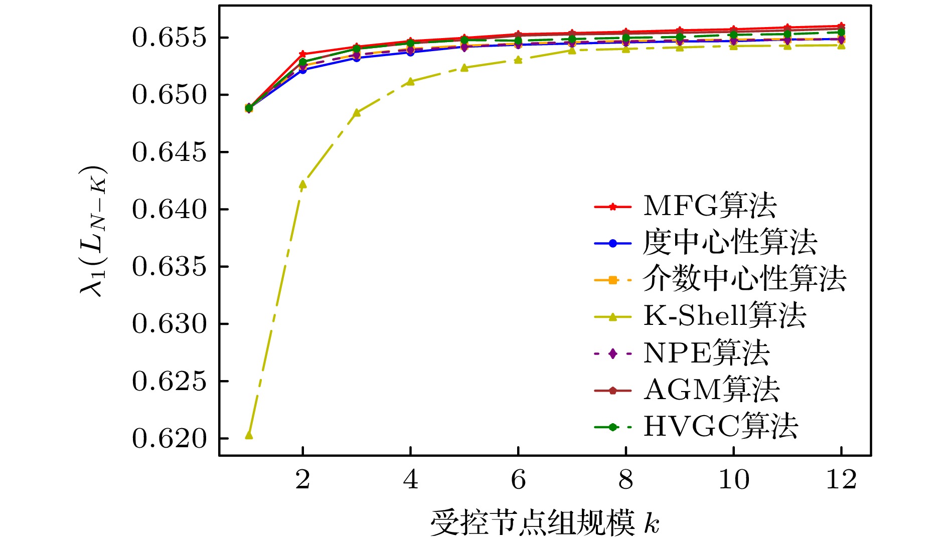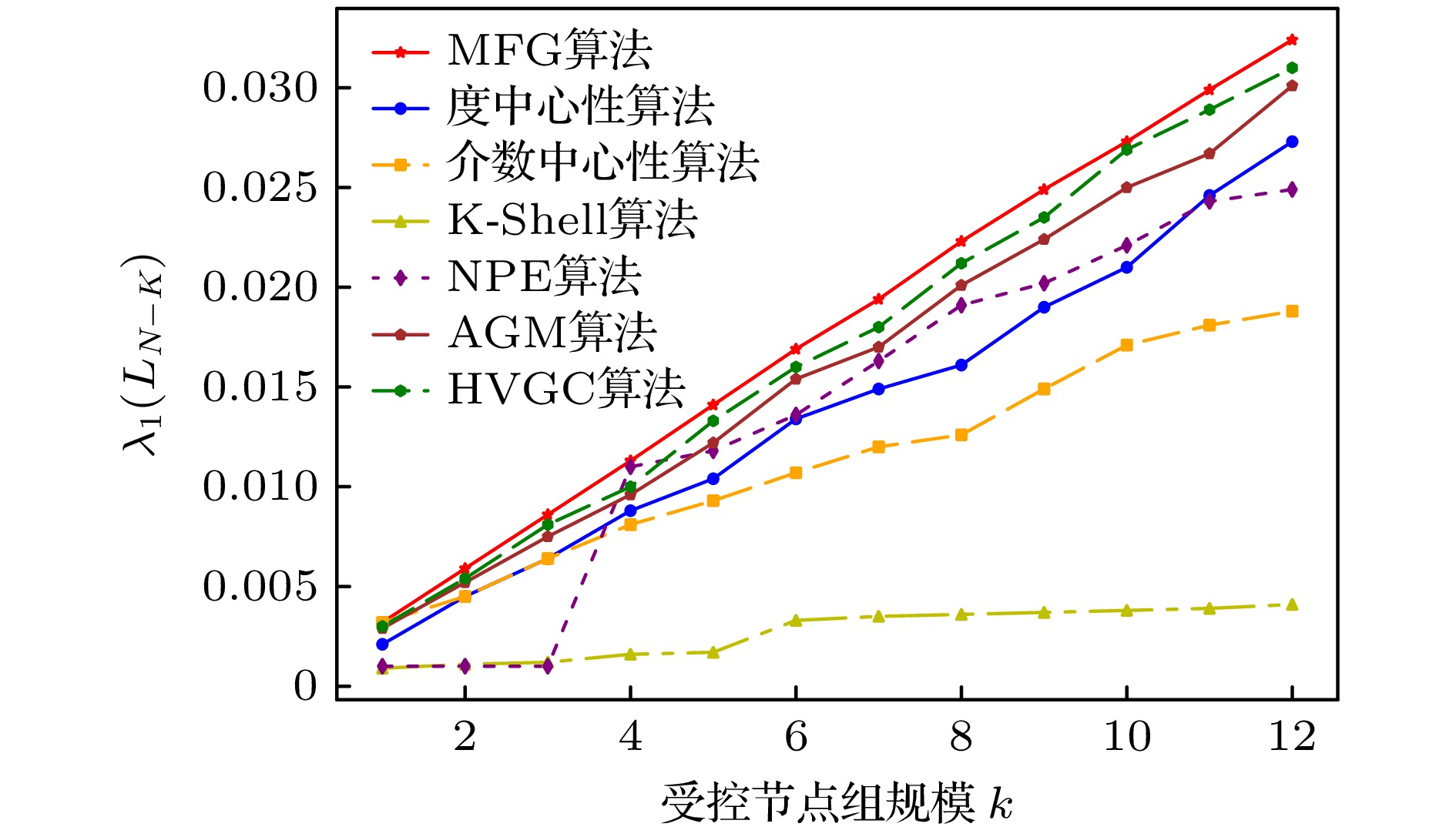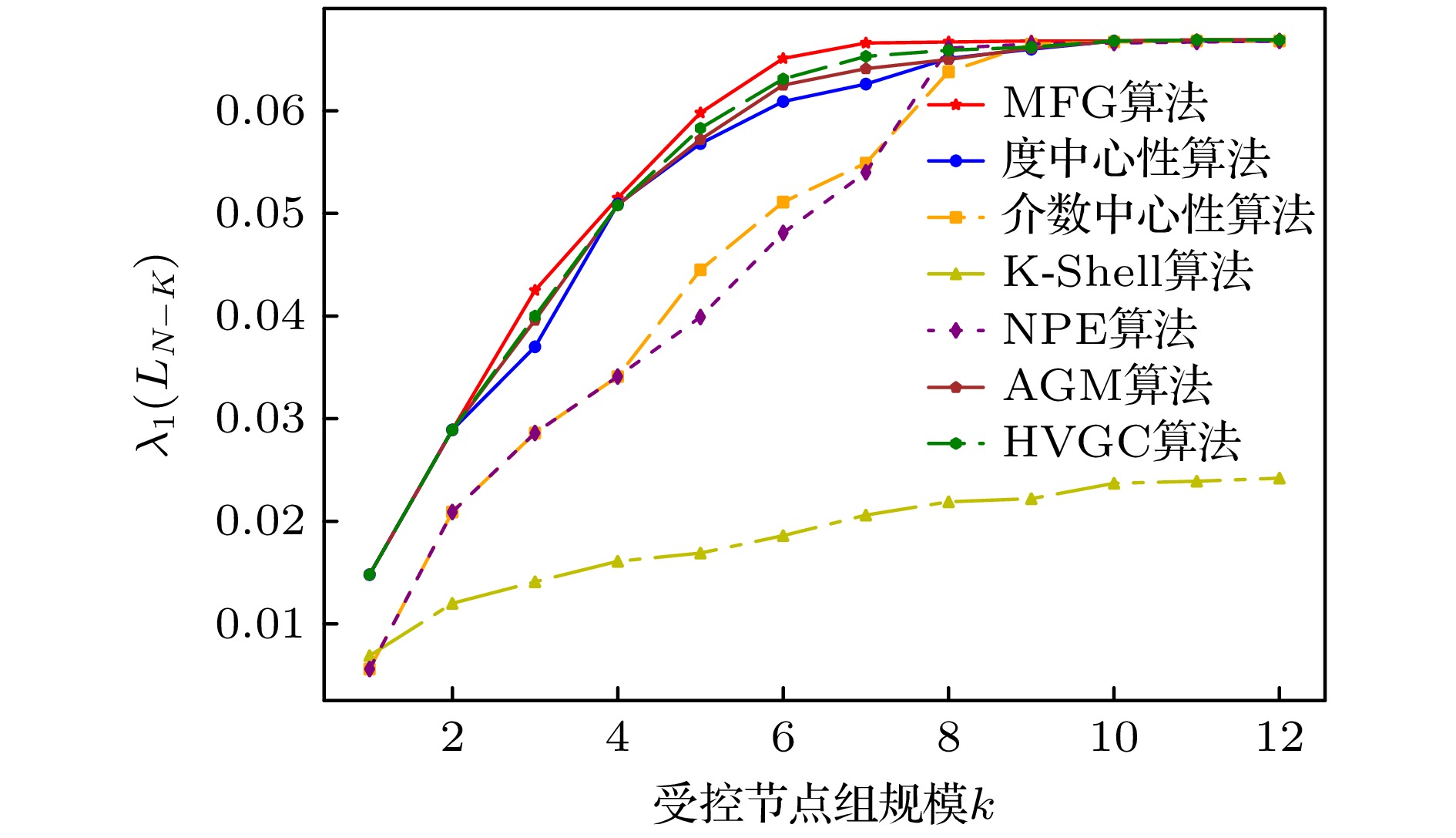 100004 3.73196 × 1015 8 7.46392 × 1016 12 1.11959 × 1017 受控节点组规模k 度中心性算法 介数中心性算法 K-Shell算法 NPE算法 AGM算法 HVGC算法 MFG算法 1 0.0021 0.0032 0.0009 0.0010 0.0029 0.0030 0.0032 2 0.0045 0.0045 0.0011 0.0010 0.0052 0.0054 0.0059 3 0.0064 0.0064 0.0012 0.0010 0.0075 0.0081 0.0086 4 0.0088 0.0081 0.0016 0.0110 0.0096 0.0100 0.0113 5 0.0104 0.0093 0.0017 0.0118 0.0122 0.0133 0.0141 6 0.0134 0.0107 0.0033 0.0136 0.0154 0.0160 0.0169 7 0.0149 0.0120 0.0035 0.0163 0.0170 0.0180 0.0194 8 0.0161 0.0126 0.0036 0.0191 0.0201 0.0212 0.0223 9 0.0190 0.0149 0.0037 0.0202 0.0224 0.0235 0.0249 10 0.0210 0.0171 0.0038 0.0221 0.0250 0.0269 0.0273 11 0.0246 0.0181 0.0039 0.0243 0.0267 0.0289 0.0299 12 0.0273 0.0188 0.0041 0.0249 0.0301 0.0310 0.0324 度中心