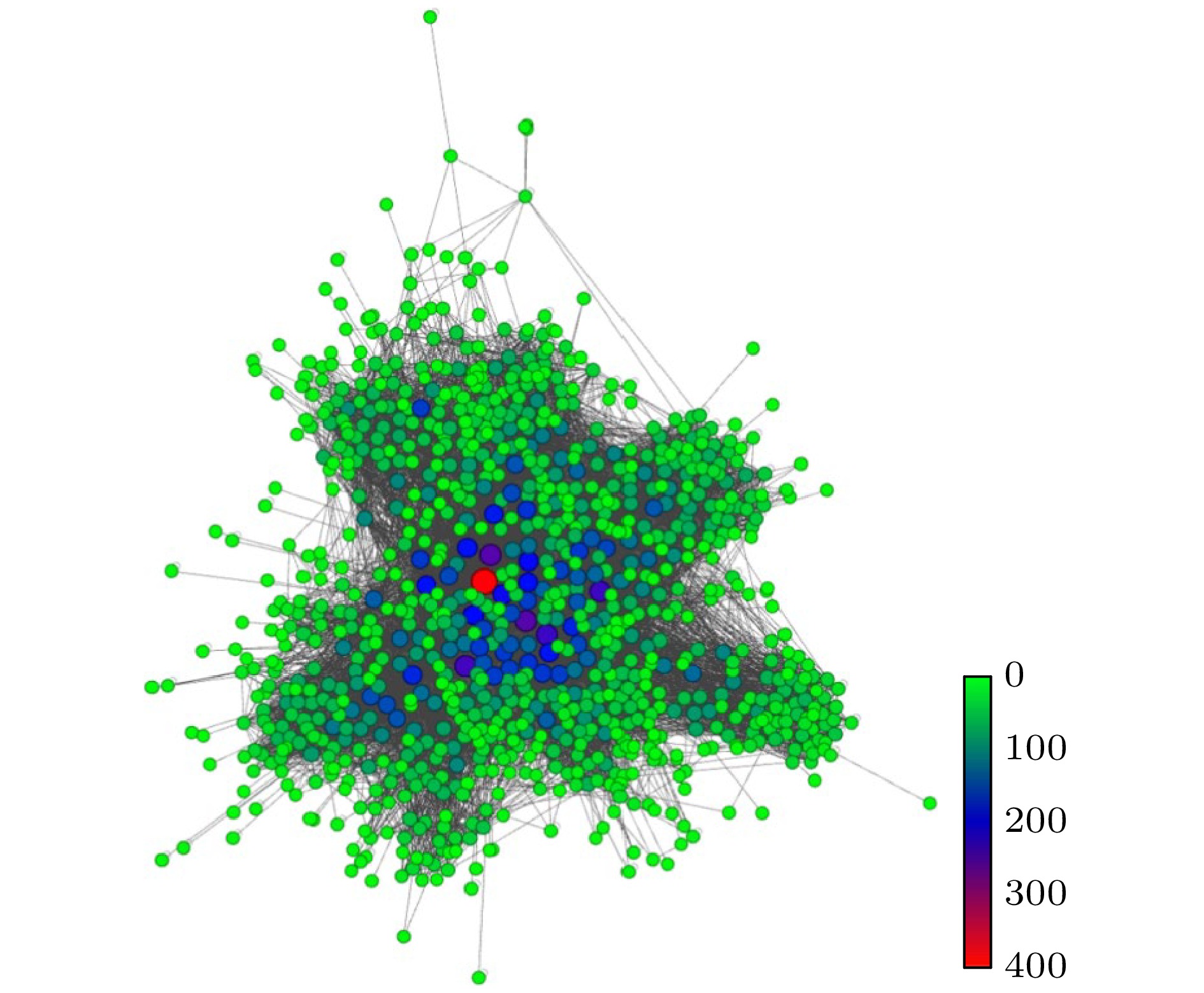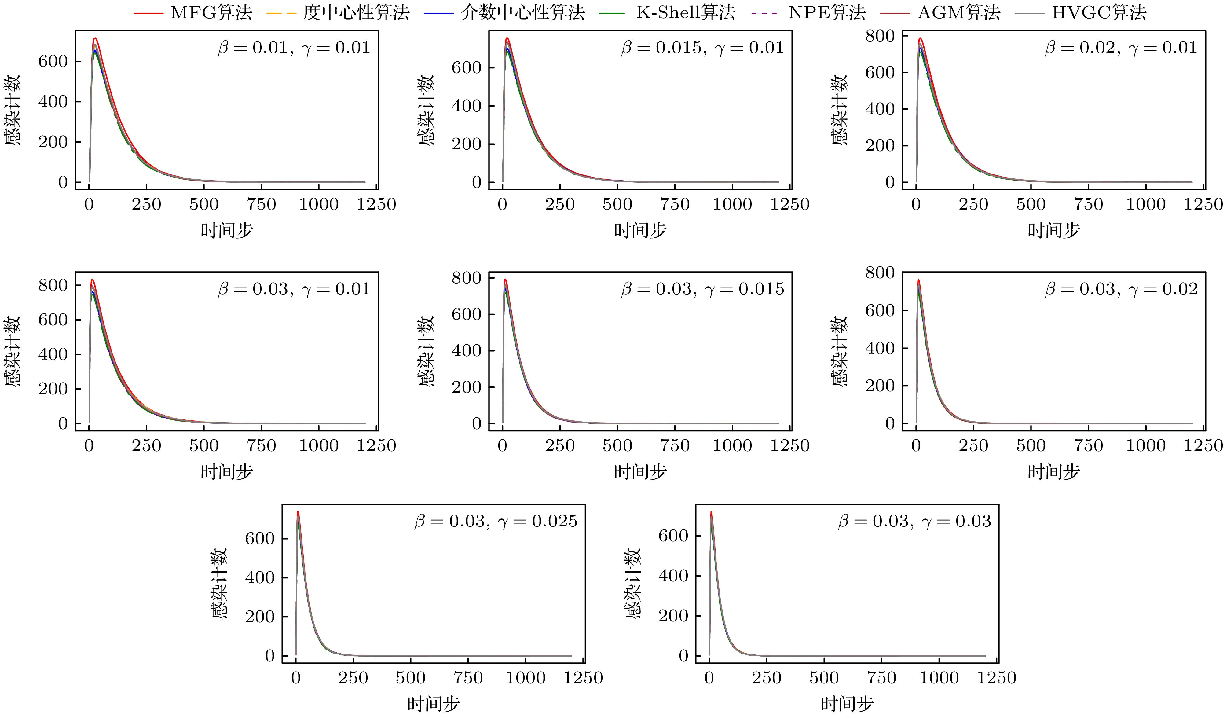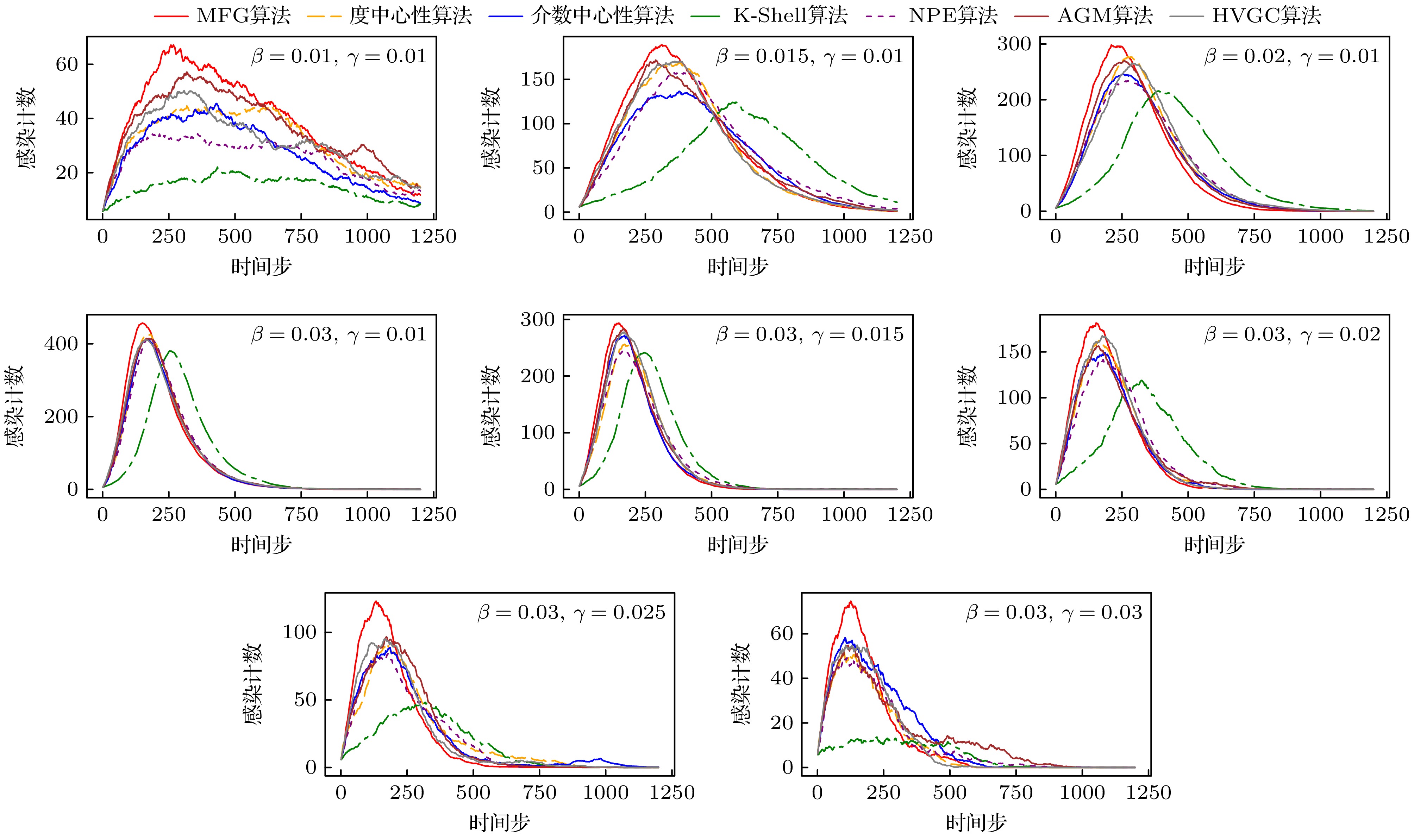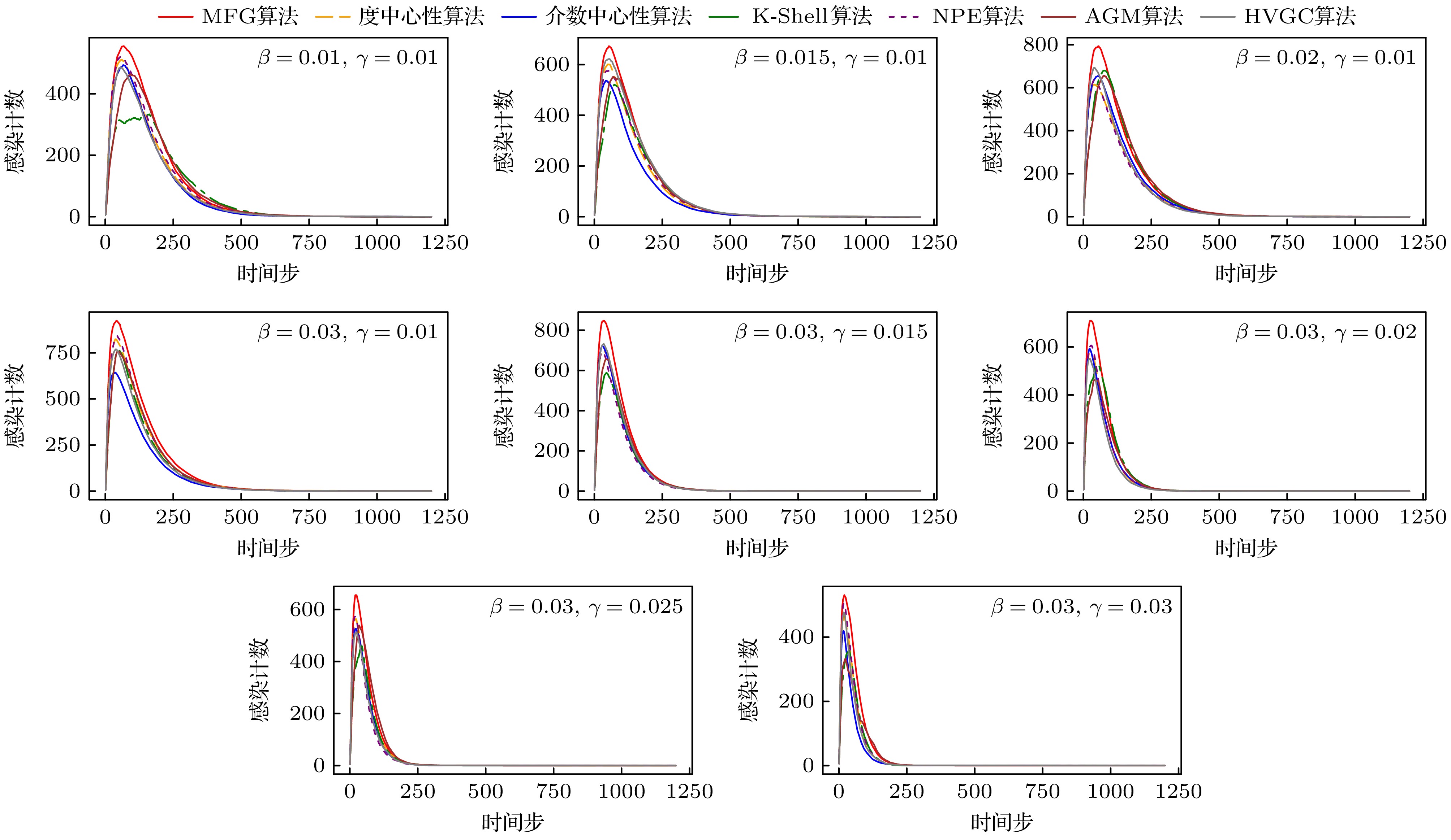 100004 3.73196 × 1015 8 7.46392 × 1016 12 1.11959 × 1017 受控节点组规模k 度中心性算法 介数中心性算法 K-Shell算法 NPE算法 AGM算法 HVGC算法 MFG算法 1 0.0021 0.0032 0.0009 0.0010 0.0029 0.0030 0.0032 2 0.0045 0.0045 0.0011 0.0010 0.0052 0.0054 0.0059 3 0.0064 0.0064 0.0012 0.0010 0.0075 0.0081 0.0086 4 0.0088 0.0081 0.0016 0.0110 0.0096 0.0100 0.0113 5 0.0104 0.0093 0.0017 0.0118 0.0122 0.0133 0.0141 6 0.0134 0.0107 0.0033 0.0136 0.0154 0.0160 0.0169 7 0.0149 0.0120 0.0035 0.0163 0.0170 0.0180 0.0194 8 0.0161 0.0126 0.0036 0.0191 0.0201 0.0212 0.0223 9 0.0190 0.0149 0.0037 0.0202 0.0224 0.0235 0.0249 10 0.0210 0.0171 0.0038 0.0221 0.0250 0.0269 0.0273 11 0.0246 0.0181 0.0039 0.0243 0.0267 0.0289 0.0299 12 0.0273 0.0188 0.0041 0.0249 0.0301 0.0310 0.0324 度中心