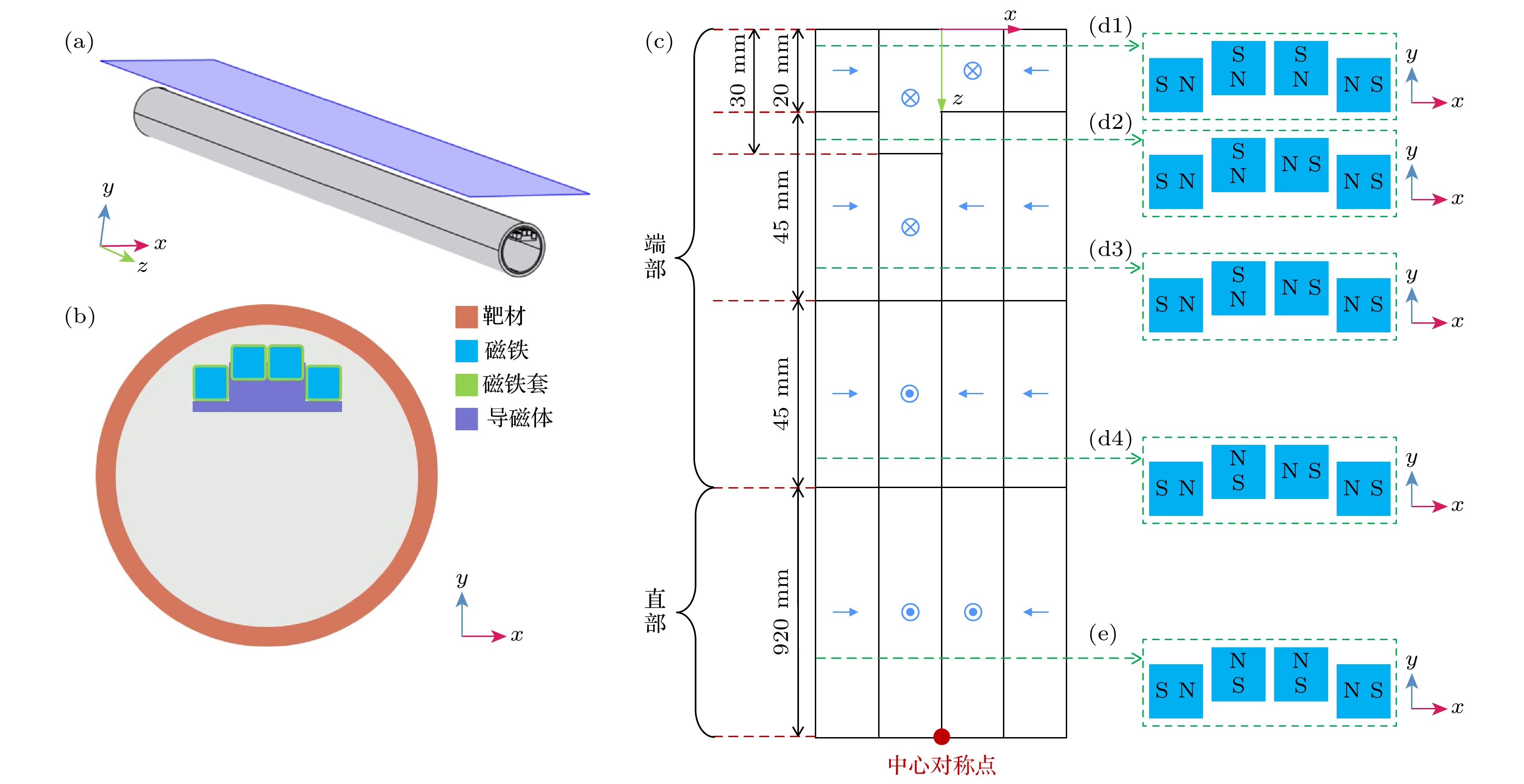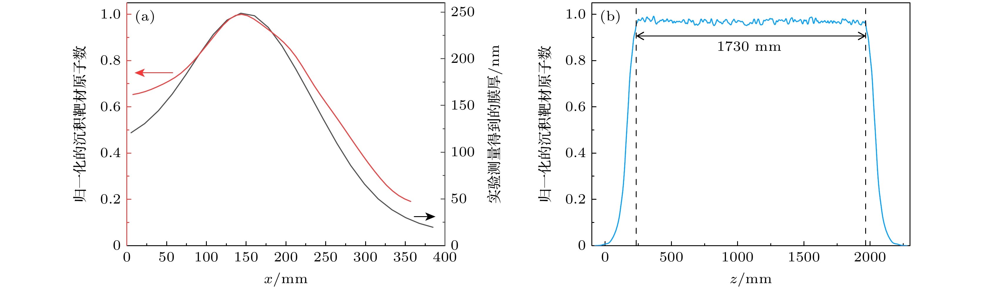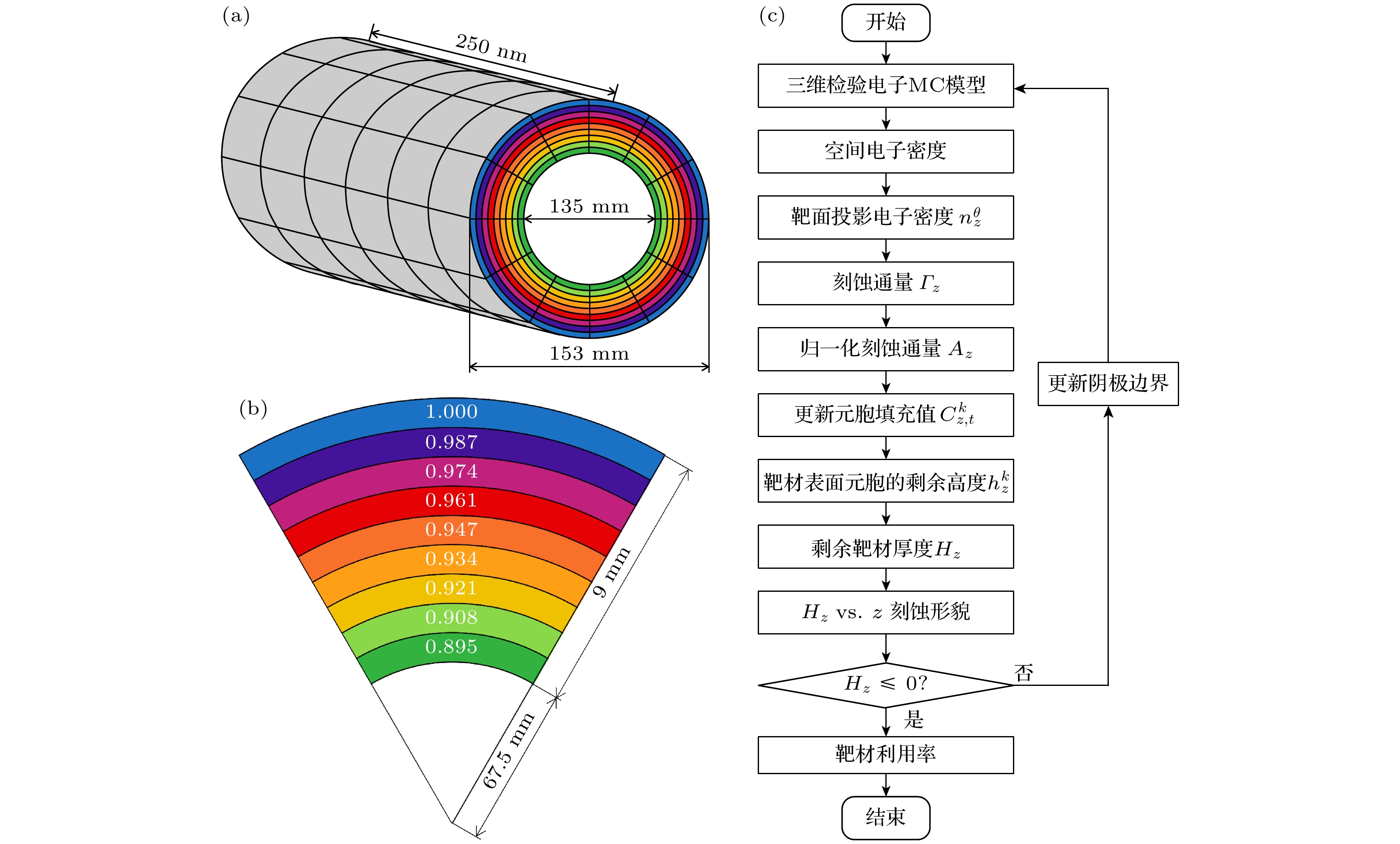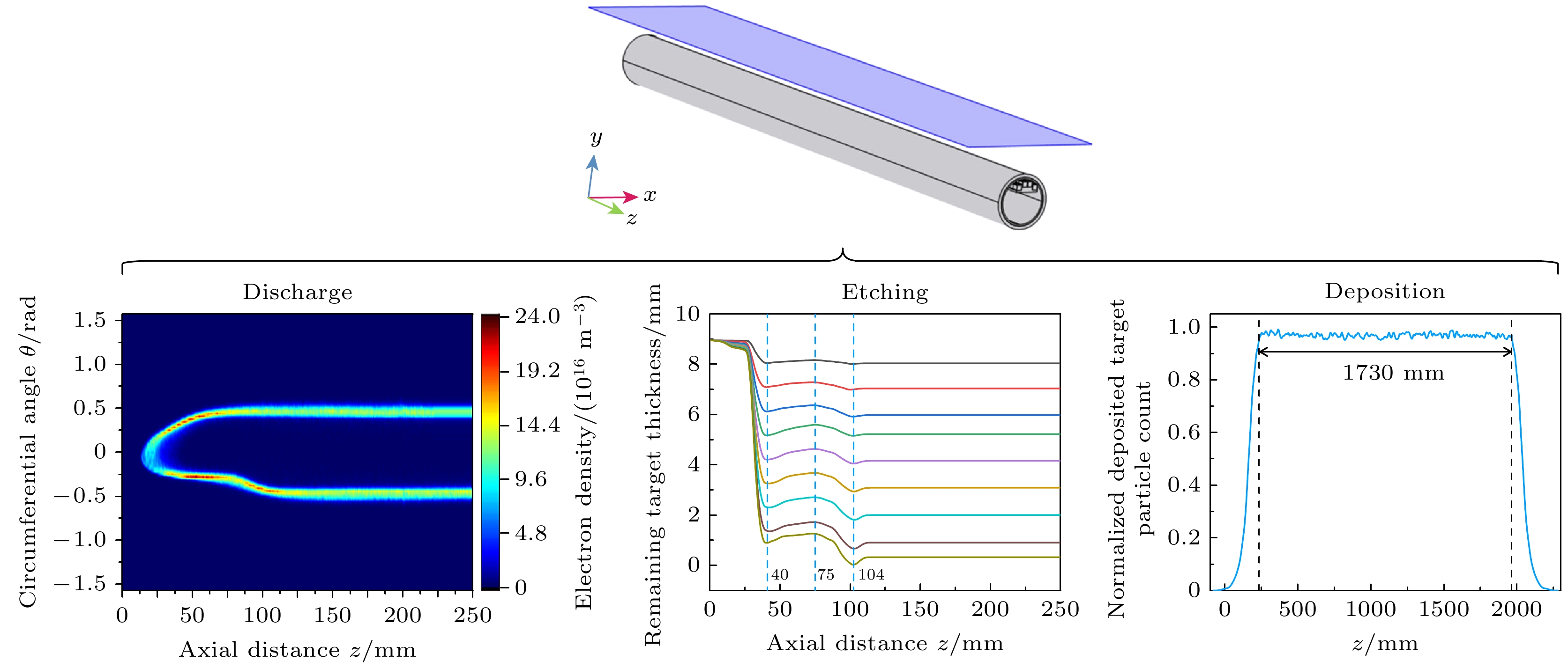 Rotating cylindrical cathodes possess high theoretical target utilization rates and have been widely used in thin film deposition in various industries. Regarding plasma research, the plasma discharge and transport processes of rotating cylindrical cathodes involve three-dimensional systems, unlike those of planar cathodes. Traditional plasma models applied to these systems require a large quantity of computational resources and have poor convergence, making simulation difficult. In this context, the plasma density and electric potential distributions are calculated by a two-dimensional particle-in-cell/Monte Carlo collision (PIC/MCC) model, and they are used as a self-consistent background field in this work. Furthermore, a three-dimensional electron Monte Carlo method is used to track electron motion, so that three-dimensional plasma discharge simulation can be performed. On this basis, using plasma density projection as the etching flux and the cellular automata method, the rotational etching process of the cylindrical cathode is decomposed into stepwise micro-element static etching, thereby achieving three-dimensional etching behavior simulation. Subsequently, the etched target morphology is equivalently treated as the emission flux of In and Sn atoms, and a three-dimensional test particle Monte Carlo method is employed to trace their motion, realizing three-dimensional particle deposition simulation. Thus, a comprehensive three-dimensional simulation system is constructed through incorporating the cathode magnetic field, plasma discharge, target etching, and thin-film deposition into a complete simulation chain. The results indicate that this three-dimensional simulation system can accurately predict the operating conditions of cylindrical cathodes. The plasma stably accumulates on the cylindrical cathode surface, forming a three-dimensional discharge race track. The simulated etching profile is consistent with experimental result, showing the precise matching of the feature points with the residual thickness of the target. The utilization rate of the target material is 85.81%, with an error of less than 2% compared with that of the measurement. The molar ratio of In/Sn on the substrate is 11.76, with an error of 6.6% compared with the results measured by energy dispersive spectroscopy. The particle distribution on the substrate matches the actual film thickness distribution, with a uniform deposition length of 1730 mm, representing an error of only 1.1% compared with corresponding actual value.