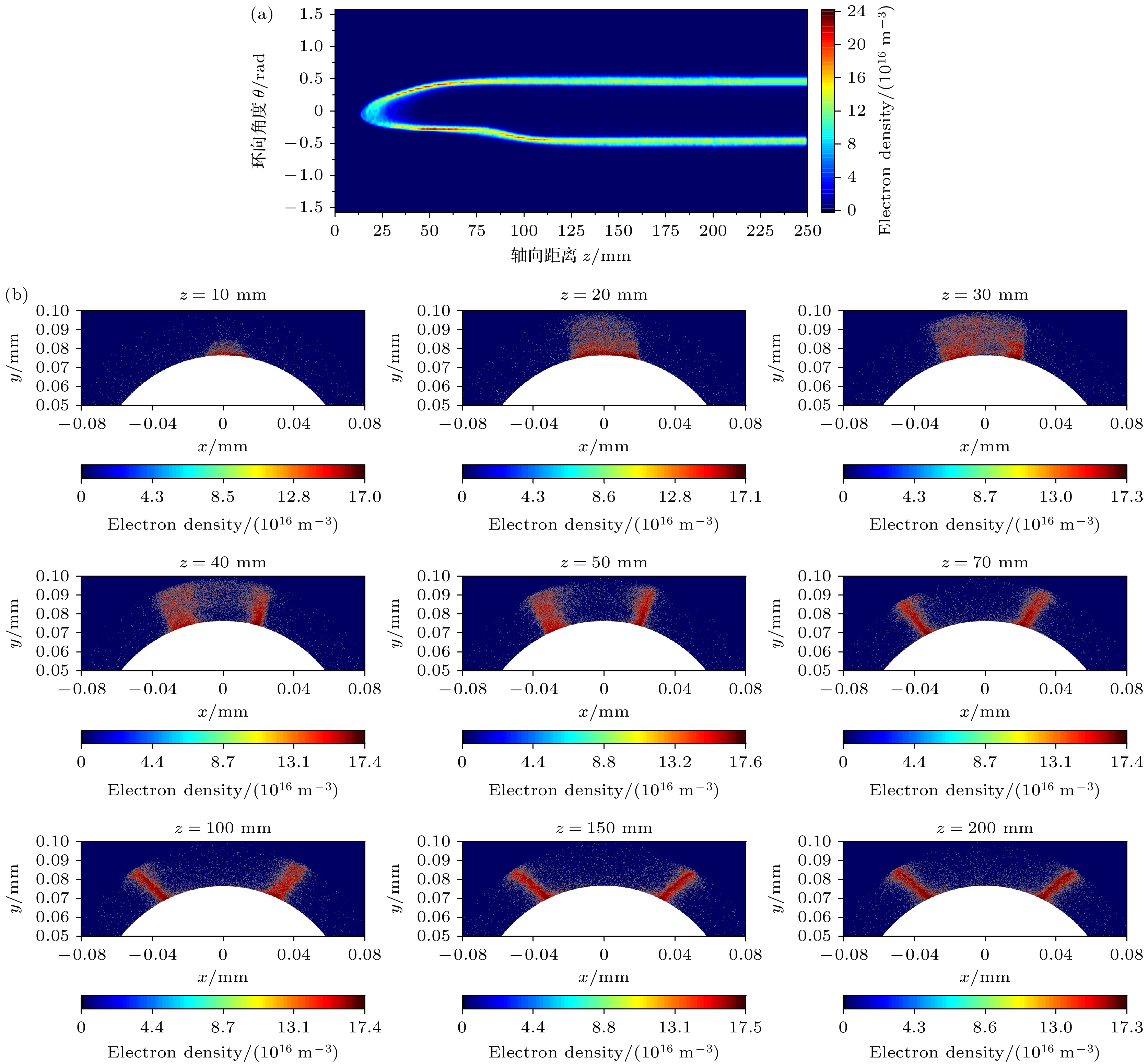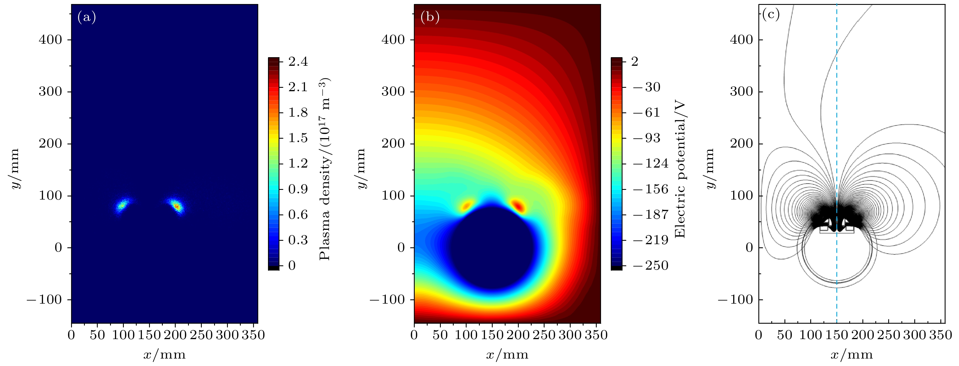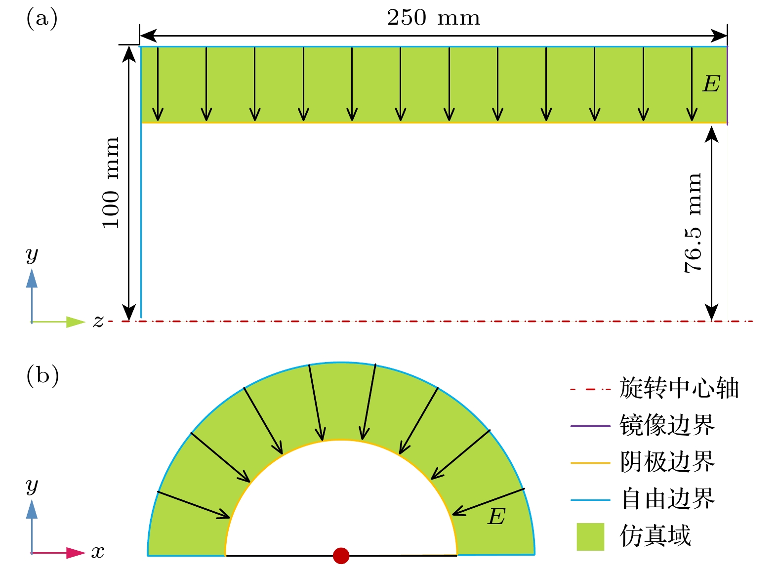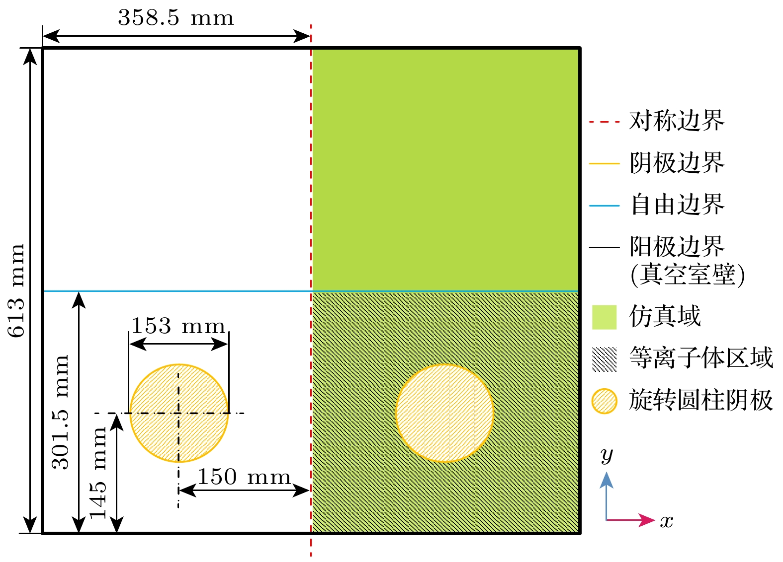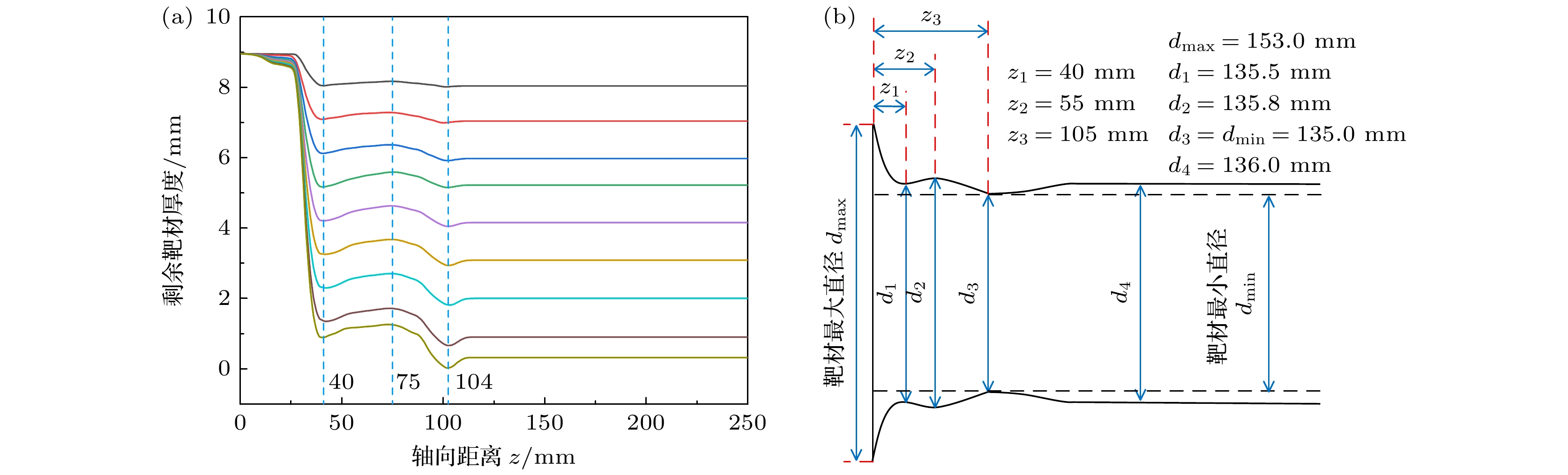 Rotating cylindrical cathodes possess high theoretical target utilization rates and have been widely used in thin film deposition in various industries. Regarding plasma research, the plasma discharge and transport processes of rotating cylindrical cathodes involve three-dimensional systems, unlike those of planar cathodes. Traditional plasma models applied to these systems require a large quantity of computational resources and have poor convergence, making simulation difficult. In this context, the plasma density and electric potential distributions are calculated by a two-dimensional particle-in-cell/Monte Carlo collision (PIC/MCC) model, and they are used as a self-consistent background field in this work. Furthermore, a three-dimensional electron Monte Carlo method is used to track electron motion, so that three-dimensional plasma discharge simulation can be performed. On this basis, using plasma density projection as the etching flux and the cellular automata method, the rotational etching process of the cylindrical cathode is decomposed into stepwise micro-element static etching, thereby achieving three-dimensional etching behavior simulation. Subsequently, the etched target morphology is equivalently treated as the emission flux of In and Sn atoms, and a three-dimensional test particle Monte Carlo method is employed to trace their motion, realizing three-dimensional particle deposition simulation. Thus, a comprehensive three-dimensional simulation system is constructed through incorporating the cathode magnetic field, plasma discharge, target etching, and thin-film deposition into a complete simulation chain. The results indicate that this three-dimensional simulation system can accurately predict the operating conditions of cylindrical cathodes. The plasma stably accumulates on the cylindrical cathode surface, forming a three-dimensional discharge race track. The simulated etching profile is consistent with experimental result, showing the precise matching of the feature points with the residual thickness of the target. The utilization rate of the target material is 85.81%, with an error of less than 2% compared with that of the measurement. The molar ratio of In/Sn on the substrate is 11.76, with an error of 6.6% compared with the results measured by energy dispersive spectroscopy. The particle distribution on the substrate matches the actual film thickness distribution, with a uniform deposition length of 1730 mm, representing an error of only 1.1% compared with corresponding actual value.