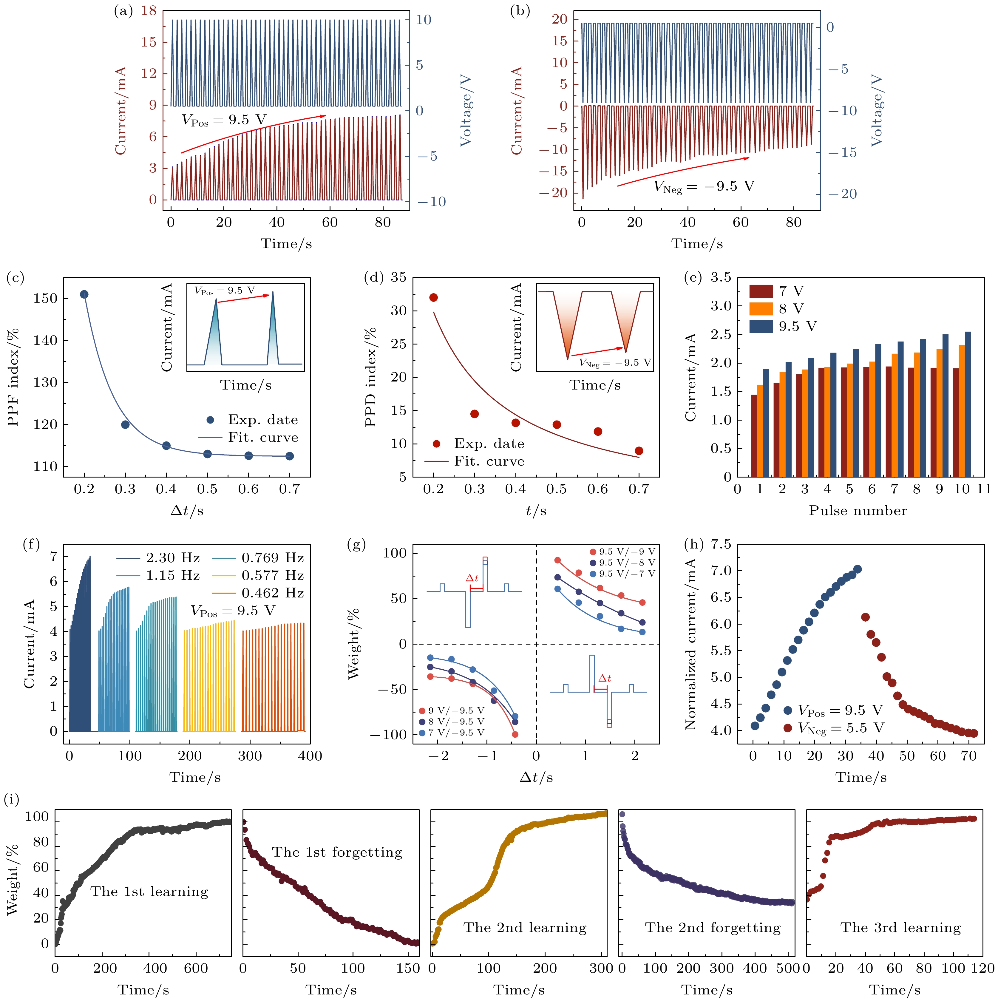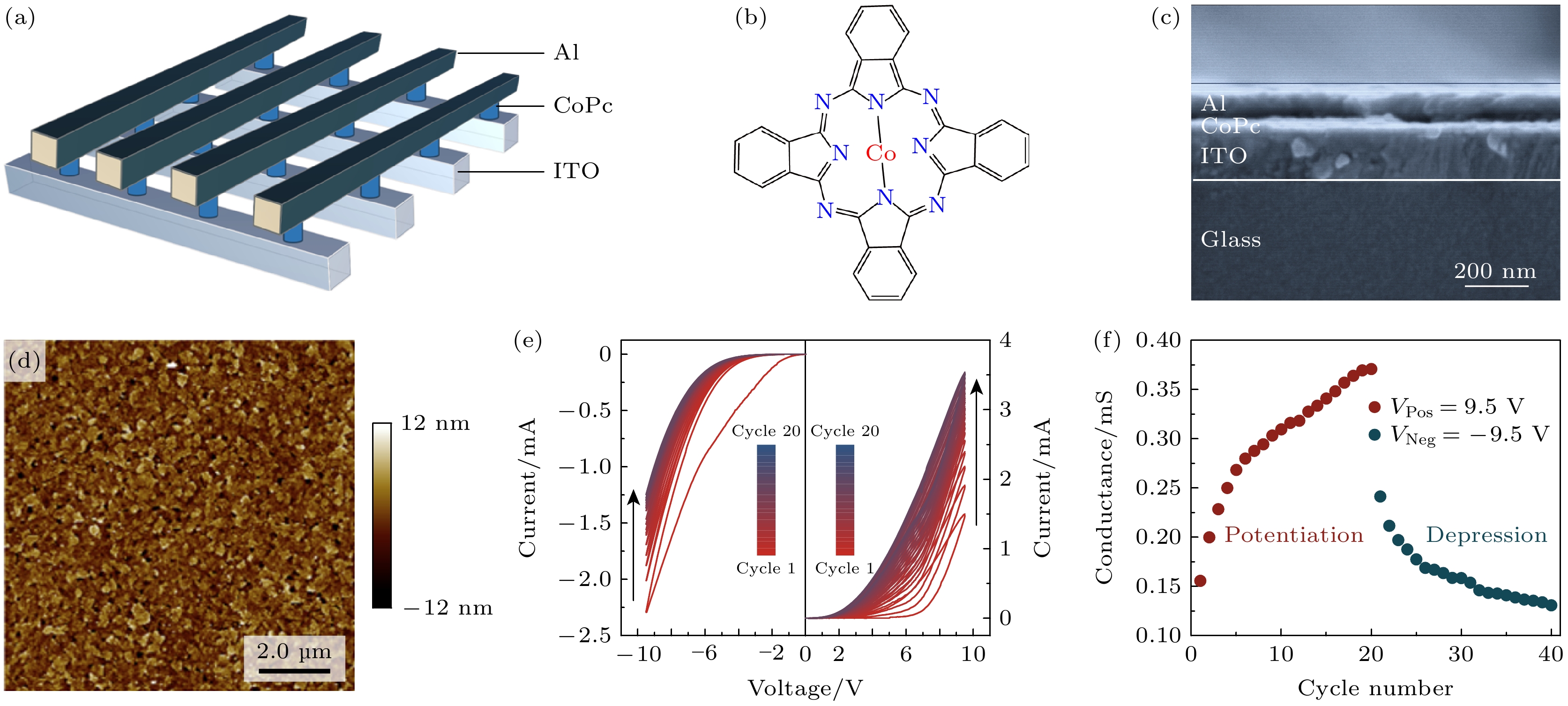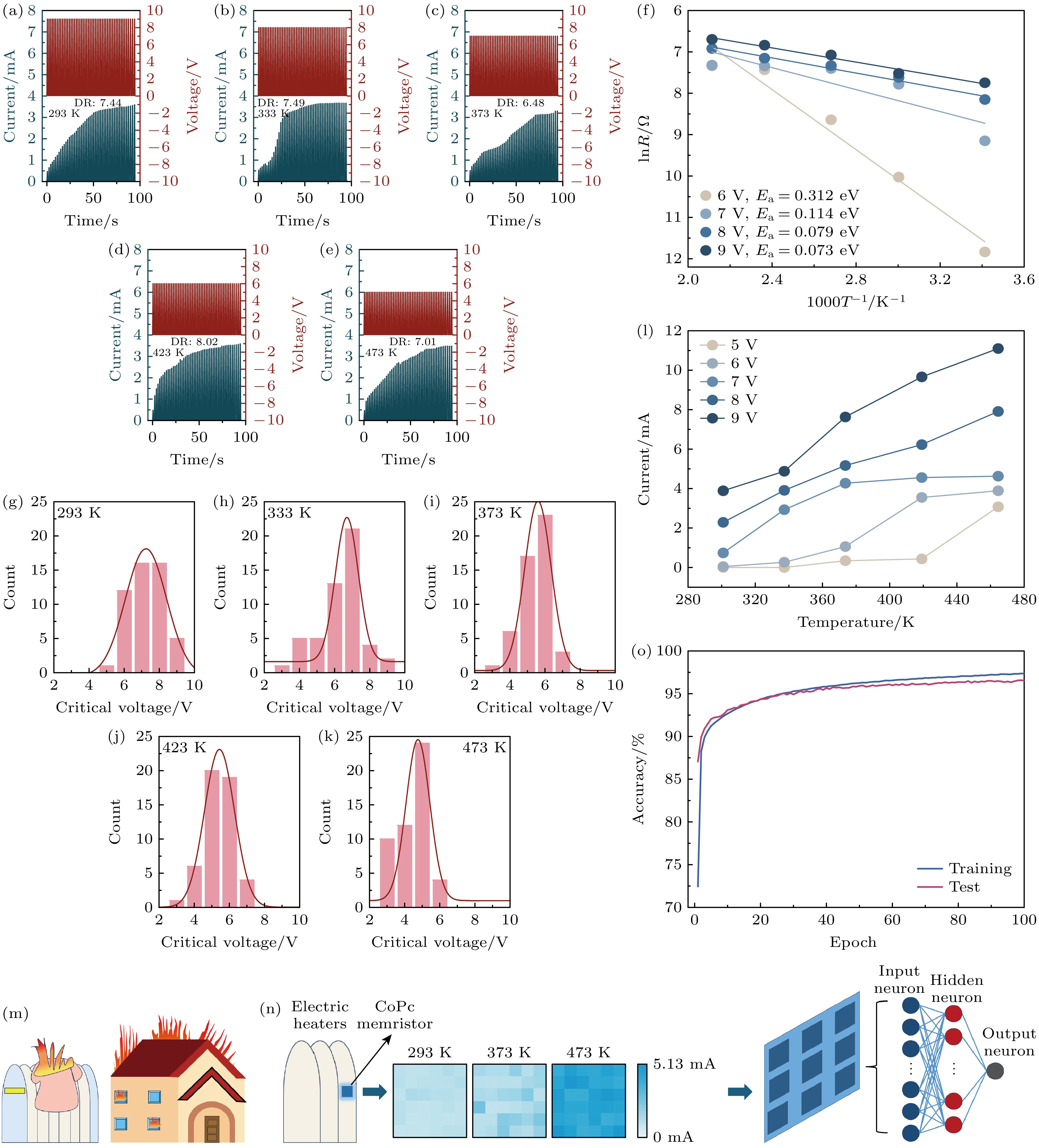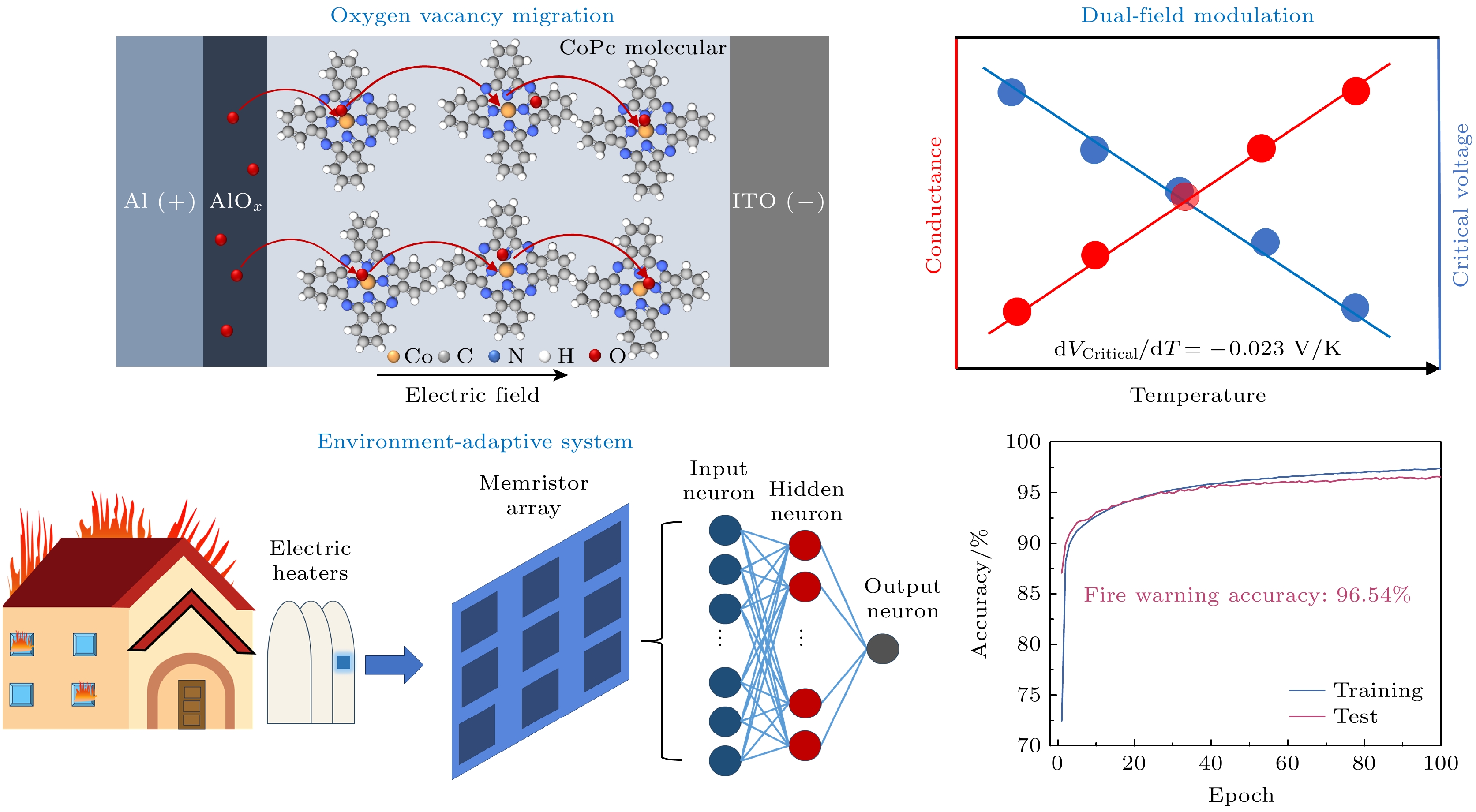 Memristor-driven neuromorphic computing offers a promising path for brain-inspired intelligence by emulating the multidimensional plasticity of biological synapses, thereby achieving energy-efficient parallel computation. However, in the context of dynamically modulating synaptic plasticity, achieving strong environmental adaptability, especially in response to temperature fluctuation, remains a major challenge for organic memristors. In order to solve this problem, a bio-inspired cobalt phthalocyanine (CoPc)-based memristor is developed specifically for synergistic electric-thermal field modulation. The device utilizes the stable planar π-conjugated system of CoPc molecules and leverages dynamic oxygen vacancy (OV) migration at the CoPc/AlOx interface. A comprehensive electrical characterisation is conducted, incorporating X-ray photoelectron spectroscopy (XPS), in-situ Raman spectroscopy, and temperature-dependent electrical measurements across a wide range (293–473 K). This is supported by physical modelling (SCLC, FNT, Arrhenius) to elucidate the underlying mechanisms. Evidence indicates that the device can effectively replicate key aspects of synaptic plasiticy, including short-term potentiation/depression (STP/STD), and pairedpulse facilitation/depression (PPF/PPD), through the regulation of an electric field. The index increases to 151%, indicating a significant increase. Spike-amplitude-dependent plasticity (SADP, 45% weight increase), spike-timing-dependent plasticity (STDP, ΔW = ±90%), and learning-forgetting-relearning dynamics are revealed, unveiling cumulative memory effects linked to OV transport. The device exhibits excellent temperature resilience over the range of 293–473 K, characterised by a linear adaptive shift in its critical voltage (VCritical) from 8.7 V at 293 K to 4.5 V, with dVCritical/dT = 0.023 V/K. Physical analysis attributes this adaptive threshold and stable operation to a dual-field synergistic mechanism based on trap-assisted carrier transport. Elevated temperature thermally activates carriers, reducing the effective barrier for trap escape and OV migration activation energy (Ea = 0.073–0.312 eV), which facilitates conduction through Fowler-Nordheim tunneling (FNT) at lower electric fields. Conversely, lower temperatures require higher electric fields to enhance trap ionization efficiency through the Poole-Frenkel effect, compensating for reduced thermal energy. The validation of the linear VCritical-T relationship as a sensitive temperature transduction mechanism is achieved by developing an intelligent fire warning system. This study involves a 6 × 6 CoPc memristor array integrated into household heaters, combined with a deep learning model consisting of a fully connected network with 20 × 16 + 16 × 8 + 8 × 1 neurons. The resulting model achieves an accuracy of 96.54% in identifying high abnormal temperature. This work establishes a novel paradigm for environmentally adaptive neuromorphic devices through molecular/ interface design and synergistic multi-field modulation, providing a physical realization of temperature-elastic synaptic operation and demonstrating its practical feasibility for powerful next-generation brain-inspired computing platforms.