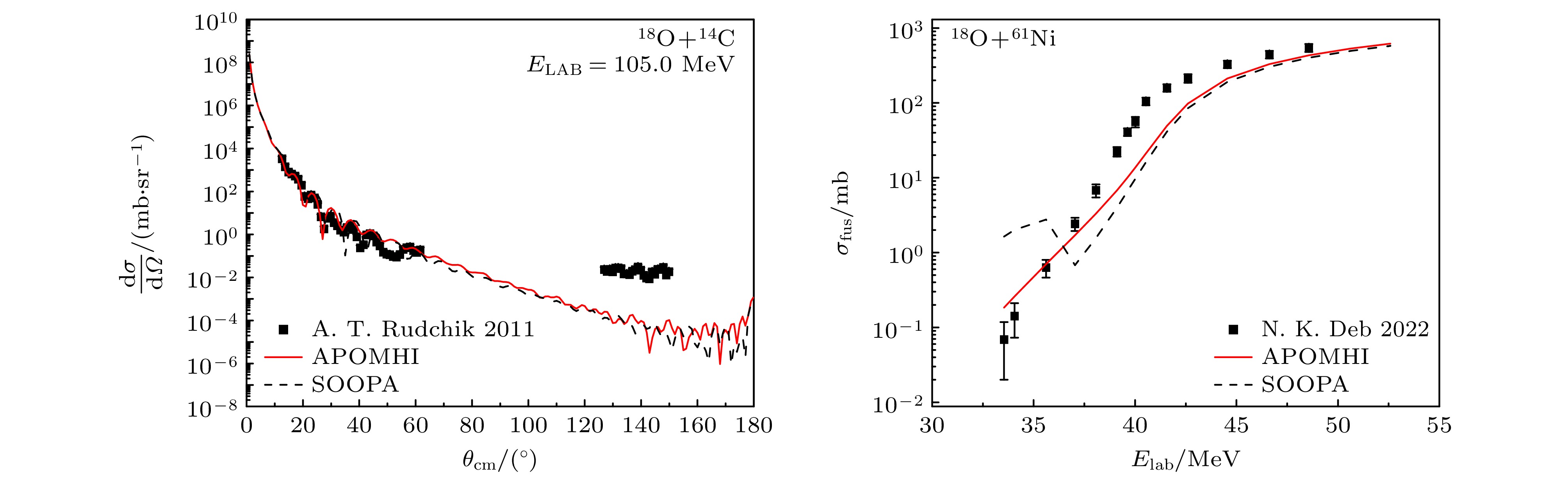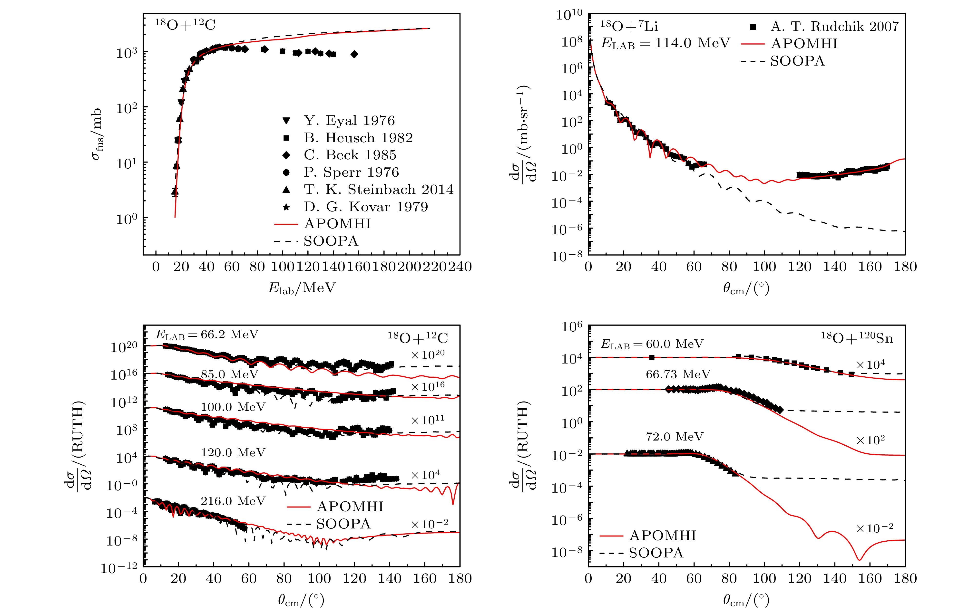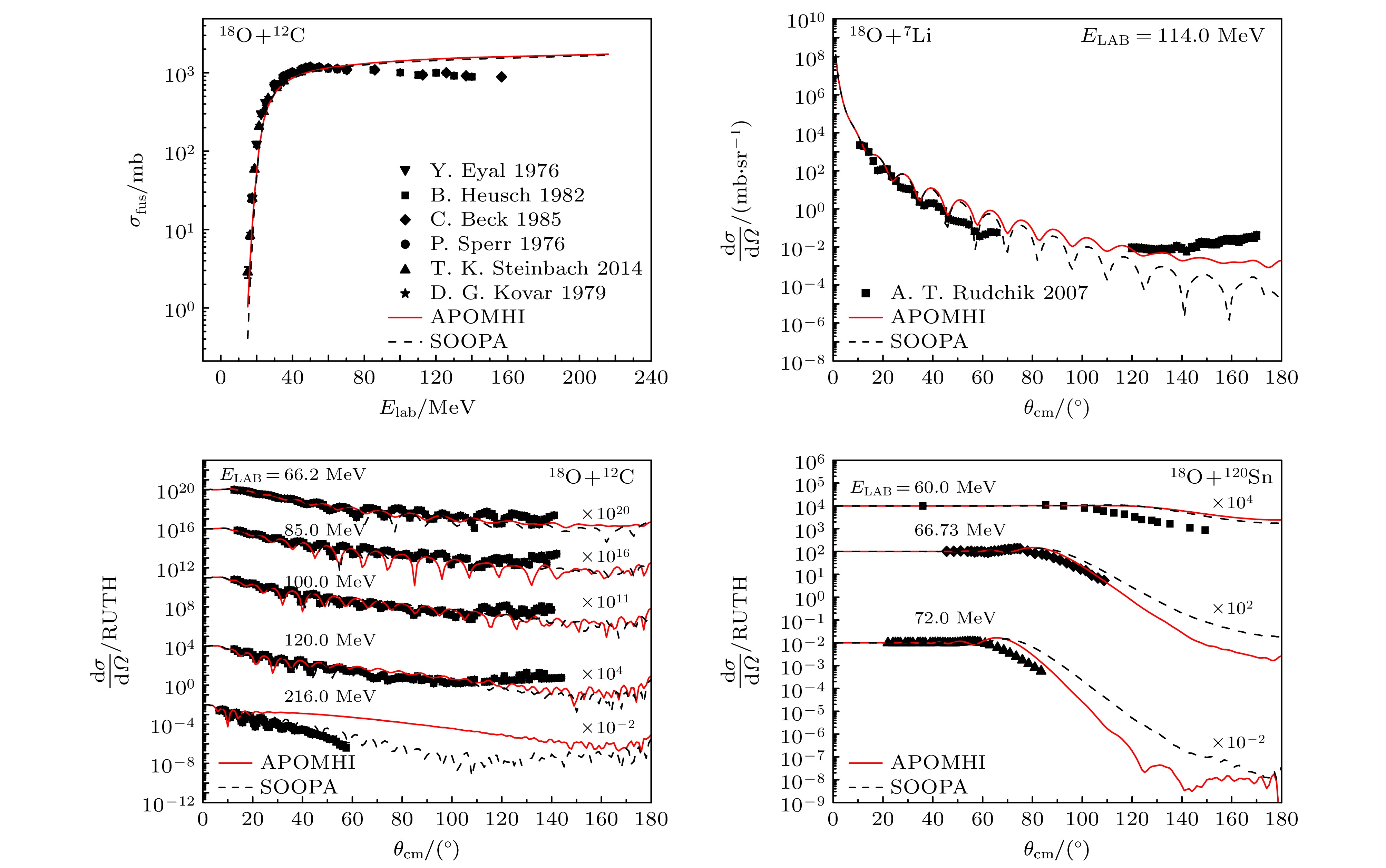 势强度$ {\overline{W}}_{\mathrm{S}\mathrm{O}} $ WSO 1 总计 33 序号 靶核 熔合截面 弹性散射角分布 EL/MeV 文献 EL/MeV 文献 1 9Be 7.0—21.0 [31] 2 10B 22.0—63.0 [32] 3 11B 21.0—65.0 [32] 4 13C 105.0 [33] 5 16O 13.9—85.0 [34,35] 85.0 [36] 6 24Mg 32.0—72.0 [37] 50.0 [38] 7 27Al 28.0—72.0 [39,40] 8 28Si 34.0—72.0 [39] 9 44Ca 27.0—60.0 [41] 10 58Ni 35.0—64.0 [42,43] 35.1, 36.0, 37.1, 38.0, 46.0, 63.0 [44–46] 11 60Ni 40.0—63.0 [43] 34.5, 35.5, 37.1, 38.0, 63.0 [44,46] 12 64Ni 38.5—64.0 [43] 13 63Cu 40.0—65.0 [47] 14 65Cu 40.0—65.0 [47] 15 64Zn 49.0 [48] 16 74Ge 37.0—61.0 [49] 17 90Zr 90.0 [50] 18 92Mo 50.0—65.0 [51] 19 112Sn 60.0 [52] 20 116Sn 67.0 [53] 21 148Nd 61.8—77.0 [54] 22 150Sm 65.0—125.0 [55,56] 23 174Yb 83.0 [57] 24 188Os 80.0—140.0 [58] 25 192Os 79.0—124.0 [55,56] 26 194Pt 77.6—106.0 [59] 27 197Au 77.6—102.0 [60,61] 28 208Pb 75.0—102.0 [62] 29 7Li 114 [63] 30 12C 15.0—216 [64–69] 66.2, 85.0, 100.0, 120.0, 216.0 [70,71] 31 120Sn 60.0, 66.7, 72.0 [46,52,53] 32 14C 105.0 [72] 33 61Ni 33.5—52.6 [73] 序号 参数 数值 序号 参数 数值 1 $ {\overline{V}}_{0} $ 451.00000000 22 $ {a}_{\mathrm{R}\mathrm{S}\mathrm{O}\mathrm{B}0} $ 0.06584537 2 $ {\overline{V}}_{1} $ 15.30000000 23 $ {a}_{\mathrm{I}\mathrm{S}\mathrm{O}\mathrm{A}} $ 0.48015487 3 $ {\overline{V}}_{2} $ 0.48000000 24 $ {a}_{\mathrm{I}\mathrm{S}\mathrm{O}\mathrm{B}0} $ 0.01976280 4 $ {\overline{V}}_{\mathrm{B}} $ 0.00000000 25 $ {r}_{\mathrm{c}\mathrm{A}} $ 1.03999996 5 $ {\overline{V}}_{4} $ 18.73192978 26 $ {r}_{\mathrm{c}\mathrm{B}} $ 1.04000000 6 $ {\overline{W}}_{\mathrm{S}0} $ 30.00000000 27 $ {r}_{\mathrm{S}\mathrm{A}} $ 1.84839511 7 $ {\overline{W}}_{\mathrm{S}1} $ –0.99000000 28 $ {r}_{\mathrm{S}\mathrm{B}} $ 1.46500000 8 $ {\overline{W}}_{\mathrm{S}\mathrm{B}} $ 0.00000000 29 $ {r}_{\mathrm{V}\mathrm{A}} $ 1.93000000 9 $ {\overline{W}}_{\mathrm{S}2} $ 0.00000000 30 $ {r}_{\mathrm{V}\mathrm{B}} $ 1.47000000 10 $ {\overline{W}}_{\mathrm{V}0} $ 10.00000000 31 $ {r}_{\mathrm{R}\mathrm{S}\mathrm{O}\mathrm{A}} $ 1.04999995 11 $ {\overline{W}}_{\mathrm{V}1} $ 13.00000000 32 $ {r}_{\mathrm{R}\mathrm{S}\mathrm{O}\mathrm{B}} $ 1.55366528 12 $ {\overline{W}}_{\mathrm{V}2} $ –0.01200000 33 $ {r}_{\mathrm{I}\mathrm{S}\mathrm{O}\mathrm{A}} $ 1.05001342 13 $ {\overline{V}}_{\mathrm{S}\mathrm{O}} $ 80.00000000 34 $ {r}_{\mathrm{I}\mathrm{S}\mathrm{O}\mathrm{B}} $ 1.75388050 14 $ {\overline{W}}_{\mathrm{S}\mathrm{O}} $ 25.00000000 35 $ {r}_{\mathrm{C}\mathrm{A}} $ 1.25000000 15 $ {a}_{\mathrm{c}\mathrm{A}} $ 0.85000000 36 $ {r}_{\mathrm{C}\mathrm{B}} $ 1.25000000 16 $ {a}_{\mathrm{c}\mathrm{B}0} $ 0.08229566 37 $ {a}_{\mathrm{c}\mathrm{B}1} $ 0.24493097 17 $ {a}_{\mathrm{S}\mathrm{A}} $ 0.35107821 38 $ {a}_{\mathrm{S}\mathrm{B}1} $ 0.35000000 18 $ {a}_{\mathrm{S}\mathrm{B}0} $ 0.34775448 39 $ {a}_{\mathrm{V}\mathrm{B}1} $ 0.09000000 19 $ {a}_{\mathrm{V}\mathrm{A}} $ 0.39626881 40 $ {a}_{\mathrm{R}\mathrm{S}\mathrm{O}\mathrm{B}1} $ 0.11783799 20 $ {a}_{\mathrm{V}\mathrm{B}0} $ 0.38336781 41 $ {a}_{\mathrm{I}\mathrm{S}\mathrm{O}\mathrm{B}1} $ 0.07000000 21 $ {a}_{\mathrm{R}\mathrm{S}\mathrm{O}\mathrm{A}} $ 0.79141617 序号 参数 数值 序号 参数 数值 1 $ {\overline{V}}_{0} $ 1300.00000000 18 $ {a}_{\mathrm{V}0} $ 0.64614904 2 $ {\overline{V}}_{1} $ 9.32954121 19 $ {a}_{\mathrm{S}\mathrm{O}0} $ 0.55000001 3 $ {\overline{V}}_{2} $ –0.03310557 20 $ {r}_{\mathrm{R}0} $ 1.20000005 4 $ {\overline{V}}_{3} $ –45.00000000 21 $ {r}_{\mathrm{S}0} $ 1.24034297 5 $ {\overline{V}}_{4} $ 34.97342682 22 $ {r}_{\mathrm{V}0} $ 1.20000005 6 $ {\overline{W}}_{\mathrm{S}0} $ 27.79658127 23 $ {r}_{\mathrm{S}\mathrm{O}0} $ 1.25000000 7 $ {\overline{W}}_{\mathrm{S}1} $ –0.87972260 24 $ {r}_{\mathrm{C}} $ 1.25000000 8 $ {\overline{W}}_{\mathrm{S}2} $ 1.87557280 25 $ \xi $ 0.11376333 9 $ {\overline{W}}_{\mathrm{S}3} $ 1.07613444 26 $ {a}_{\mathrm{R}1} $ 0.02999442 10 $ {\overline{W}}_{\mathrm{V}0} $ 65.99987030 27 $ {a}_{\mathrm{S}1} $ 0.02947382 11 $ {\overline{W}}_{\mathrm{V}1} $ 5.40153790 28 $ {a}_{\mathrm{V}1} $ –0.03926823 12 $ {\overline{W}}_{\mathrm{V}2} $ 0.08881600 29 $ {a}_{\mathrm{S}\mathrm{O}1} $ 0.00000000 13 $ {\overline{W}}_{\mathrm{V}3} $ –5.09999990 30 $ {r}_{\mathrm{R}1} $ –0.00313194 14 $ {\overline{V}}_{\mathrm{S}\mathrm{O}0} $ 10.00000000 31 $ {r}_{\mathrm{S}1} $ 0.18612149 15 $ {\overline{W}}_{\mathrm{S}\mathrm{O}0} $ 1.00000000 32 $ {r}_{\mathrm{V}1} $ 0.01397228 16 $ {a}_{\mathrm{R}0} $ 0.52152246 33 $ {r}_{\mathrm{S}\mathrm{O}1} $ 0.00000000 17 $ {a}_{\mathrm{S}0} $ 0.34999999 靶核 APOMI SPOOA $ \chi _{\text{f}}^2 $ $ \chi _{\text{e}}^{2} $ $ {\chi ^2} $ $ \chi _{\text{f}}^{2} $ $ \chi _{\text{e}}^{2} $ $ {\chi ^2} $ 9Be 1.39 1.39 2.33 2.33 10B 2.17 2.17 2.89 2.89 11B 4.02 4.02 4.51 4.51 13C 286.27 286.27 467.75 467.75 16O 21.00 162.44 91.72 32.16 147.74 89.95 24Mg 3.11 9.74 6.43 0.38 97.82 49.10 27Al 17.60 17.60 16.52 16.52 28Si 15.43 15.43 7.72 7.72 44Ca 12.05 12.05 6.10 6.10 58Ni 88.30 646.73 367.51 97.93 2046.43 1072.18 60Ni 21.25 1404.33 712.79 35.38 3194.35 1614.86 64Ni 43.28 43.28 42.01 42.01 63Cu 5.06 5.06 4.42 4.42 65Cu 3.90 3.90 5.24 5.24 64Zn 120.98 120.98 579.60 579.60 74Ge 2165.57 2165.57 2468.20 2468.20 90Zr 498.31 498.31 69.48 69.48 92Mo 10.45 10.45 8.45 8.45 112Sn 74.11 74.11 88.79 88.79 116Sn 403.03 403.03 1026.08 1026.08 148Nd 42.07 42.07 21.85 21.85 150Sm 9.20 9.20 5.31 5.31 174Yb 12.57 12.57 9.34 9.34 188Os 80.49 80.49 1422.2 1422.20 192Os 13.57 13.57 3.84 3.84 194Pt 26.65 26.65 30.66 30.66 197Au 32.45 32.45 15.85 15.85 208Pb 33.29 33.29 14.77 14.77 总(以上多核综合) 120.56 361.85 181.87 193.12 772.73 326.79 7Li 166.49 166.49 85.95 85.95 12C 42.23 32018.88 16030.55 42.54 6563.20 3302.87 120Sn 229.43 229.43 354.57 354.57 14C 21.35 21.35 30.14 30.14 61Ni 14.08 14.08 137.80 137.80 靶核 APOMHI(单核) SOOPA(单核) $ \chi _{\text{f}}^{2} $ $ \chi _{\text{e}}^{2} $ $ {\chi ^2} $ $ \chi _{\text{f}}^{2} $ $ \chi _{\