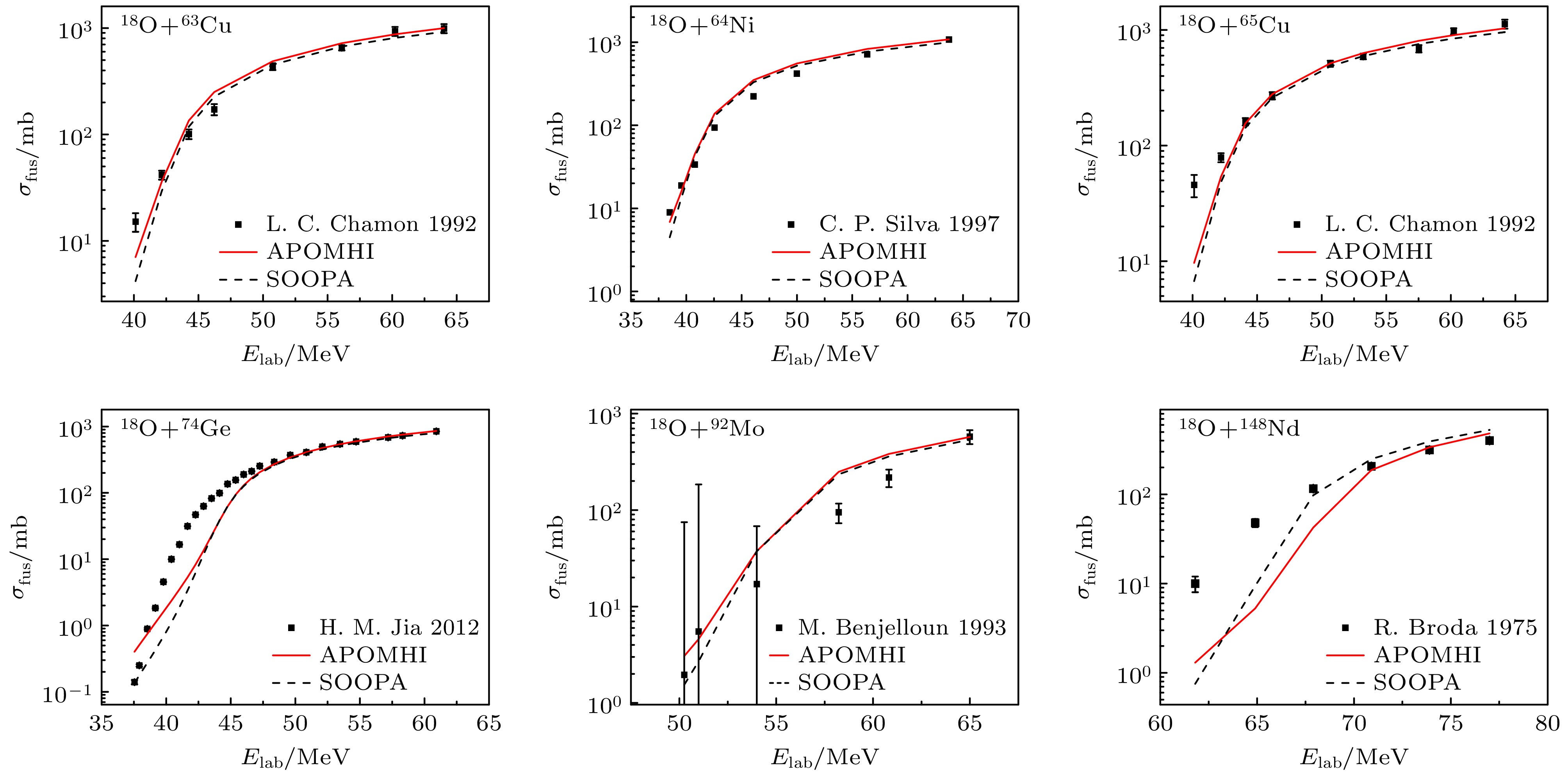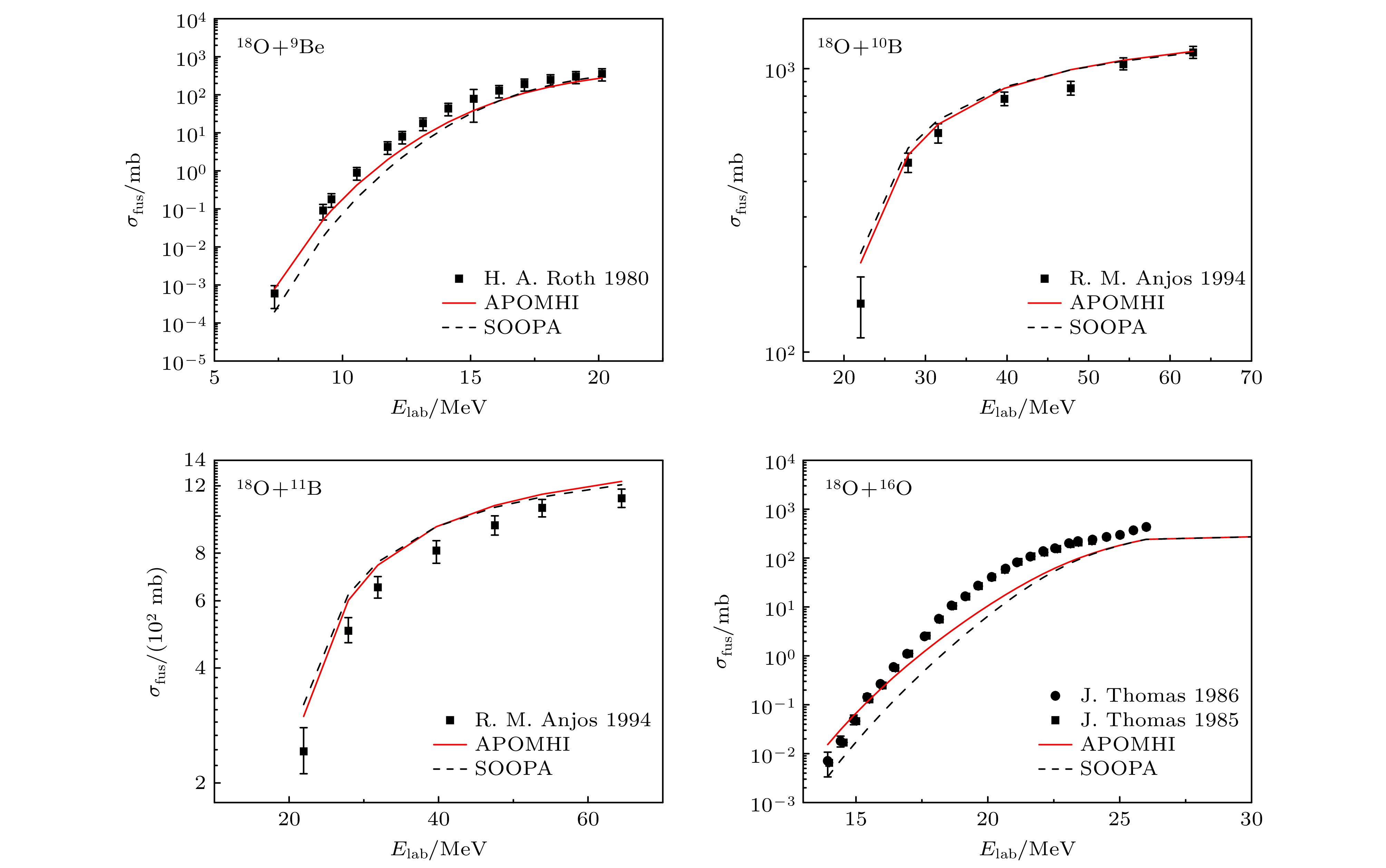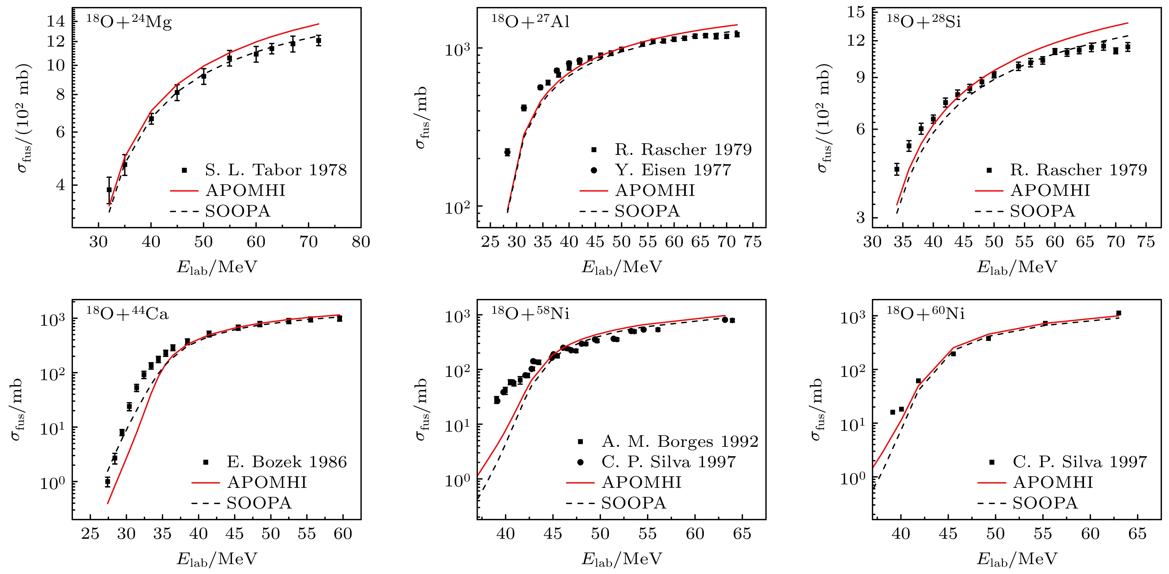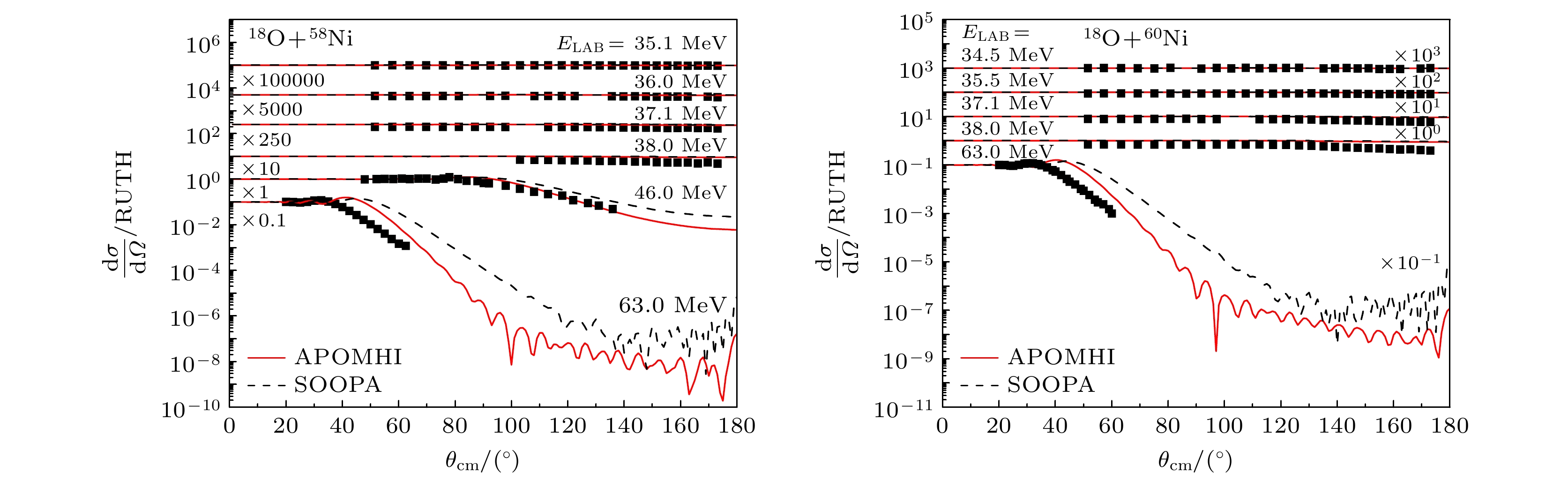 势强度$ {\overline{W}}_{\mathrm{S}\mathrm{O}} $ WSO 1 总计 33 序号 靶核 熔合截面 弹性散射角分布 EL/MeV 文献 EL/MeV 文献 1 9Be 7.0—21.0 [31] 2 10B 22.0—63.0 [32] 3 11B 21.0—65.0 [32] 4 13C 105.0 [33] 5 16O 13.9—85.0 [34,35] 85.0 [36] 6 24Mg 32.0—72.0 [37] 50.0 [38] 7 27Al 28.0—72.0 [39,40] 8 28Si 34.0—72.0 [39] 9 44Ca 27.0—60.0 [41] 10 58Ni 35.0—64.0 [42,43] 35.1, 36.0, 37.1, 38.0, 46.0, 63.0 [44–46] 11 60Ni 40.0—63.0 [43] 34.5, 35.5, 37.1, 38.0, 63.0 [44,46] 12 64Ni 38.5—64.0 [43] 13 63Cu 40.0—65.0 [47] 14 65Cu 40.0—65.0 [47] 15 64Zn 49.0 [48] 16 74Ge 37.0—61.0 [49] 17 90Zr 90.0 [50] 18 92Mo 50.0—65.0 [51] 19 112Sn 60.0 [52] 20 116Sn 67.0 [53] 21 148Nd 61.8—77.0 [54] 22 150Sm 65.0—125.0 [55,56] 23 174Yb 83.0 [57] 24 188Os 80.0—140.0 [58] 25 192Os 79.0—124.0 [55,56] 26 194Pt 77.6—106.0 [59] 27 197Au 77.6—102.0 [60,61] 28 208Pb 75.0—102.0 [62] 29 7Li 114 [63] 30 12C 15.0—216 [64–69] 66.2, 85.0, 100.0, 120.0, 216.0 [70,71] 31 120Sn 60.0, 66.7, 72.0 [46,52,53] 32 14C 105.0 [72] 33 61Ni 33.5—52.6 [73] 序号 参数 数值 序号 参数 数值 1 $ {\overline{V}}_{0} $ 451.00000000 22 $ {a}_{\mathrm{R}\mathrm{S}\mathrm{O}\mathrm{B}0} $ 0.06584537 2 $ {\overline{V}}_{1} $ 15.30000000 23 $ {a}_{\mathrm{I}\mathrm{S}\mathrm{O}\mathrm{A}} $ 0.48015487 3 $ {\overline{V}}_{2} $ 0.48000000 24 $ {a}_{\mathrm{I}\mathrm{S}\mathrm{O}\mathrm{B}0} $ 0.01976280 4 $ {\overline{V}}_{\mathrm{B}} $ 0.00000000 25 $ {r}_{\mathrm{c}\mathrm{A}} $ 1.03999996 5 $ {\overline{V}}_{4} $ 18.73192978 26 $ {r}_{\mathrm{c}\mathrm{B}} $ 1.04000000 6 $ {\overline{W}}_{\mathrm{S}0} $ 30.00000000 27 $ {r}_{\mathrm{S}\mathrm{A}} $ 1.84839511 7 $ {\overline{W}}_{\mathrm{S}1} $ –0.99000000 28 $ {r}_{\mathrm{S}\mathrm{B}} $ 1.46500000 8 $ {\overline{W}}_{\mathrm{S}\mathrm{B}} $ 0.00000000 29 $ {r}_{\mathrm{V}\mathrm{A}} $ 1.93000000 9 $ {\overline{W}}_{\mathrm{S}2} $ 0.00000000 30 $ {r}_{\mathrm{V}\mathrm{B}} $ 1.47000000 10 $ {\overline{W}}_{\mathrm{V}0} $ 10.00000000 31 $ {r}_{\mathrm{R}\mathrm{S}\mathrm{O}\mathrm{A}} $ 1.04999995 11 $ {\overline{W}}_{\mathrm{V}1} $ 13.00000000 32 $ {r}_{\mathrm{R}\mathrm{S}\mathrm{O}\mathrm{B}} $ 1.55366528 12 $ {\overline{W}}_{\mathrm{V}2} $ –0.01200000 33 $ {r}_{\mathrm{I}\mathrm{S}\mathrm{O}\mathrm{A}} $ 1.05001342 13 $ {\overline{V}}_{\mathrm{S}\mathrm{O}} $ 80.00000000 34 $ {r}_{\mathrm{I}\mathrm{S}\mathrm{O}\mathrm{B}} $ 1.75388050 14 $ {\overline{W}}_{\mathrm{S}\mathrm{O}} $ 25.00000000 35 $ {r}_{\mathrm{C}\mathrm{A}} $ 1.25000000 15 $ {a}_{\mathrm{c}\mathrm{A}} $ 0.85000000 36 $ {r}_{\mathrm{C}\mathrm{B}} $ 1.25000000 16 $ {a}_{\mathrm{c}\mathrm{B}0} $ 0.08229566 37 $ {a}_{\mathrm{c}\mathrm{B}1} $ 0.24493097 17 $ {a}_{\mathrm{S}\mathrm{A}} $ 0.35107821 38 $ {a}_{\mathrm{S}\mathrm{B}1} $ 0.35000000 18 $ {a}_{\mathrm{S}\mathrm{B}0} $ 0.34775448 39 $ {a}_{\mathrm{V}\mathrm{B}1} $ 0.09000000 19 $ {a}_{\mathrm{V}\mathrm{A}} $ 0.39626881 40 $ {a}_{\mathrm{R}\mathrm{S}\mathrm{O}\mathrm{B}1} $ 0.11783799 20 $ {a}_{\mathrm{V}\mathrm{B}0} $ 0.38336781 41 $ {a}_{\mathrm{I}\mathrm{S}\mathrm{O}\mathrm{B}1} $ 0.07000000 21 $ {a}_{\mathrm{R}\mathrm{S}\mathrm{O}\mathrm{A}} $ 0.79141617 序号 参数 数值 序号 参数 数值 1 $ {\overline{V}}_{0} $ 1300.00000000 18 $ {a}_{\mathrm{V}0} $ 0.64614904 2 $ {\overline{V}}_{1} $ 9.32954121 19 $ {a}_{\mathrm{S}\mathrm{O}0} $ 0.55000001 3 $ {\overline{V}}_{2} $ –0.03310557 20 $ {r}_{\mathrm{R}0} $ 1.20000005 4 $ {\overline{V}}_{3} $ –45.00000000 21 $ {r}_{\mathrm{S}0} $ 1.24034297 5 $ {\overline{V}}_{4} $ 34.97342682 22 $ {r}_{\mathrm{V}0} $ 1.20000005 6 $ {\overline{W}}_{\mathrm{S}0} $ 27.79658127 23 $ {r}_{\mathrm{S}\mathrm{O}0} $ 1.25000000 7 $ {\overline{W}}_{\mathrm{S}1} $ –0.87972260 24 $ {r}_{\mathrm{C}} $ 1.25000000 8 $ {\overline{W}}_{\mathrm{S}2} $ 1.87557280 25 $ \xi $ 0.11376333 9 $ {\overline{W}}_{\mathrm{S}3} $ 1.07613444 26 $ {a}_{\mathrm{R}1} $ 0.02999442 10 $ {\overline{W}}_{\mathrm{V}0} $ 65.99987030 27 $ {a}_{\mathrm{S}1} $ 0.02947382 11 $ {\overline{W}}_{\mathrm{V}1} $ 5.40153790 28 $ {a}_{\mathrm{V}1} $ –0.03926823 12 $ {\overline{W}}_{\mathrm{V}2} $ 0.08881600 29 $ {a}_{\mathrm{S}\mathrm{O}1} $ 0.00000000 13 $ {\overline{W}}_{\mathrm{V}3} $ –5.09999990 30 $ {r}_{\mathrm{R}1} $ –0.00313194 14 $ {\overline{V}}_{\mathrm{S}\mathrm{O}0} $ 10.00000000 31 $ {r}_{\mathrm{S}1} $ 0.18612149 15 $ {\overline{W}}_{\mathrm{S}\mathrm{O}0} $ 1.00000000 32 $ {r}_{\mathrm{V}1} $ 0.01397228 16 $ {a}_{\mathrm{R}0} $ 0.52152246 33 $ {r}_{\mathrm{S}\mathrm{O}1} $ 0.00000000 17 $ {a}_{\mathrm{S}0} $ 0.34999999 靶核 APOMI SPOOA $ \chi _{\text{f}}^2 $ $ \chi _{\text{e}}^{2} $ $ {\chi ^2} $ $ \chi _{\text{f}}^{2} $ $ \chi _{\text{e}}^{2} $ $ {\chi ^2} $ 9Be 1.39 1.39 2.33 2.33 10B 2.17 2.17 2.89 2.89 11B 4.02 4.02 4.51 4.51 13C 286.27 286.27 467.75 467.75 16O 21.00 162.44 91.72 32.16 147.74 89.95 24Mg 3.11 9.74 6.43 0.38 97.82 49.10 27Al 17.60 17.60 16.52 16.52 28Si 15.43 15.43 7.72 7.72 44Ca 12.05 12.05 6.10 6.10 58Ni 88.30 646.73 367.51 97.93 2046.43 1072.18 60Ni 21.25 1404.33 712.79 35.38 3194.35 1614.86 64Ni 43.28 43.28 42.01 42.01 63Cu 5.06 5.06 4.42 4.42 65Cu 3.90 3.90 5.24 5.24 64Zn 120.98 120.98 579.60 579.60 74Ge 2165.57 2165.57 2468.20 2468.20 90Zr 498.31 498.31 69.48 69.48 92Mo 10.45 10.45 8.45 8.45 112Sn 74.11 74.11 88.79 88.79 116Sn 403.03 403.03 1026.08 1026.08 148Nd 42.07 42.07 21.85 21.85 150Sm 9.20 9.20 5.31 5.31 174Yb 12.57 12.57 9.34 9.34 188Os 80.49 80.49 1422.2 1422.20 192Os 13.57 13.57 3.84 3.84 194Pt 26.65 26.65 30.66 30.66 197Au 32.45 32.45 15.85 15.85 208Pb 33.29 33.29 14.77 14.77 总(以上多核综合) 120.56 361.85 181.87 193.12 772.73 326.79 7Li 166.49 166.49 85.95 85.95 12C 42.23 32018.88 16030.55 42.54 6563.20 3302.87 120Sn 229.43 229.43 354.57 354.57 14C 21.35 21.35 30.14 30.14 61Ni 14.08 14.08 137.80 137.80 靶核 APOMHI(单核) SOOPA(单核) $ \chi _{\text{f}}^{2} $ $ \chi _{\text{e}}^{2} $ $ {\chi ^2} $ $ \chi _{\text{f}}^{2} $ $ \chi _{\