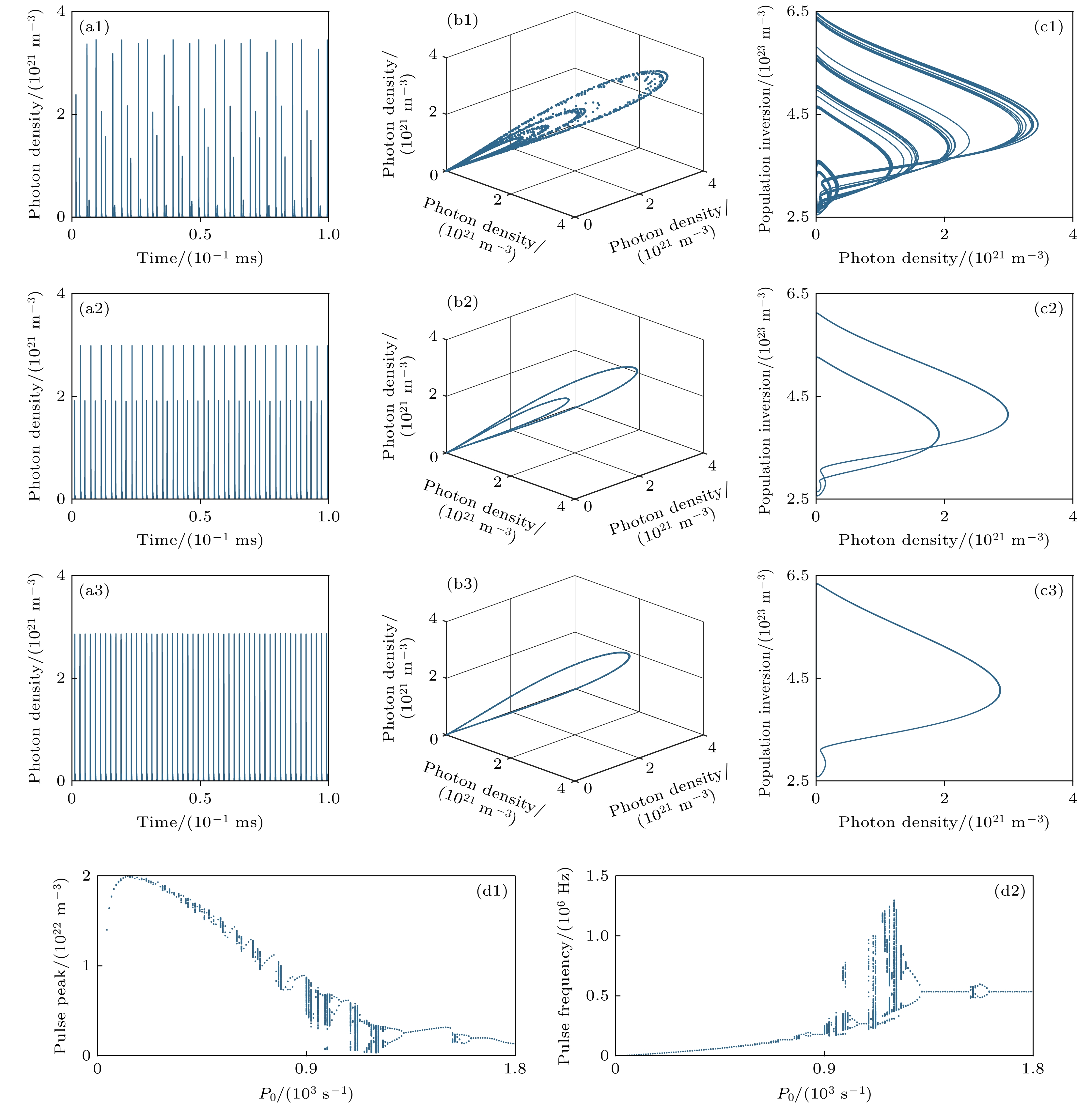 All-solid-state passively Q-switched lasers can exhibit nonlinear behaviors such as period-doubling, injection locking, and chaos under specific conditions, offering new applications in fields like secure communication and random number generation. As a result, the nonlinear dynamics of laser systems are becoming increasingly important. Pump modulation is a typical method of controlling the nonlinear dynamical states of solid-state lasers. In this work, the nonlinear dynamical characteristics of an all-solid-state passively Q-switched Nd:YAG/Cr:YAG laser under pump modulation are investigated by solving a four-level rate equation system using the Runge-Kutta method. The results demonstrate that by adjusting key parameters including modulation frequency, modulation amplitude, and unmodulated pump rate, the laser system can exhibit rich dynamical states, including period-one, period-two, multi-period, and chaotic pulsation. By analyzing the bifurcation diagram, the evolution pattern of output laser pulse characteristics with parameter changes is revealed. The system mainly enters chaos through period-doubling and quasi-periodic routes, while exhibiting a unique phenomenon where the pulse peak and pulse frequency follow synchronized evolutionary paths but with opposite trends in intensity variation, indicating dynamic coupling effects between frequency and intensity domains. By constructing the nonlinear dynamical distributions within a three-dimensional pump modulation parameter space, the combined effects of modulation frequency, modulation amplitude, and unmodulated pump rate on the evolution of the laser’s nonlinear dynamics are systematically investigated in this work. The results show that at lower unmodulated pump rates, the system cannot be driven into nonlinear states even when the modulation amplitude and frequency are relatively large. In contrast, under higher unmodulated pump rates, the appropriate tuning of modulation amplitude and frequency enables the system to transition from periodic states to chaotic behavior. This work not only elucidates the modulation mechanisms of pump parameters on the nonlinear dynamics of lasers, but also provides theoretical guidance for optimizing laser output performance and designing high-performance chaotic lasers, which is of great significance in promoting the applications of Q-switched lasers in precision measurement and secure communication fields.