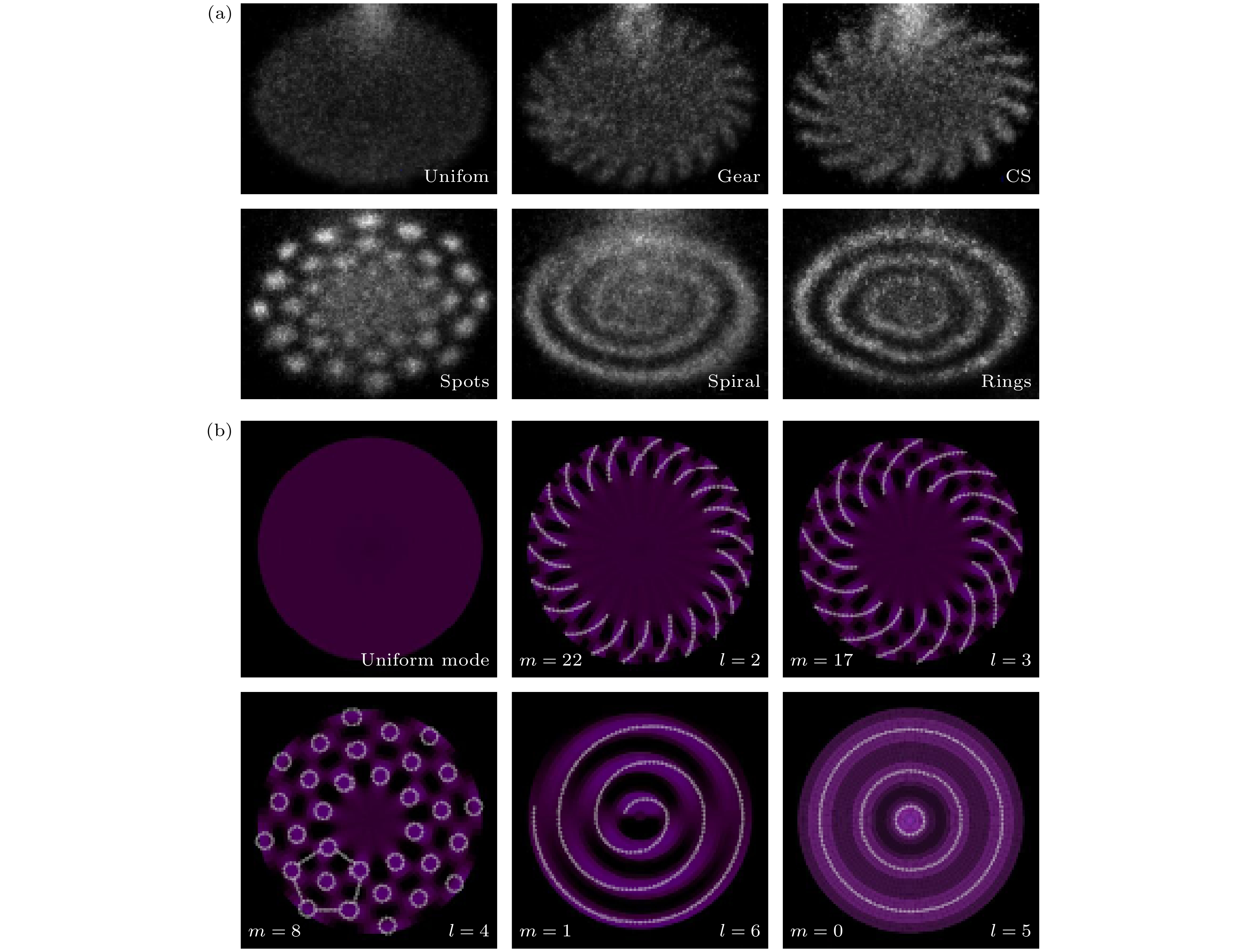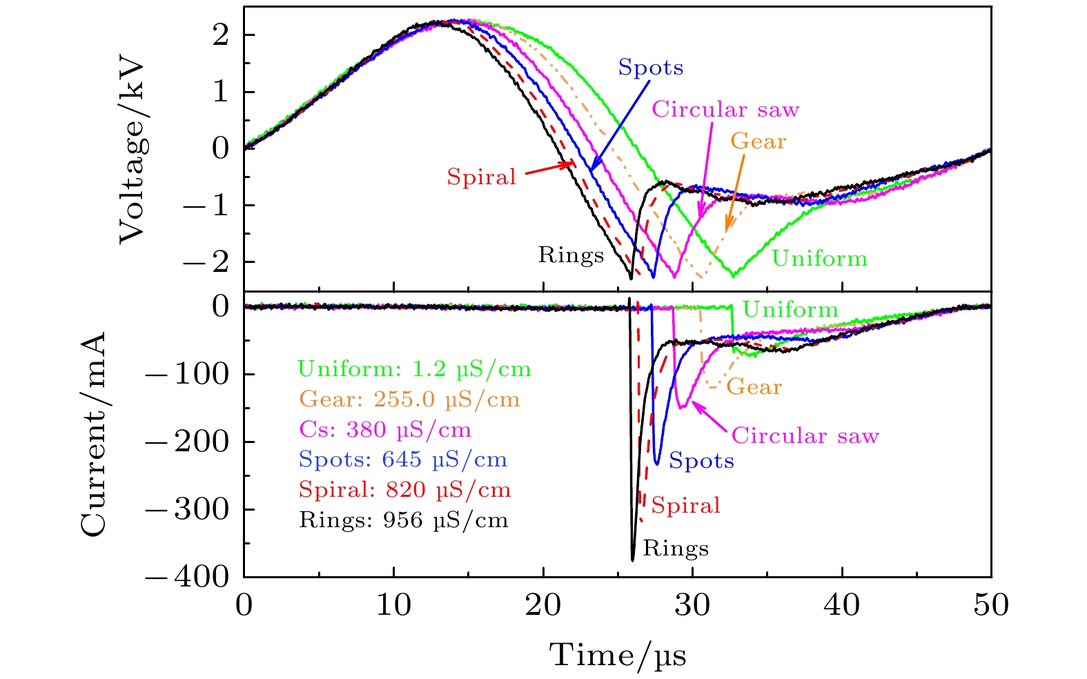 A liquid-electrode discharge system excited by an alternating-current sinusoidal voltage is employed to investigate the discharge modes with varying liquid conductivity (σ). The results indicate that with σ increasing, the discharge transitions from the uniform mode to the pattern mode, which undergoes various self-organized patterns such as gear, circular saw, discrete spots, single-arm spiral, and concentric rings on the liquid surface. The voltage and current waveforms reveal that the discharge occurs only in the negative half-cycle of applied voltage (when the liquid acts as the instantaneous anode). After gas breakdown, the discharge current rises rapidly to a peak, and then slowly decreases. For the uniform mode, the current decreases monotonically. However, during the current decreasing in the pattern mode, there appears a plateau in which the current keeps almost invariant with time. As σ increases, the values of the peak current and the plateau increase, and the breakdown moment advances. In addition, fast photography achieved through an intensified charge-coupled device (ICCD) shows that regardless of the discharge mode, a uniform disk is initially generated on the liquid surface, and various non-uniform patterns are formed during the plateau stage. Based on the reaction-diffusion model, numerical simulations are carried out through changing ion strength and current strength, which are related to the variables m and l. The simulated discharge modes are well in line with those obtained in the experiments. Moreover, spectral line intensity ratios related to electron temperature and electron density are determined through the spectra emitted from the discharge near the liquid surface. By fitting the spectra, gas temperature and molecular vibration temperature are obtained, which show an increasing trend with σ increasing.