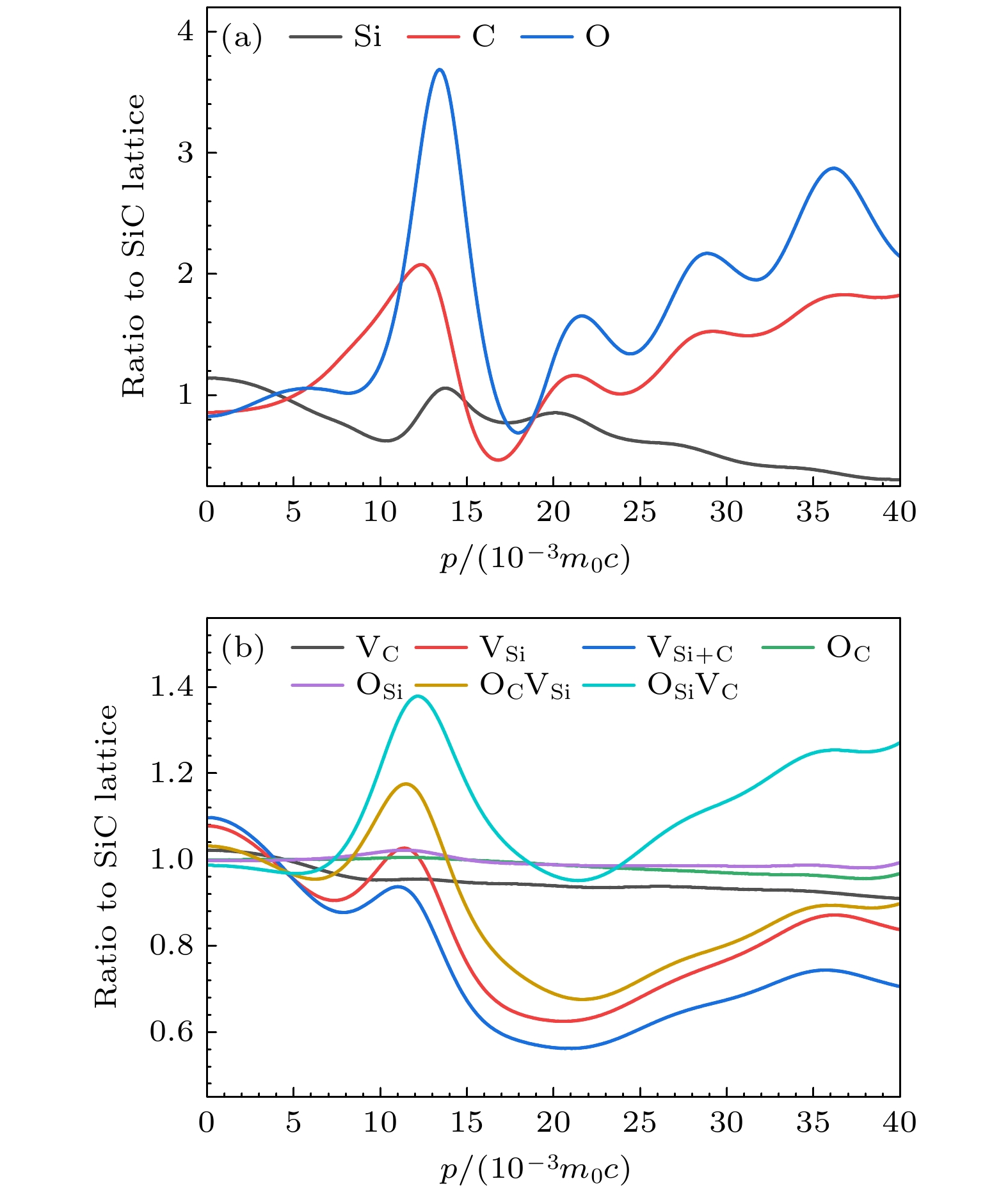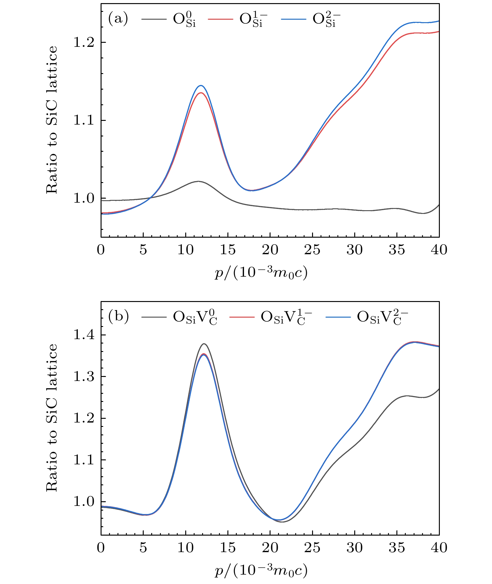 类型 BNLDA APGGA PHNCGGA QMCGGA 文献 体相 150 150 147 153 145[56] ${\text{V}}_{\text{C}}^{0}$ 151 150 147 152 150[23] ${\text{V}}_{{\text{Si}}}^{0}$ 241 238 233 242 227[54] ${\text{V}}_{{\text{Si}}}^{1 - }$ 237 233 229 238 225[54] ${\text{V}}_{{\text{Si}}}^{2 - }$ 236 232 228 237 222[54] ${\text{V}}_{{\text{Si} + {\text{C}}}}^{0}$ 250 249 243 251 ${\text{V}}_{{\text{Si} + {\text{C}}}}^{1 - }$ 243 242 236 245 ${\text{V}}_{{\text{Si} + {\text{C}}}}^{2 - }$ 239 244 235 242 ${\text{O}}_{{\text{Si}}}^{0}$ 164 170 164 169 ${\text{O}}_{{\text{Si}}}^{1 - }$ 167 187 175 176 ${\text{O}}_{{\text{Si}}}^{2 - }$ 167 187 174 175 ${{\text{O}}_{\text{C}}}{\text{V}}_{{\text{Si}}}^{0}$ 239 242 234 242 ${{\text{O}}_{\text{C}}}{\text{V}}_{{\text{Si}}}^{1 - }$ 237 242 234 240 ${{\text{O}}_{\text{C}}}{\text{V}}_{{\text{Si}}}^{2 - }$ 234 240 231 238 ${{\text{O}}_{{\text{Si}}}}{\text{V}}_{\text{C}}^{0}$ 181 186 180 186 ${{\text{O}}_{{\text{Si}}}}{\text{V}}_{\text{C}}^{1 - }$ 183 202 190 192 ${{\text{O}}_{{\text{Si}}}}{\text{V}}_{\text{C}}^{2 - }$ 183 202 190 191 Defect type Srel Wrel VC 1.020 0.948 VSi 1.063 0.872 VSi+C 1.082 0.790 OC 1.000 0.999 OSi 0.997 1.009 OCVSi 1.025 1.002 OSiVC 0.988 1.228 Defect type Srel Wrel ${\text{O}}_{{\text{Si}}}^{0}$ 0.997 1.009 ${\text{O}}_{{\text{Si}}}^{1 - }$ 0.984 1.087 ${\text{O}}_{{\text{Si}}}^{2 - }$ 0.983 1.092 ${{\text{O}}_{{\text{Si}}}}{\text{V}}_{\text{C}}^{0}$ 0.988 1.228 ${{\text{O}}_{{\text{Si}}}}{\text{V}}_{\text{C}}^{1 - }$ 0.990 1.210 ${{\text{O}}_{{\text{Si}}}}{\text{V}}_{\text{C}}^{2 - }$ 0.990 1.209 -