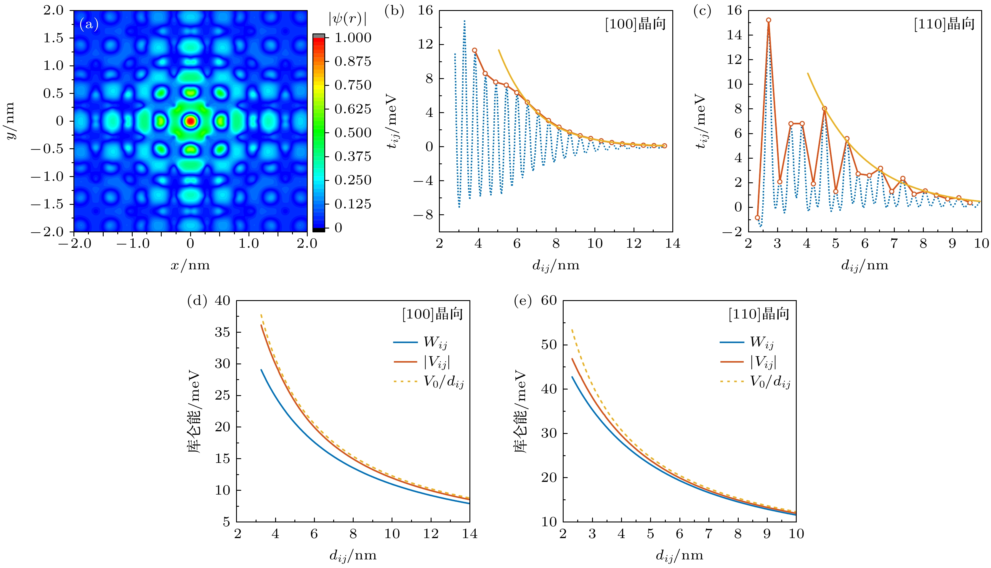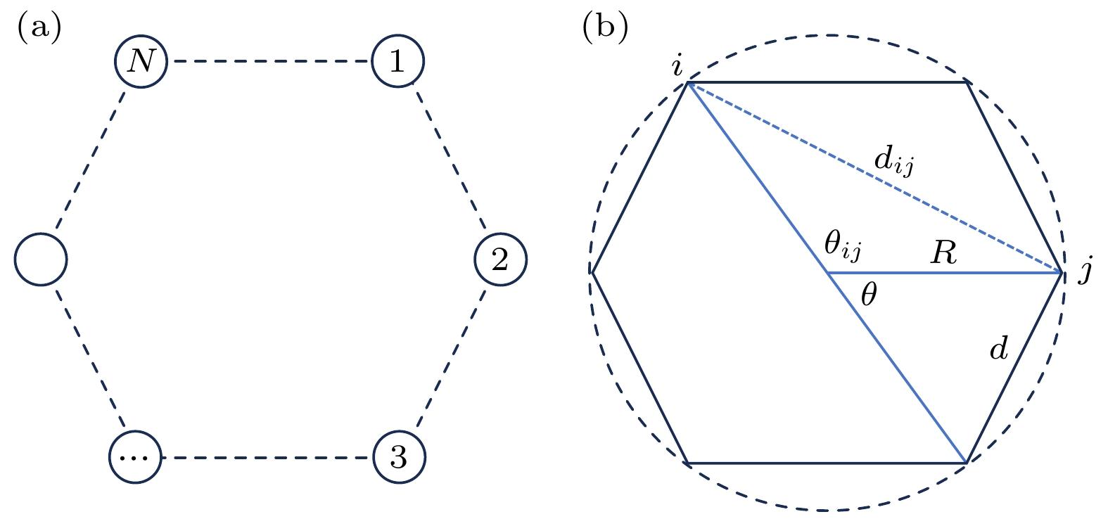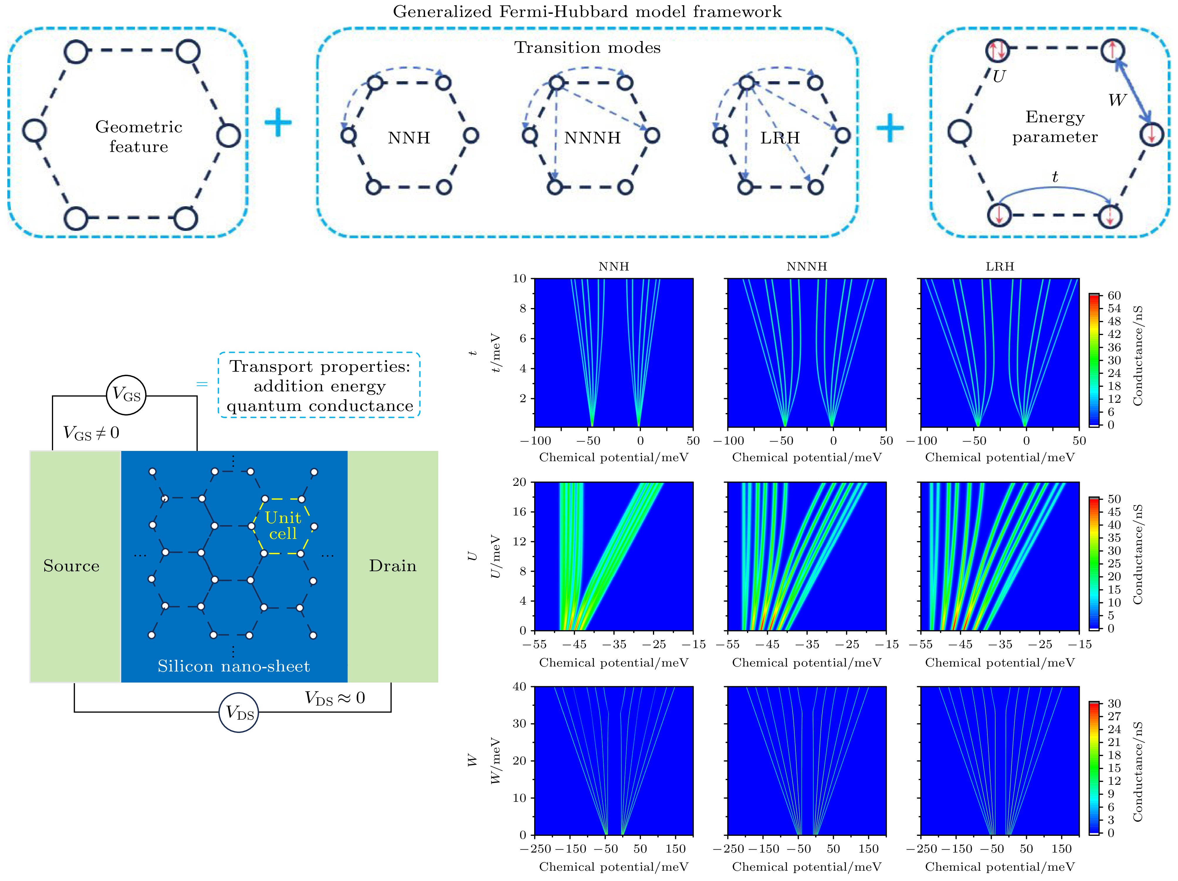 Dopant-induced quantum dot arrays in silicon-based nanostructures have received much attention due to their great potential applications in fields such as quantum computing and quantum simulation. When quantum dots are arranged in different geometric configurations such as linear, annular, or grid shapes, the differences in their inherent topological properties will lead to significantly different spatial distributions of the Coulomb interaction potential. The potential field distribution directly affects the phase coherence of electron wavefunctions, thereby regulating the dynamic behaviors of electrons such as electron tunneling and hopping between quantum dots, and greatly influencing the electron transport properties in the system.Our study aims to establish a basic theoretical framework to clarify the regulation mechanism of quantum dot geometric configurations on electron hopping transport. Therefore, we construct a generalized Fermi-Hubbard model for silicon-based dopant-induced quantum dot arrays. The model defines the distance between quantum dots through an effective Euclidean distance matrix ( D ), which uniquely determines the geometric shape of the array, and defines the allowed electron hopping modes through an adjacency matrix ( A ). Using the framework and exact diagonalization method, we perform detailed numerical simulations on the electron transport properties in the traditional unit cell of two-dimensional ordered distribution dopant-induced quantum dot arrays. Generally, the primitive unit of a two-dimensional orderly distributed dopant-induced quantum dot array is a regular polygon that satisfies specific translational and rotational symmetries. We thereby refer to the quantum dot arrays distributed according to regular polygons as annular arrays.The geometric features of annular quantum dot arrays and the electron hopping modes including nearest-neighbor hopping (NNH), next-nearest-neighbor hopping (NNNH) and long-range hopping (LRH), exhibit significant regulation of the electron addition energy and quantum conductance. The regulation arises from interactions of key energy parameters, including coupling strength (t), on-site Coulomb repulsion (U) and inter-site Coulomb repulsion (W). In the electron addition energy spectrum, such a regulation is manifested in two aspects: energy band broadening and Coulomb gap size. Band broadening is co-regulated by t and W. Under weak coupling conditions, the broadening Δt induced by coupling strength is proportional to t, with its proportional coefficient increasing with the number of hopping paths (LRH > NNNH > NNH). The broadening ΔW caused by inter-site Coulomb repulsion is proportional to W, with the proportional coefficient being β, which is a geometry-dependent correlation broadening coefficient. In multi-site annular arrays, β exhibits a logarithmic relationship with the site number N. The size of Coulomb gap is co-influenced by U, t and W. The competition between U and W determines the electron configuration mode (dominated by single-electron occupation of sites or double-electrons occupation of spaced sites), with a critical value α for electron configuration reconstruction that causes a change in electron configuration across the threshold. When U/W > α, single-electron occupation dominates, and the gap is determined by the competition between U and t; when U/W < α, double-electrons occupation dominates, the gap expands under the influence of W, accompanied by the formation of sub-bands.In the quantum conductance spectrum, regulation is reflected by the distribution of conductance peak intensity. Geometric configurations significantly affect peak intensity distribution. Linear arrays exhibit concentrated peak intensities due to edge states formed by open boundaries, while annular arrays with periodic boundaries and no edge states show more uniform peak distributions. Additionally, in annular arrays, the electron transport direction is non-collinear with the inter-site repulsion direction, endowing them with stronger robustness against transport inhibition induced by W. The influence of hopping modes is twofold. More hopping paths (LRH > NNNH > NNH) result in more non-zero hopping matrix elements, which causes higher average conductance. Meanwhile, hopping paths affect the phase coherence of wavefunctions, modulating the intensity of individual conductance peaks and forming distinct distribution.In conclusion, we establish a theoretical framework to clarify the physical mechanism, in which the geometric configurations and electron hopping modes of silicon-based dopant-induced quantum dot arrays regulate electron transport properties through synergistic interactions with key energy parameters (t, U, W). Electron addition energy spectra and quantum conductance spectra reveal the regulatory rules of these factors on electron transport behaviors, providing a theoretical guidance for optimally designing silicon-based quantum devices.