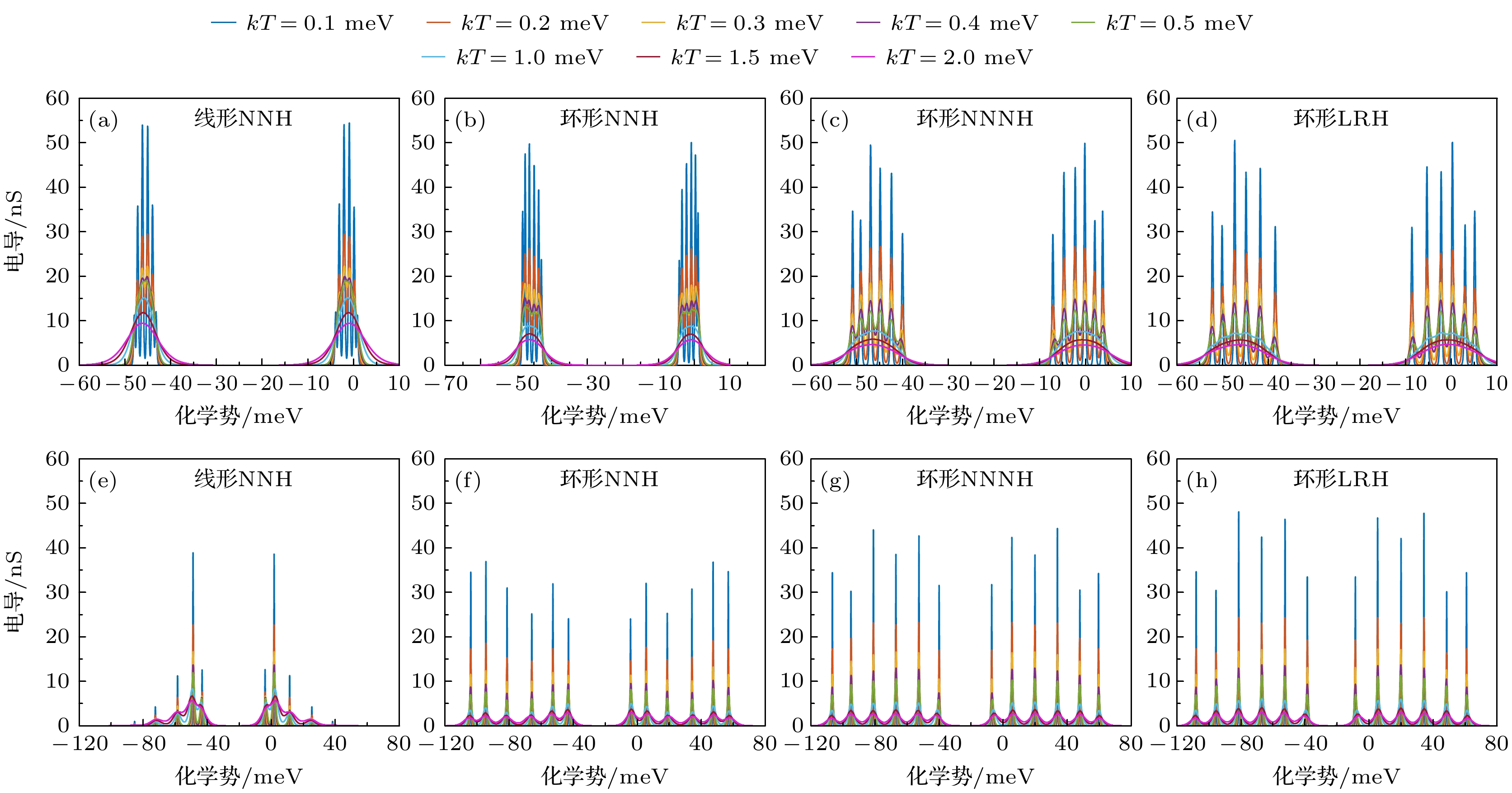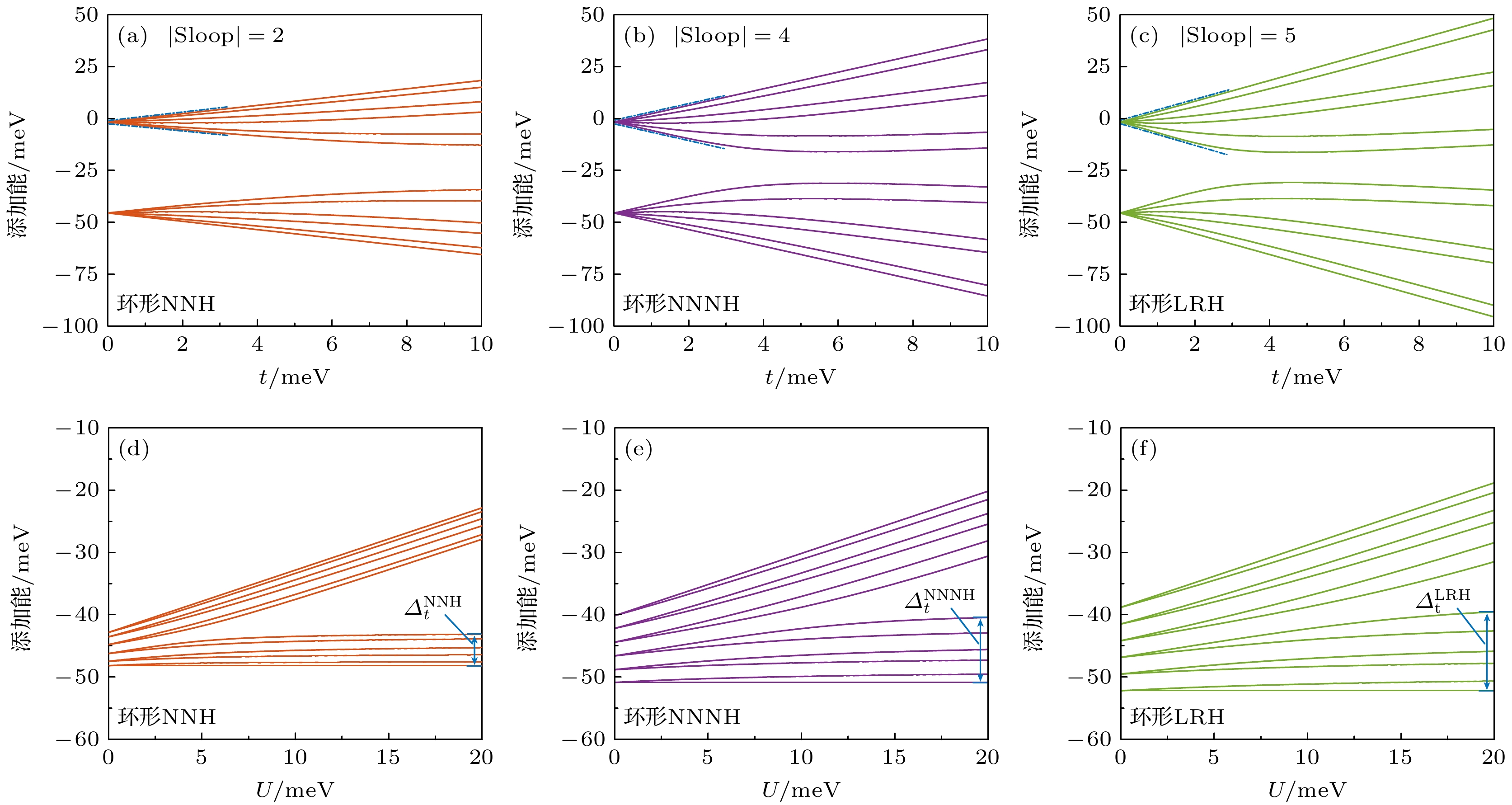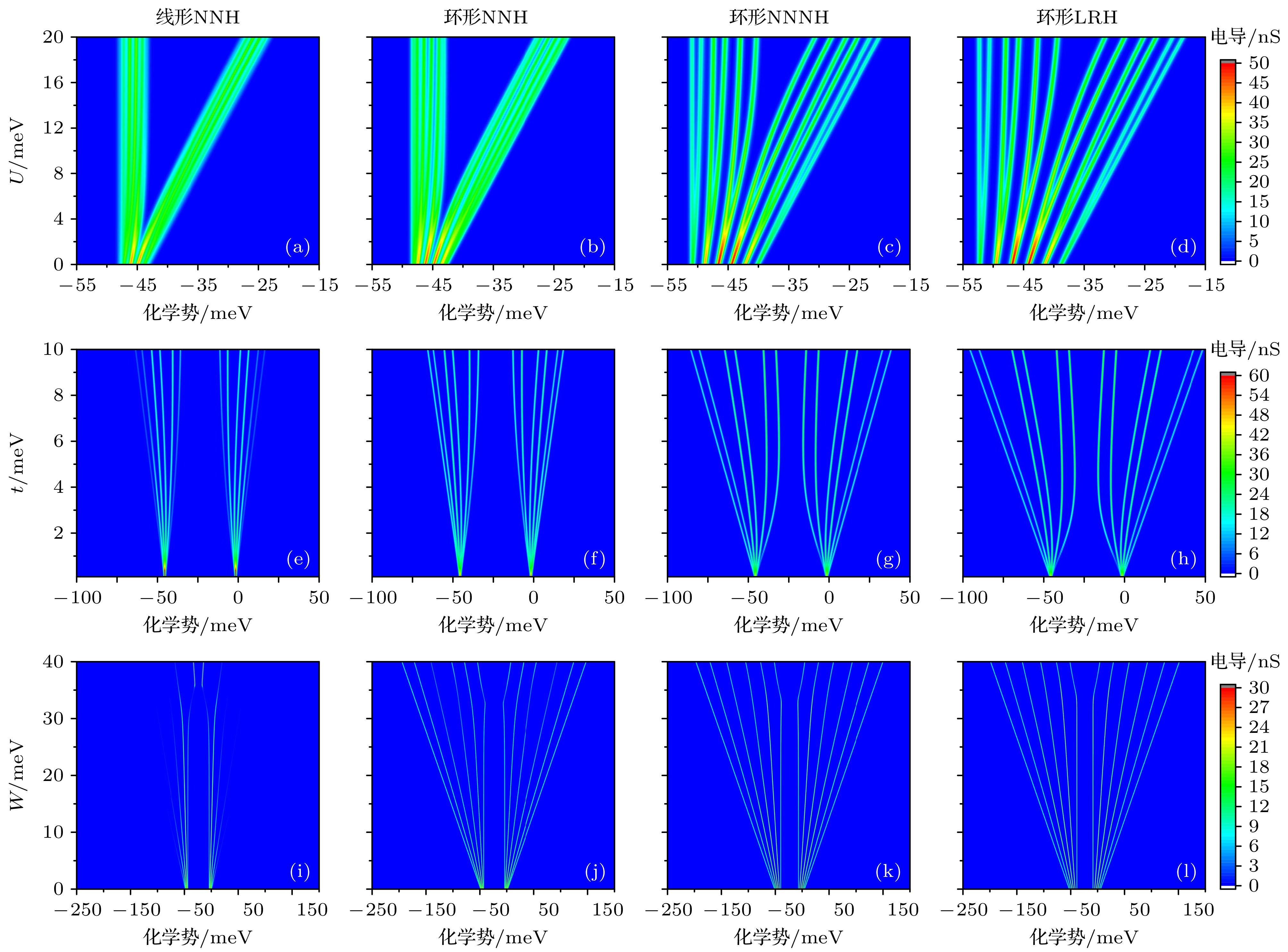 Dopant-induced quantum dot arrays in silicon-based nanostructures have received much attention due to their great potential applications in fields such as quantum computing and quantum simulation. When quantum dots are arranged in different geometric configurations such as linear, annular, or grid shapes, the differences in their inherent topological properties will lead to significantly different spatial distributions of the Coulomb interaction potential. The potential field distribution directly affects the phase coherence of electron wavefunctions, thereby regulating the dynamic behaviors of electrons such as electron tunneling and hopping between quantum dots, and greatly influencing the electron transport properties in the system.Our study aims to establish a basic theoretical framework to clarify the regulation mechanism of quantum dot geometric configurations on electron hopping transport. Therefore, we construct a generalized Fermi-Hubbard model for silicon-based dopant-induced quantum dot arrays. The model defines the distance between quantum dots through an effective Euclidean distance matrix ( D ), which uniquely determines the geometric shape of the array, and defines the allowed electron hopping modes through an adjacency matrix ( A ). Using the framework and exact diagonalization method, we perform detailed numerical simulations on the electron transport properties in the traditional unit cell of two-dimensional ordered distribution dopant-induced quantum dot arrays. Generally, the primitive unit of a two-dimensional orderly distributed dopant-induced quantum dot array is a regular polygon that satisfies specific translational and rotational symmetries. We thereby refer to the quantum dot arrays distributed according to regular polygons as annular arrays.The geometric features of annular quantum dot arrays and the electron hopping modes including nearest-neighbor hopping (NNH), next-nearest-neighbor hopping (NNNH) and long-range hopping (LRH), exhibit significant regulation of the electron addition energy and quantum conductance. The regulation arises from interactions of key energy parameters, including coupling strength (t), on-site Coulomb repulsion (U) and inter-site Coulomb repulsion (W). In the electron addition energy spectrum, such a regulation is manifested in two aspects: energy band broadening and Coulomb gap size. Band broadening is co-regulated by t and W. Under weak coupling conditions, the broadening Δt induced by coupling strength is proportional to t, with its proportional coefficient increasing with the number of hopping paths (LRH > NNNH > NNH). The broadening ΔW caused by inter-site Coulomb repulsion is proportional to W, with the proportional coefficient being β, which is a geometry-dependent correlation broadening coefficient. In multi-site annular arrays, β exhibits a logarithmic relationship with the site number N. The size of Coulomb gap is co-influenced by U, t and W. The competition between U and W determines the electron configuration mode (dominated by single-electron occupation of sites or double-electrons occupation of spaced sites), with a critical value α for electron configuration reconstruction that causes a change in electron configuration across the threshold. When U/W > α, single-electron occupation dominates, and the gap is determined by the competition between U and t; when U/W < α, double-electrons occupation dominates, the gap expands under the influence of W, accompanied by the formation of sub-bands.In the quantum conductance spectrum, regulation is reflected by the distribution of conductance peak intensity. Geometric configurations significantly affect peak intensity distribution. Linear arrays exhibit concentrated peak intensities due to edge states formed by open boundaries, while annular arrays with periodic boundaries and no edge states show more uniform peak distributions. Additionally, in annular arrays, the electron transport direction is non-collinear with the inter-site repulsion direction, endowing them with stronger robustness against transport inhibition induced by W. The influence of hopping modes is twofold. More hopping paths (LRH > NNNH > NNH) result in more non-zero hopping matrix elements, which causes higher average conductance. Meanwhile, hopping paths affect the phase coherence of wavefunctions, modulating the intensity of individual conductance peaks and forming distinct distribution.In conclusion, we establish a theoretical framework to clarify the physical mechanism, in which the geometric configurations and electron hopping modes of silicon-based dopant-induced quantum dot arrays regulate electron transport properties through synergistic interactions with key energy parameters (t, U, W). Electron addition energy spectra and quantum conductance spectra reveal the regulatory rules of these factors on electron transport behaviors, providing a theoretical guidance for optimally designing silicon-based quantum devices.