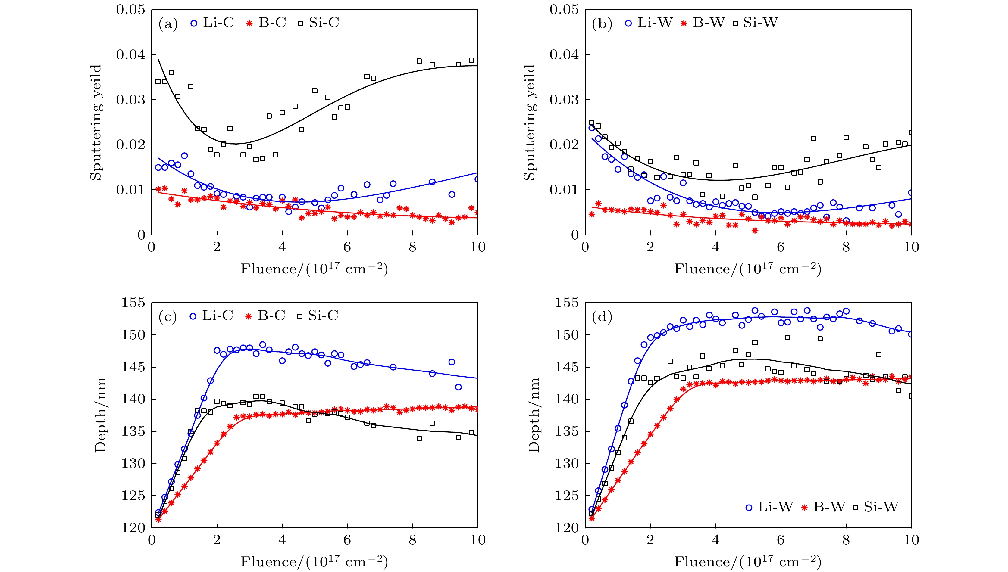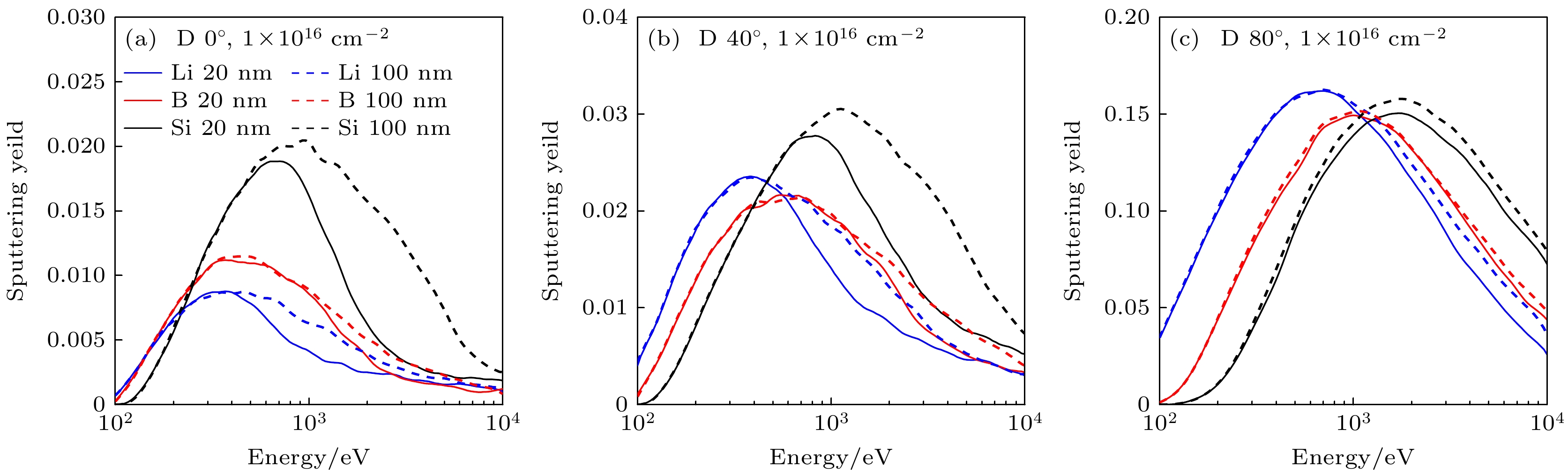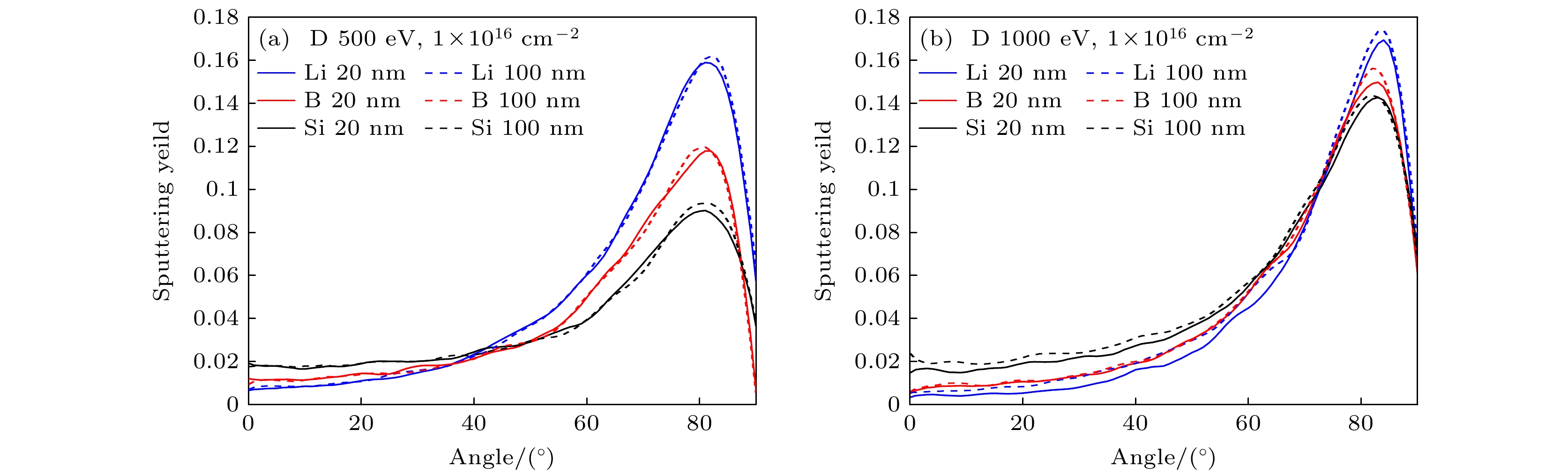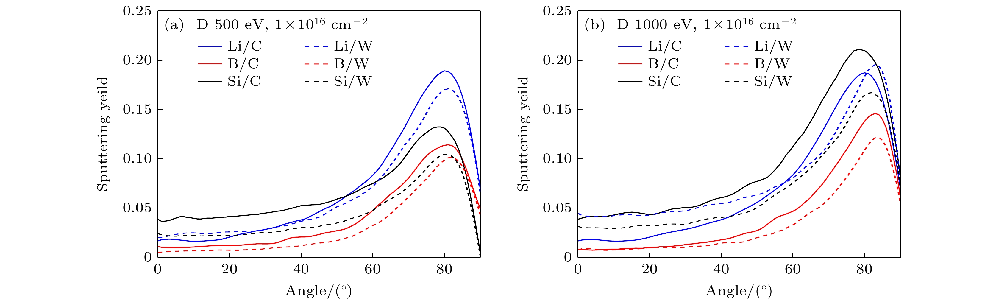 Wall conditioning coatings—lithium (Li), boron (B) and silicon (Si)—introduced by lithiumization, boronization, or siliconization, serve as a critical strategy for suppressing fuel recycling and reducing impurity fluxes from the wall of a tokamak. These techniques directly improve plasma initiation, reproducibility, energy confinement, and operational stability in fusion devices. However, these coatings undergo both physical and chemical sputtering by boundary plasma bombardment. This erosion behavior critically determines coating lifetime and, consequently, long-pulse plasma performance. To evaluate the influence of physical sputtering on coating durability and to compare material-specific differences, binary collision approximation (BCA) simulations are conducted to investigate the physical sputtering behaviors of Li, B, and Si coatings. Carbon (C) and tungsten (W) substrates are also modeled to assess interface effects. The results reveal the significant differences in sputtering yields between Li, B, and Si in incident angles and deuterium energies. Owing to its low surface binding energy, lithium exhibits the highest sputtering yield at large angles and low energies, while silicon, with the highest atomic number, presents the highest sputtering yield at small angles and high energies. Sputtering yields of carbon-based and tungsten-based coatings vary with angle and energy, driven by their differences of deuterium backscattering and substrate sputtering at the interface. Notably, for tungsten-based coatings, the sputtering yields increase dramatically at specific energies. This occurs because tungsten’s high surface binding energy causes incident deuterium atoms to reflect off the tungsten interface and then collide with coating elements. Consequently, when the energy transferred to the surface element is higher than its sputtering threshold, the sputtering yield increases. Additionally, increasing incident fluence modifies the target composition, leading to corresponding changes in the sputtering yields of coating materials. In summary, coating materials should be selected according to the expected angle distribution and energy distribution of the incident plasma particles. To suppress the abrupt yield increase observed in tungsten substrates at specific energies, the coatings must be sufficiently thick. These findings provide a theoretical basis for selecting conditioning materials and optimizing wall conditioning strategies in fusion devices.