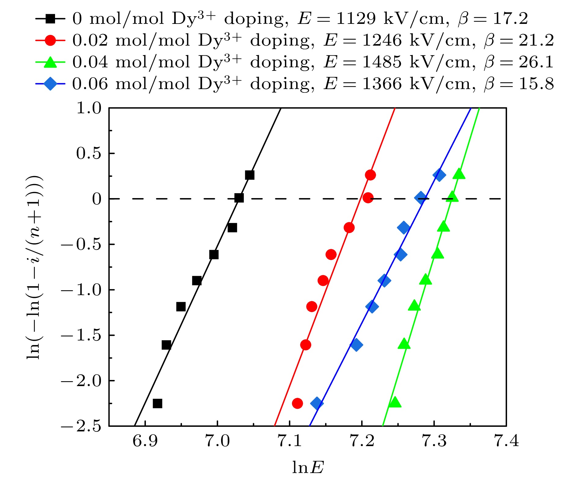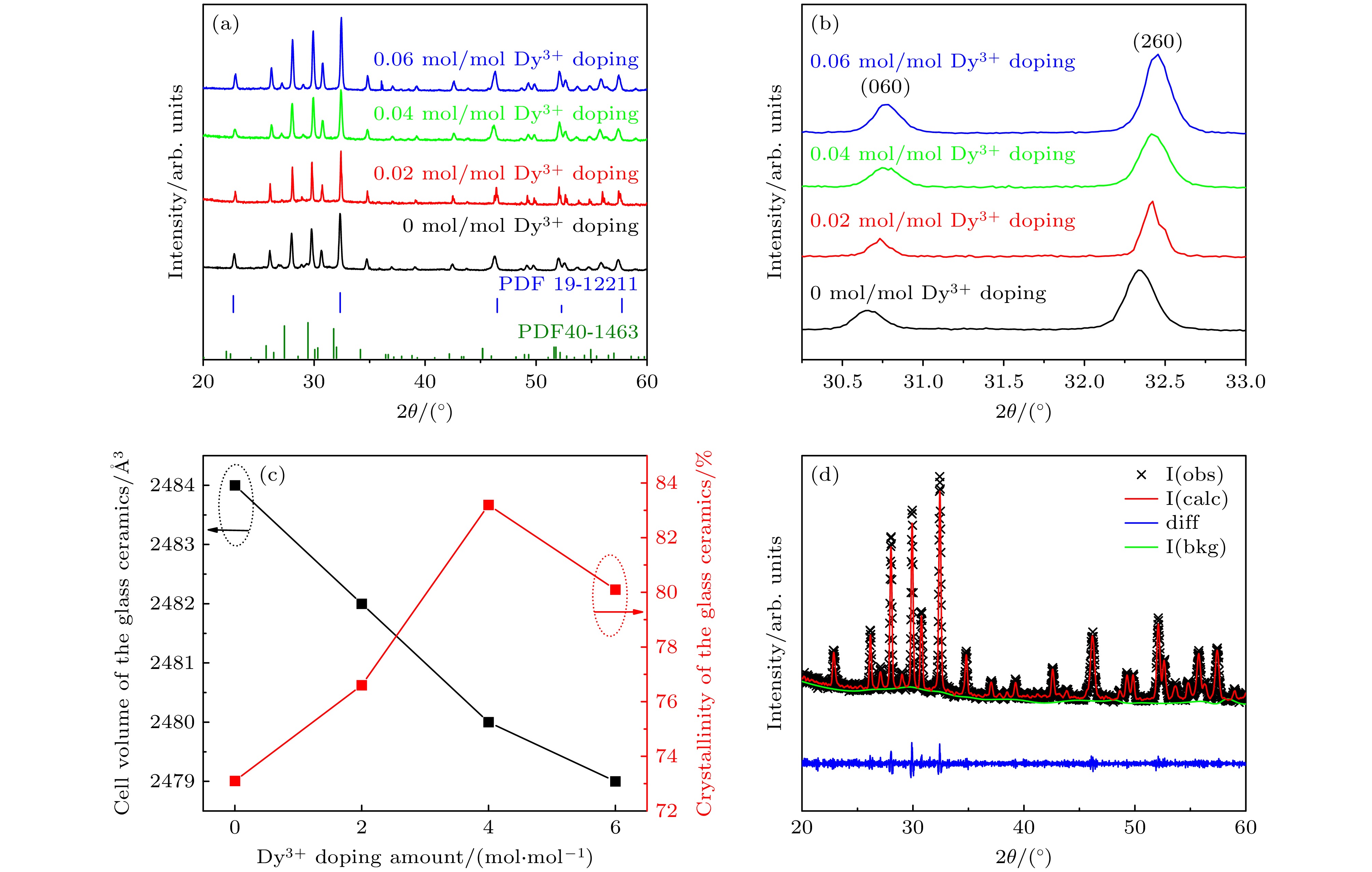 Dielectric glass ceramics that combine high power density and high energy density have important application value in achieving lightweight, miniaturization, and integration of pulse power devices. Compared with dielectric ceramics and polymers, dielectric glass-ceramics are composites consisting of a ceramic phase dispersed within a glass phase. Through the high-temperature melting, rapid cooling, and specific-temperature crystallization, the ceramic phase becomes uniformly distributed within the dense glass matrix, resulting in a composite structure characterized by low porosity, uniform grain size, and high density. Owing to the introduction of the high-dielectric-constant ceramic phase, the glass-ceramics exhibit excellent dielectric response. Furthermore, the pore-free, continuous, and highly insulating glass matrix effectively enhances the overall breakdown resistance of the material. Different molar concentrations of rare earth Dy3+ doped BaO-Na2O-Nb2O5 based glass ceramics are prepared using high-temperature melting combined with temperature-controlled crystallization process. The raw materials of glass ceramics are weighed according to the stoichiometric ratio and homogeneously mixed using a ball mill. The thoroughly mixed raw materials are placed in a high-temperature glass furnace and melted at 1550 ℃ for 2.5 h to ensure complete fusion. The melt is then rapidly cast into a preheated metal mold to obtain bulk glasses. These glasses are annealed at 650 ℃ for 3 h to relieve residual stresses. Subsequently, the transparent bulk glass blocks are cut into thin slices. Finally, these slices are heat-treated at 1100 ℃ for 3 h. Upon cooling, Dy3+ doped -based glass-ceramics with varying molar concentrations of the rare-earth ion are obtained. The effects of different molar concentrations of rare earth Dy3+ doping on the microstructure, crystallization behavior, and dielectric energy storage performance of BaO-Na2O-Nb2O5 based glass ceramics are systematically studied. The test results show that rare earth Dy3+ doping has almost no effect on the phase structure of BaO-Na2O-Nb2O5 based glass ceramics. Moderate rare earth Dy3+ doping can effectively promote the precipitation of Ba2NaNb5O15 ceramic phase in tungsten bronze structure, while improving the crystallinity of glass ceramics and increasing the dielectric constant of glass ceramics. In addition, rare earth Dy3+ doping also has the effect of inhibiting the growth of glass ceramic grains, which can improve the breakdown strength of BaO-Na2O-Nb2O5 based glass ceramics. When the rare earth Dy3+ doping molar concentration is 0.04 mol/mol, the dielectric constant of BaO-Na2O-Nb2O5 based glass ceramic is 97.0, the breakdown strength reaches 1485 kV/cm, and the highest energy storage density arrives at 8.01 J/cm3, which is 1.87 times that of undoped glass ceramics. This result provides experimental basis and technical reference for improving the performance of glass ceramic materials in the field of energy storage.